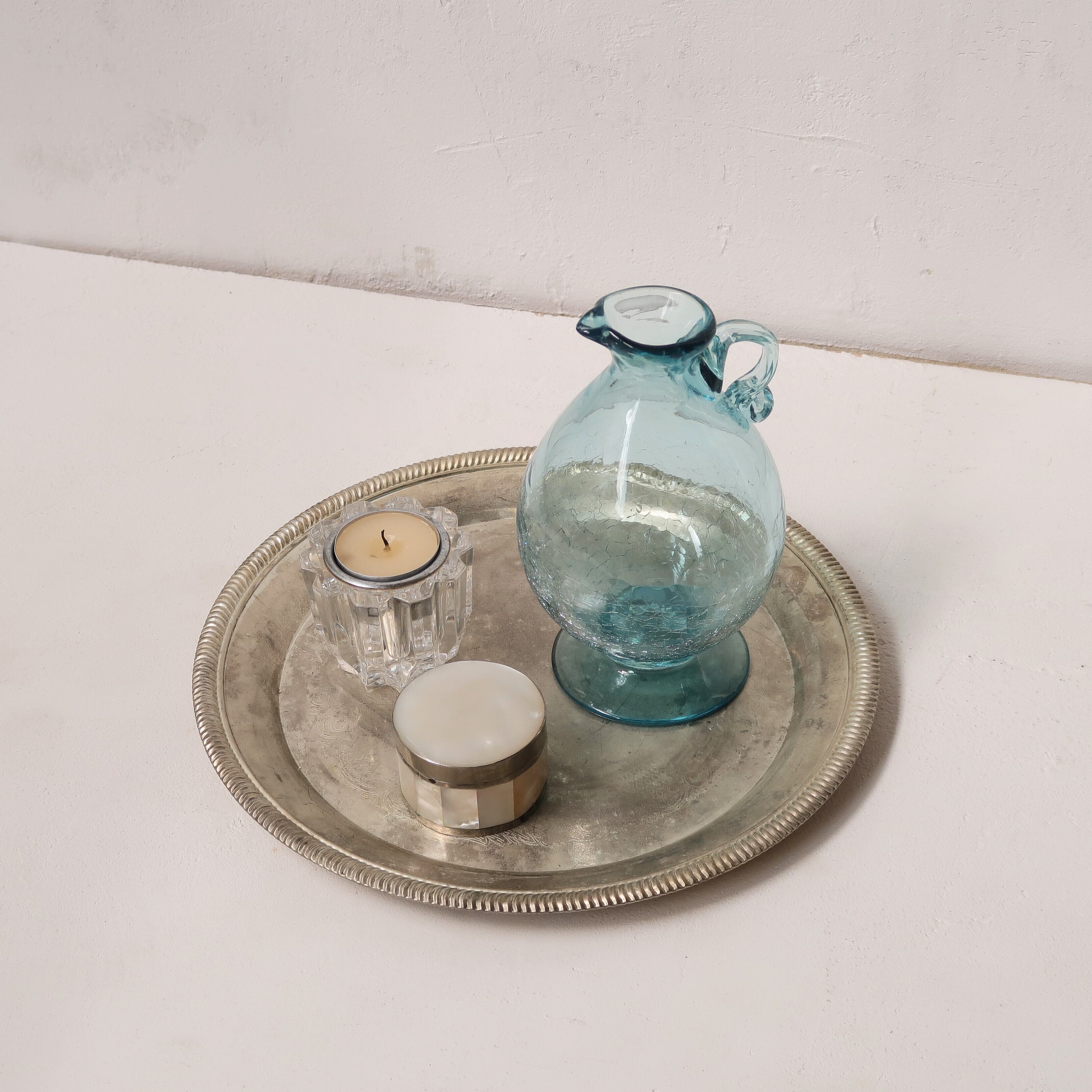 水が入ると、光に当たると、クラックがきらきらかがやく水差し。ちいさく丸い取っ手がなんだか愛らしい。肌寒い季節でも、外の空気のようにひんやりとした雰囲気で凛と佇む、この感じ。茎の細いお花を1〜2輪、よく目につく棚の上に飾ったり、なんて想像ができてしまいます。