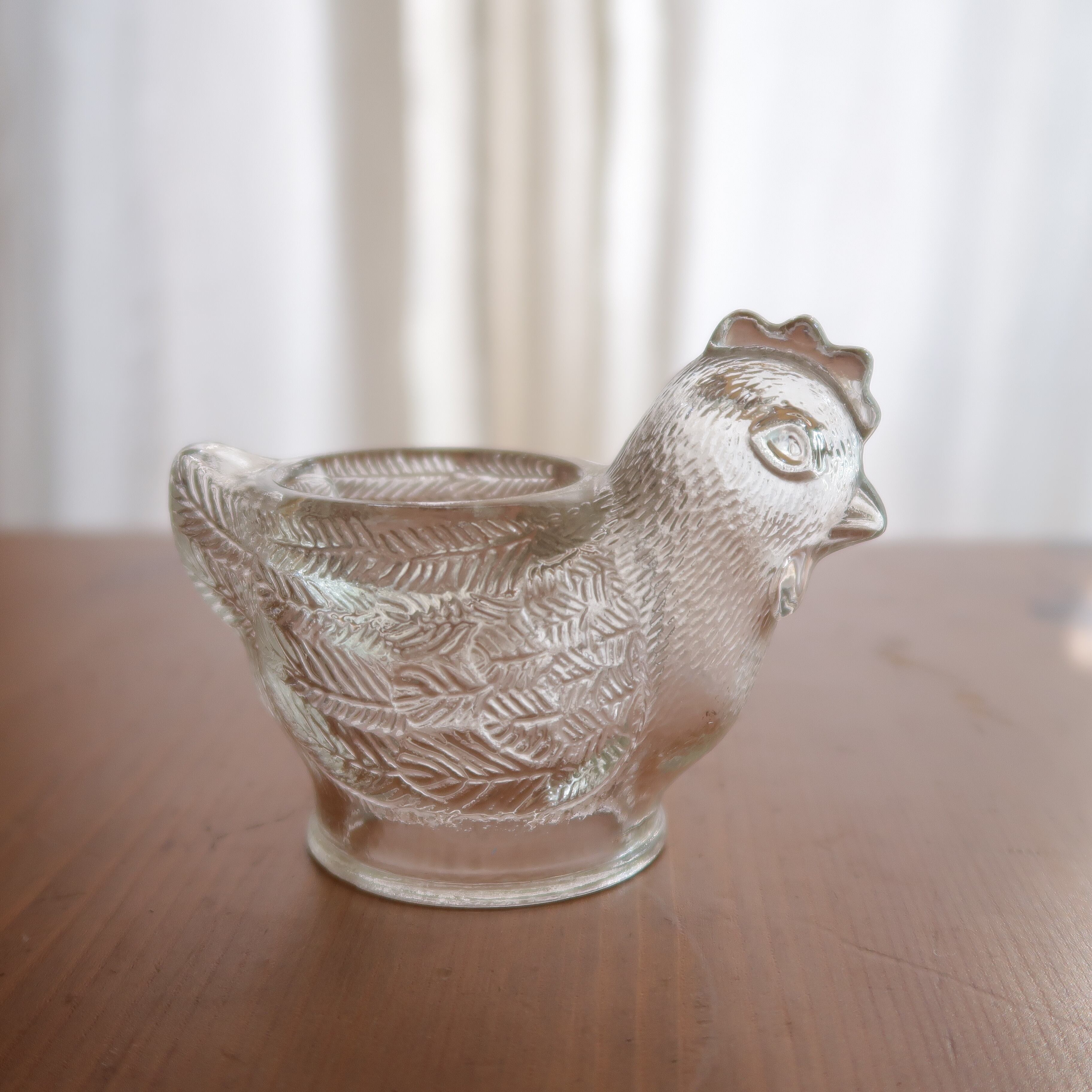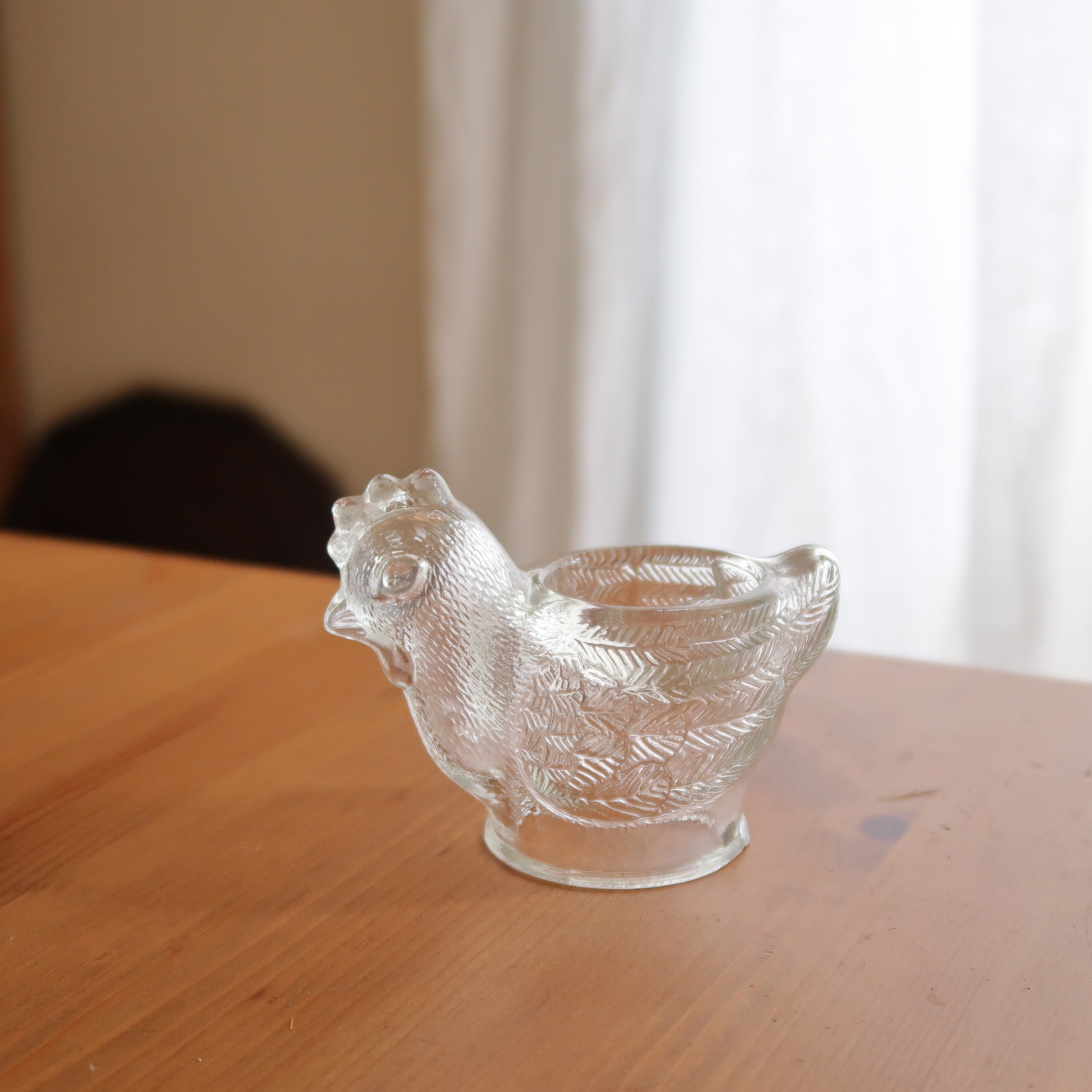 ガラスのエッグスタンドと思われるアイテム。ガラスのにわとりが、卵を背負う。かわいい。