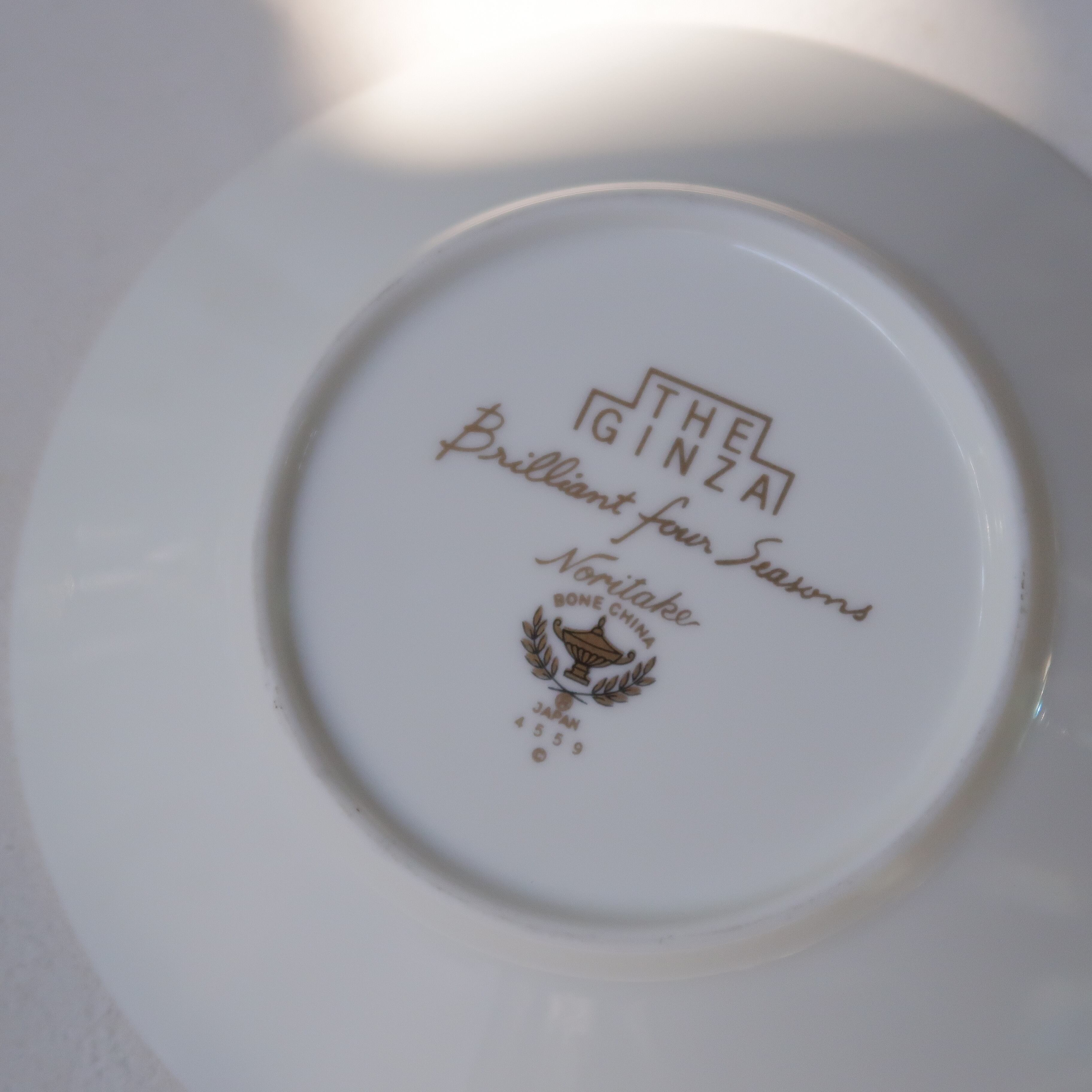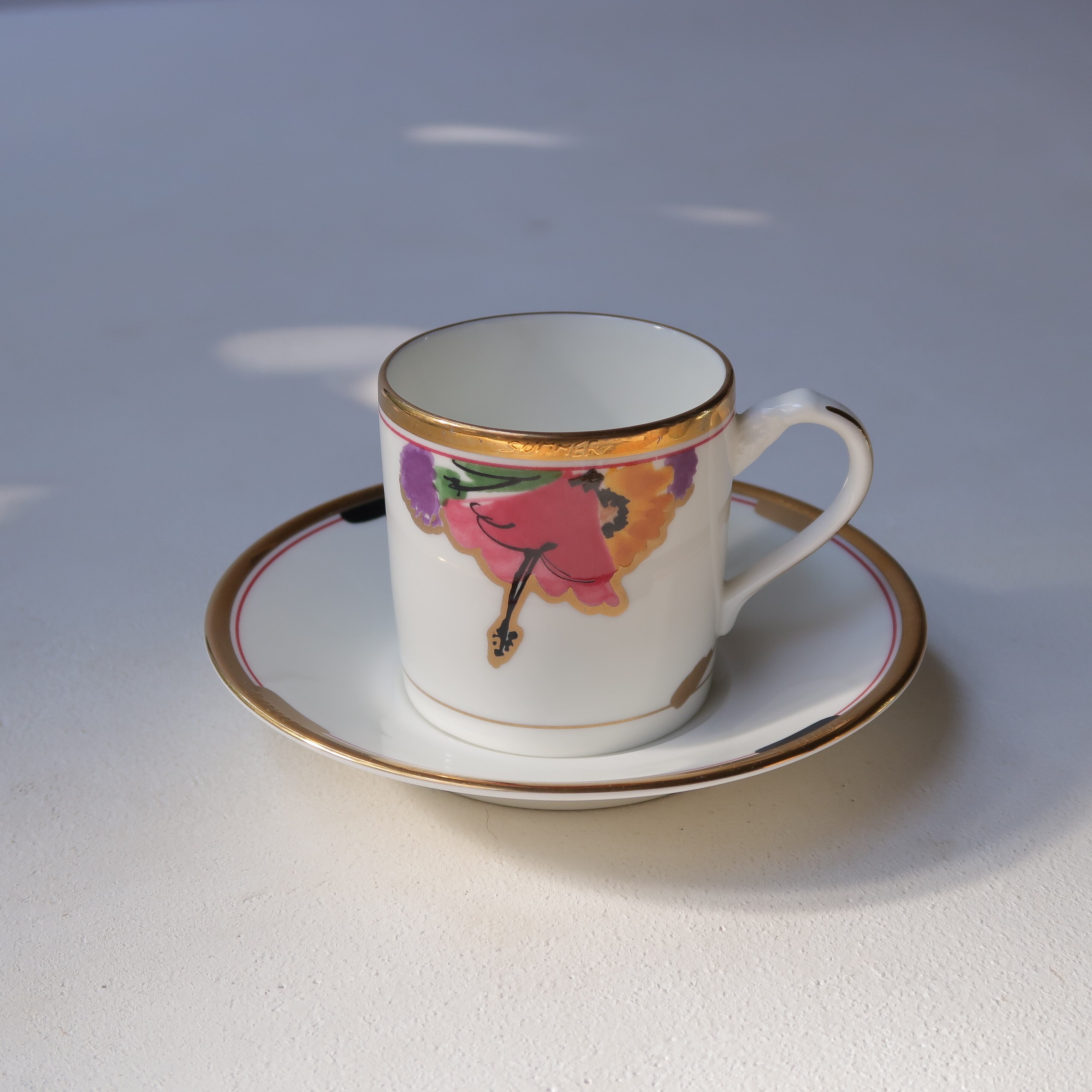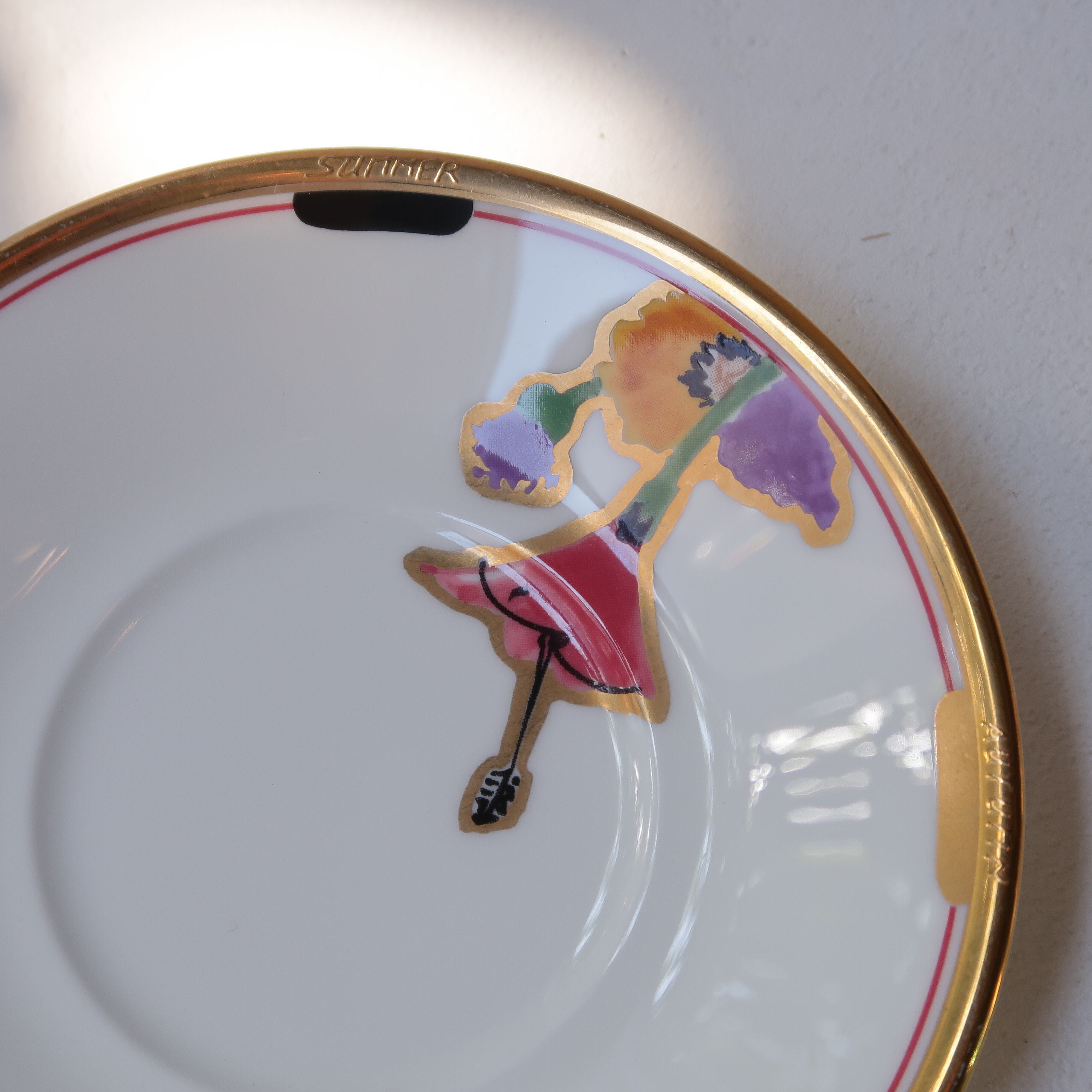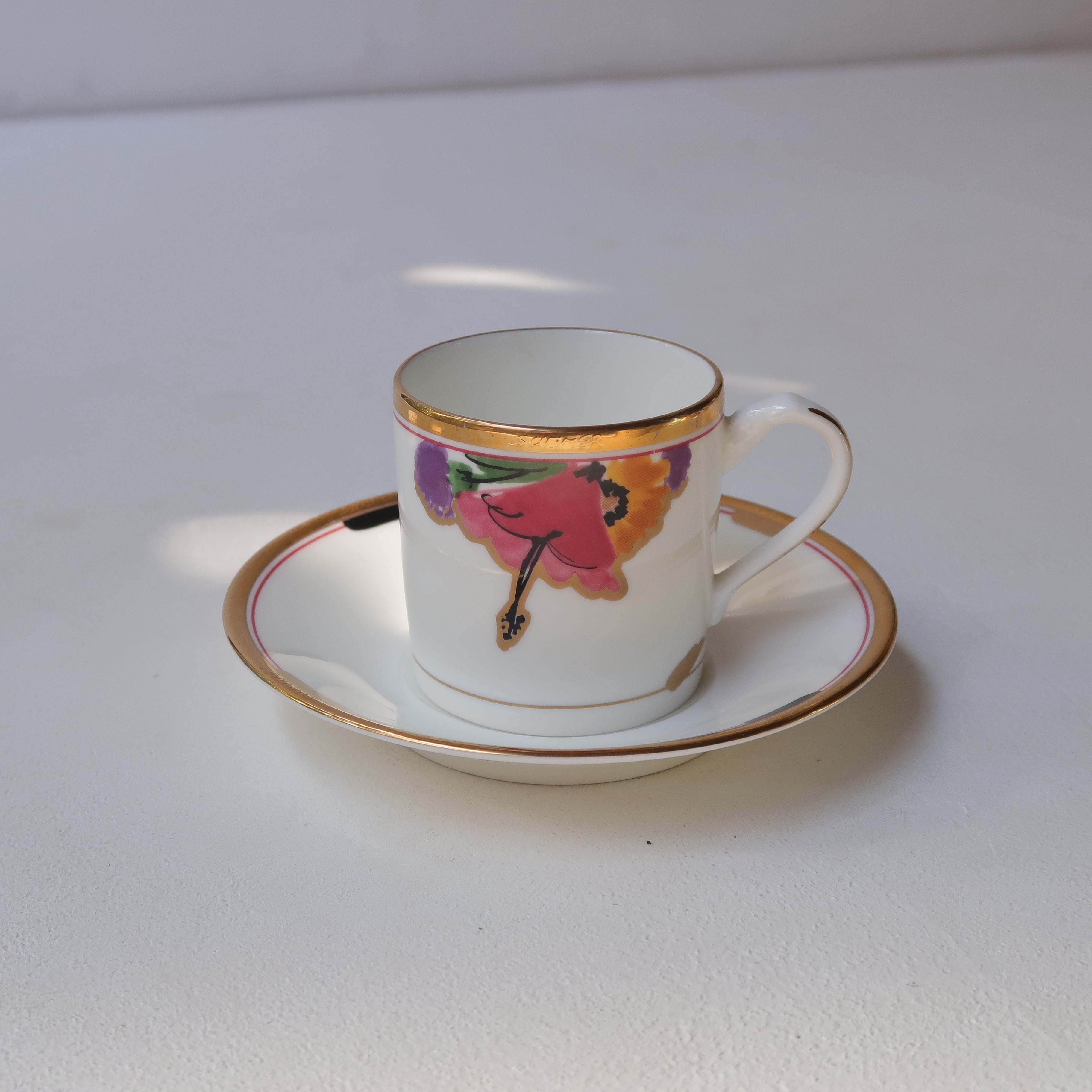 ピンク、紫、黄色のお花が描かれたガラスのティーカップ。カラフルなお花に、ゴールドの縁が上品で愛らしいカップ&ソーサーです。