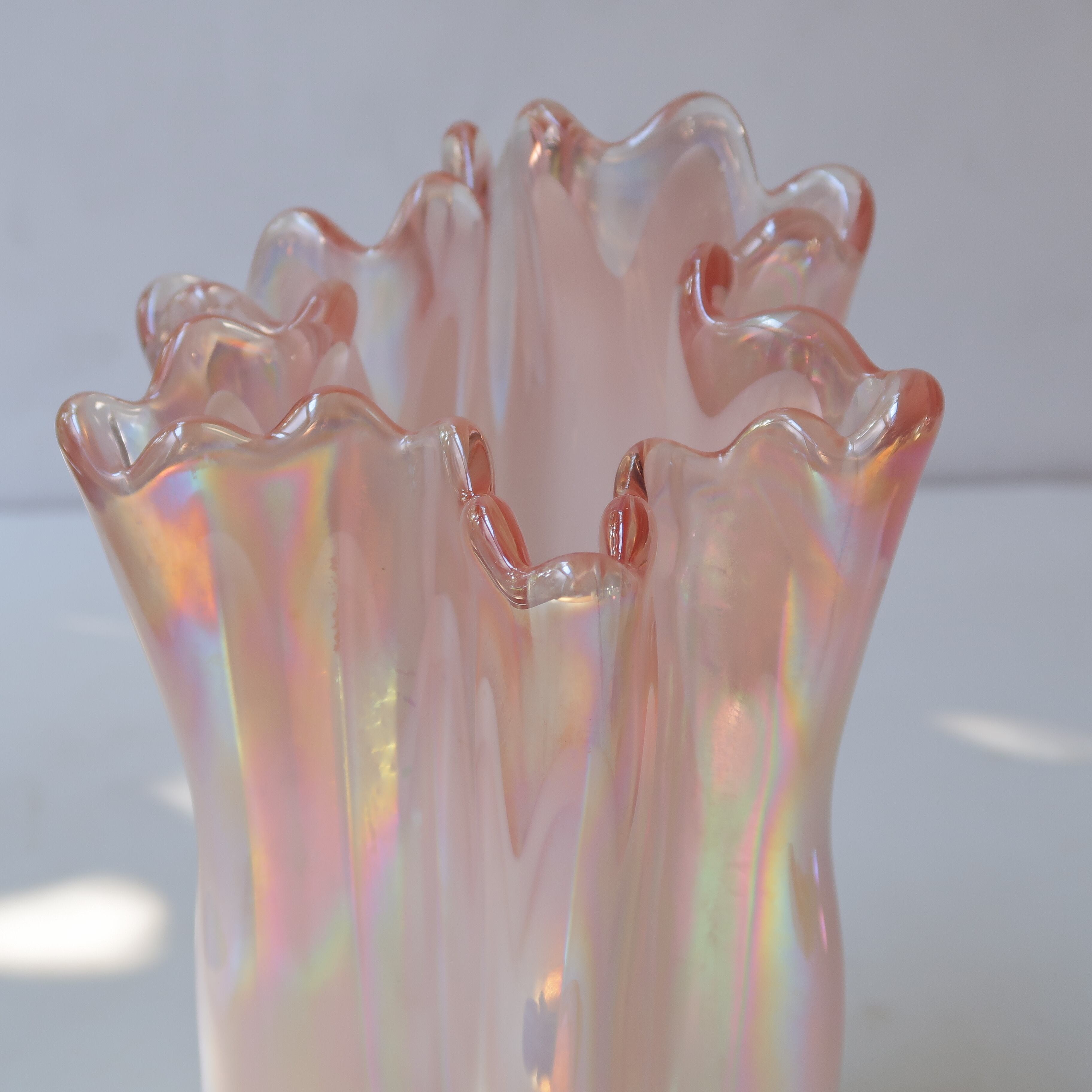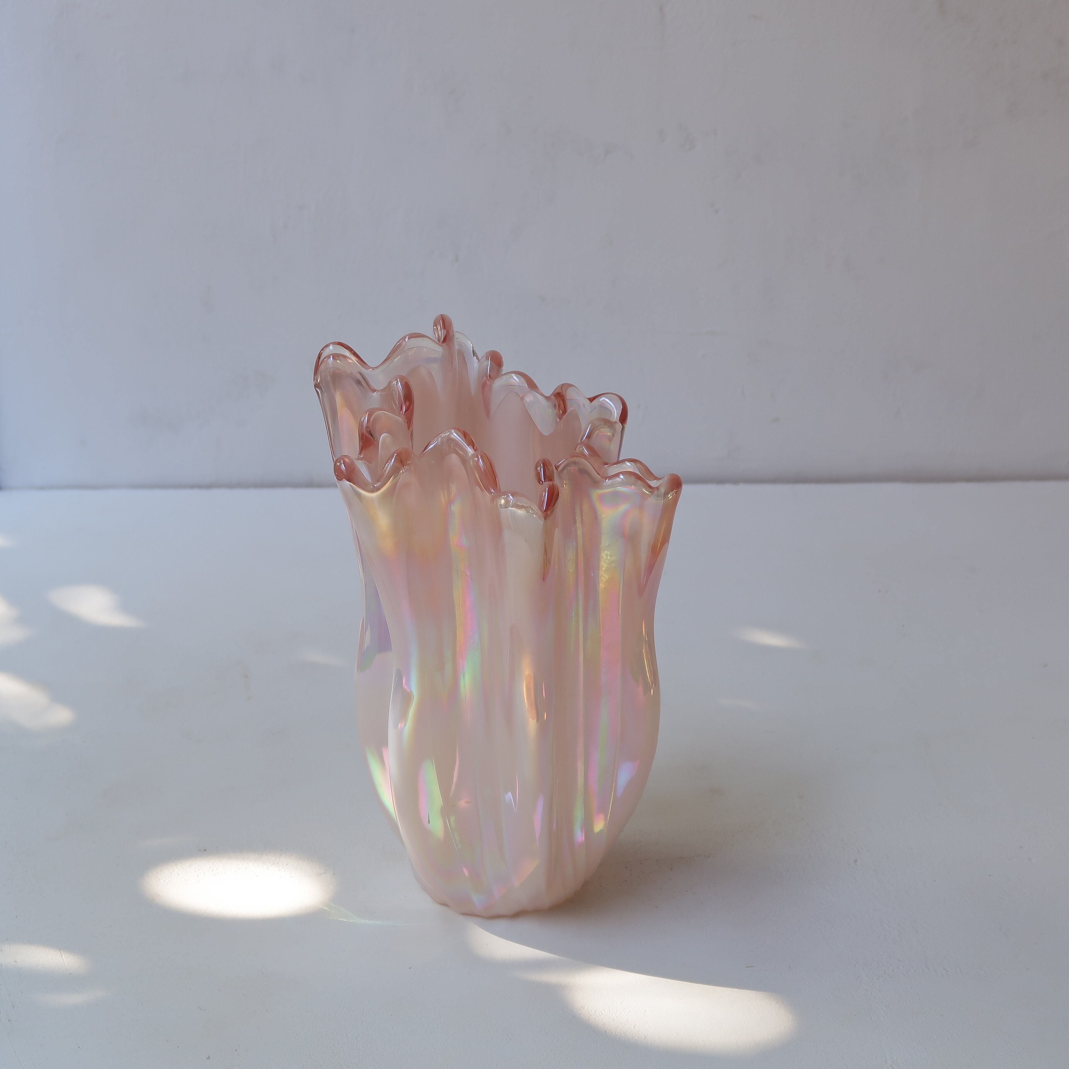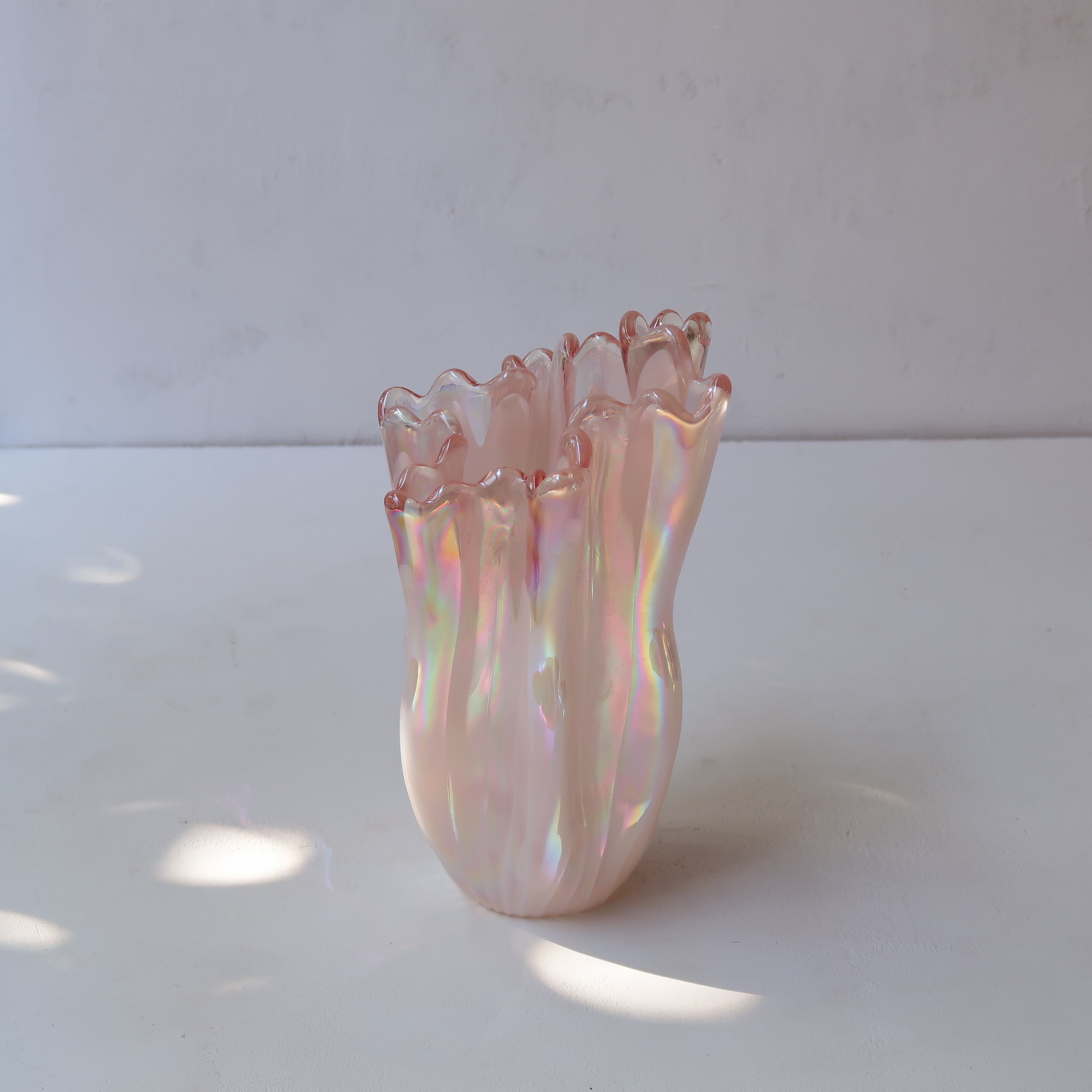 ふちはとうめいピンクのひらひら。くびれがあるので、かわいいながらもすっきりした印象の花瓶です。