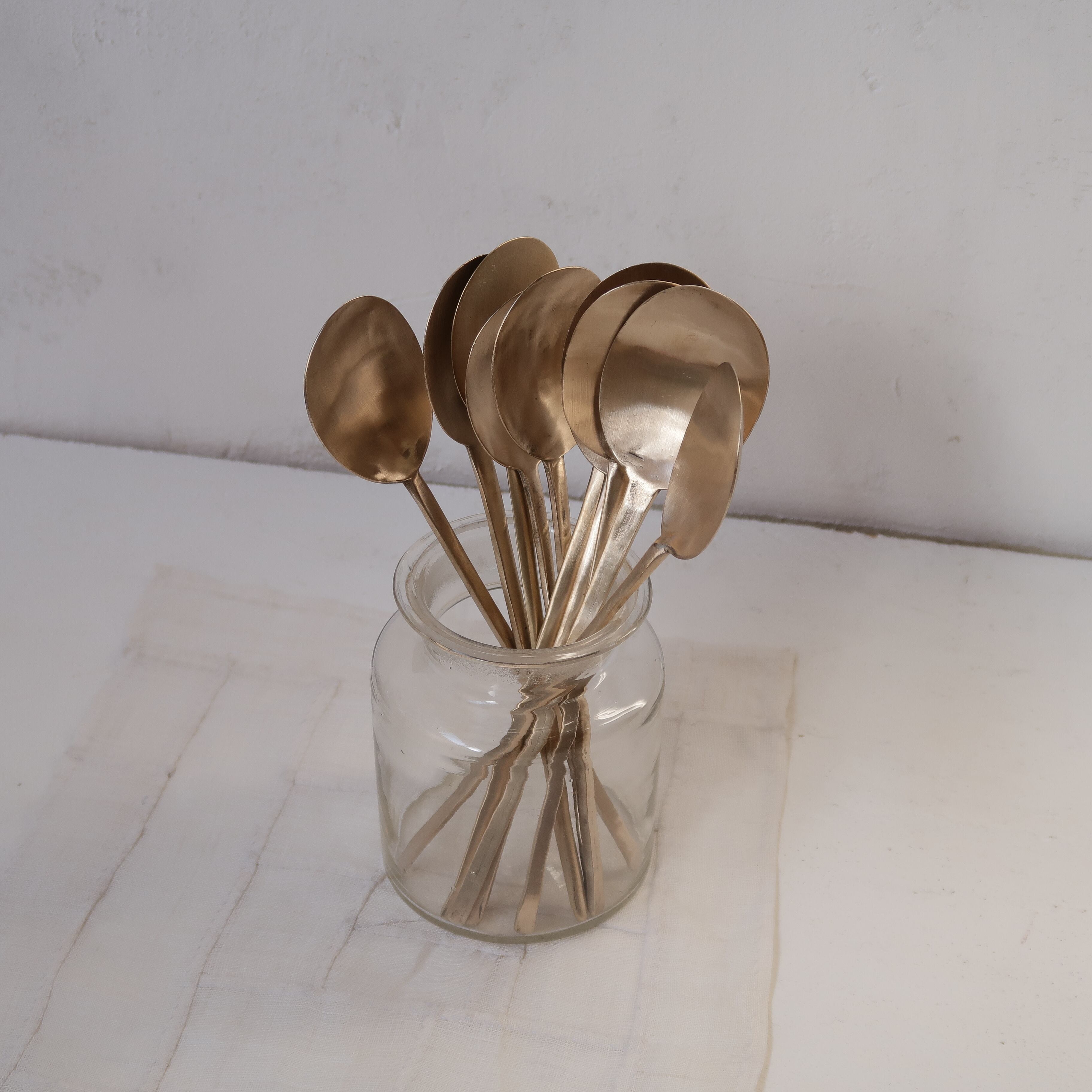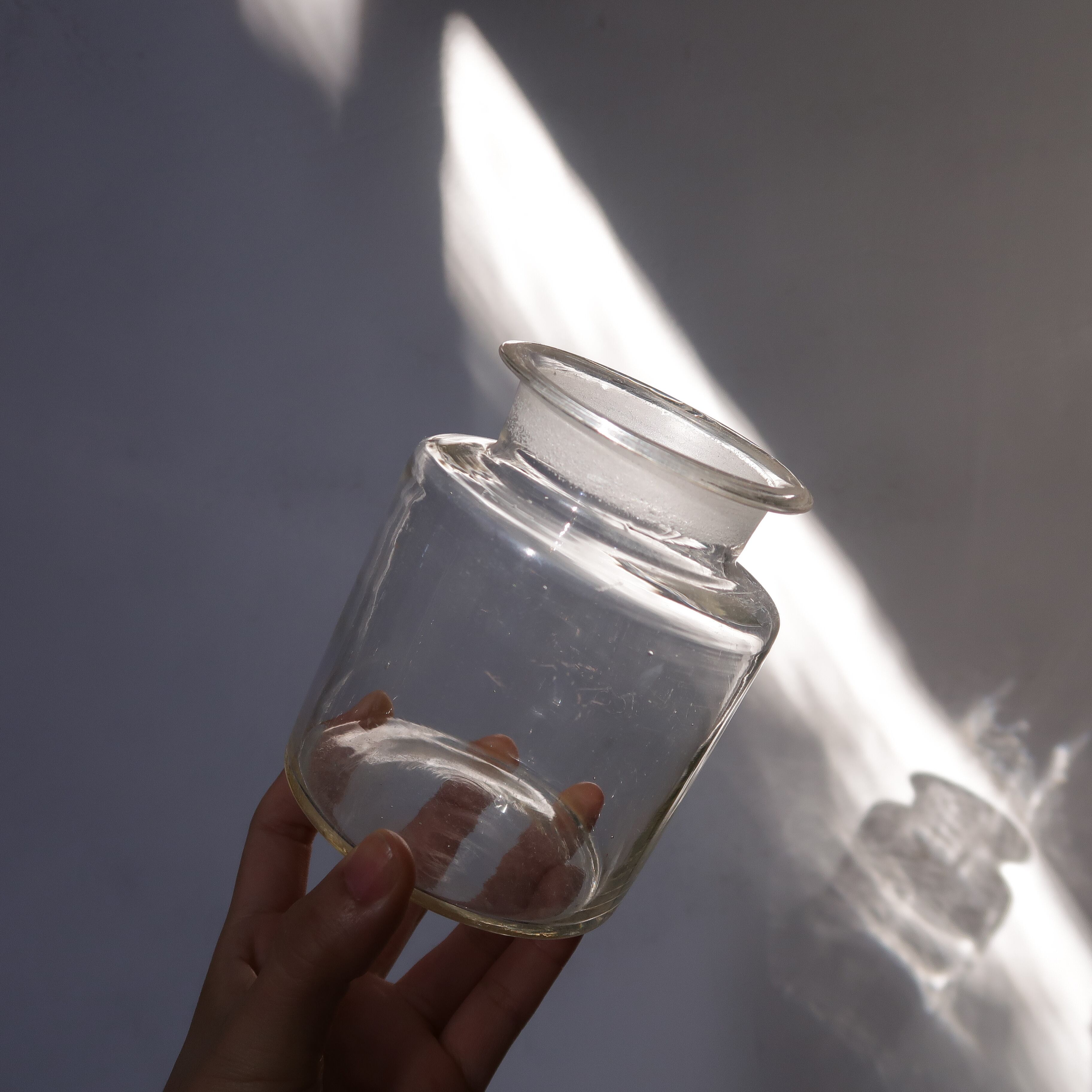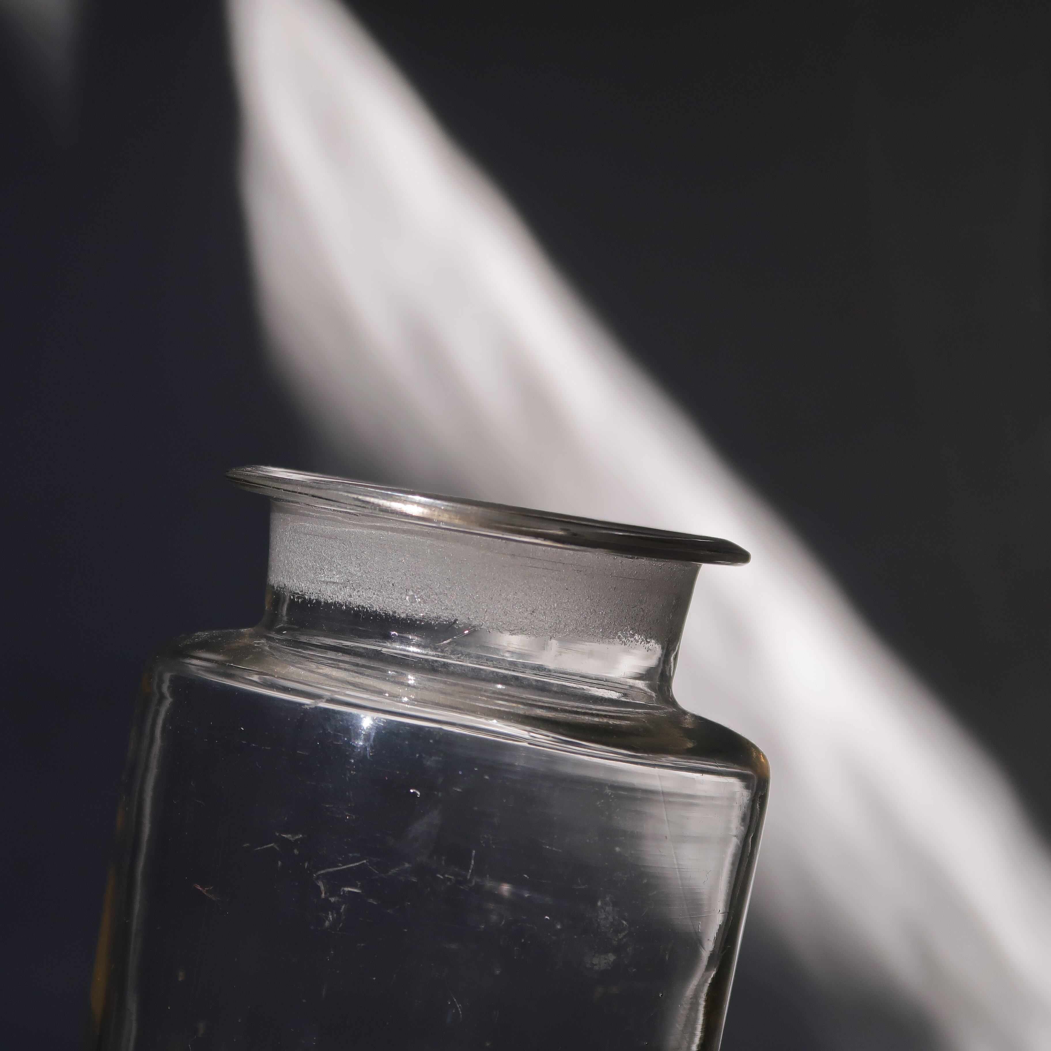 ほんのり気泡の入った古い瓶。おそらく、ふたも付いていたのではないかと思われるガラスの器です。カトラリーを立てたり、お花を生けたりなど、お使いいただけます。