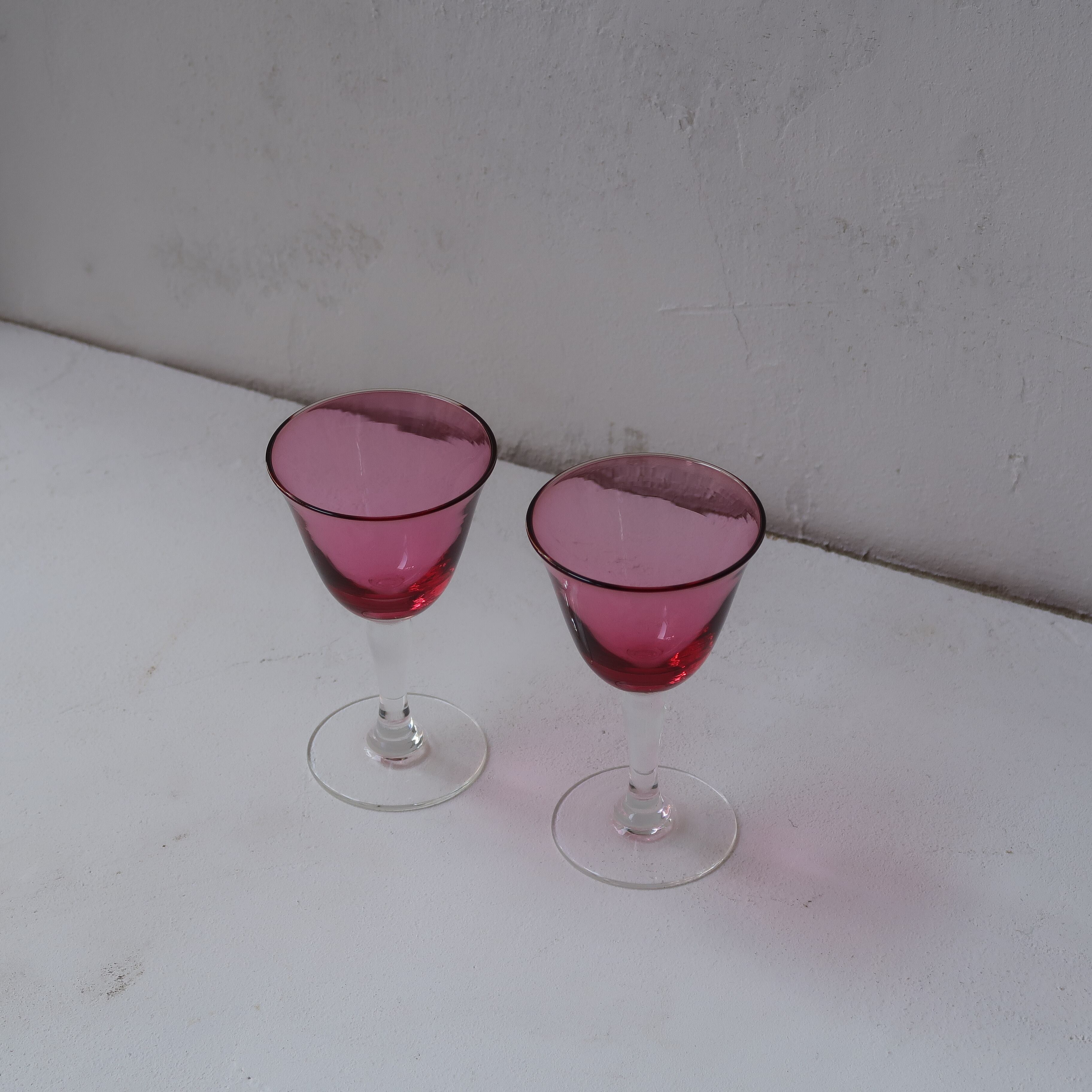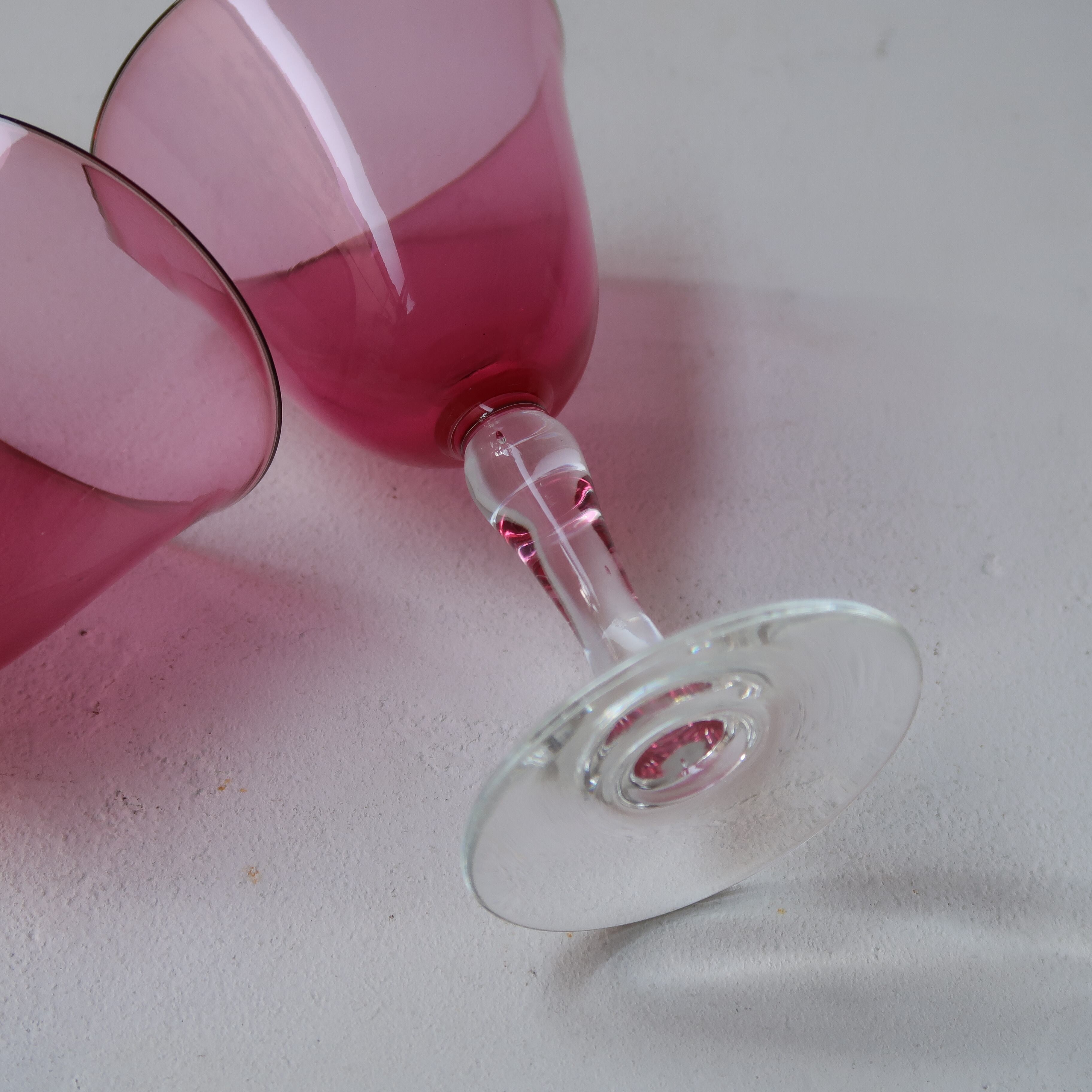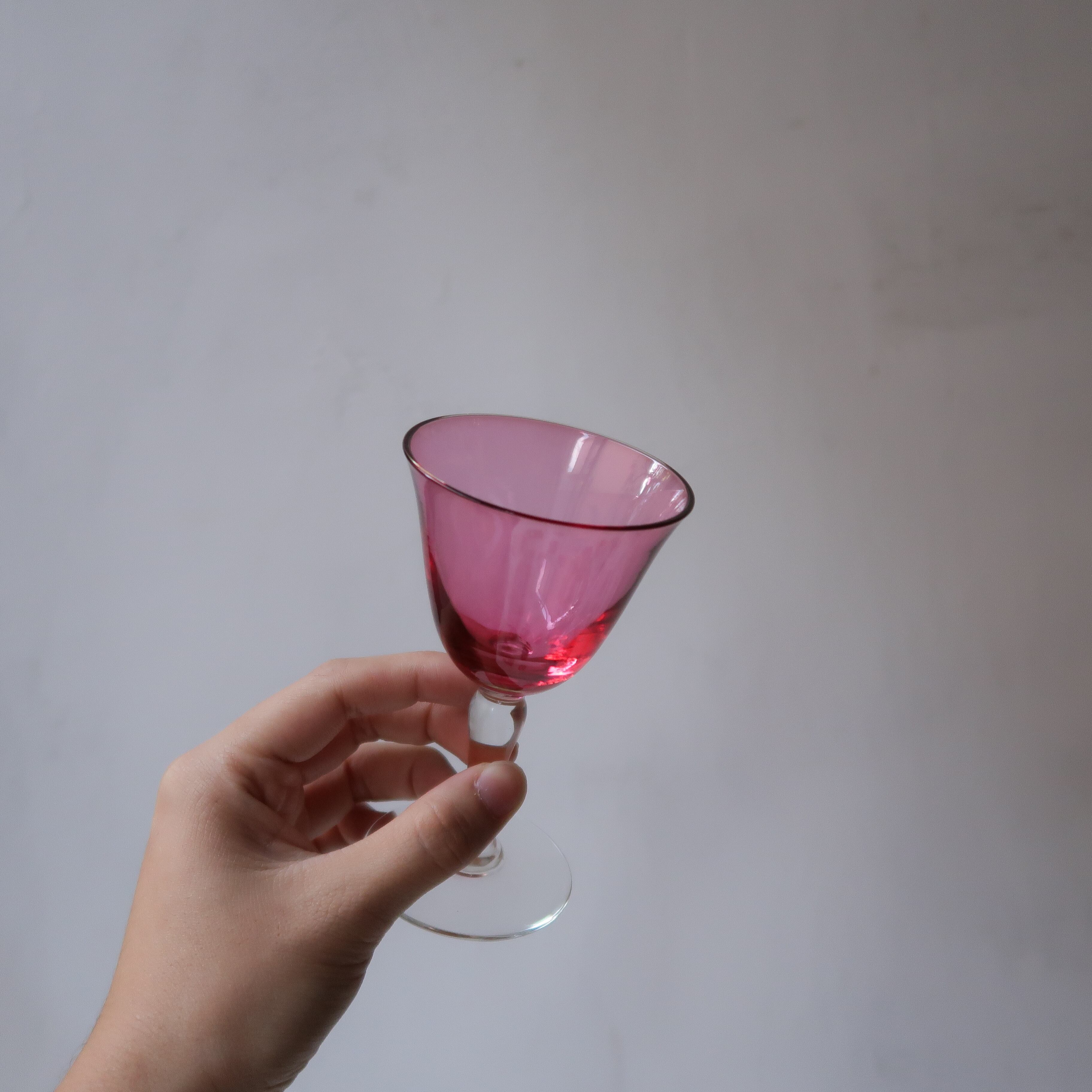 華やかなピンク色が目を引く、ピンクのミニグラス。つやつやで透明感のある質感がよく、ステムだけとうめいなのもかわいい。ちょっぴりお酒を飲んだり、アクセサリーを飾ったり。お使いいただけます。