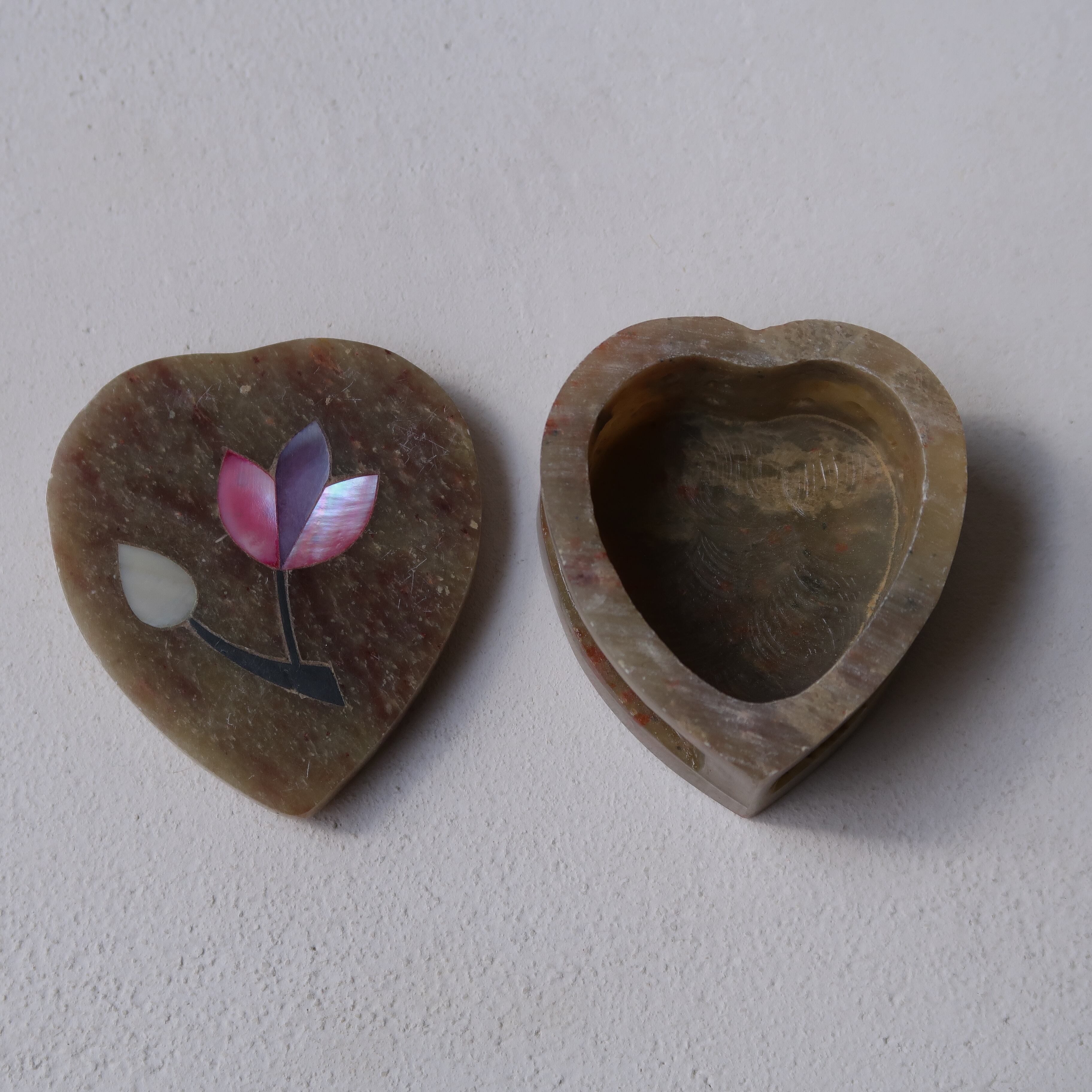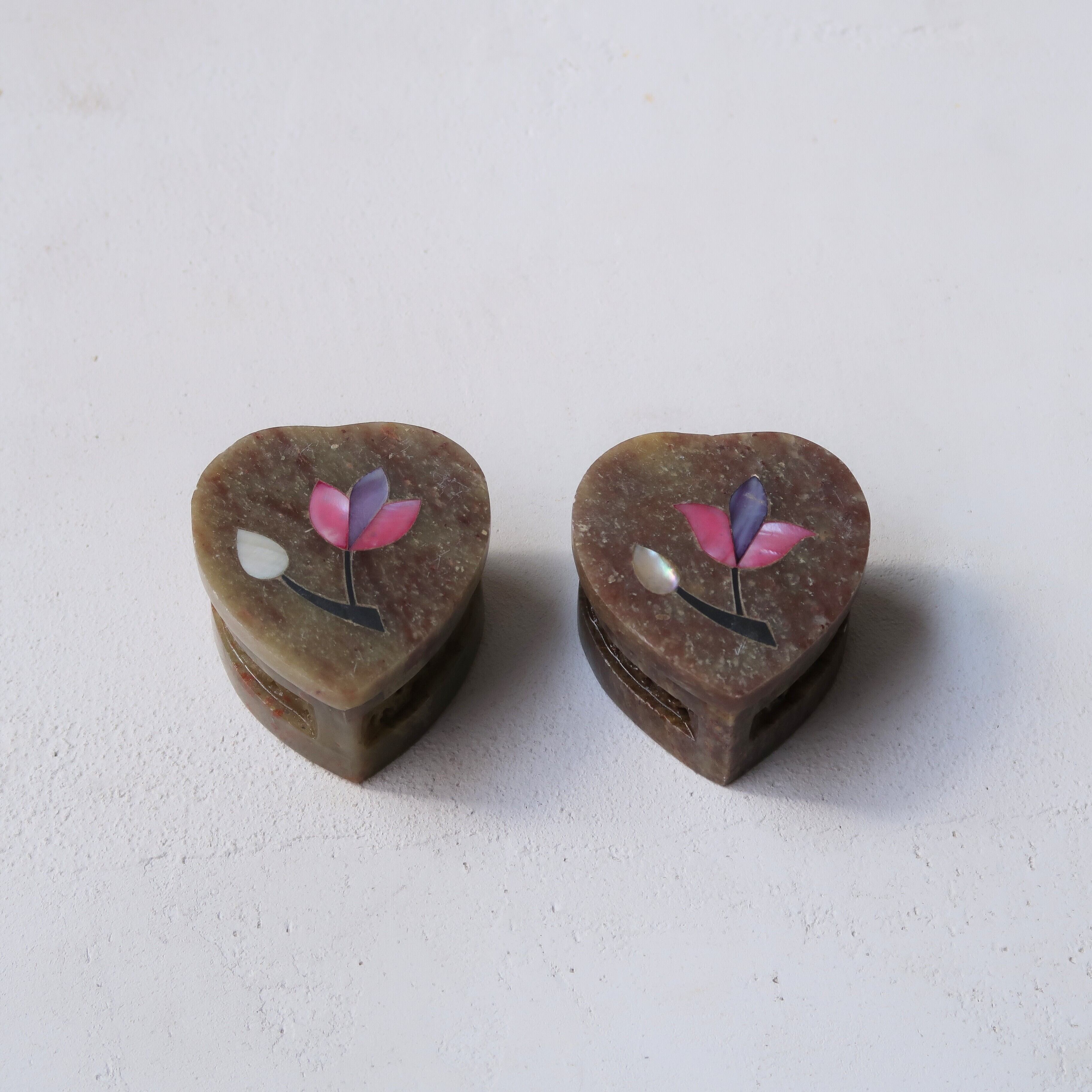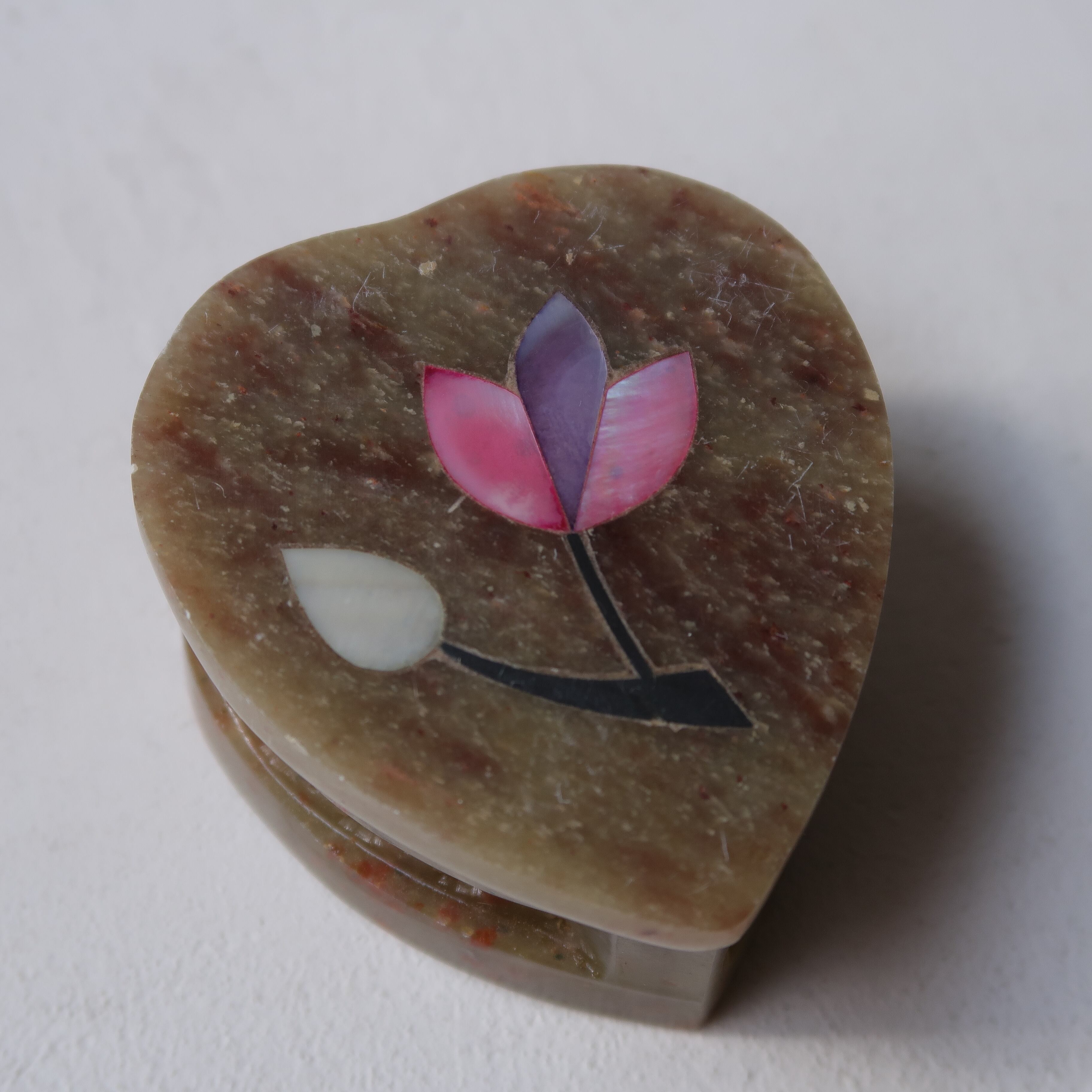 お花の象嵌がほどこされたちいさなジュエリーケース。今回は、ハートの形。