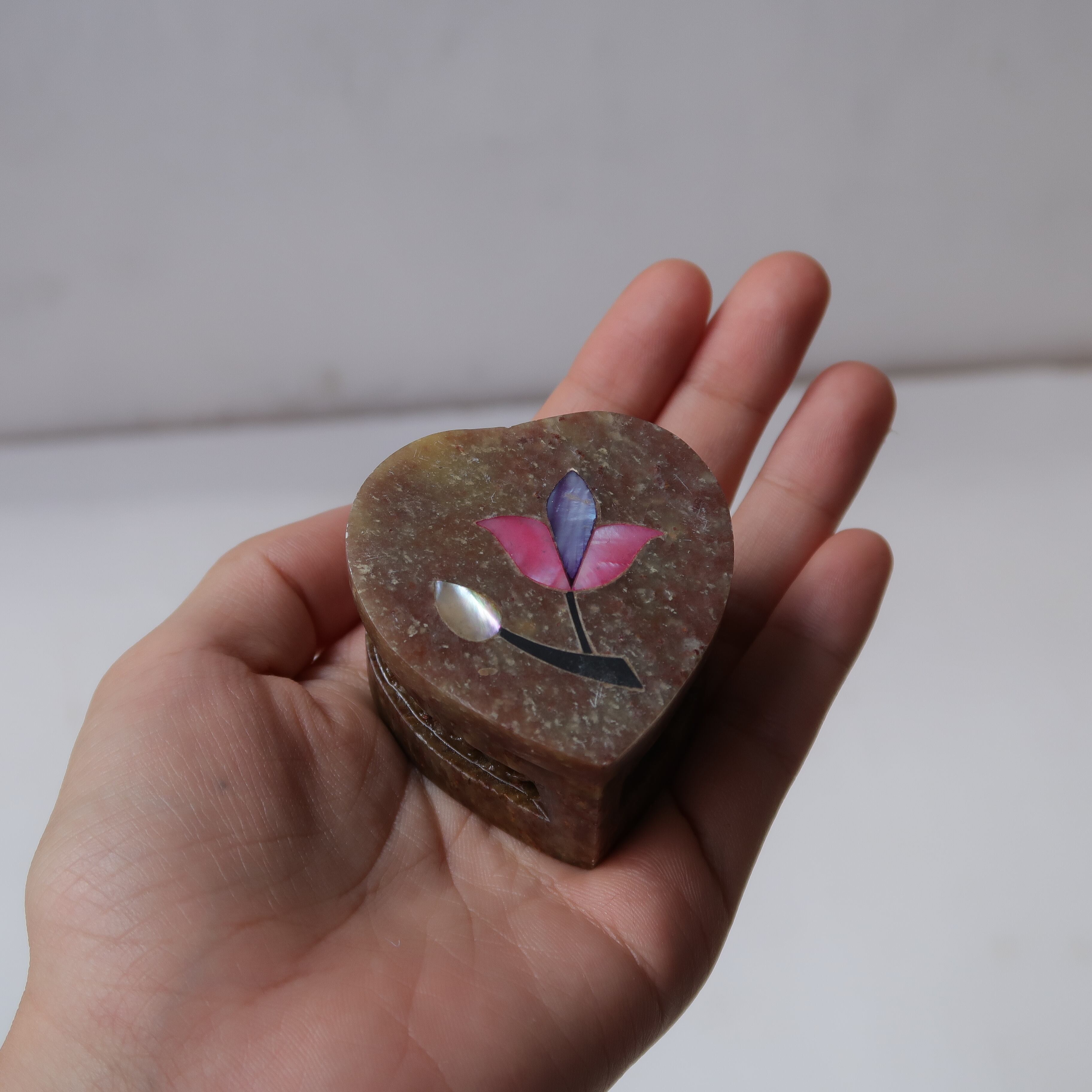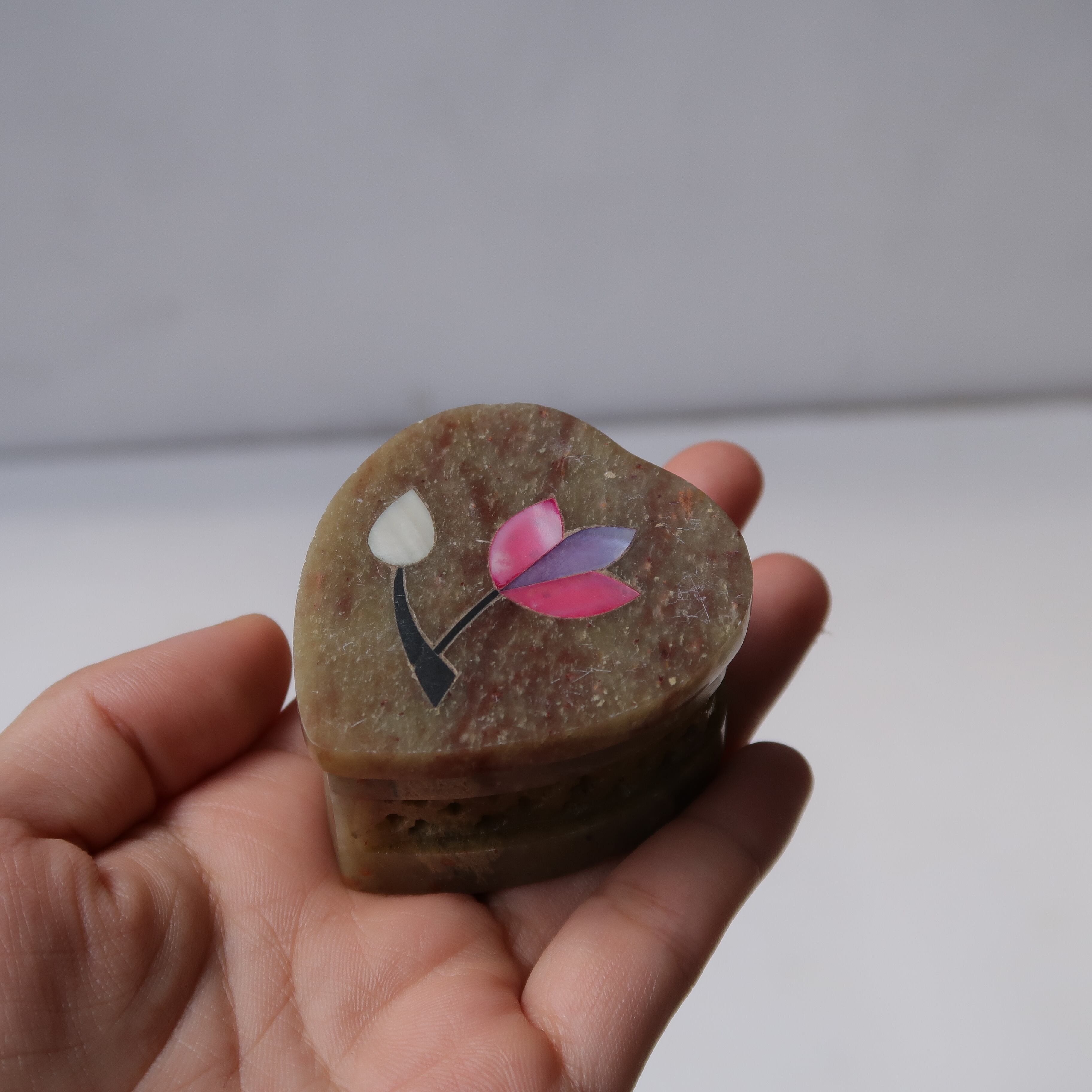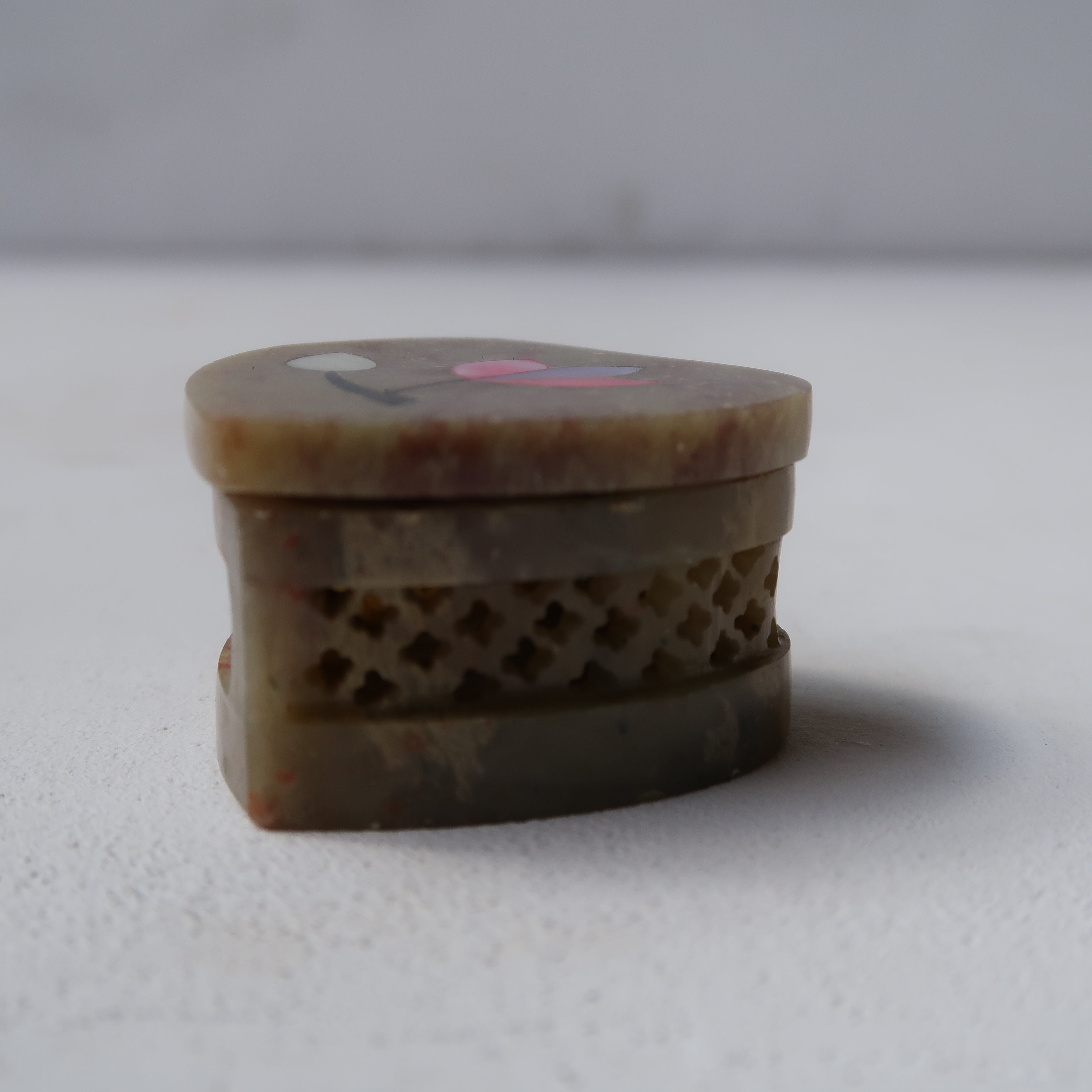 お花の象嵌がほどこされたちいさなジュエリーケース。今回は、ハートの形。