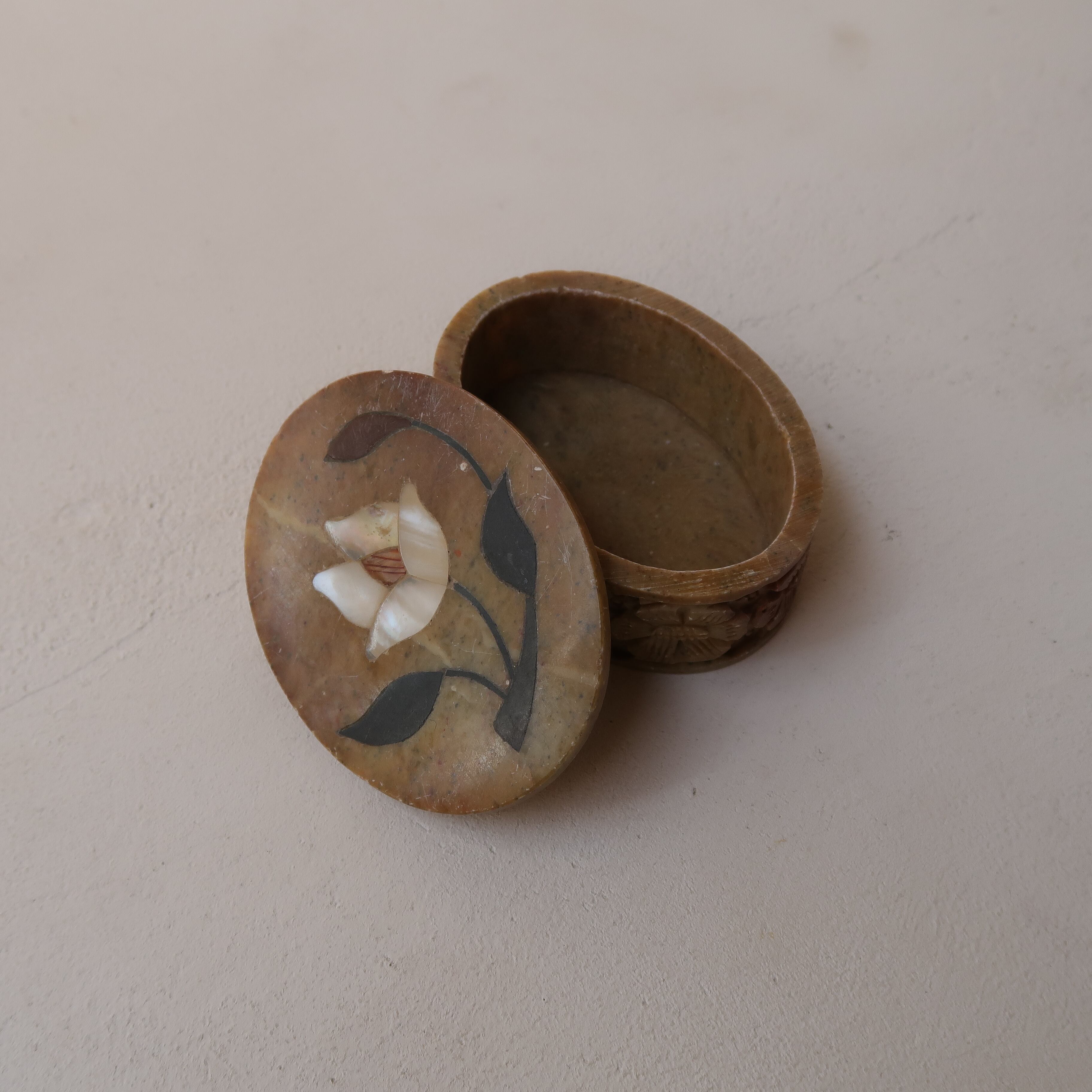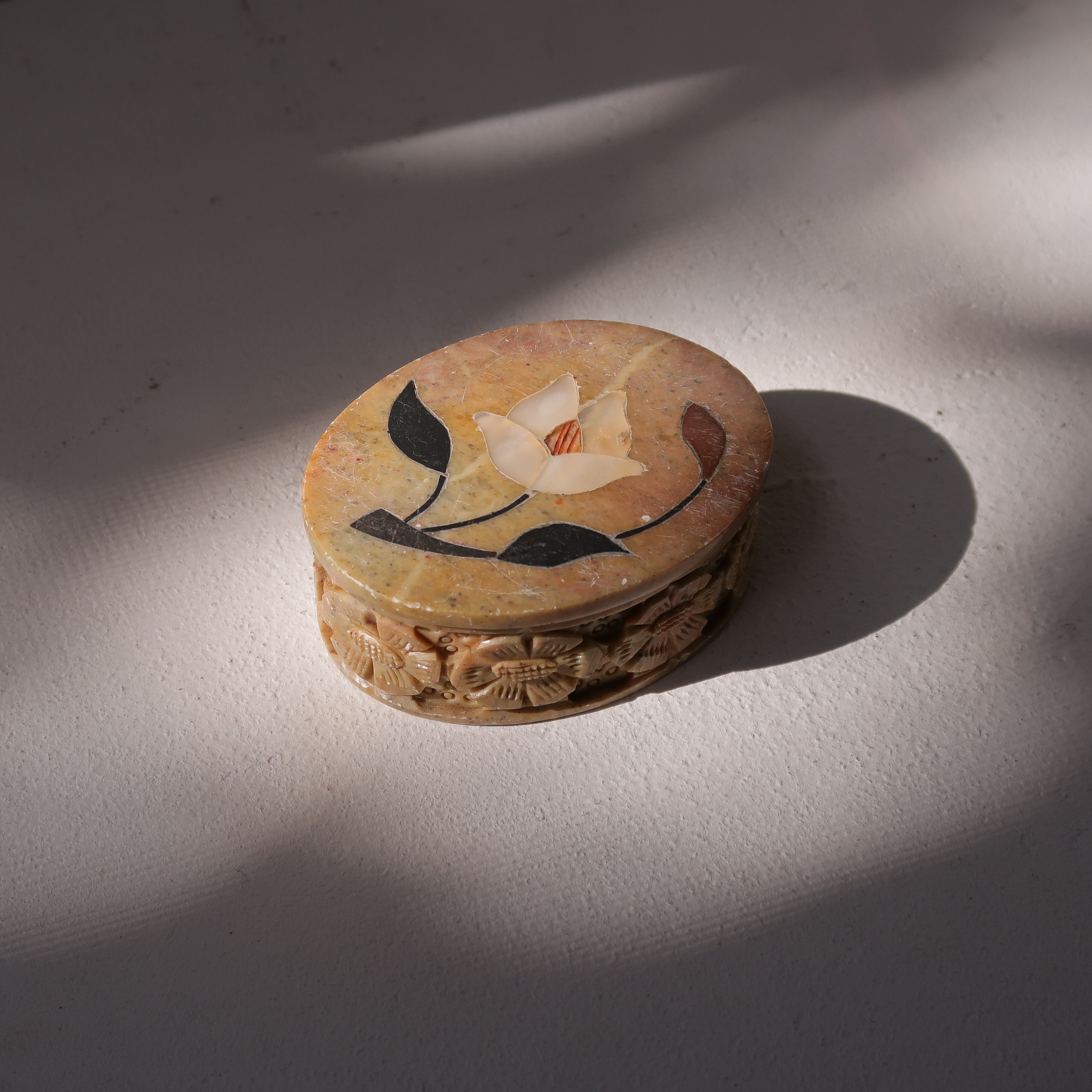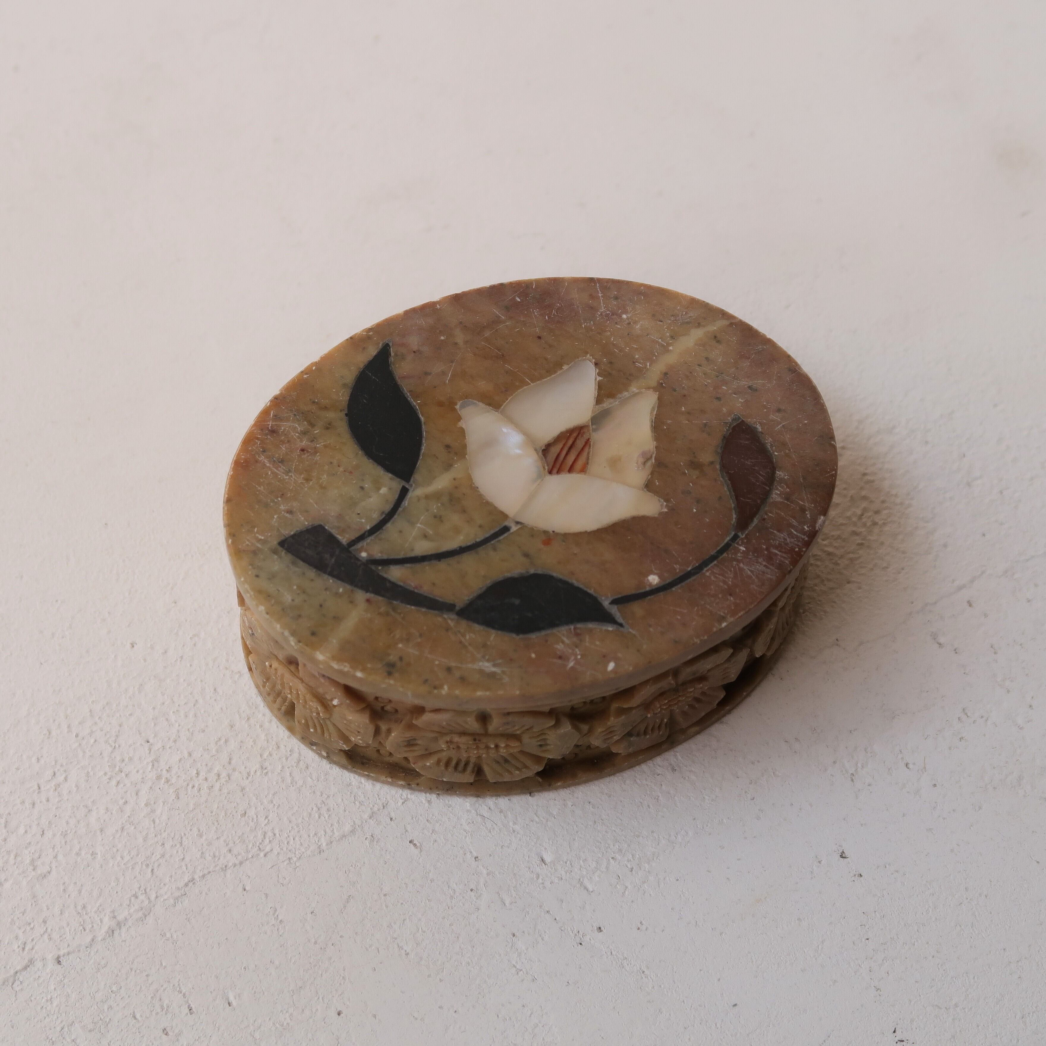 お花の象嵌がほどこされたちいさなジュエリーケース。黄色ベースに、白いお花がほどこされた物もセレクトしてみました。白いの花びらが、透明感があってかわいい。