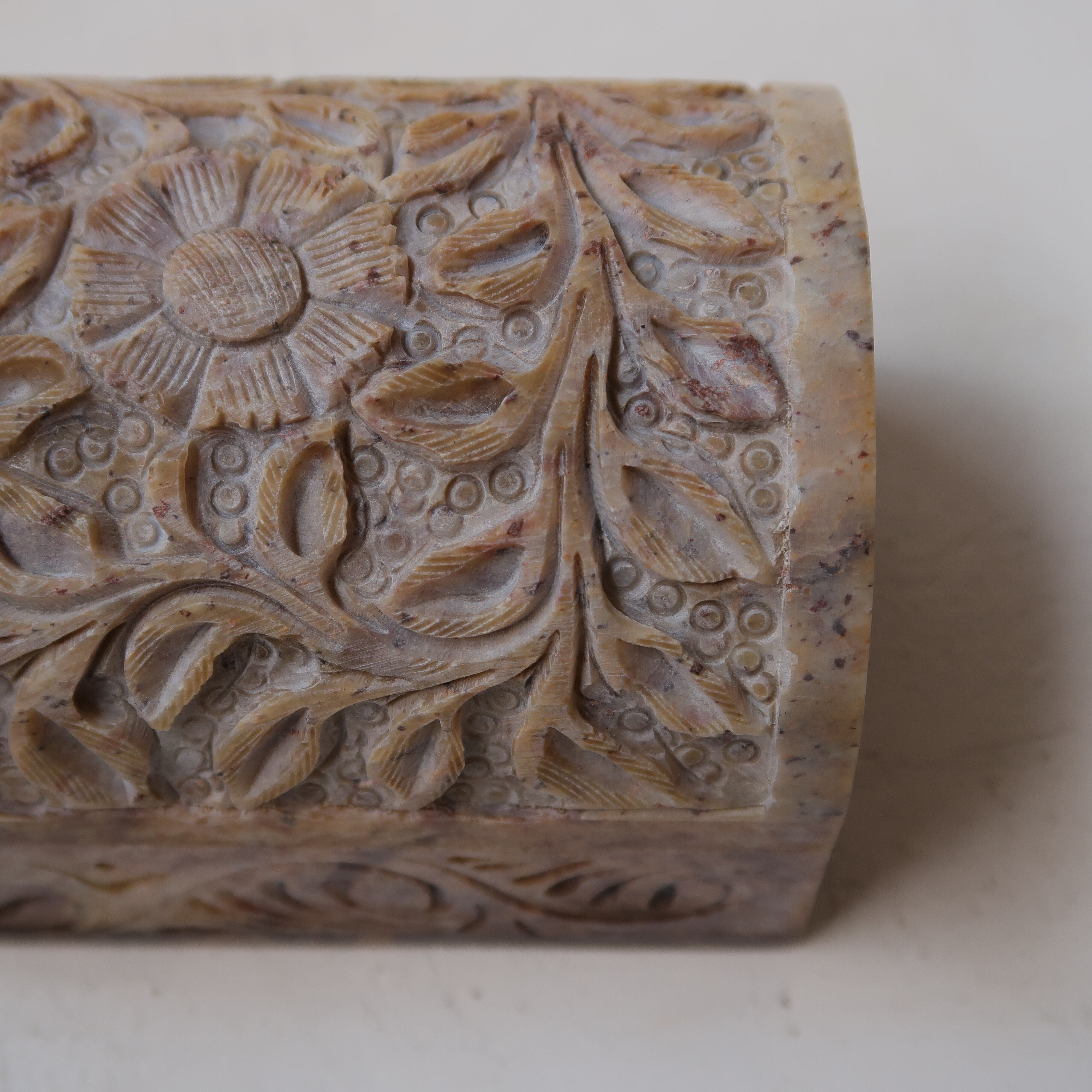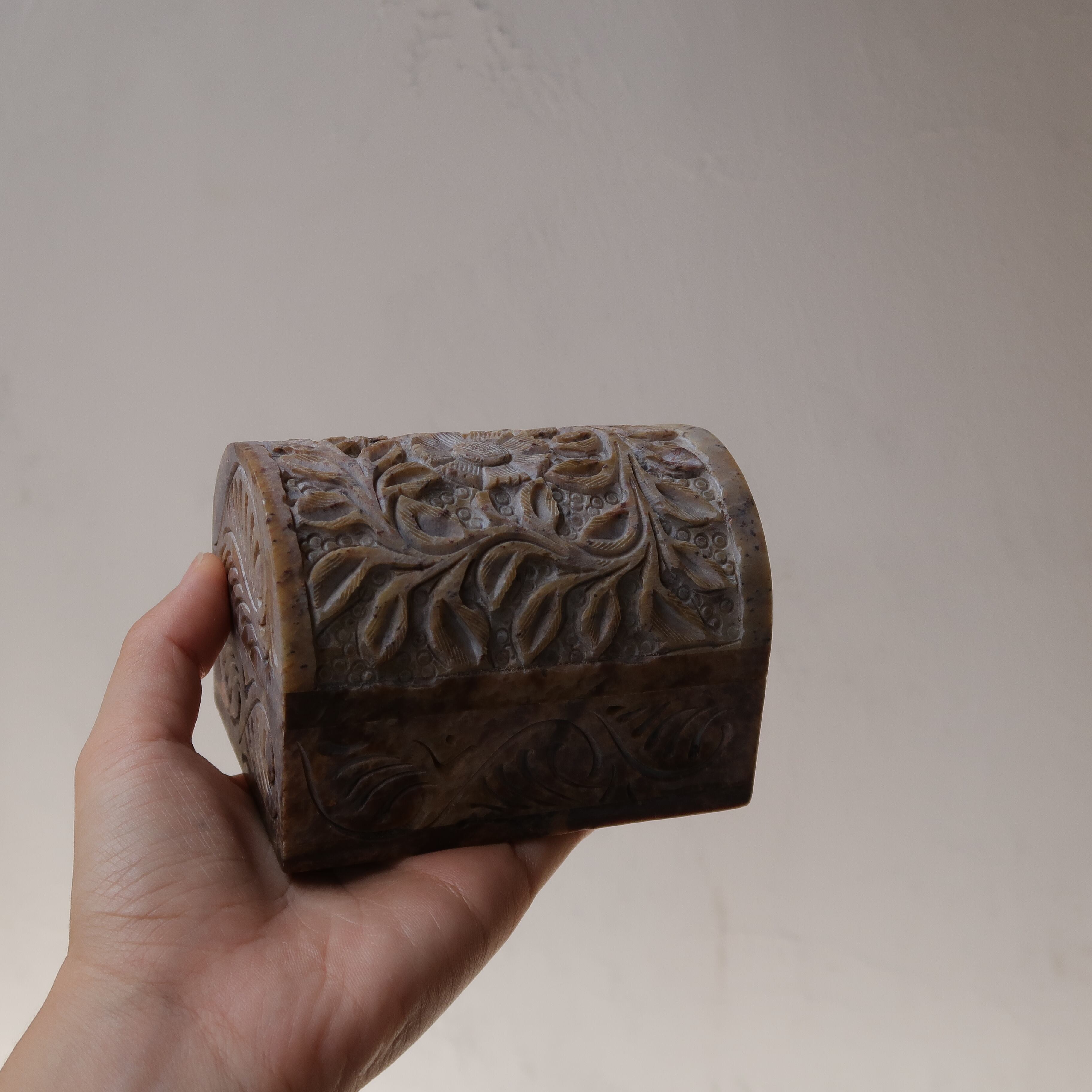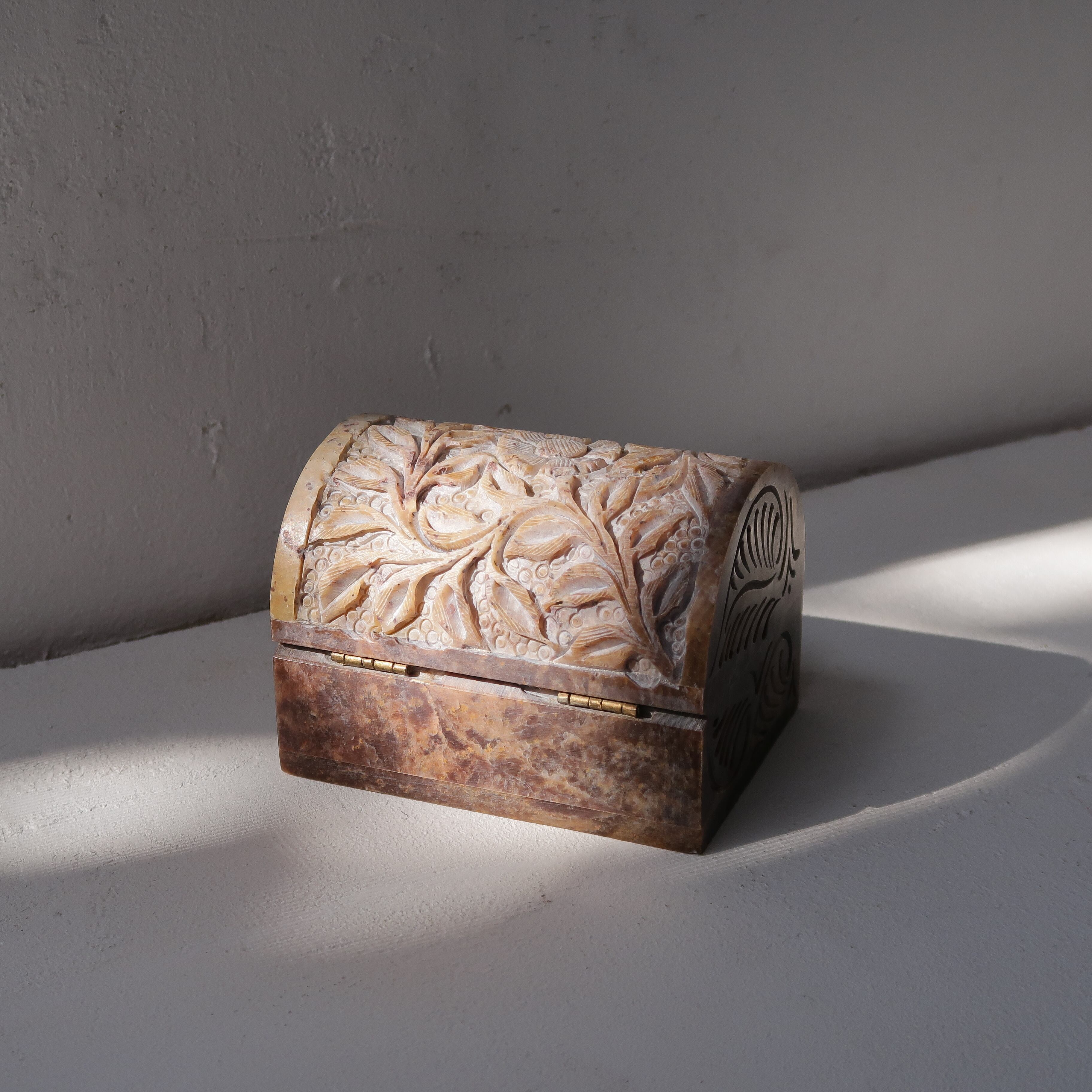 草木のリースとお花の彫りがかわいいジュエリーボックス。石製で、模様が彫られてでこぼこしています。草花だけが彫られていると思いきや、背景に丸々もいて、芸が細かいんです。