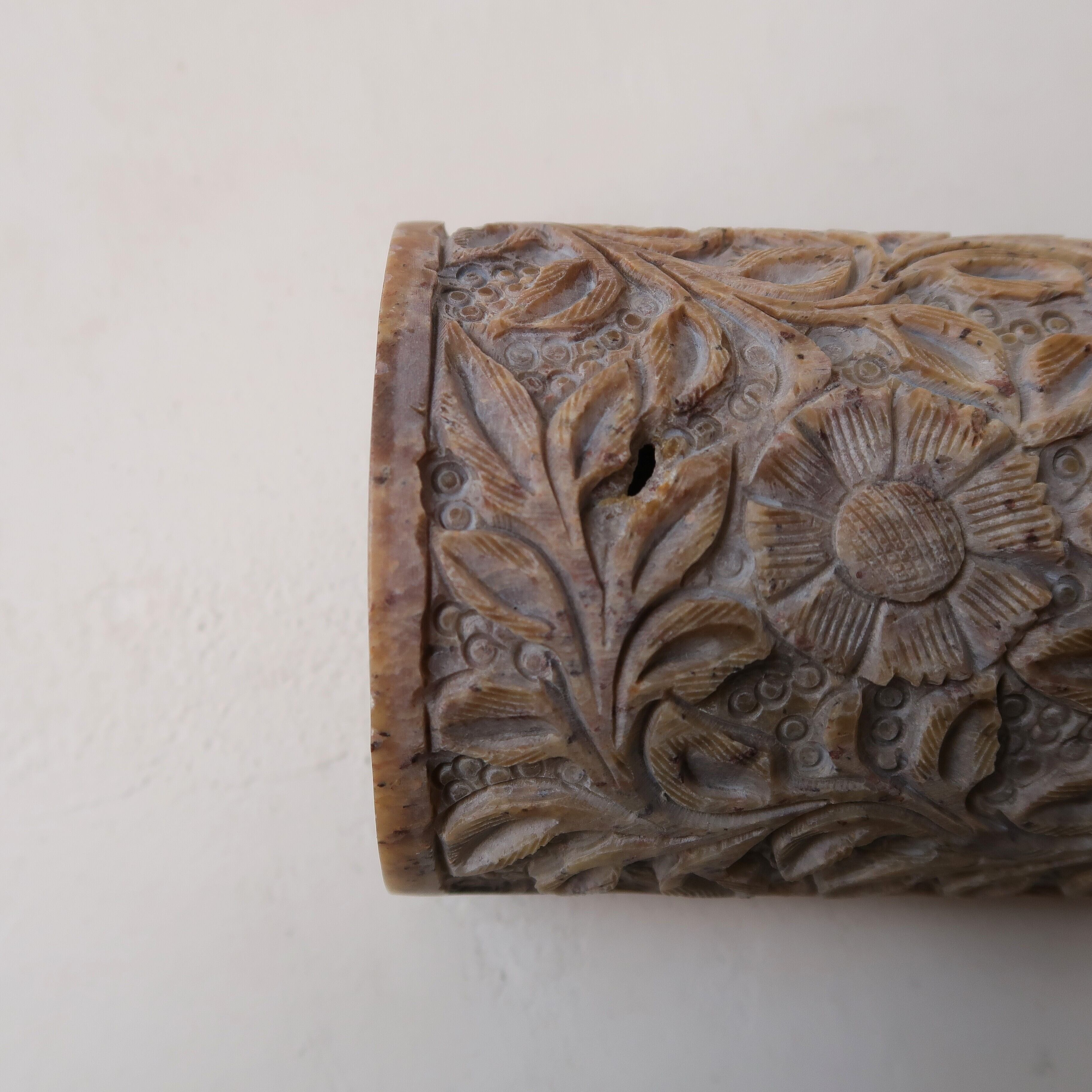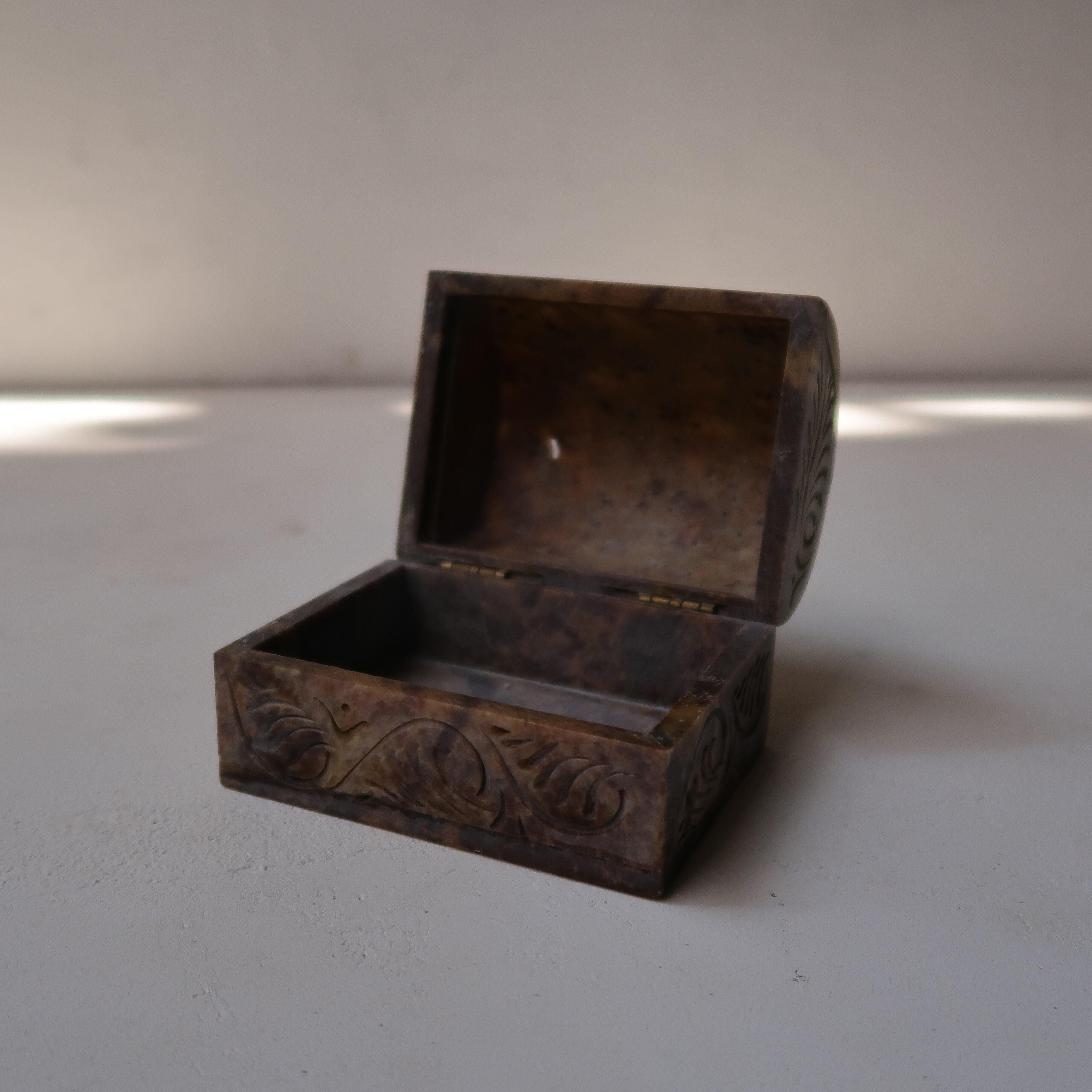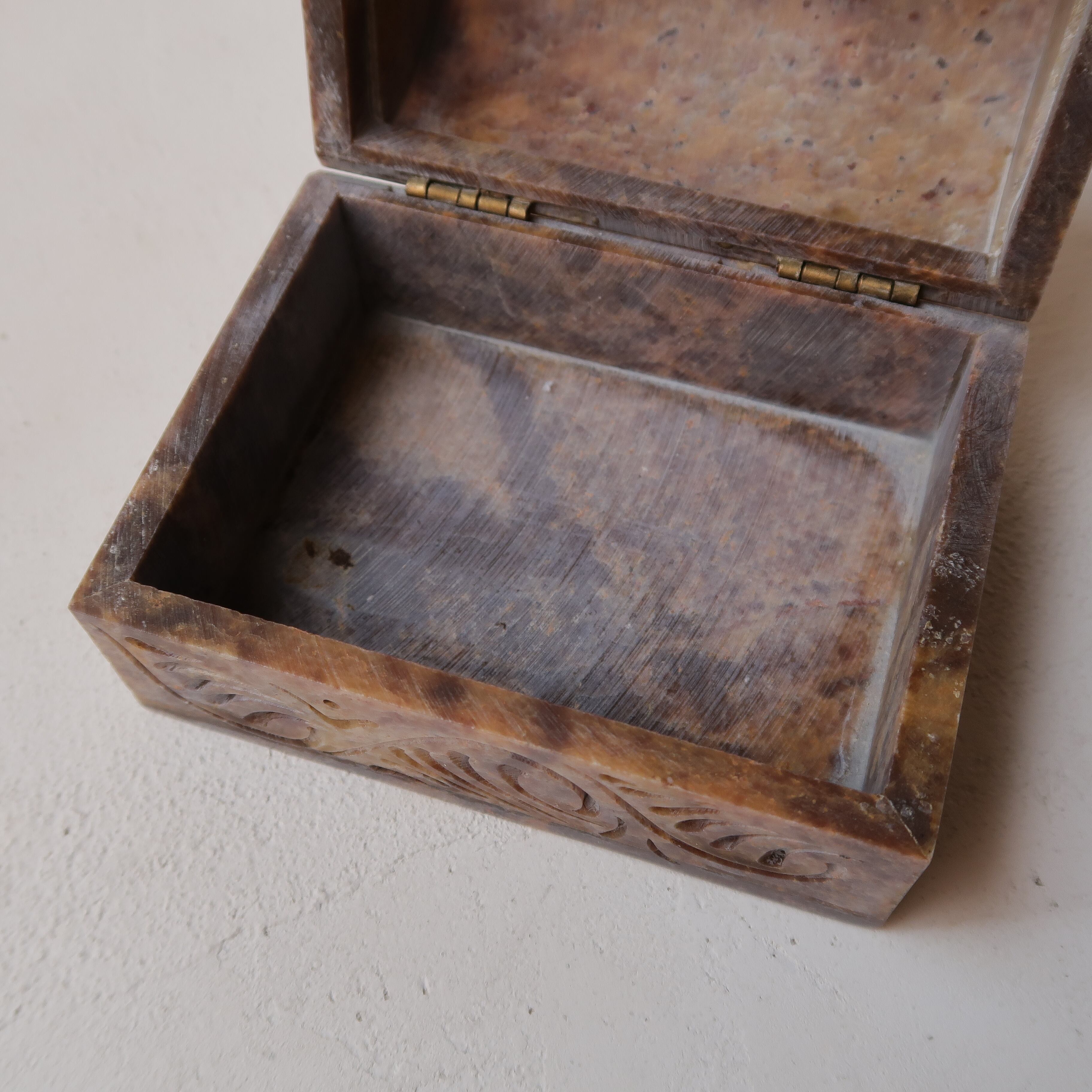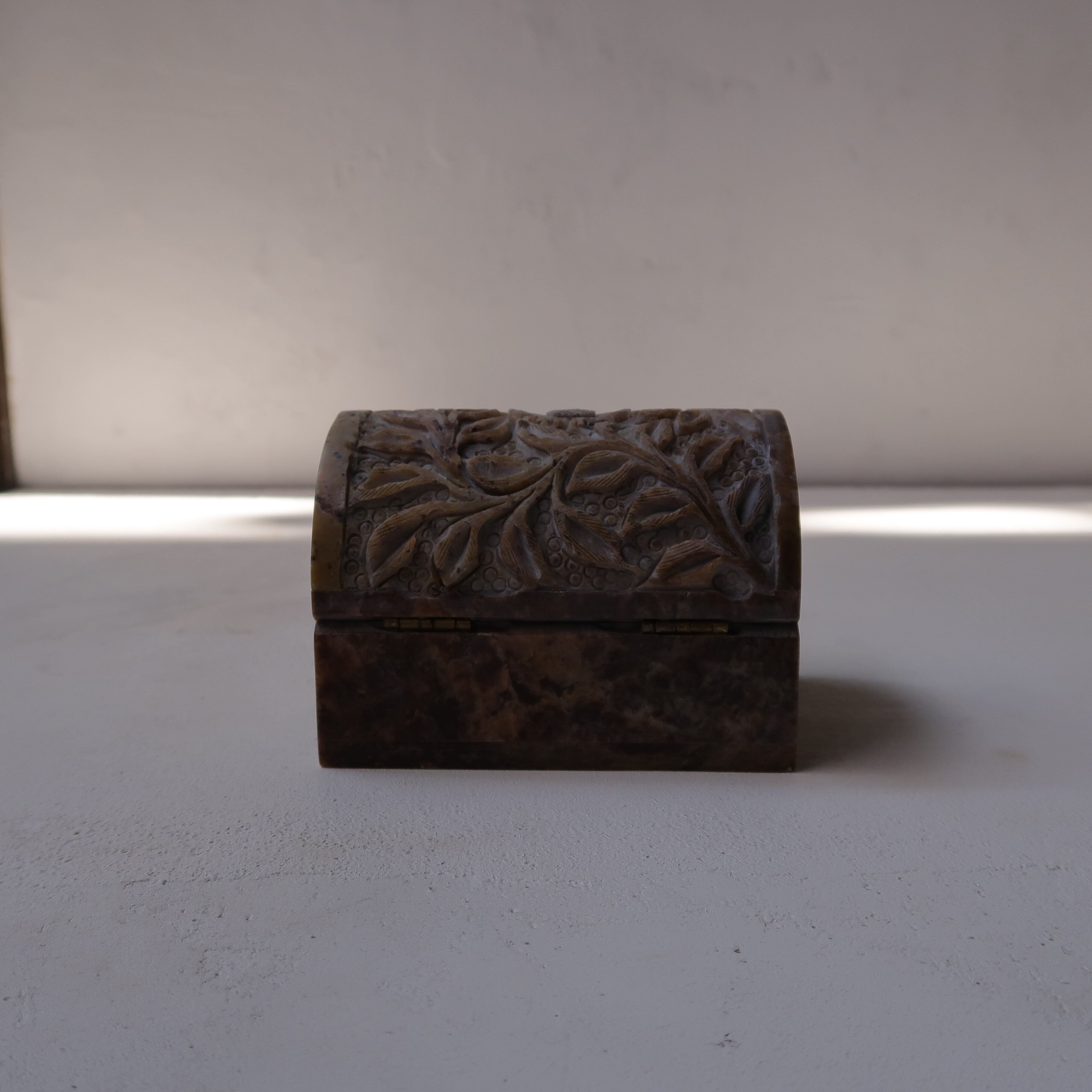 草木のリースとお花の彫りがかわいいジュエリーボックス。石製で、模様が彫られてでこぼこしています。草花だけが彫られていると思いきや、背景に丸々もいて、芸が細かいんです。