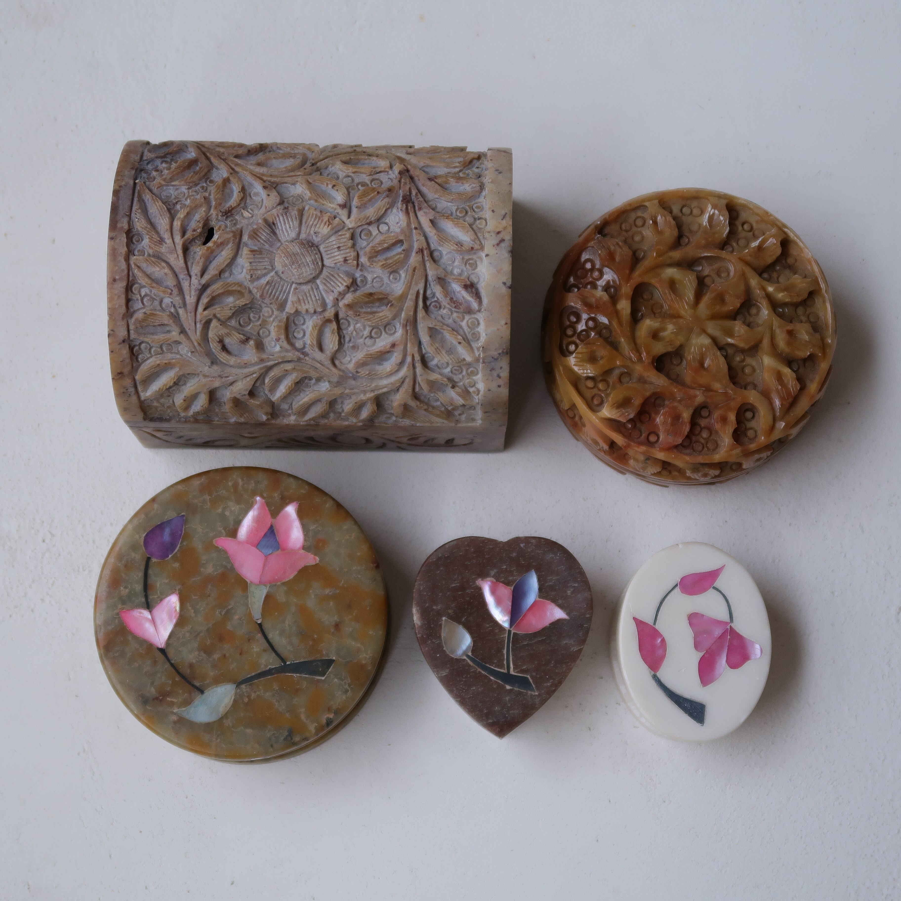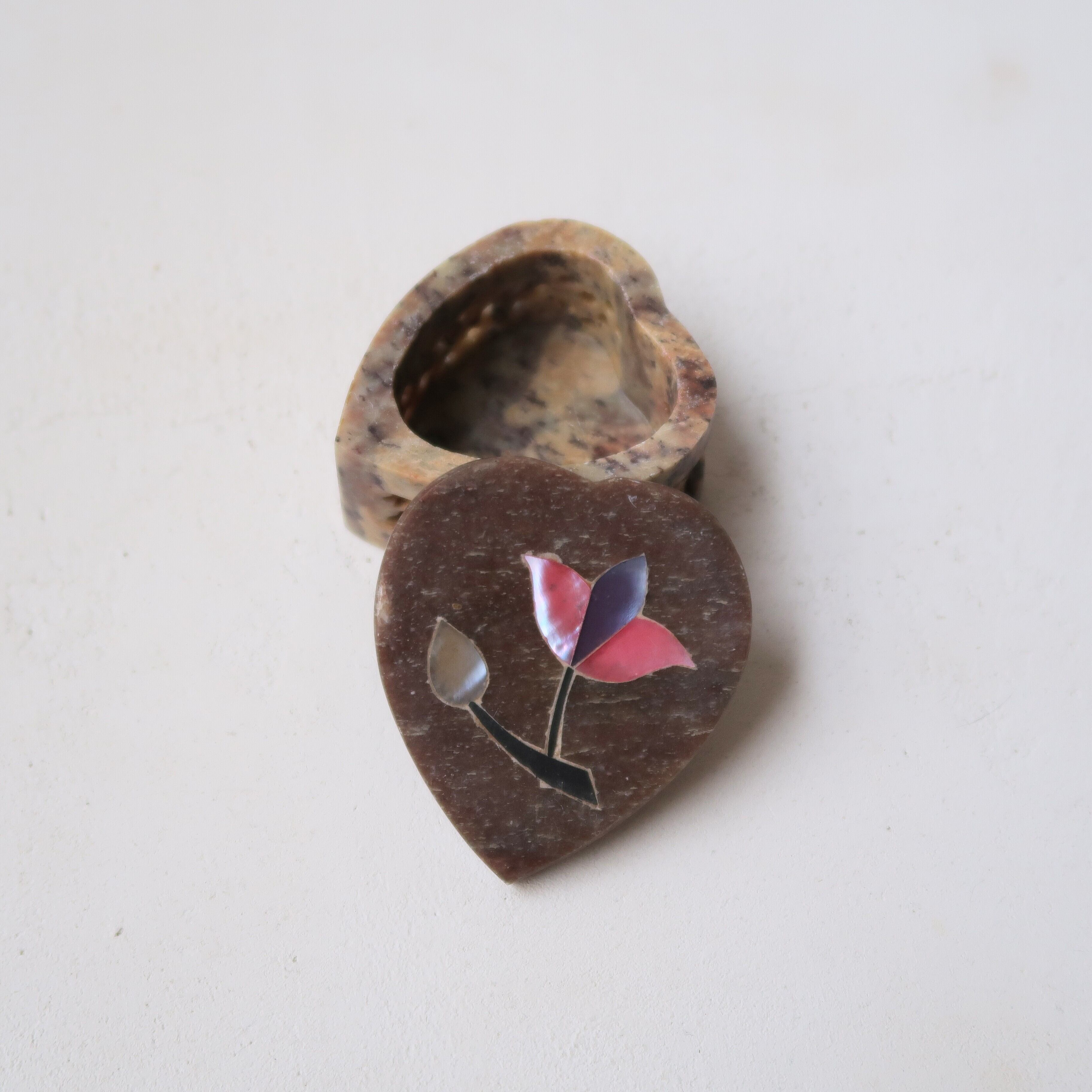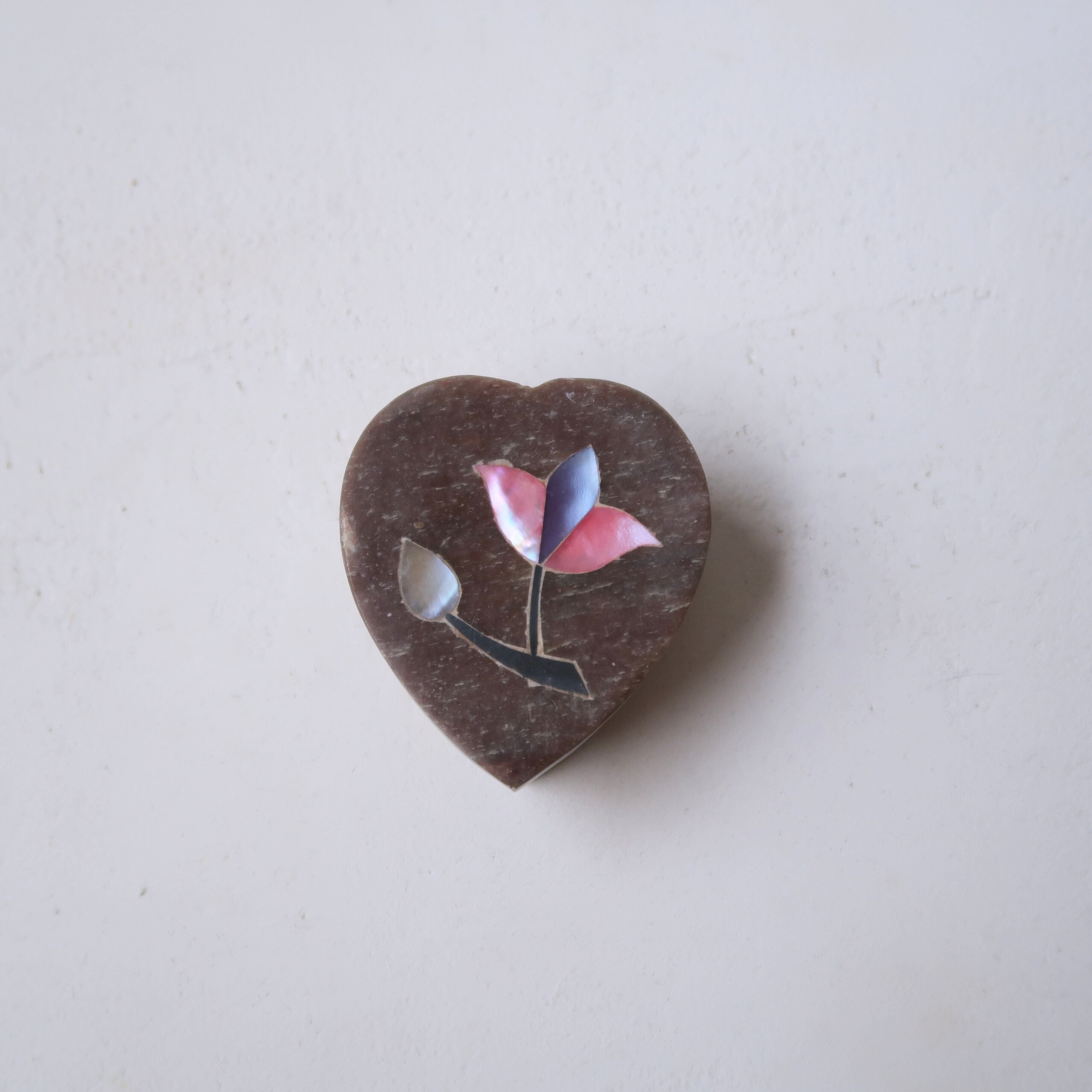 お花の象嵌がほどこされたちいさなジュエリーケース。今回は、ハートの形。