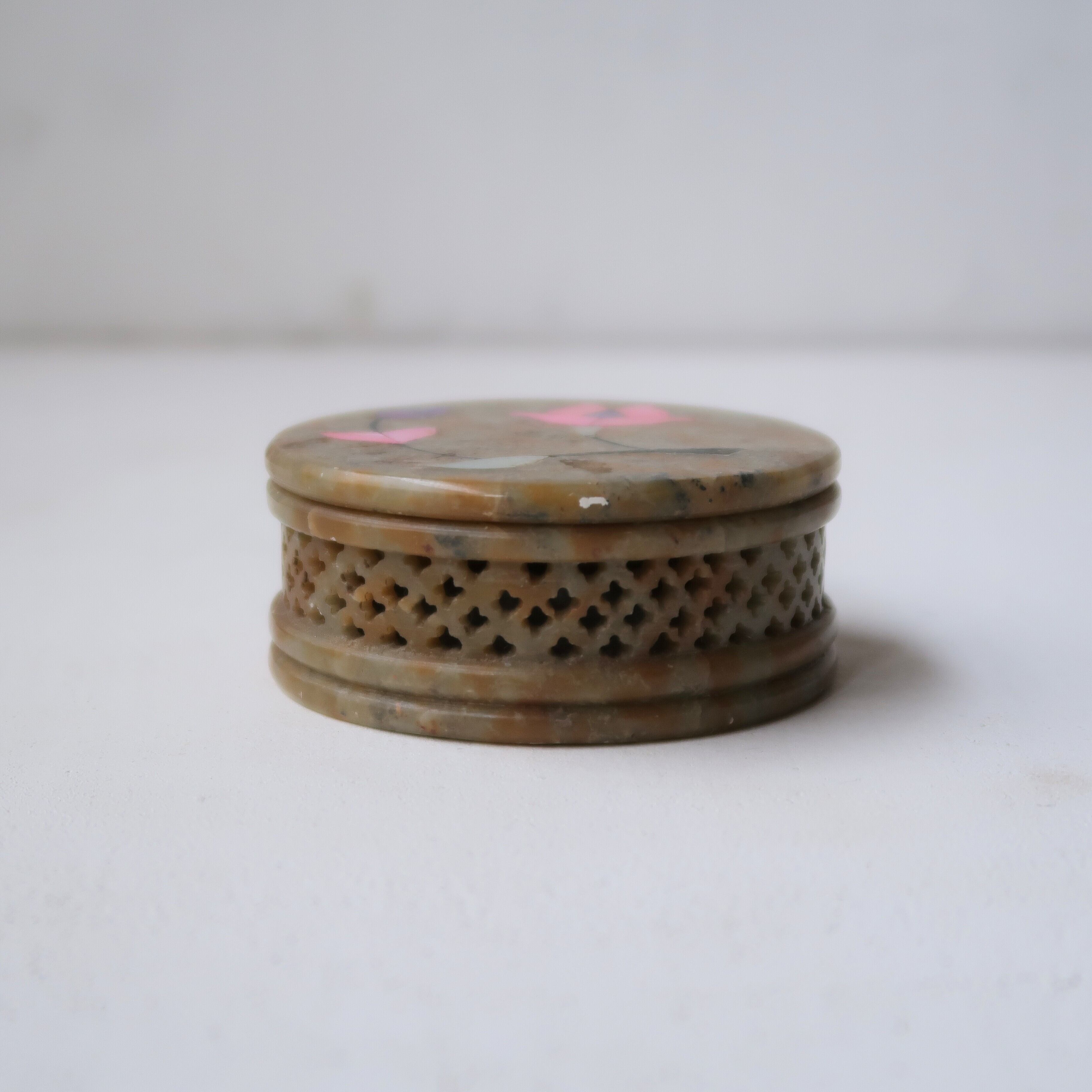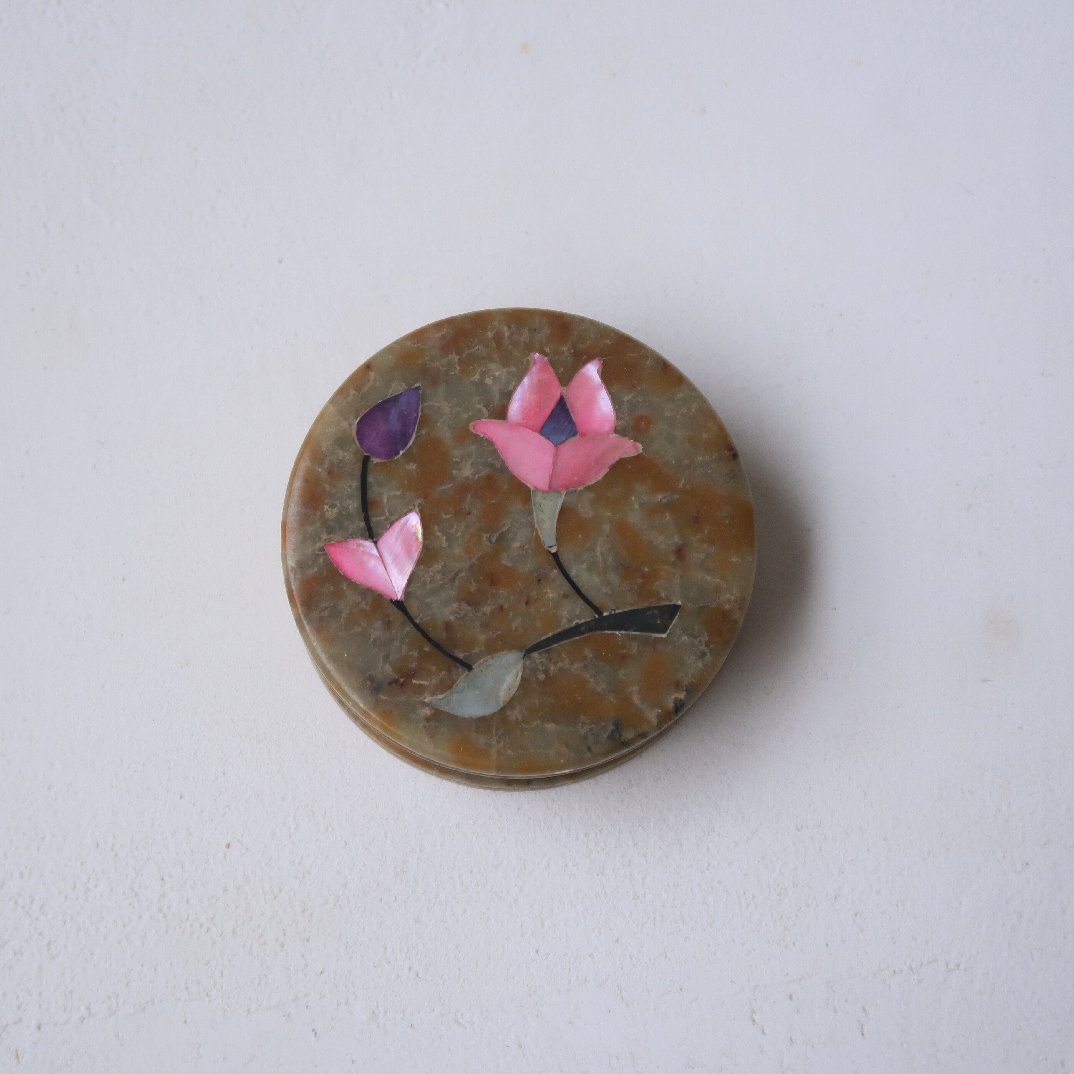 お花の象嵌がほどこされたジュエリーケース。カーキベースに、ピンクのお花がほどこされた物をセレクトしてみました。花びらが、透明感があってかわいい。側面は、あみあみのタイプです。