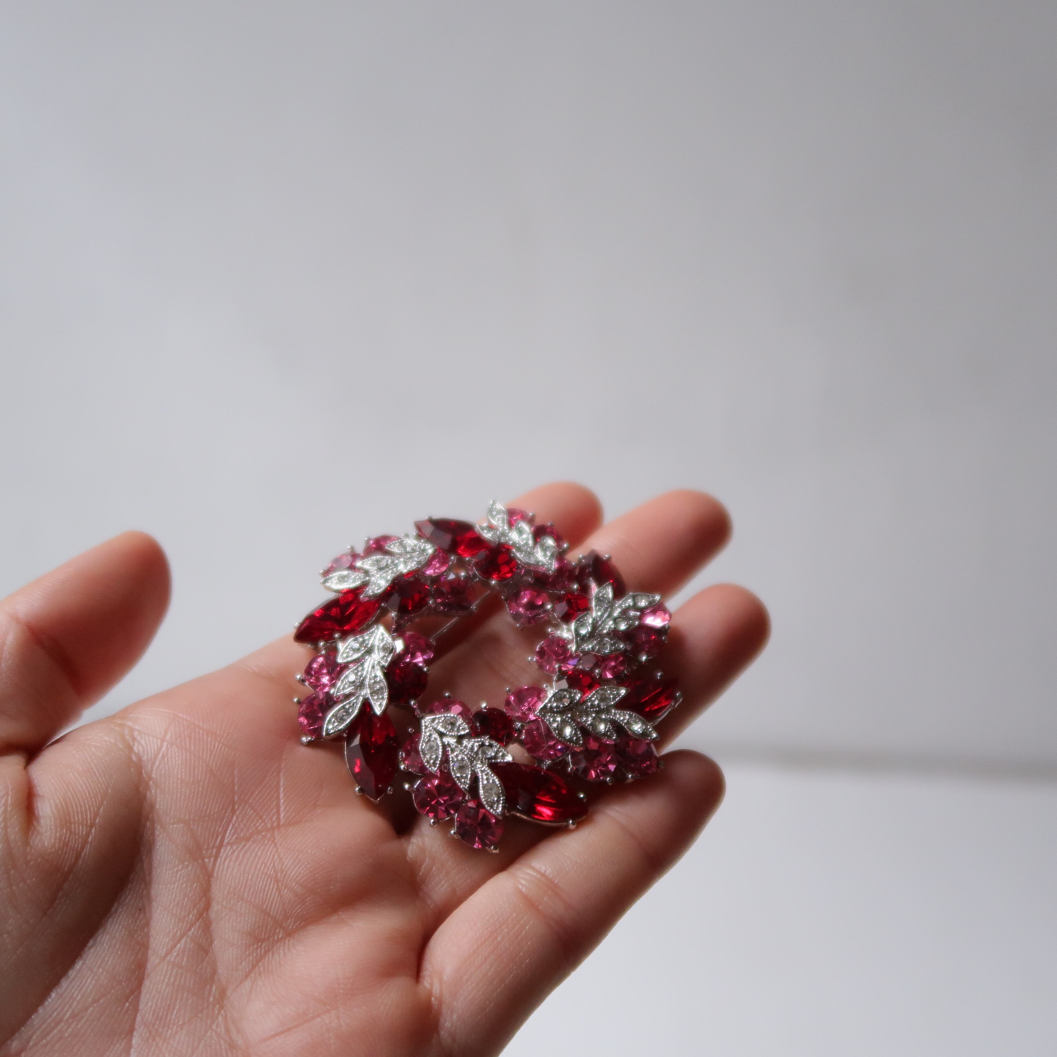 ピンク、赤、白。ひとつひとつのきらきらがかわいいリースのブローチ。白いのはリーフ型になっていて、ホリデーシーズンにぴったり。裏側を見ると、ネックレスにもできる輪っかがあります。2wayで、ちょっぴりお得です。