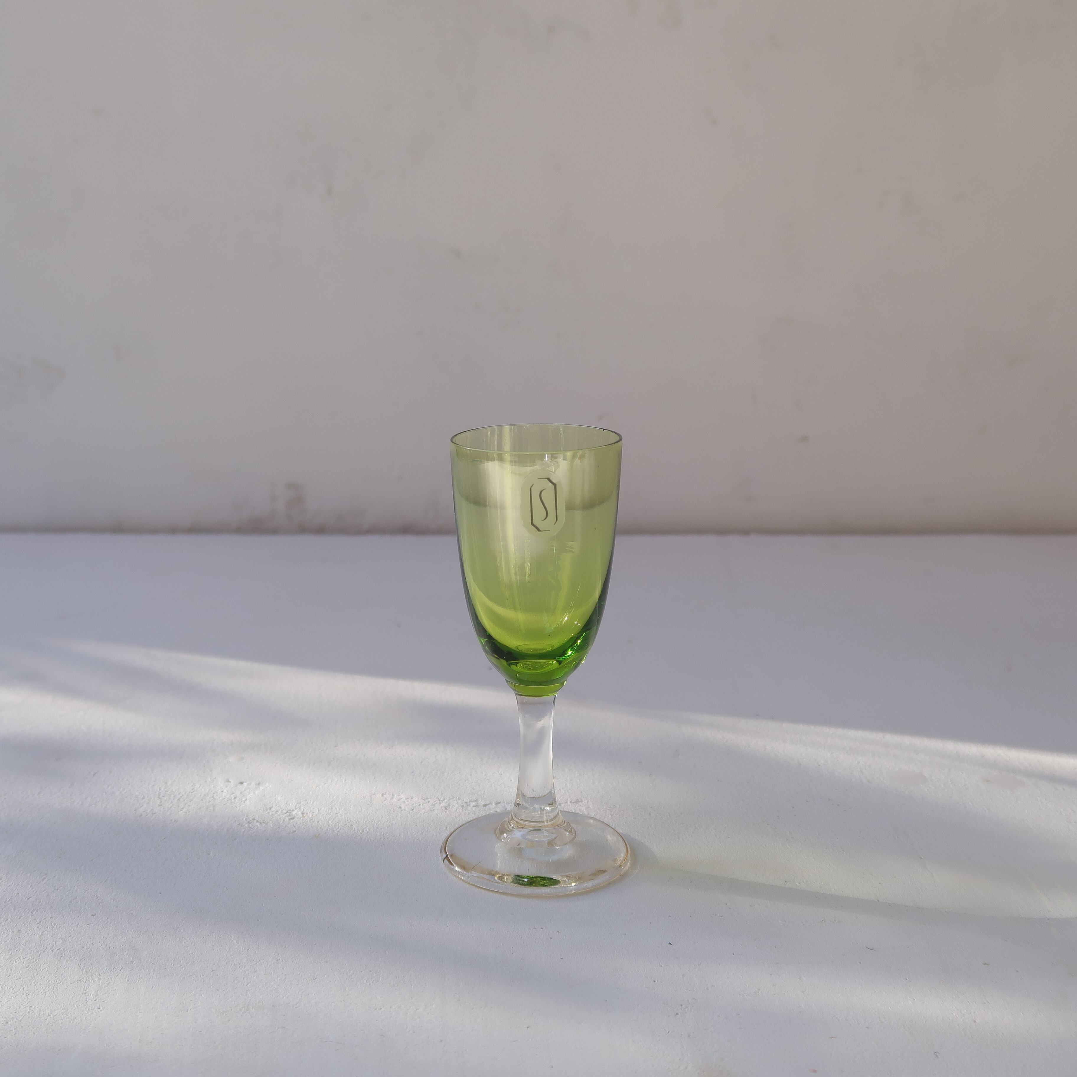 華やかなグリーンが目を引く、グリーンのミニグラス。つやつやで透明感のある質感がよく、ステムだけとうめいなのもかわいい。ちょっぴりお酒を飲んだり、アクセサリーを飾ったり。お使いいただけます。