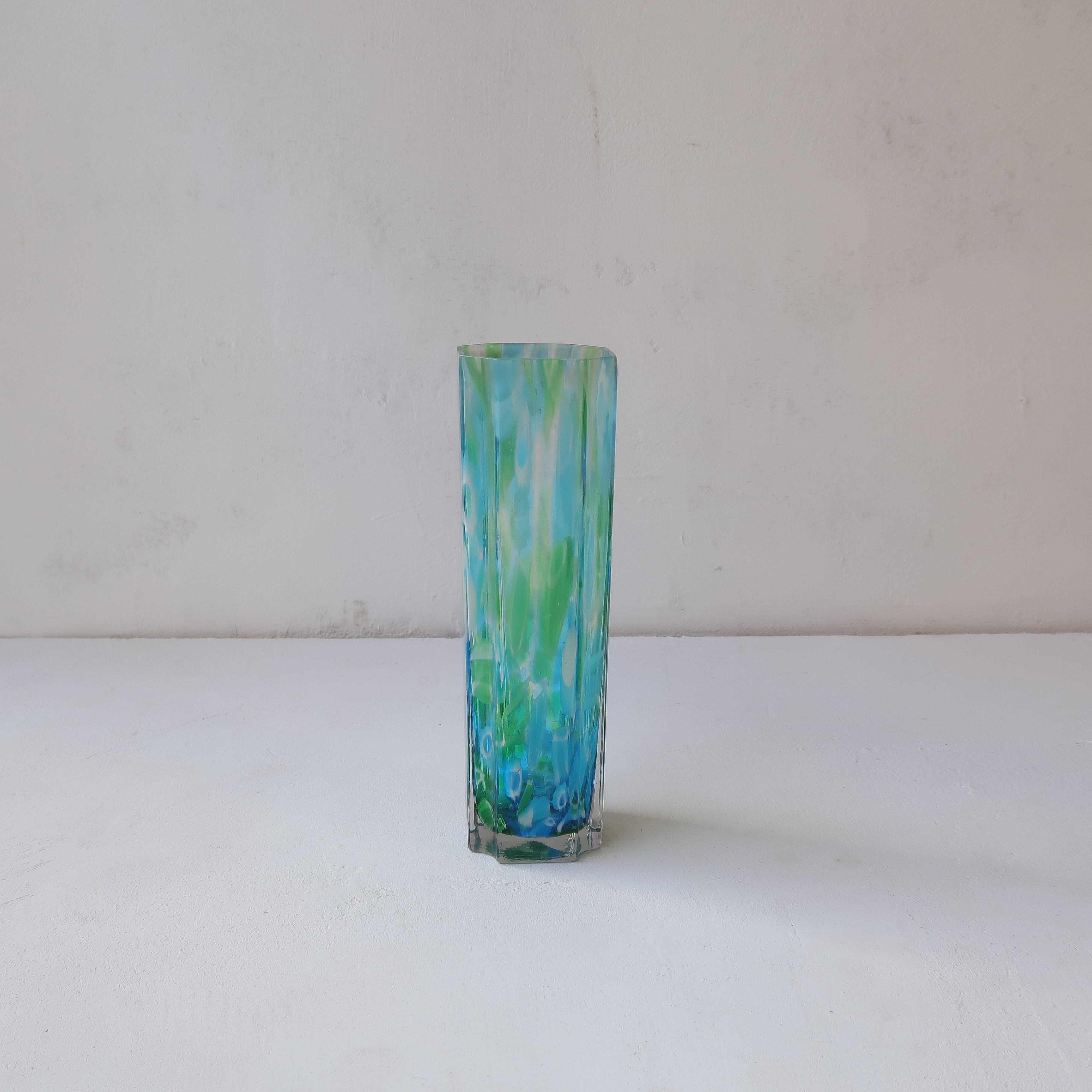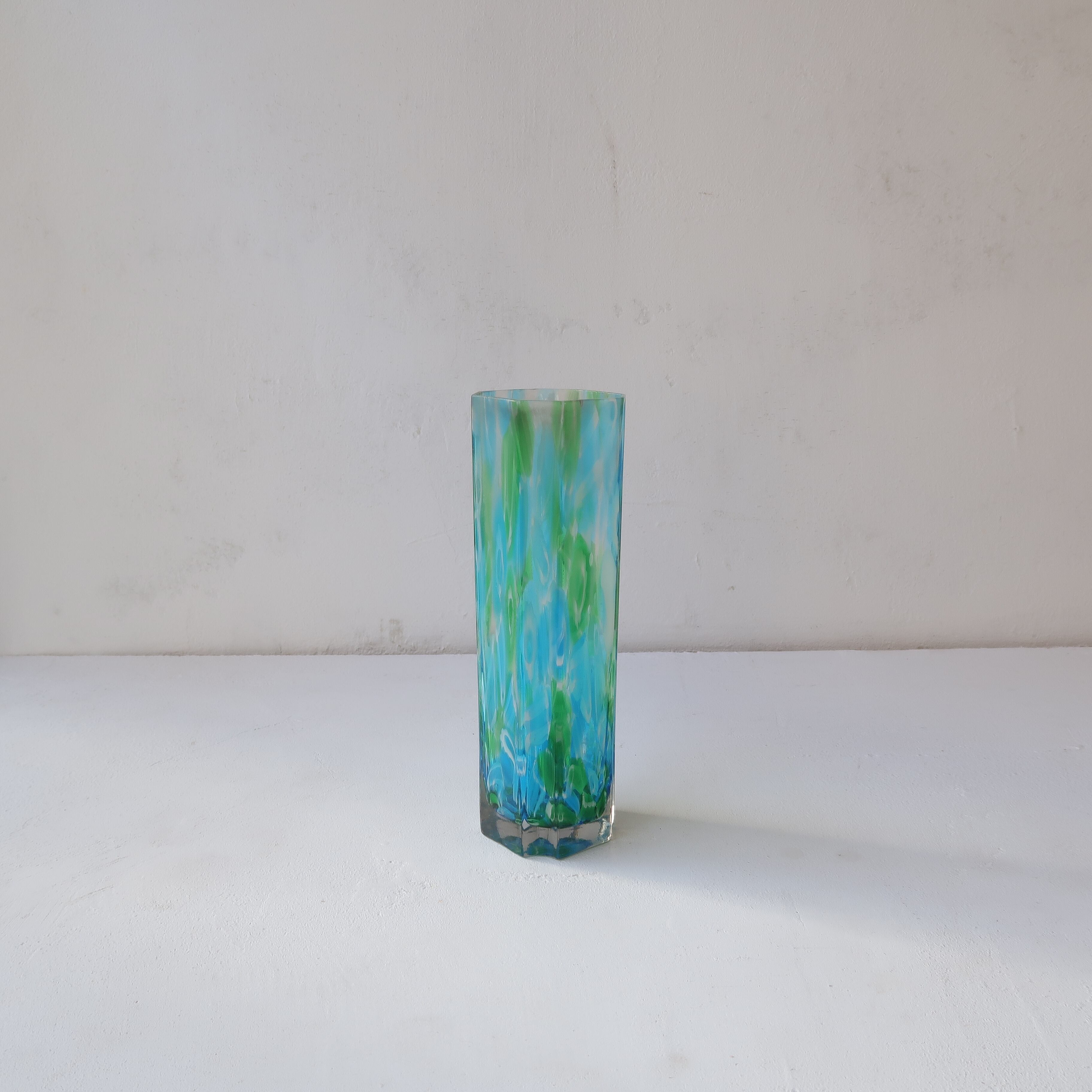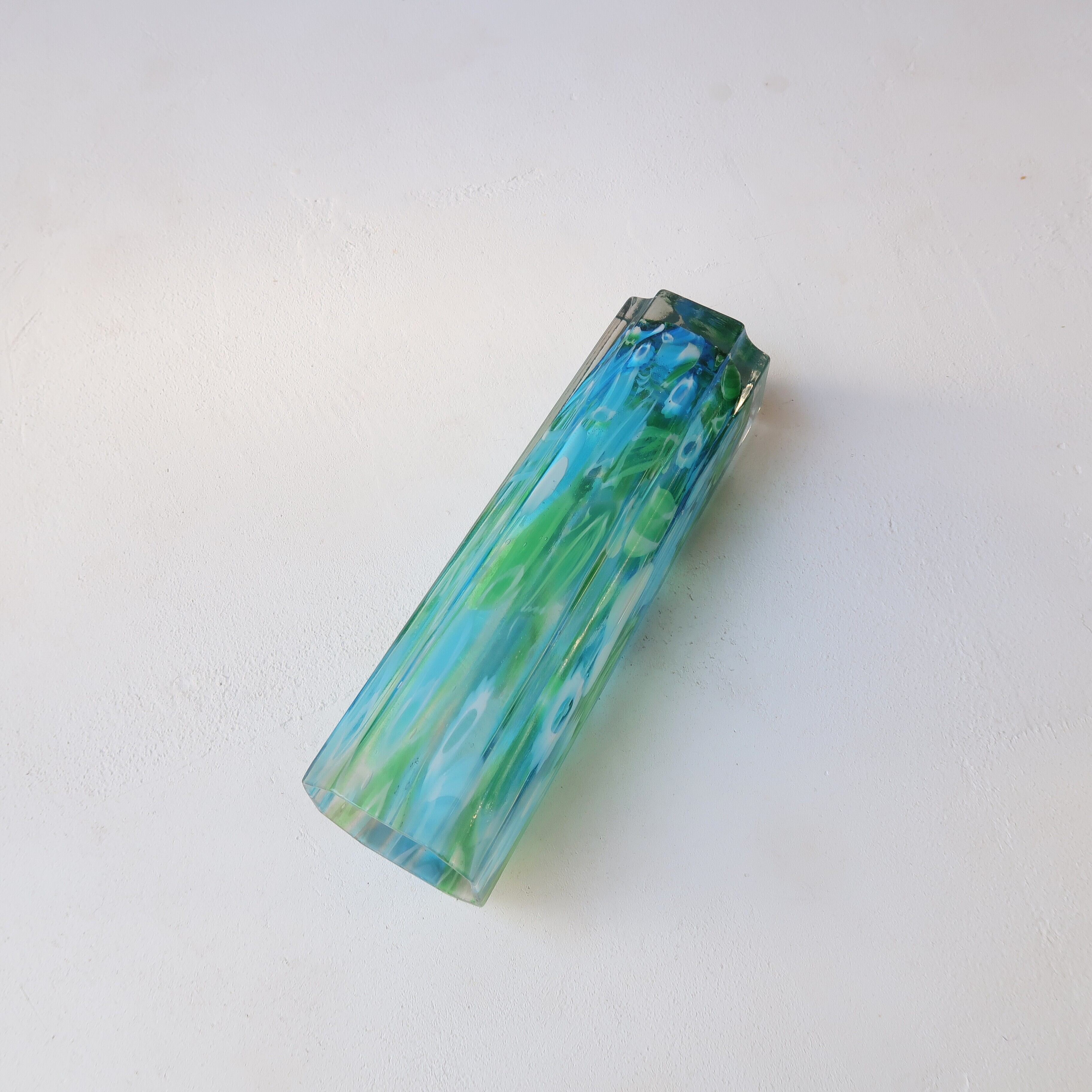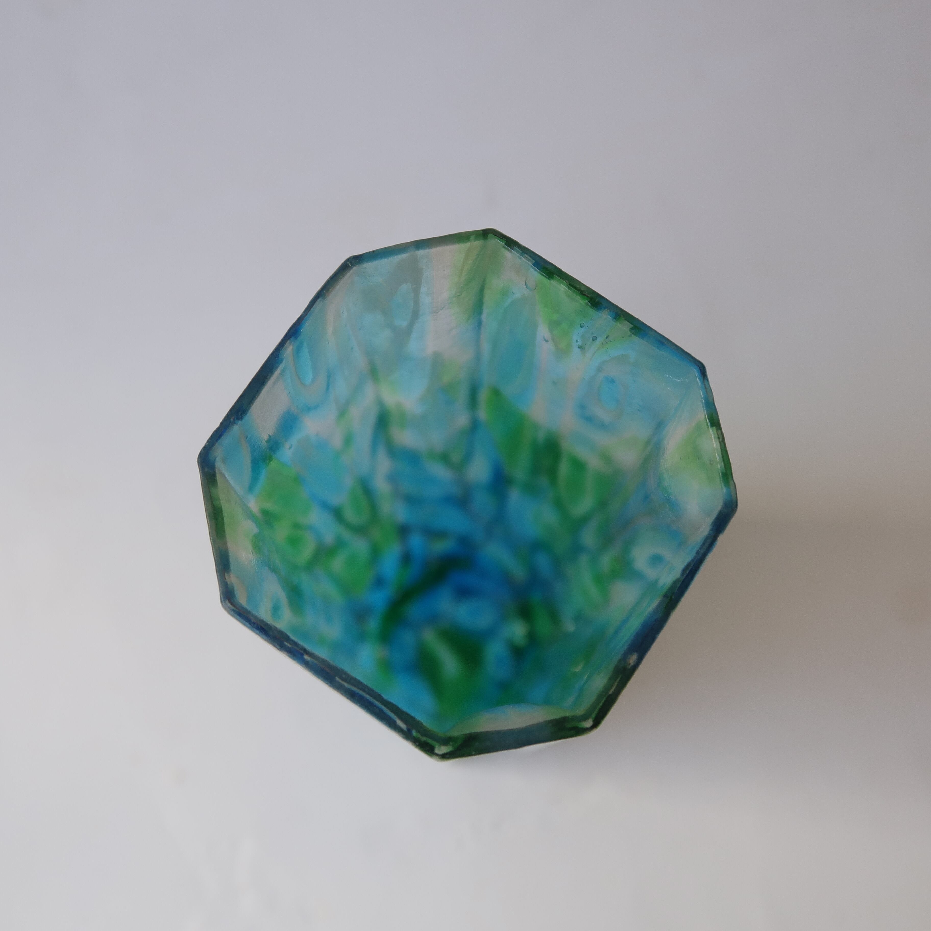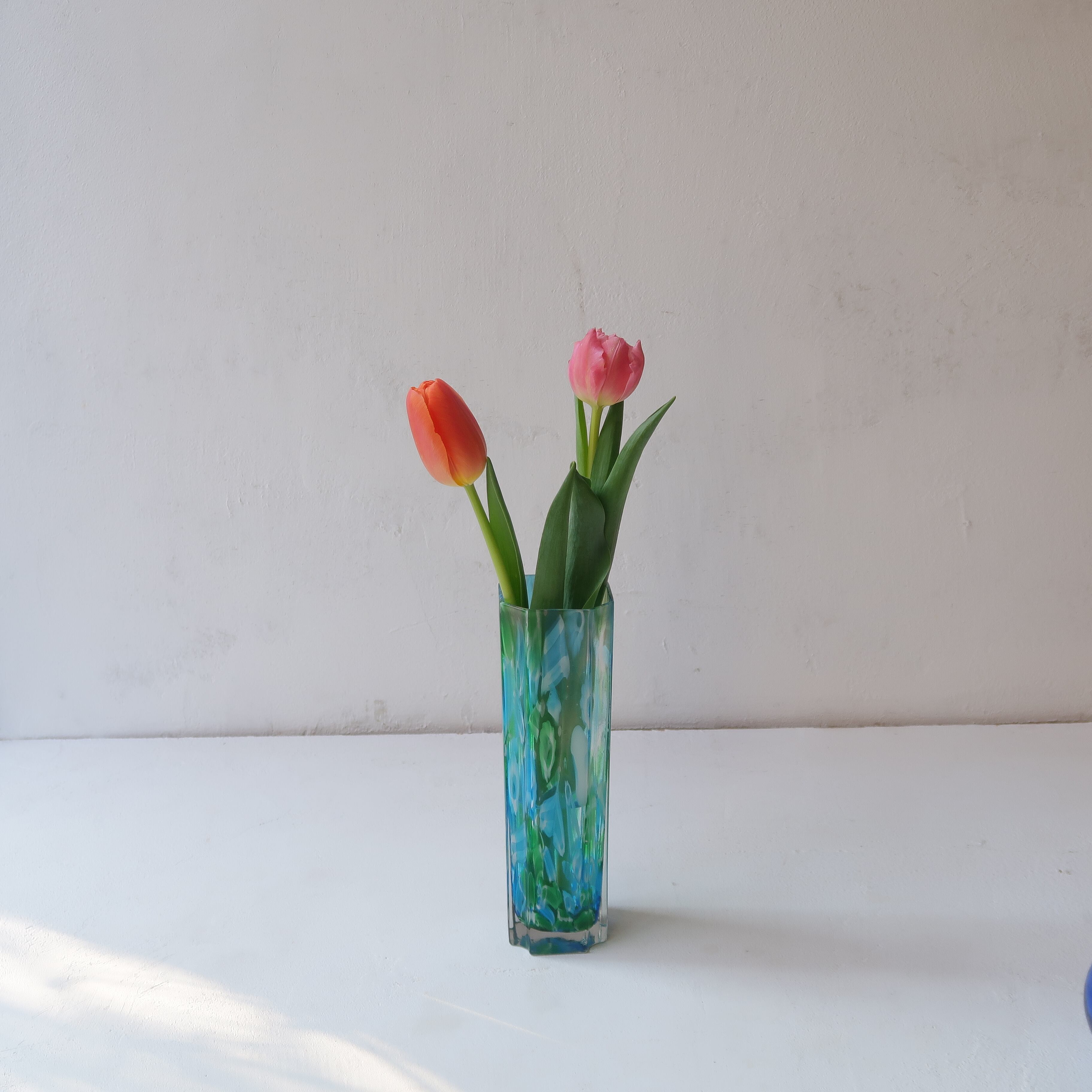 グリーンやブルーが折り混ざったマーブルカラーの花瓶。表面はざらっとした手ざわりのあるマットな質感で、形は四つ角のとれた角柱。きれいなブルーグリーンと、カクッとしたスマートなフォルムがかわいいんです。
