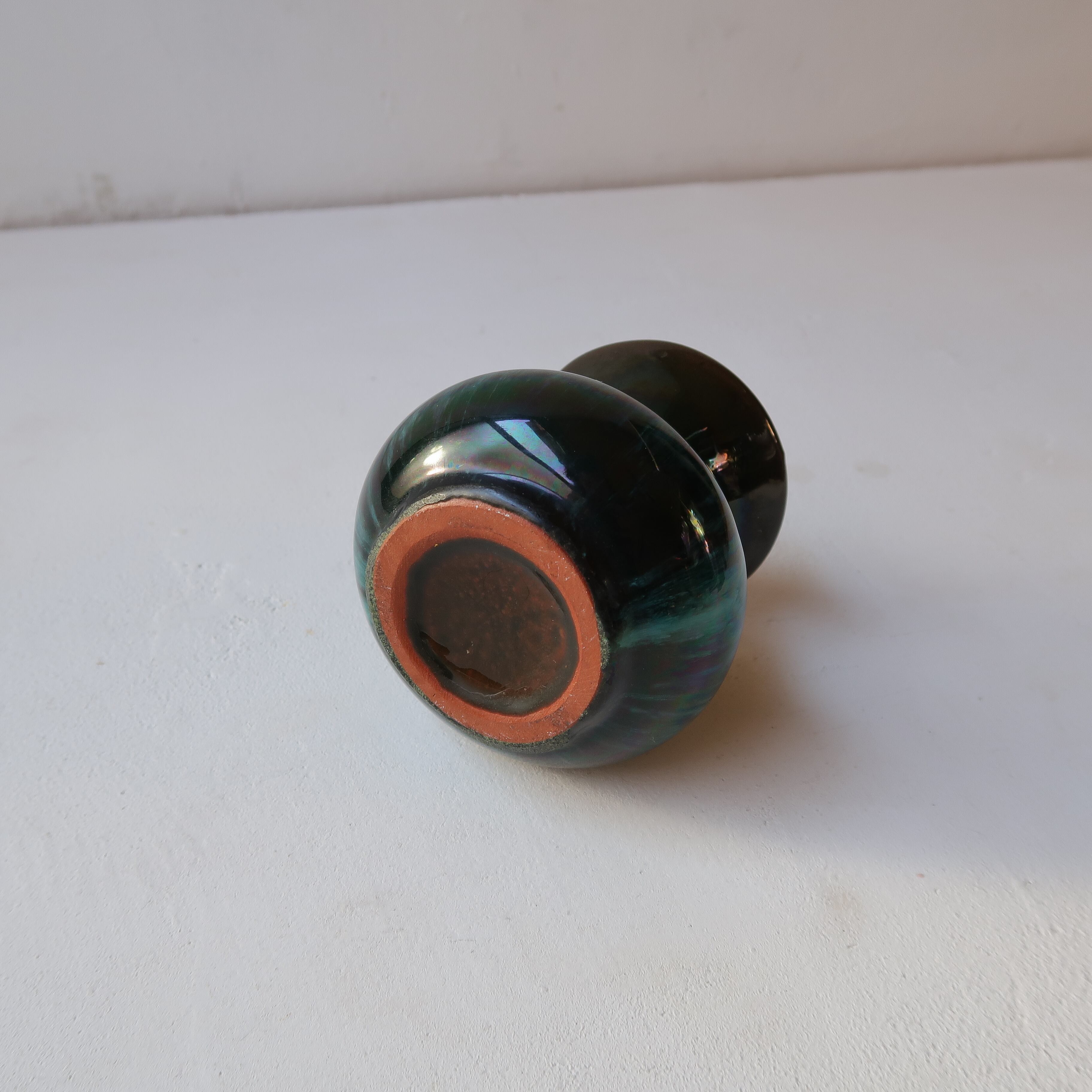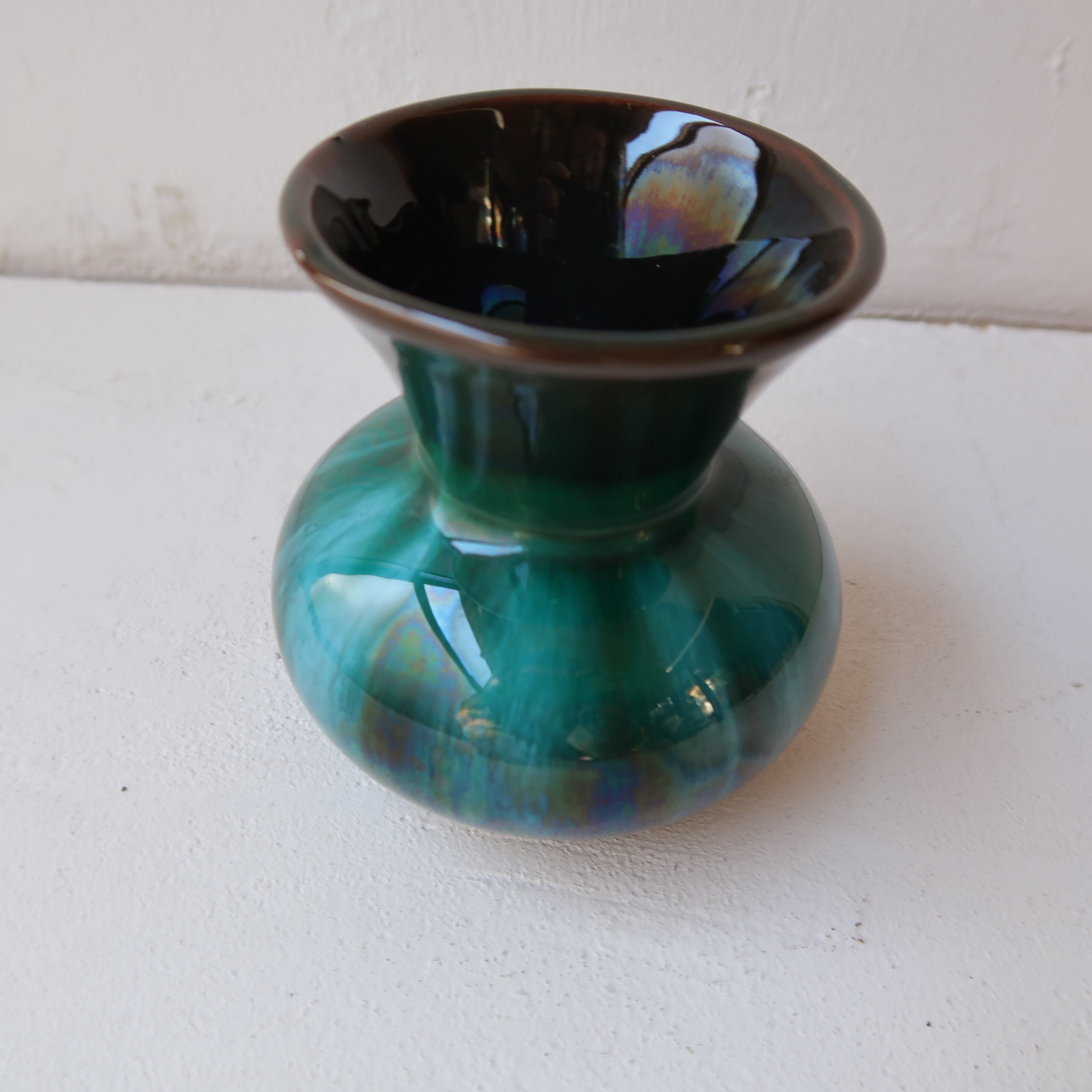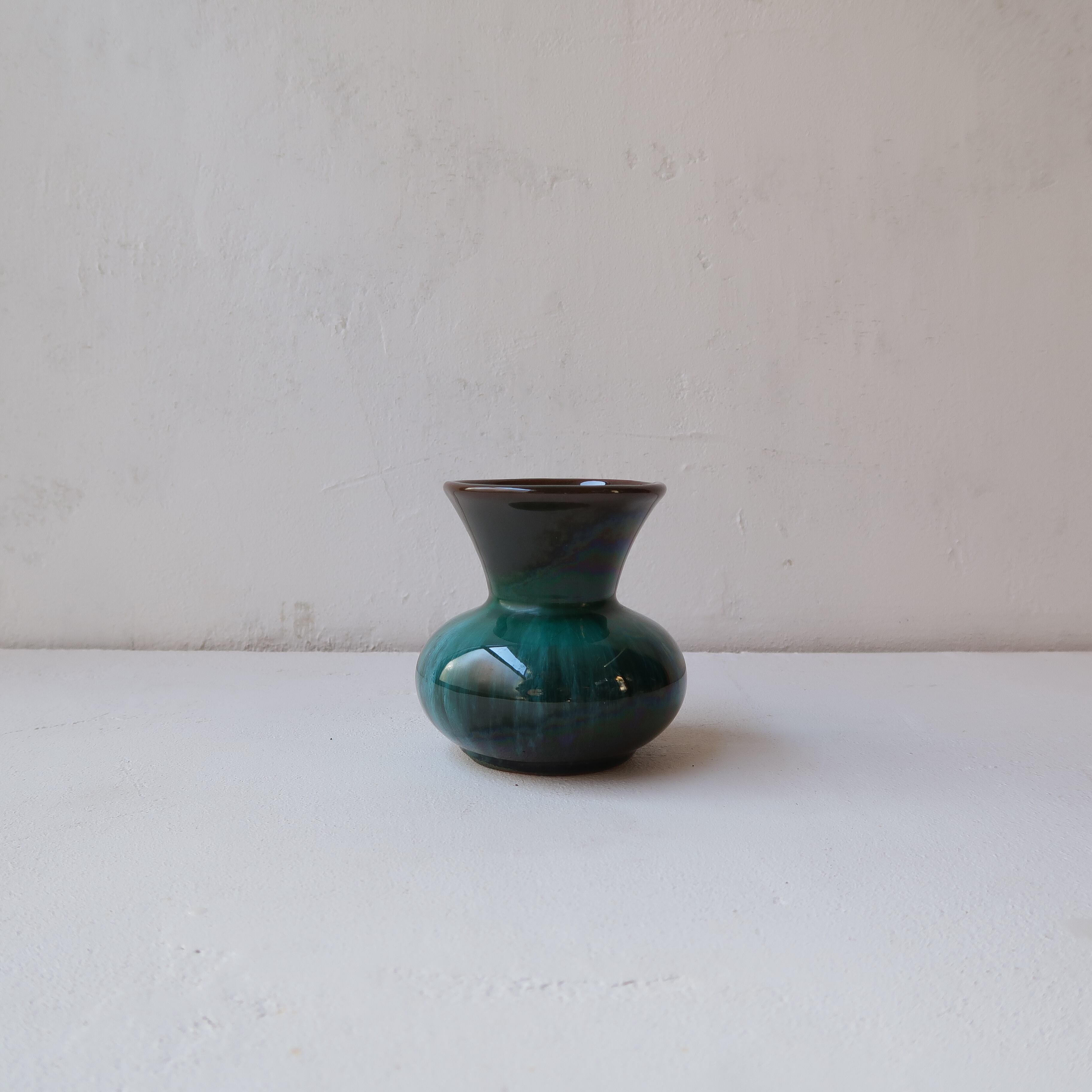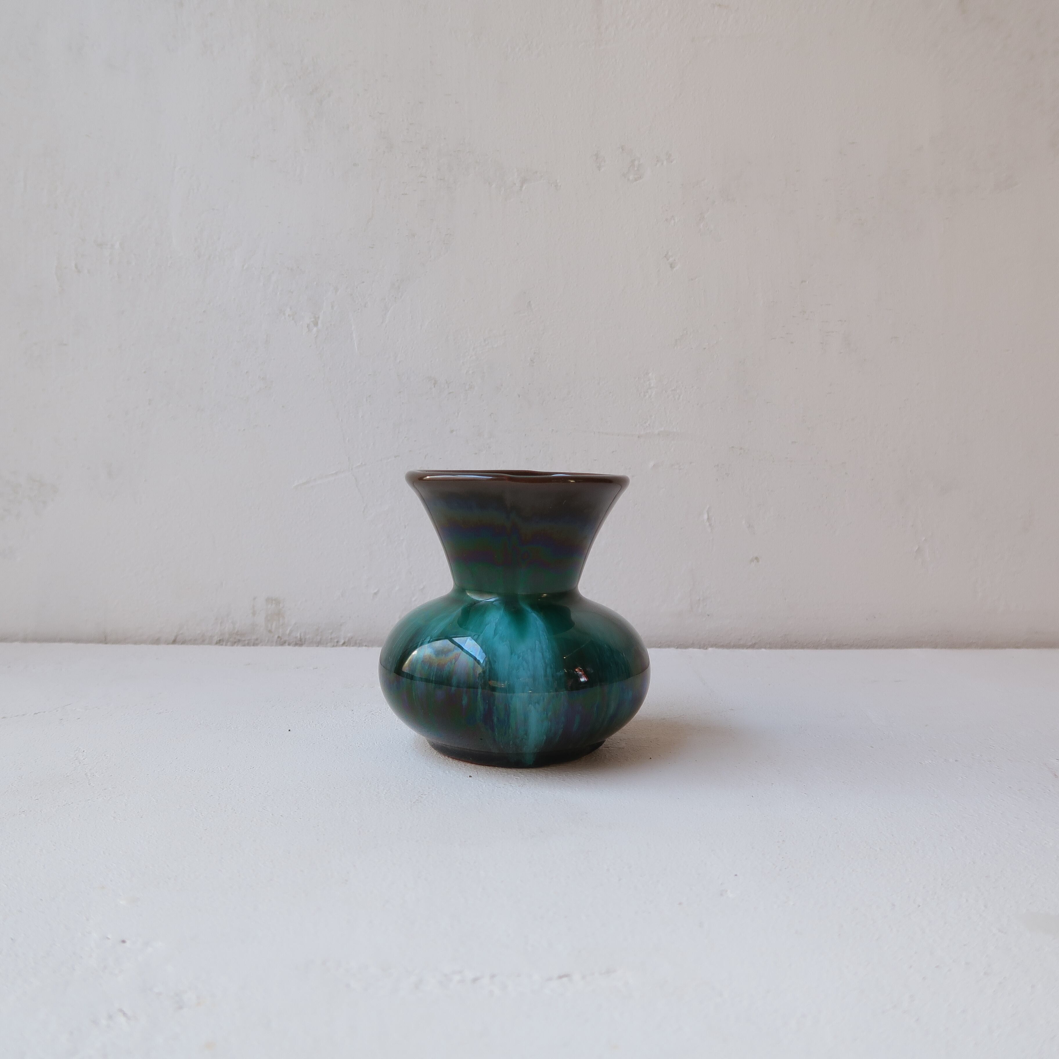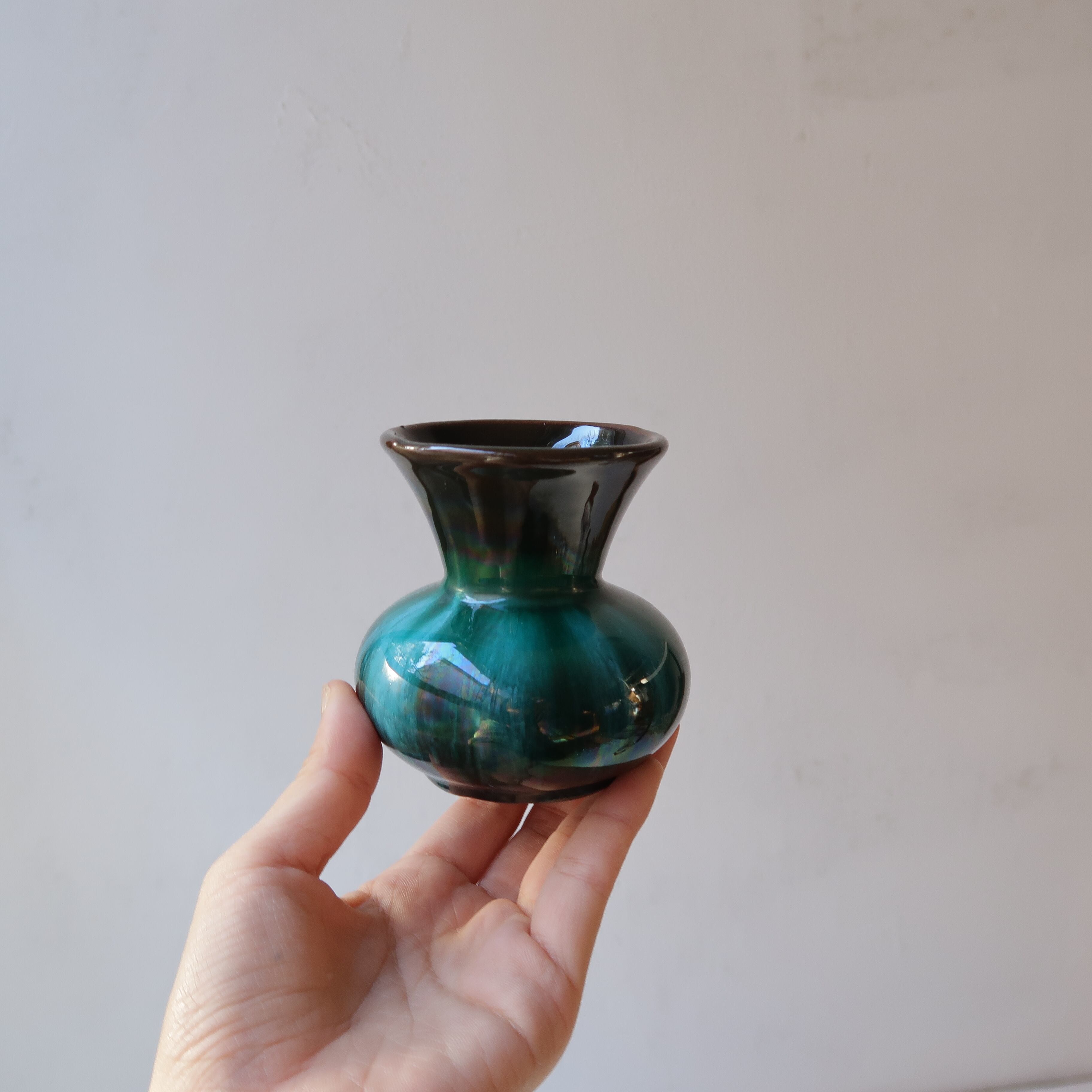深いグリーンやブルー、地のテラコッタが透けて見える小ぶりの花瓶。よく見ると、ほのかにオーロラのきらきらが。ちょっとしたお花を飾るのによい小さなサイズ感です。