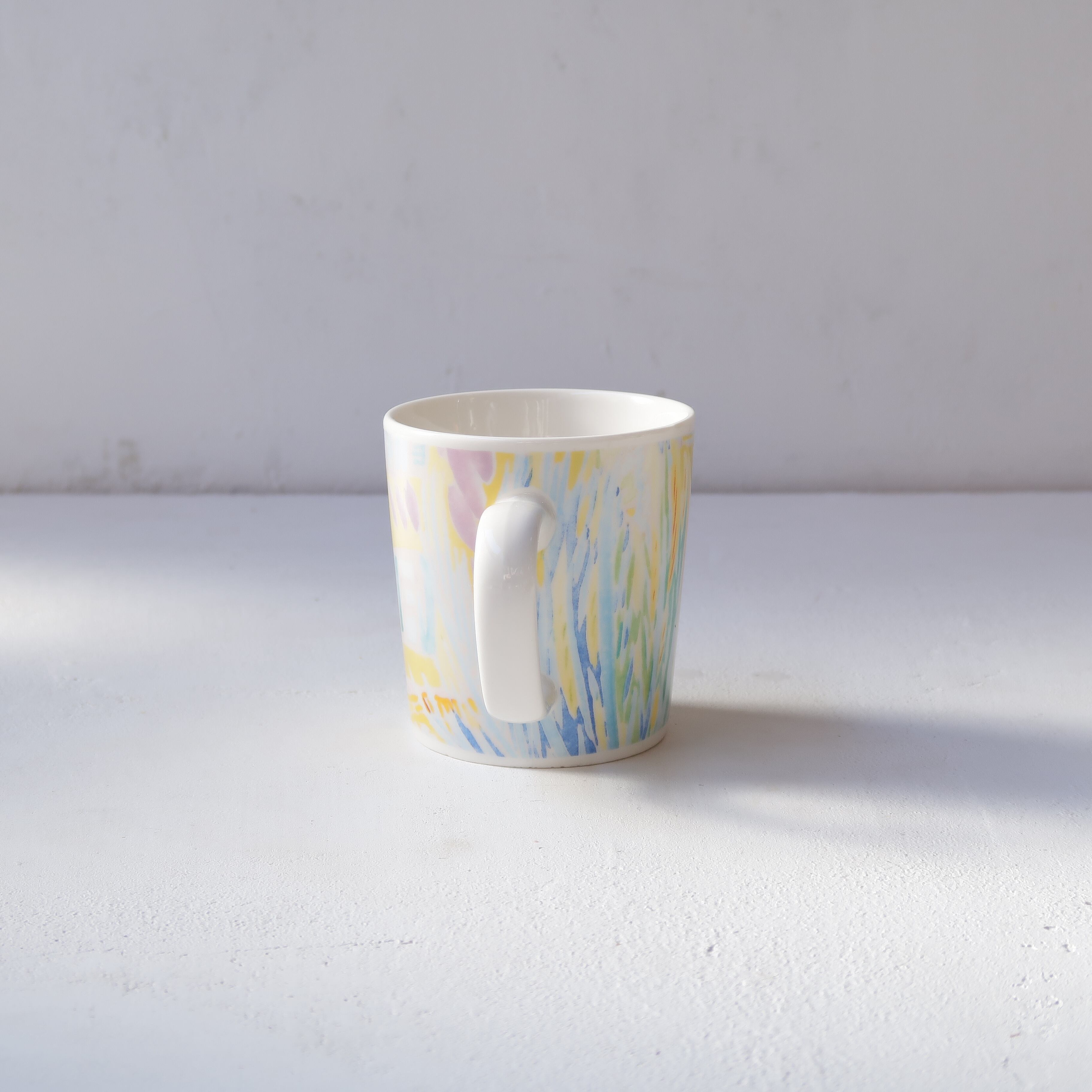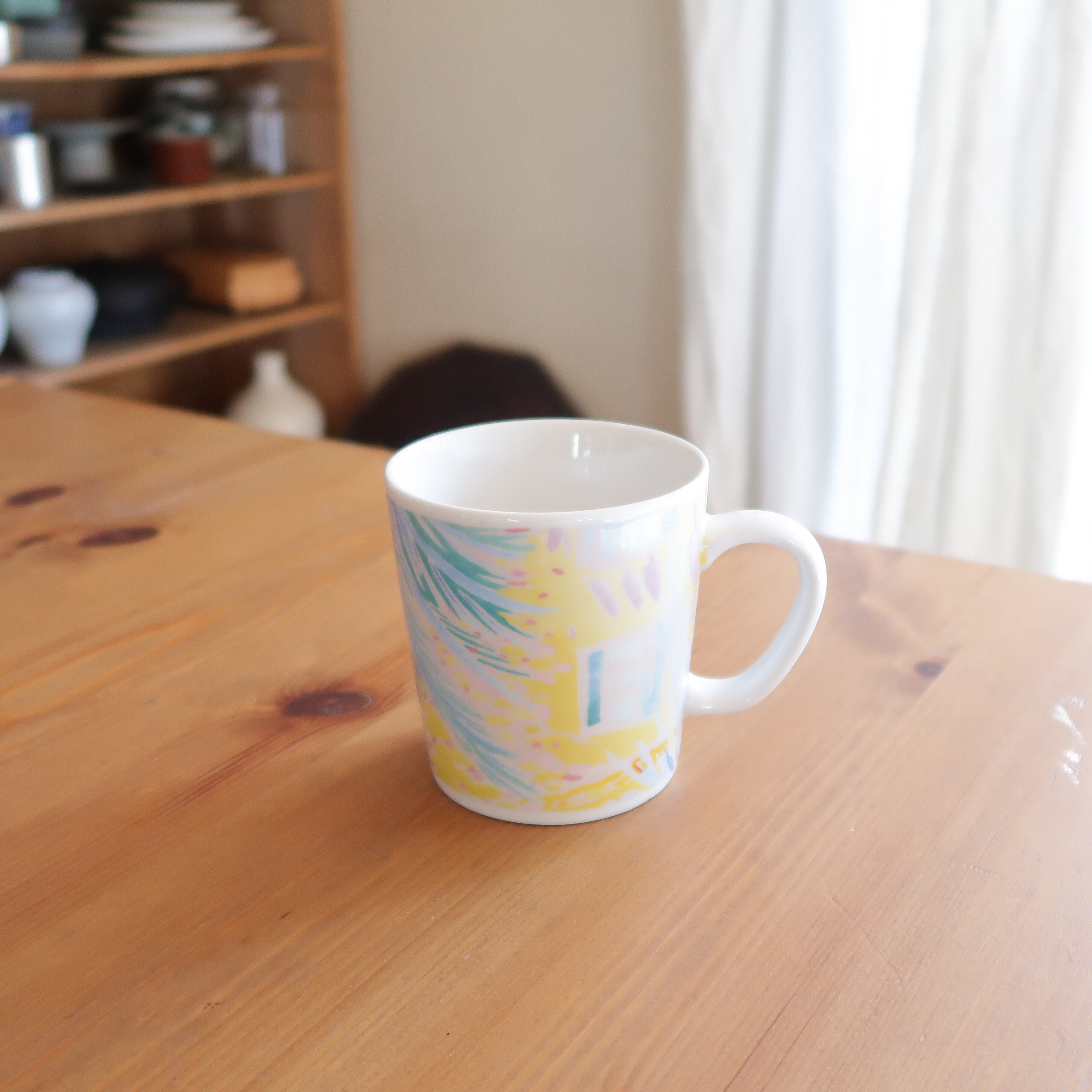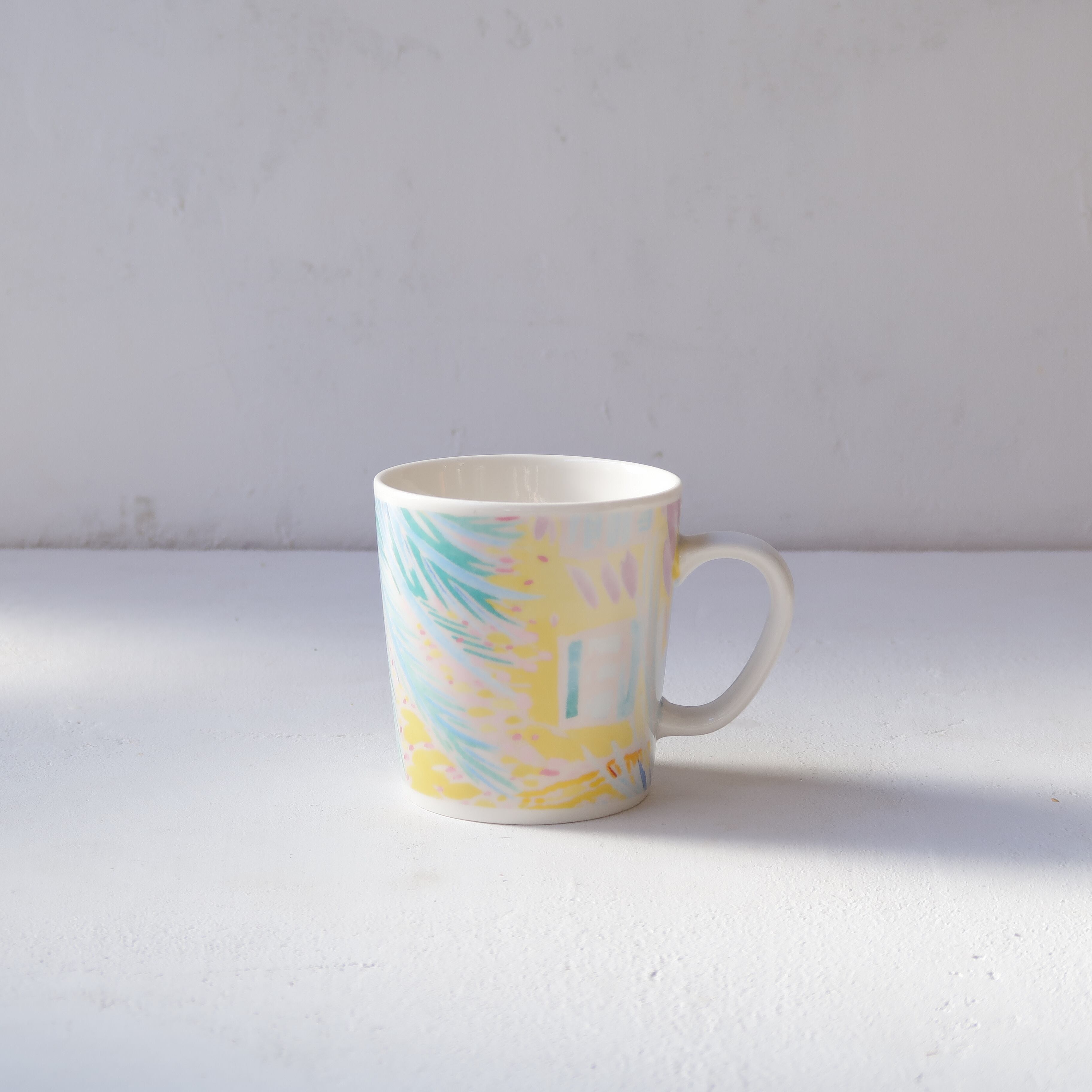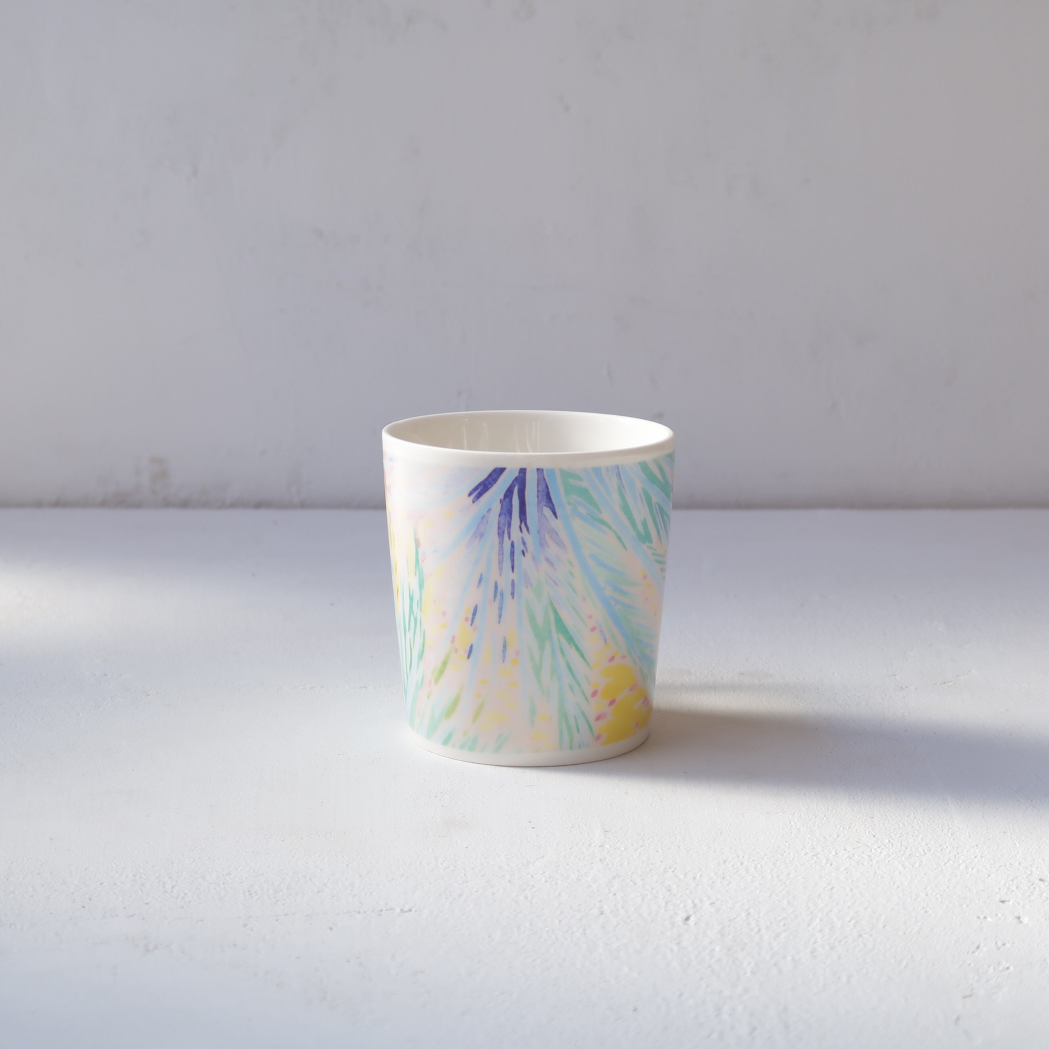 草木や枝葉のような絵柄のマグカップ。カラフルなパステルカラーが優しい色合いです。