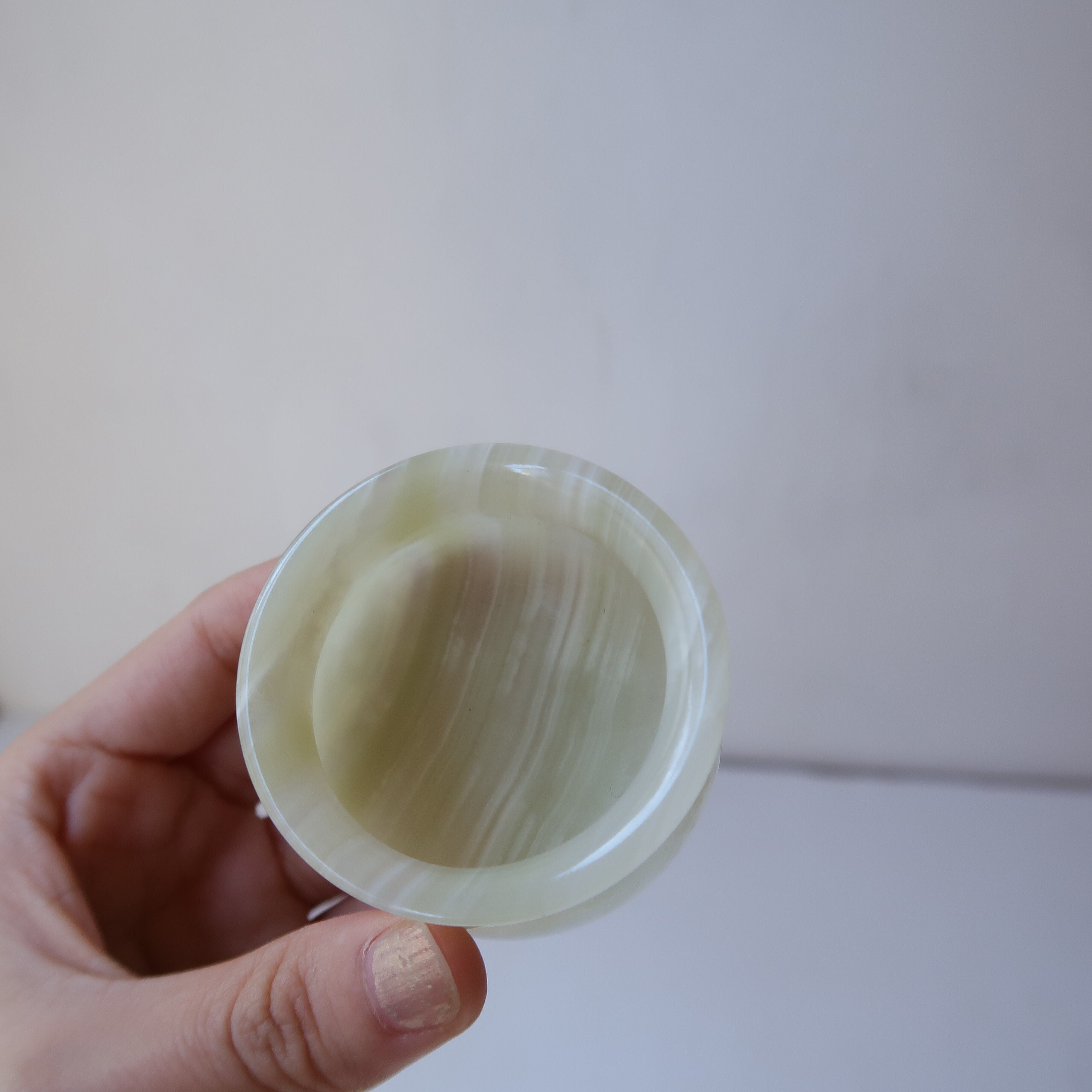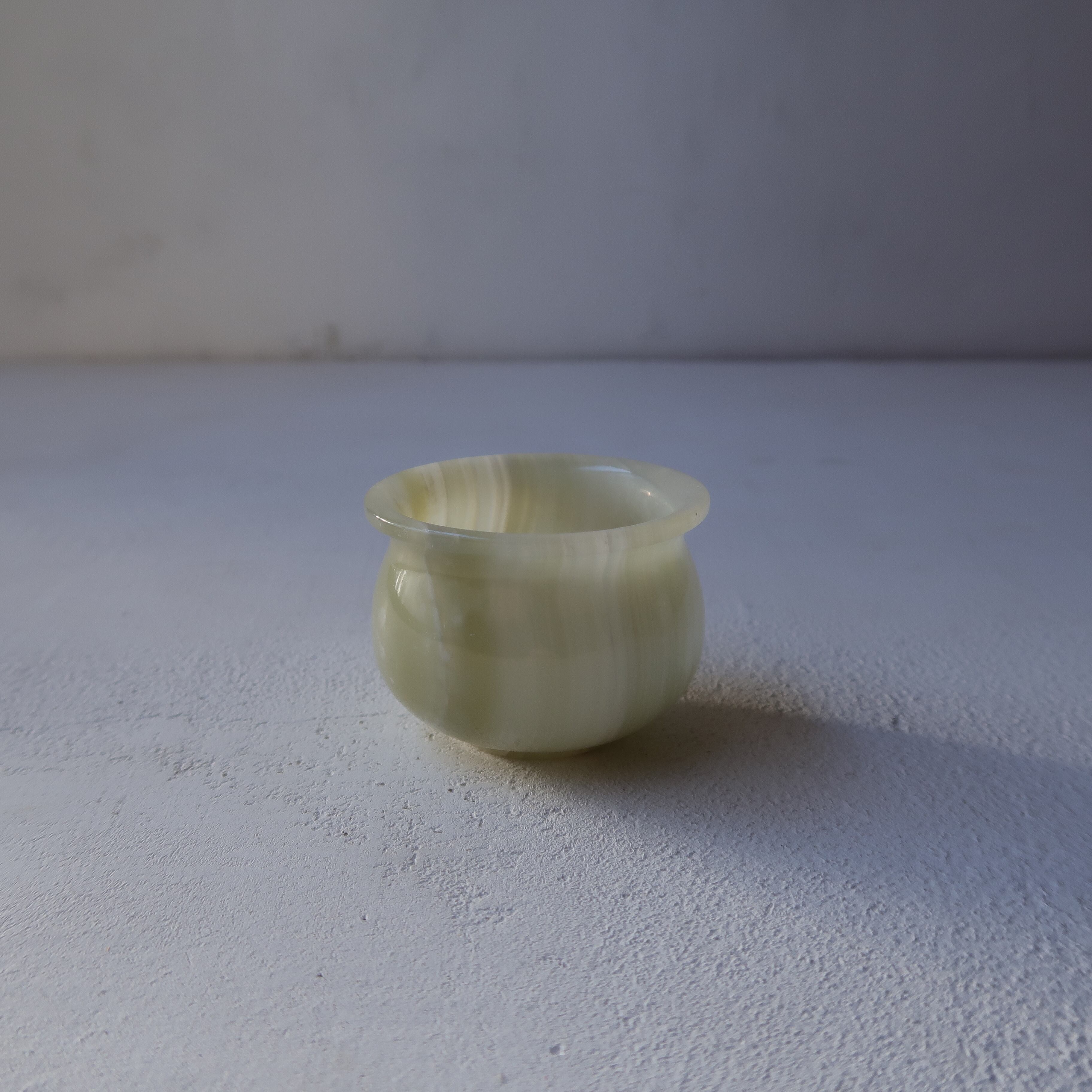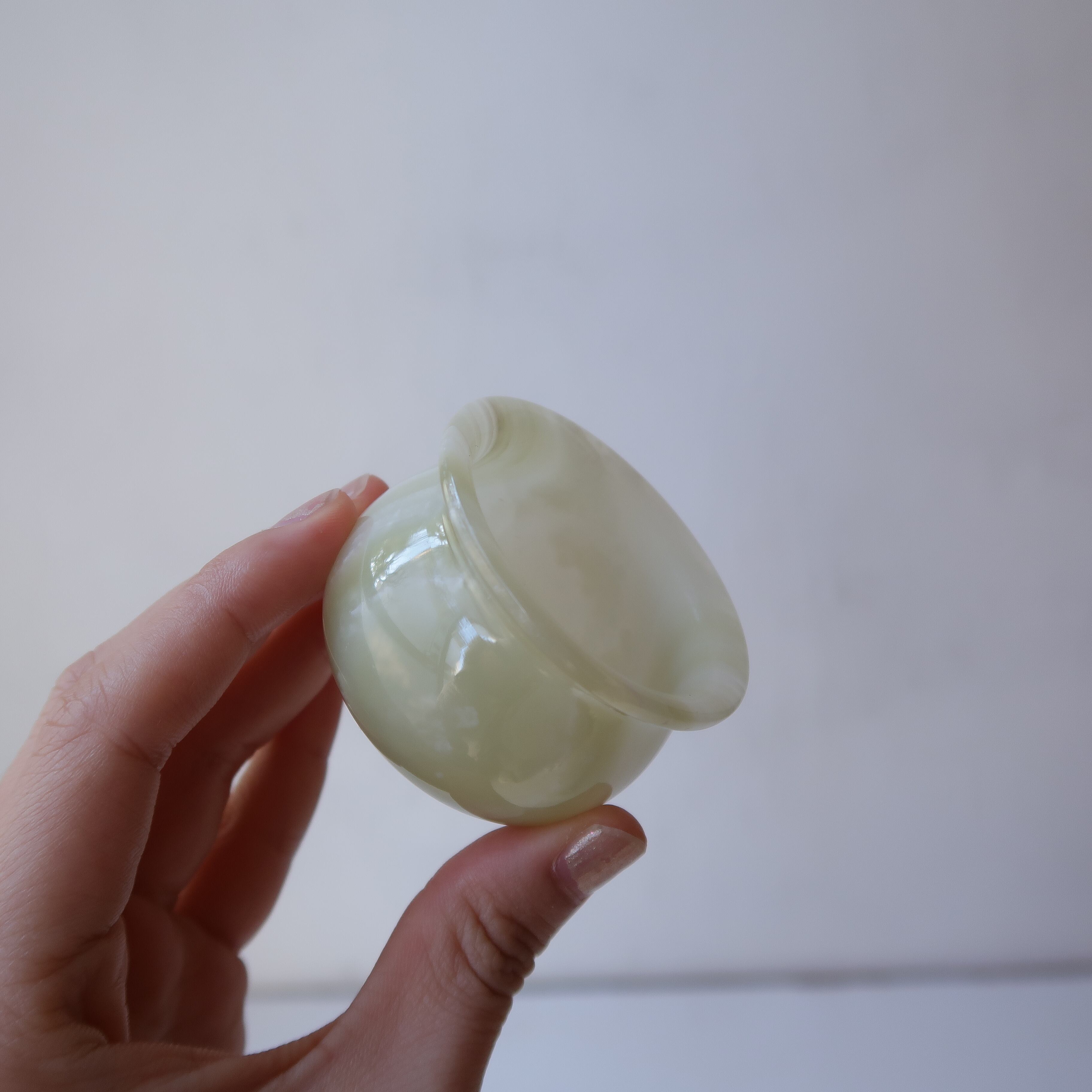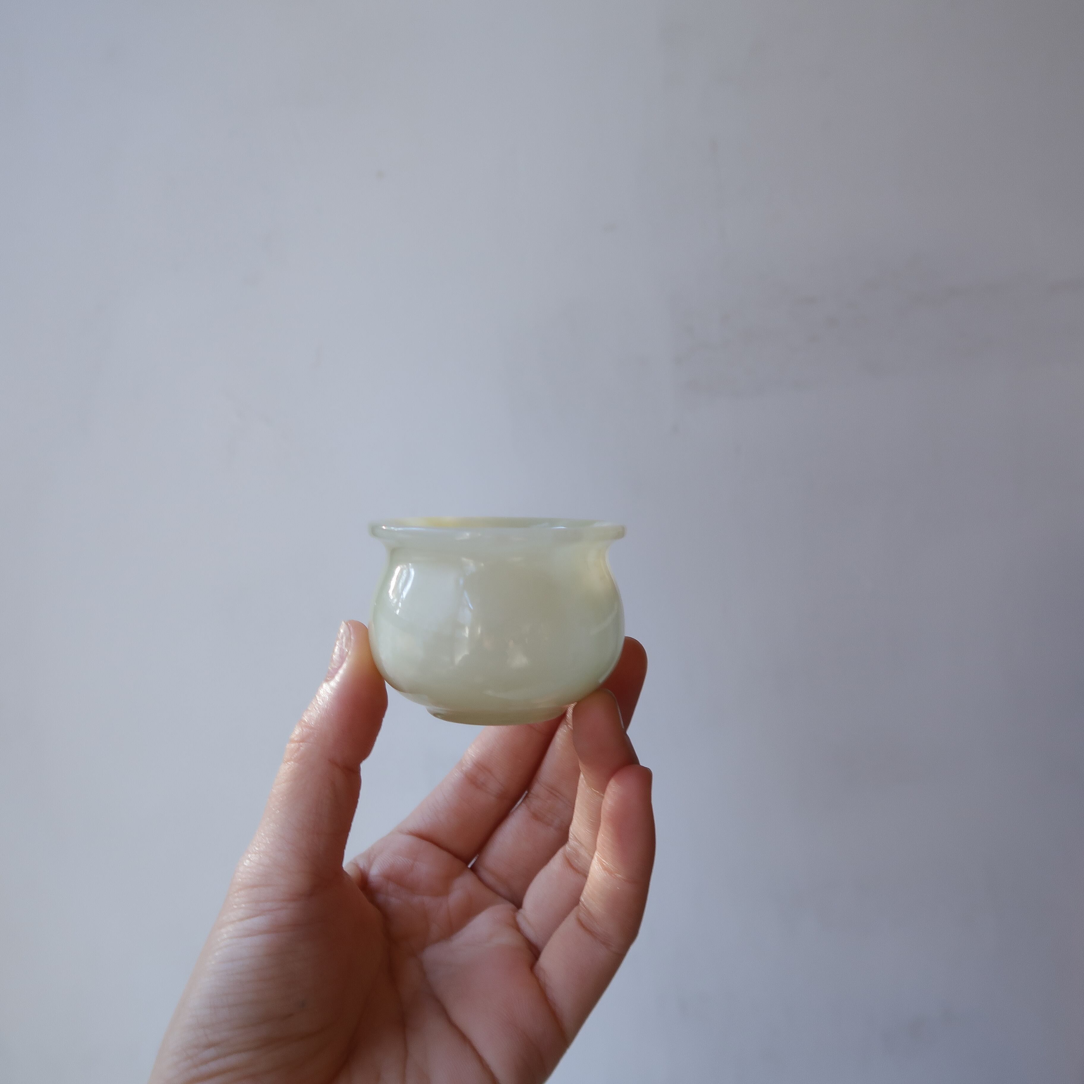 まるみのある翡翠のおちょこ。ホワイトグリーン系を3種類入荷しました。f,hと比べると、少しだけグリーンが強いのが多いのがg。