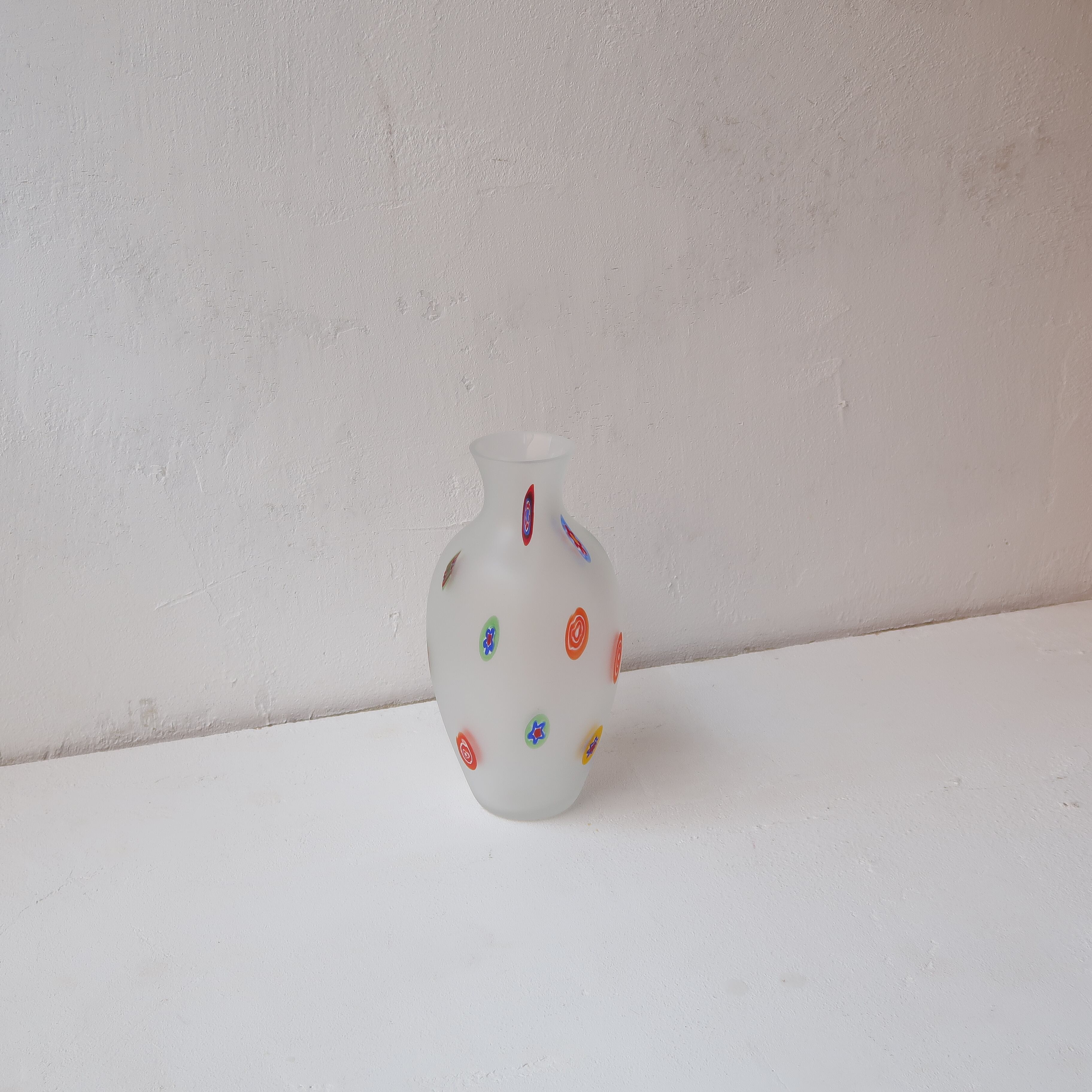 カラフルなお花や丸模様のガラスビーズを入れ込み、吹いて伸ばしてつくられたと思われるガラスの花瓶。ビーズが横を向いちゃっている面があるのも、手作業ならではおもしろさ。表面はすりガラス状のマットな質感で、さらさらとしています。