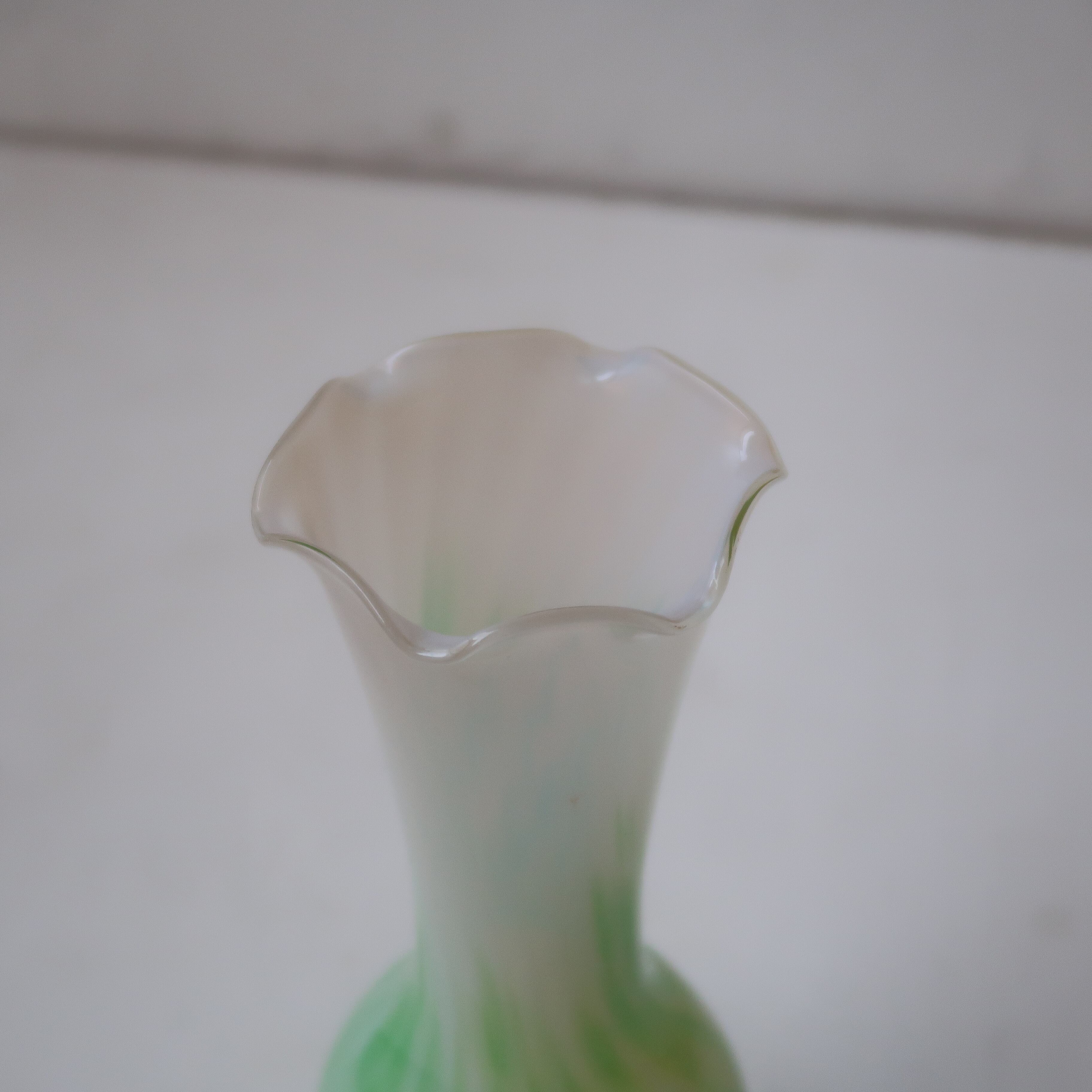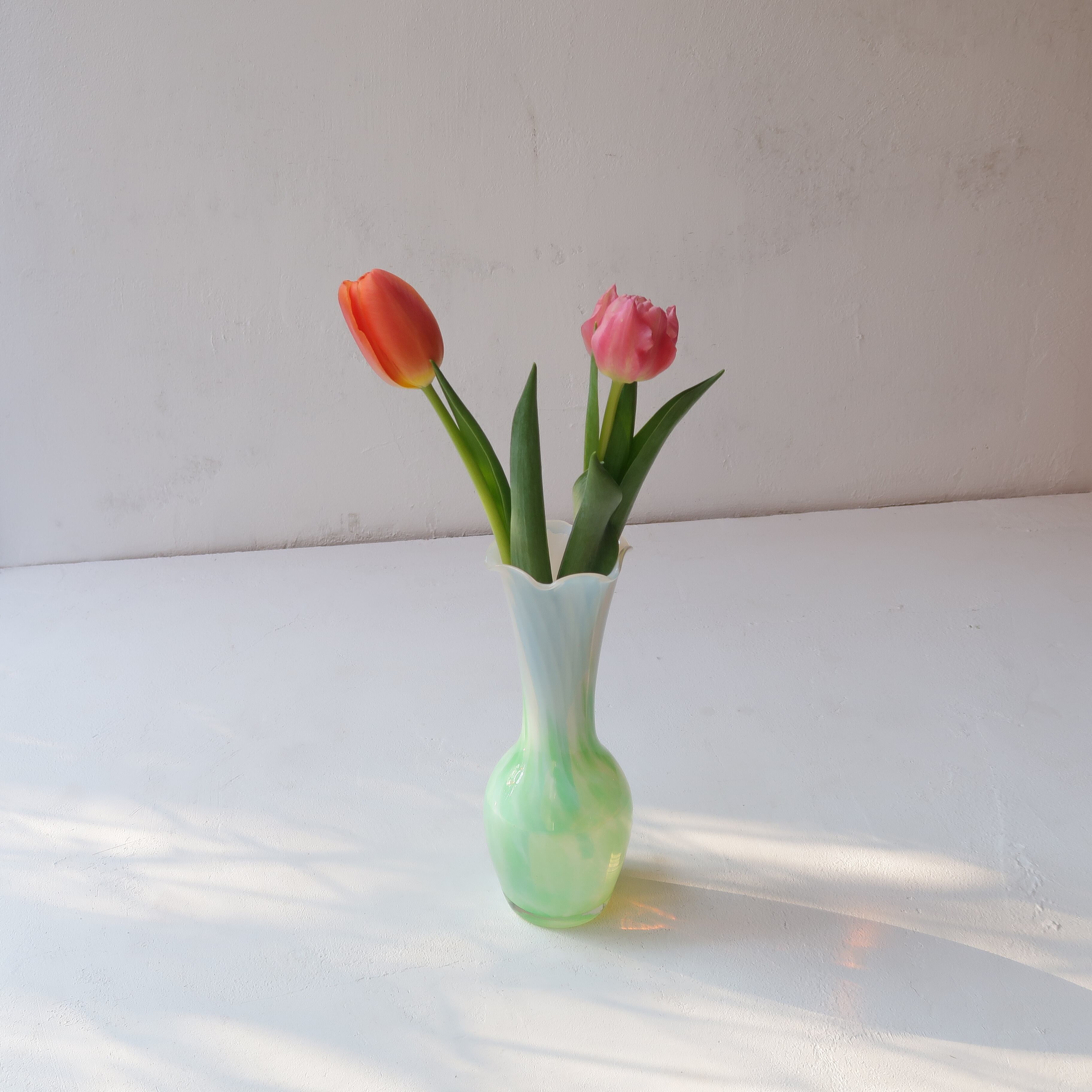 濃いグリーンと薄いグリーン…春色なミックスグリーンがかわいいガラスの花瓶。口はひらひらとしていて、愛らしいフォルム。