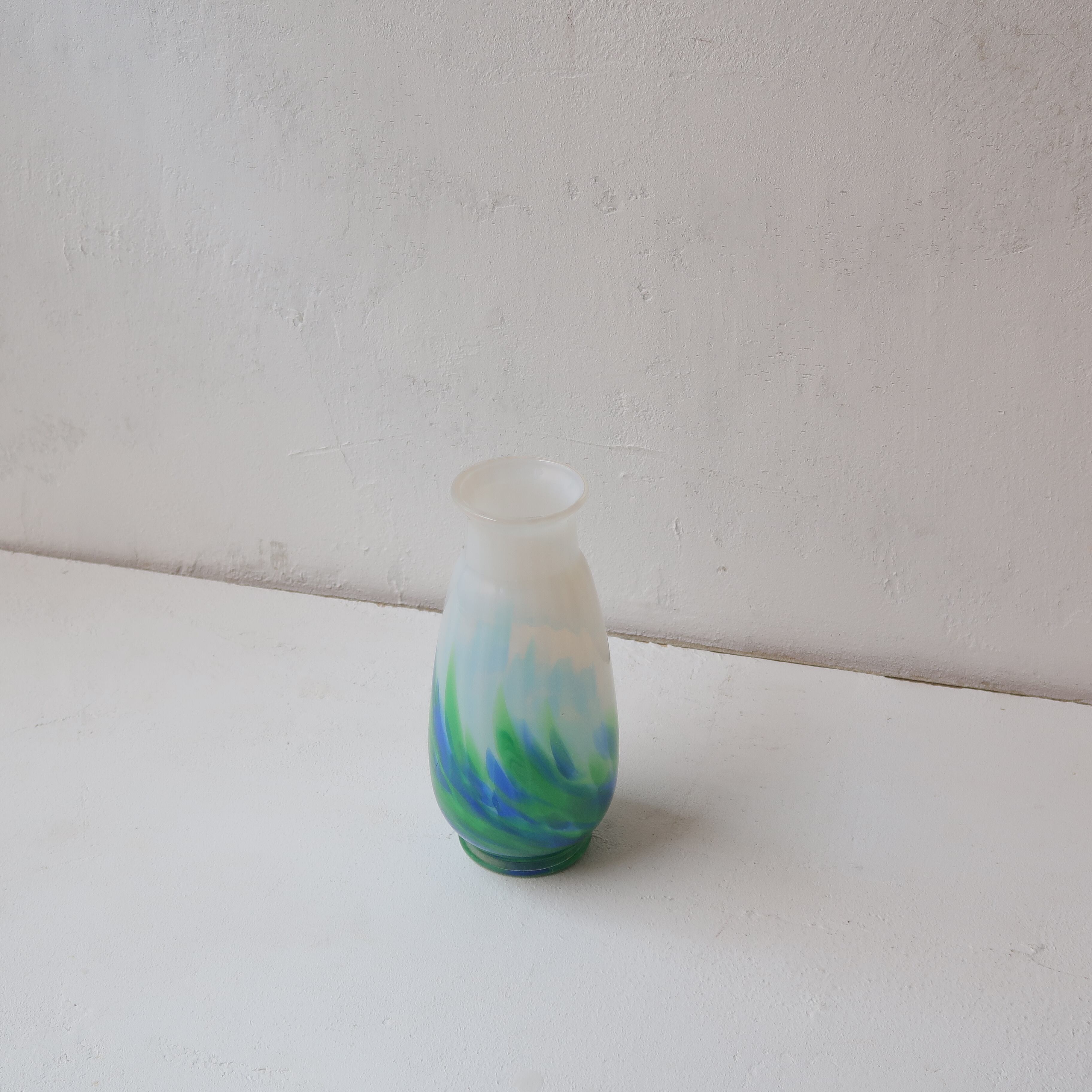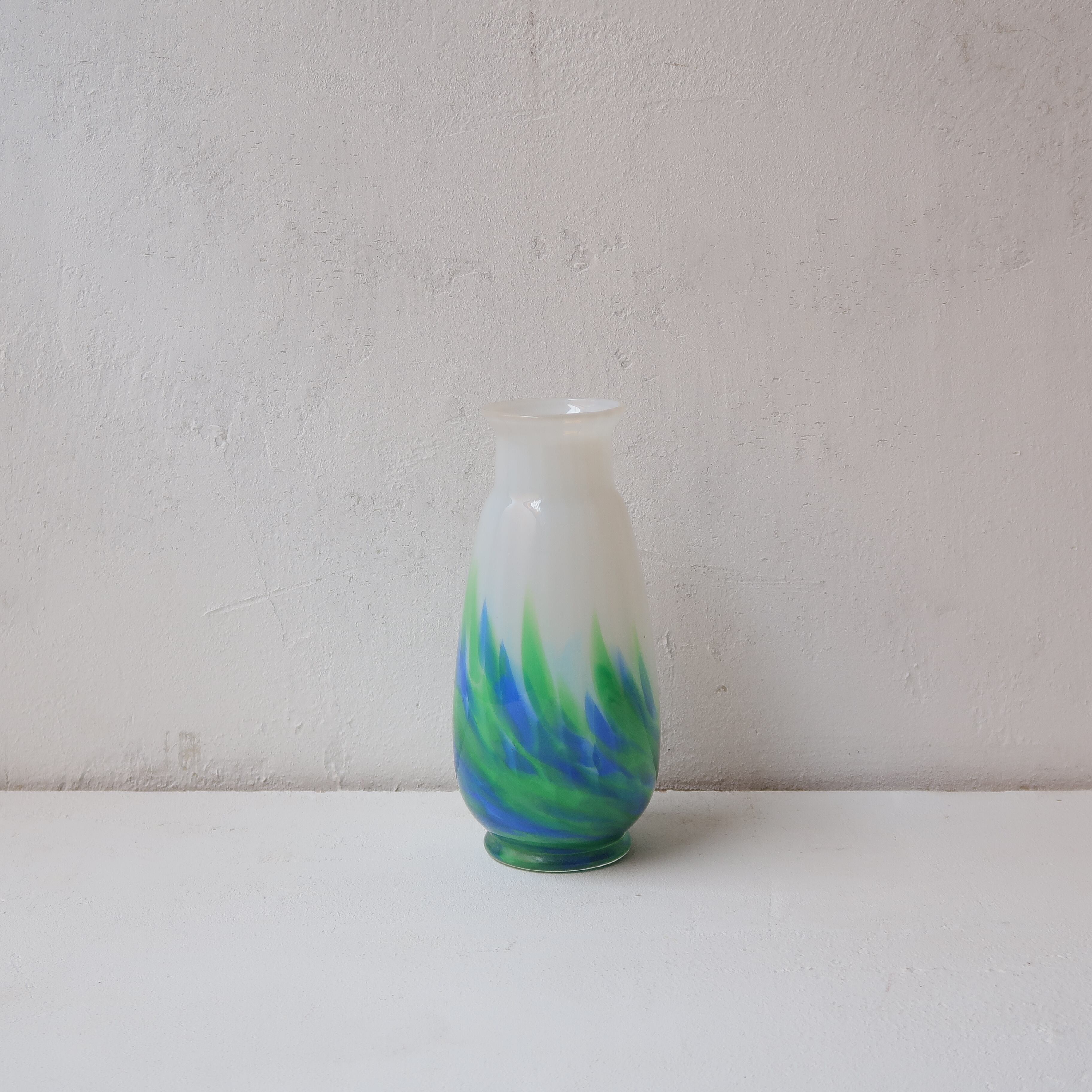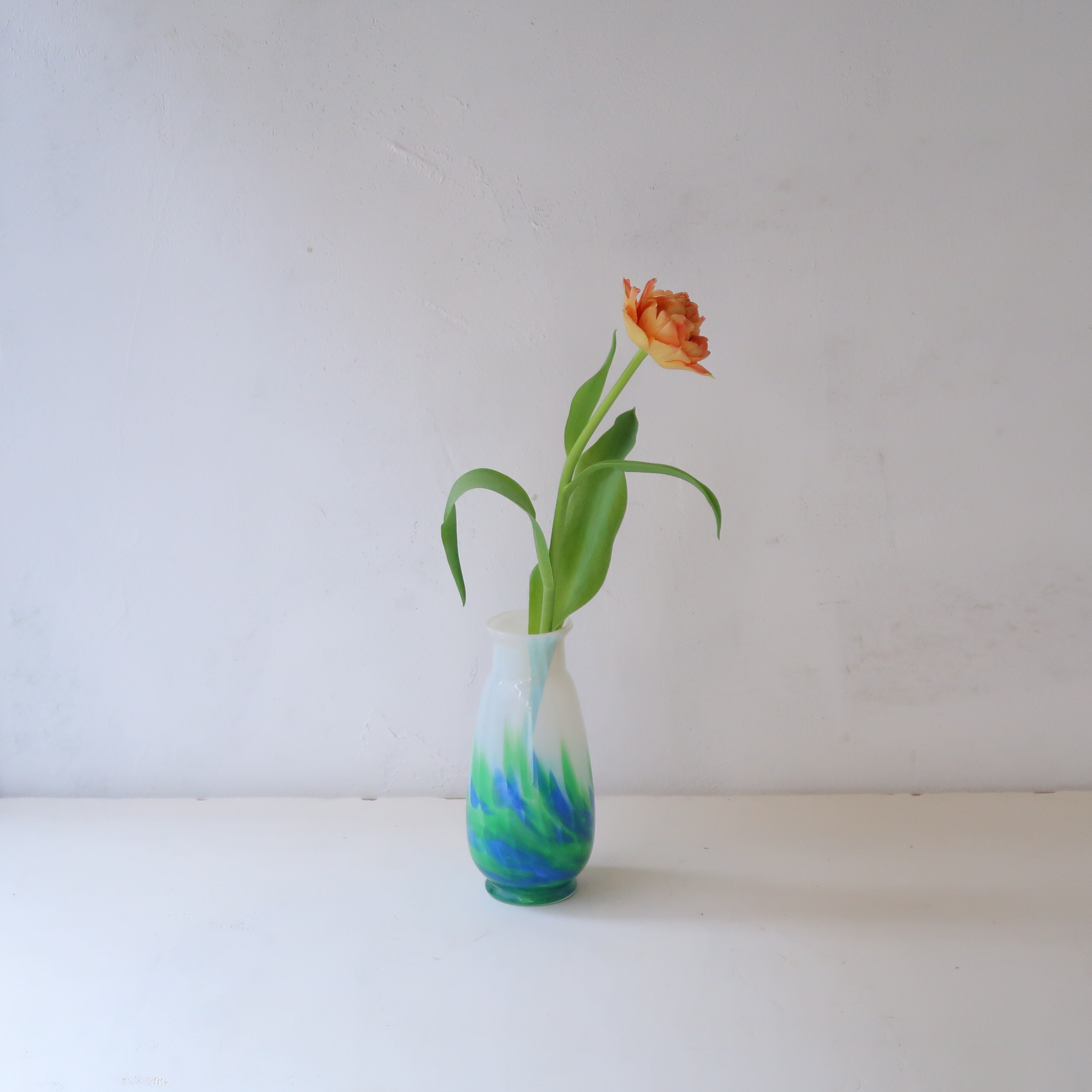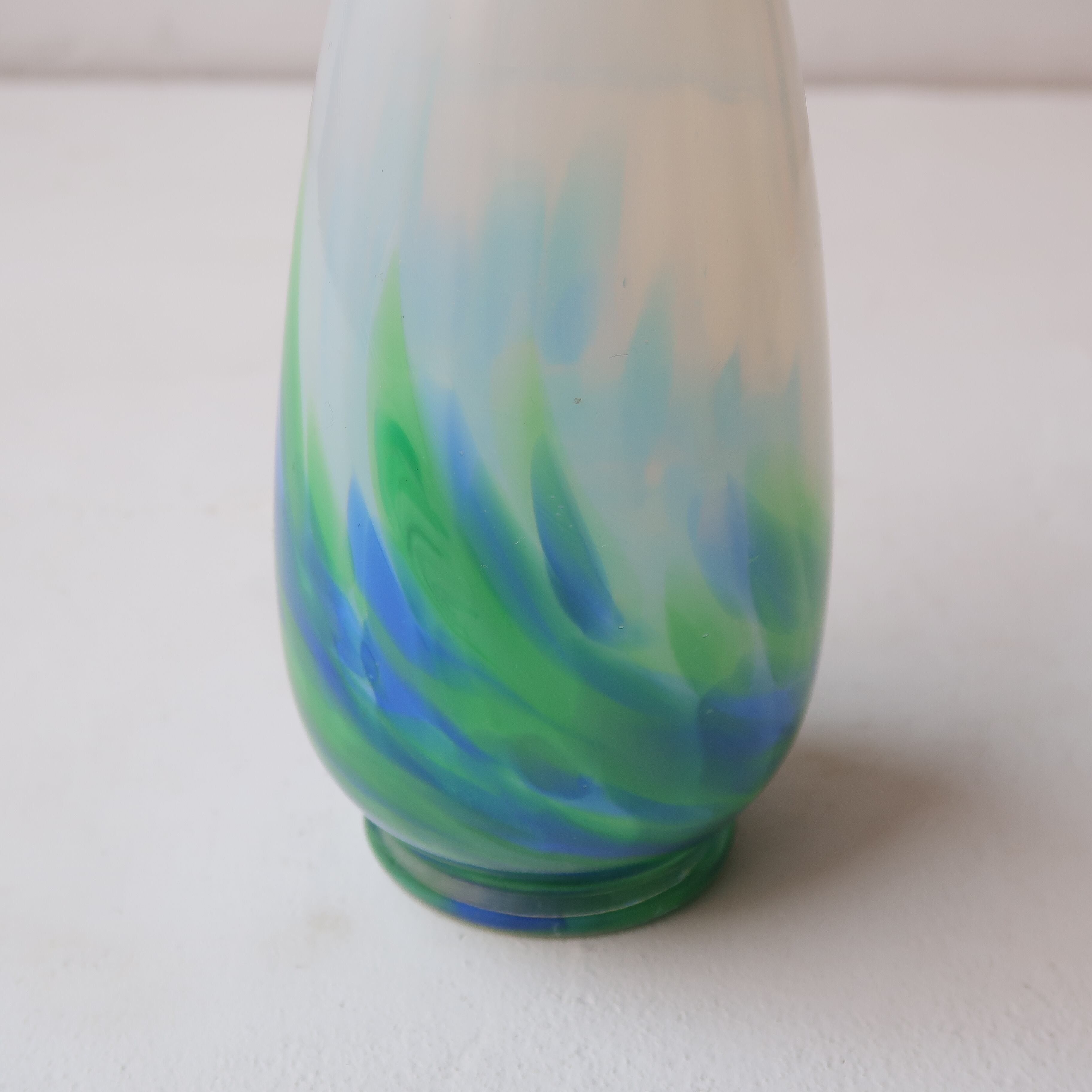 グリーンとブルーのミックスカラーがかわいいガラスの花瓶。口はすぼまり、胴はまるっとした愛らしいフォルム。