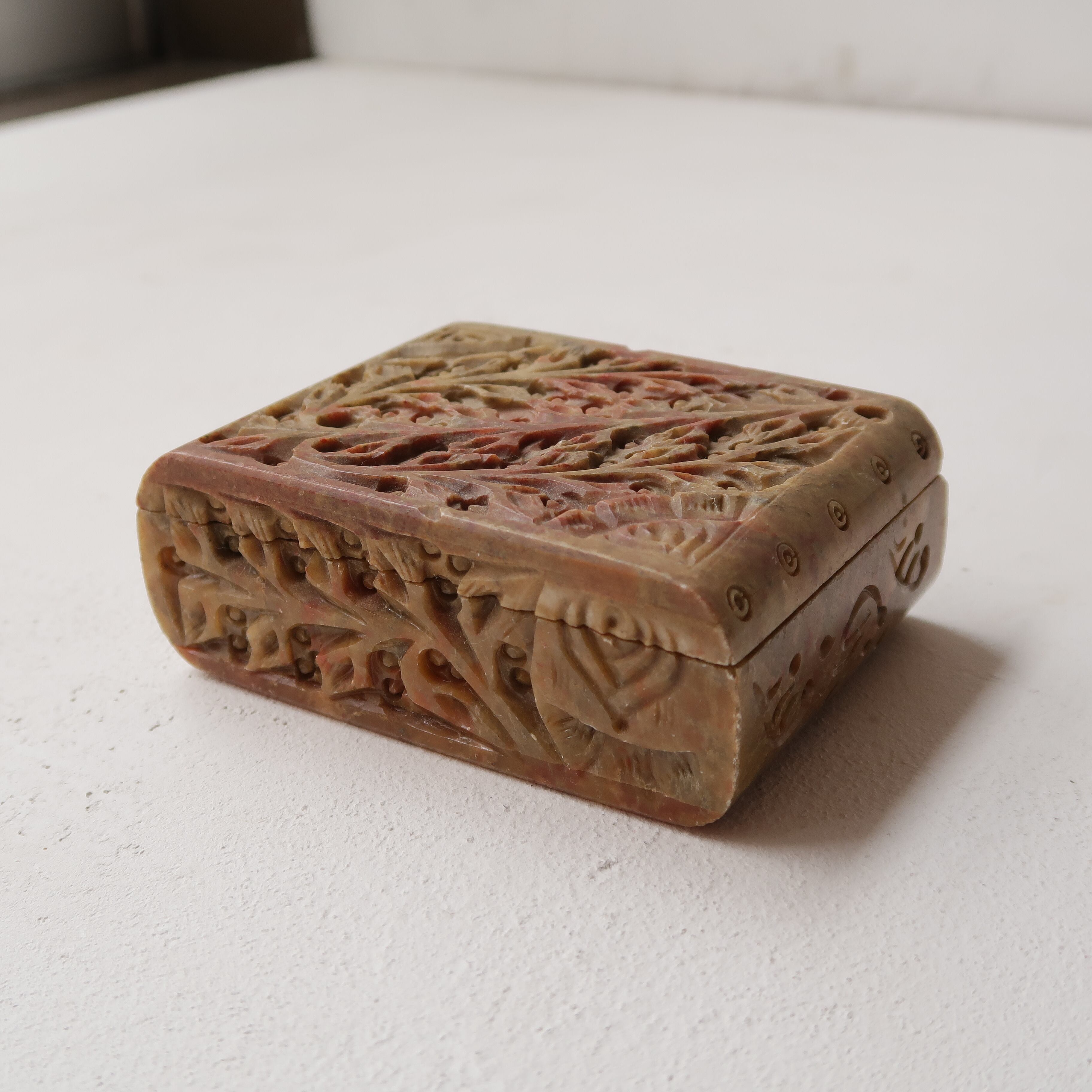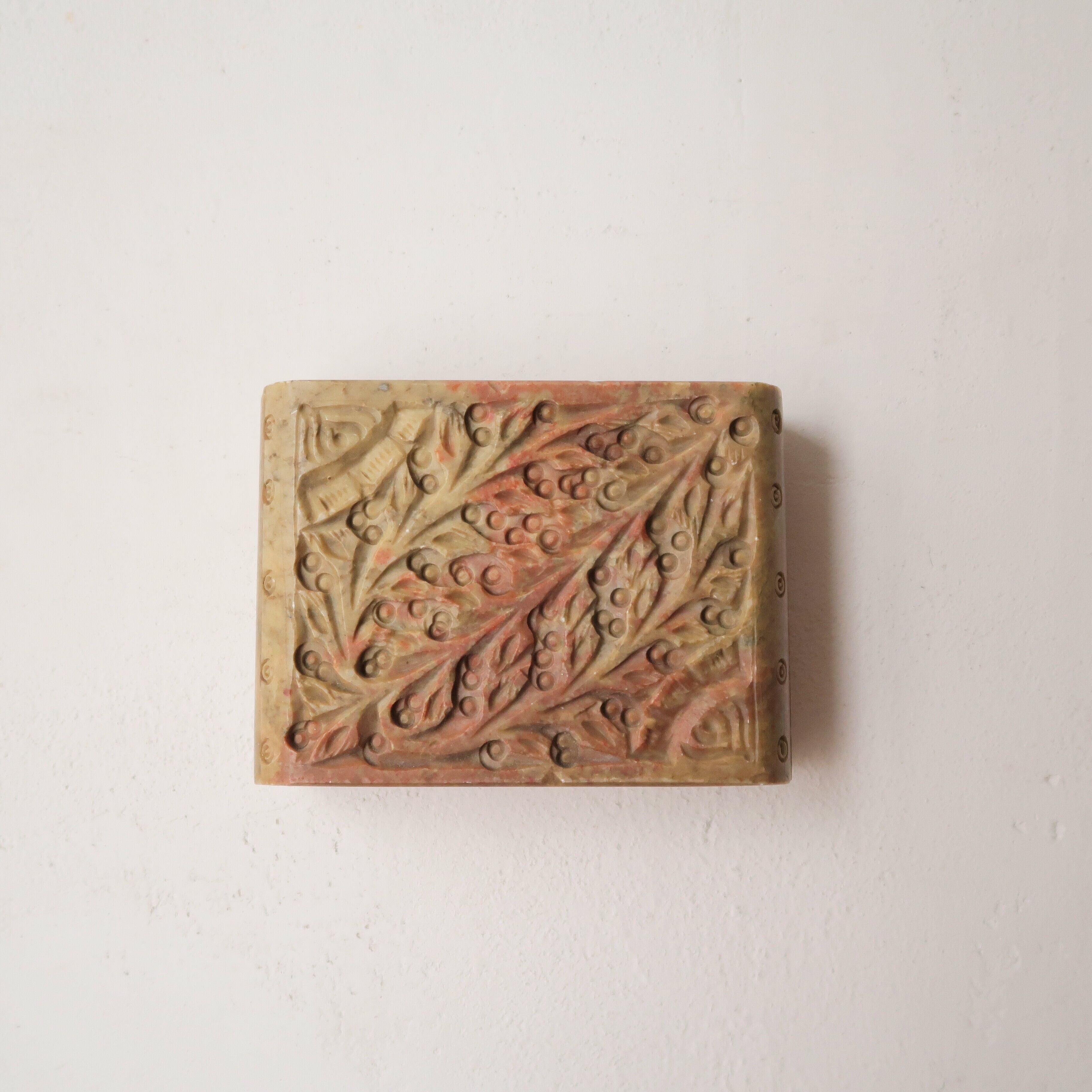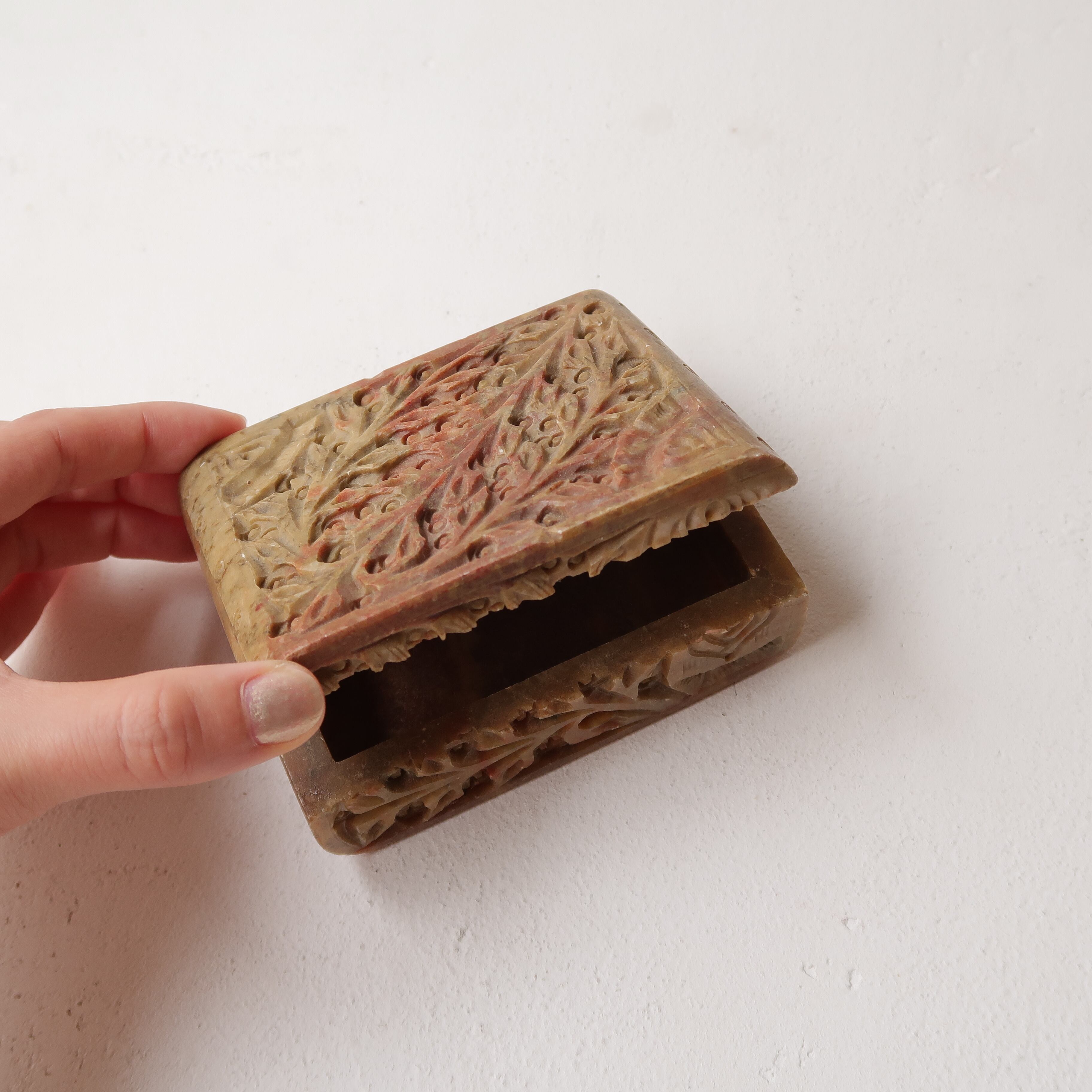草木の彫りがかわいいジュエリーボックス。石製で、模様が彫られてでこぼこしています。表面は草木だけが彫られていると思いきや、背景に丸々もいて、芸が細かいんです。