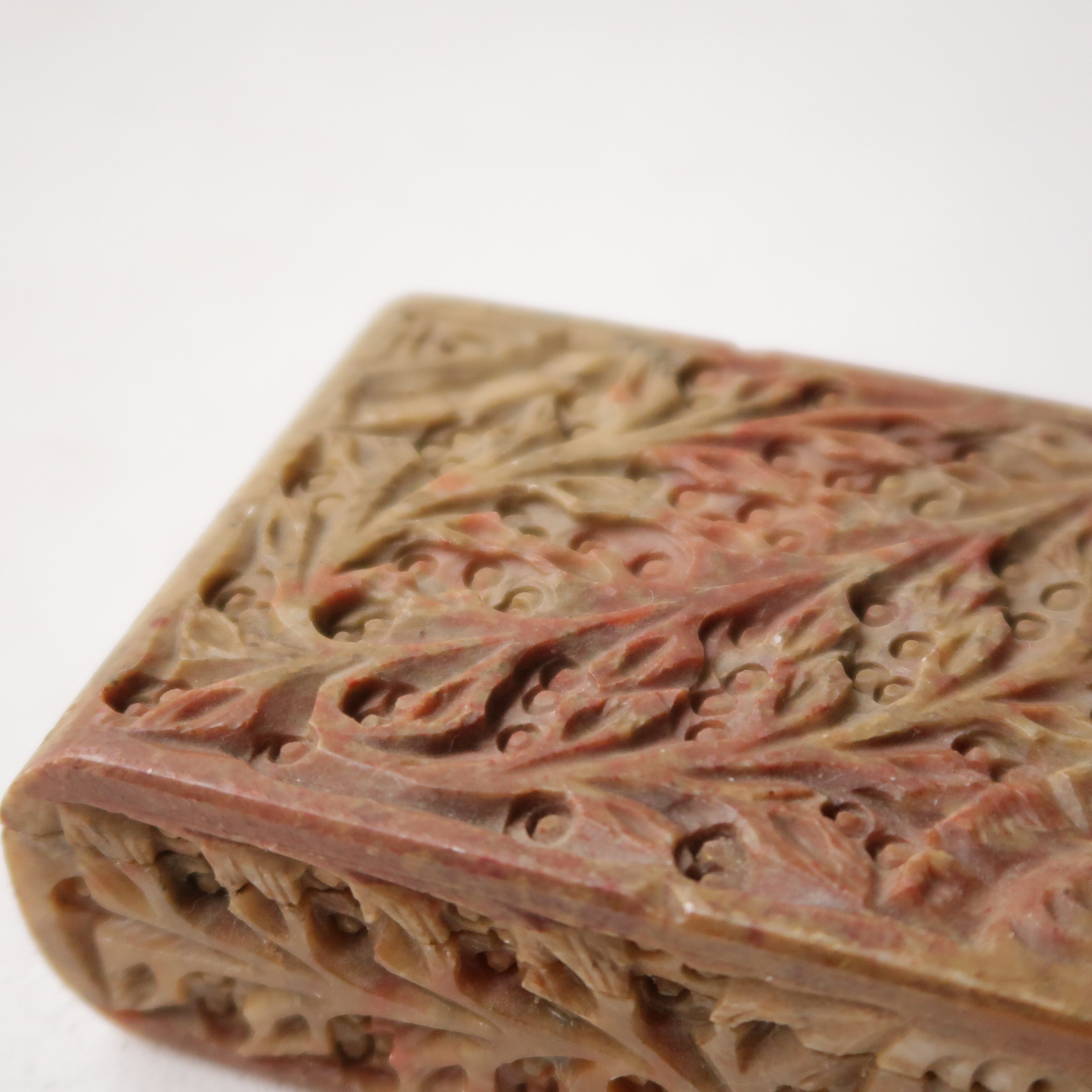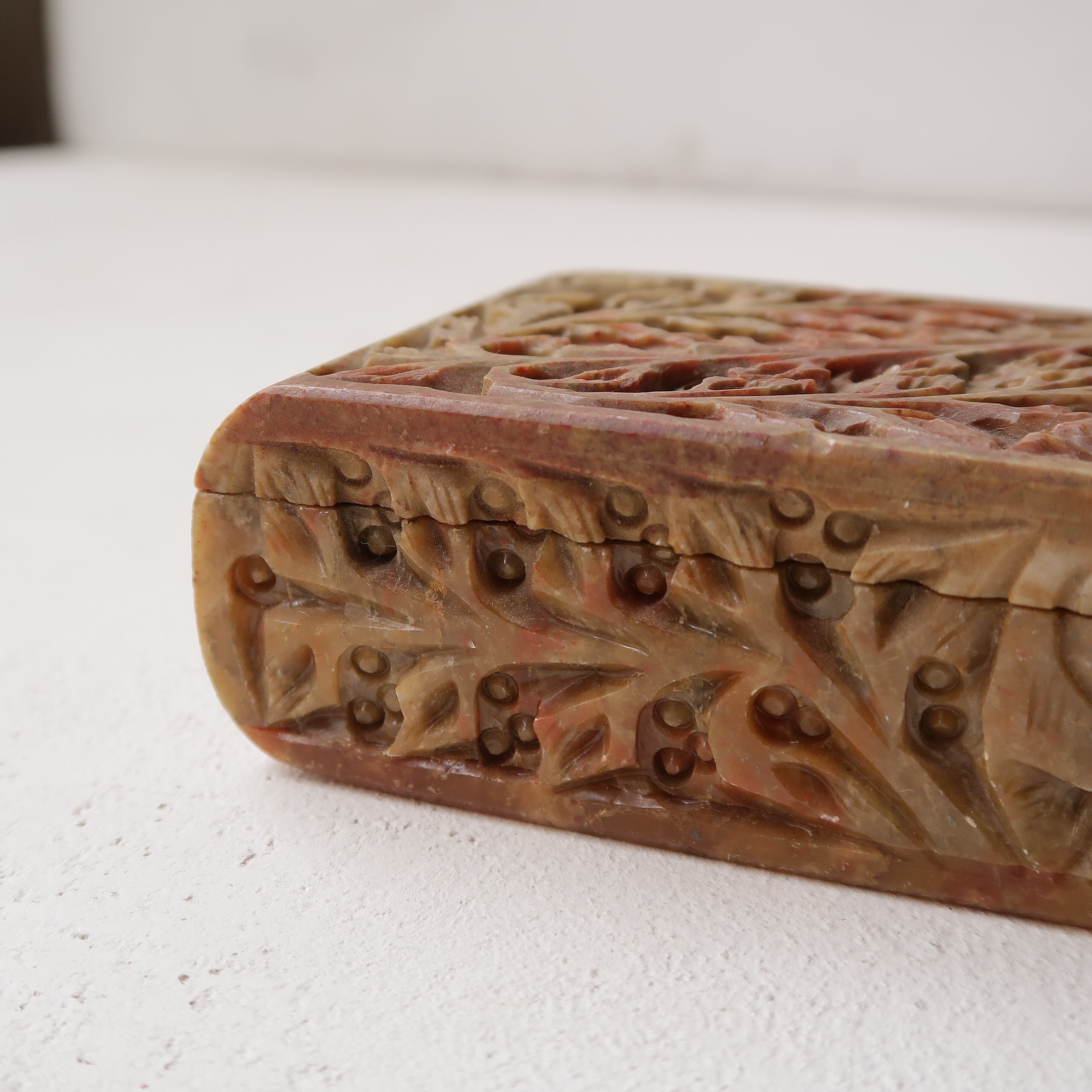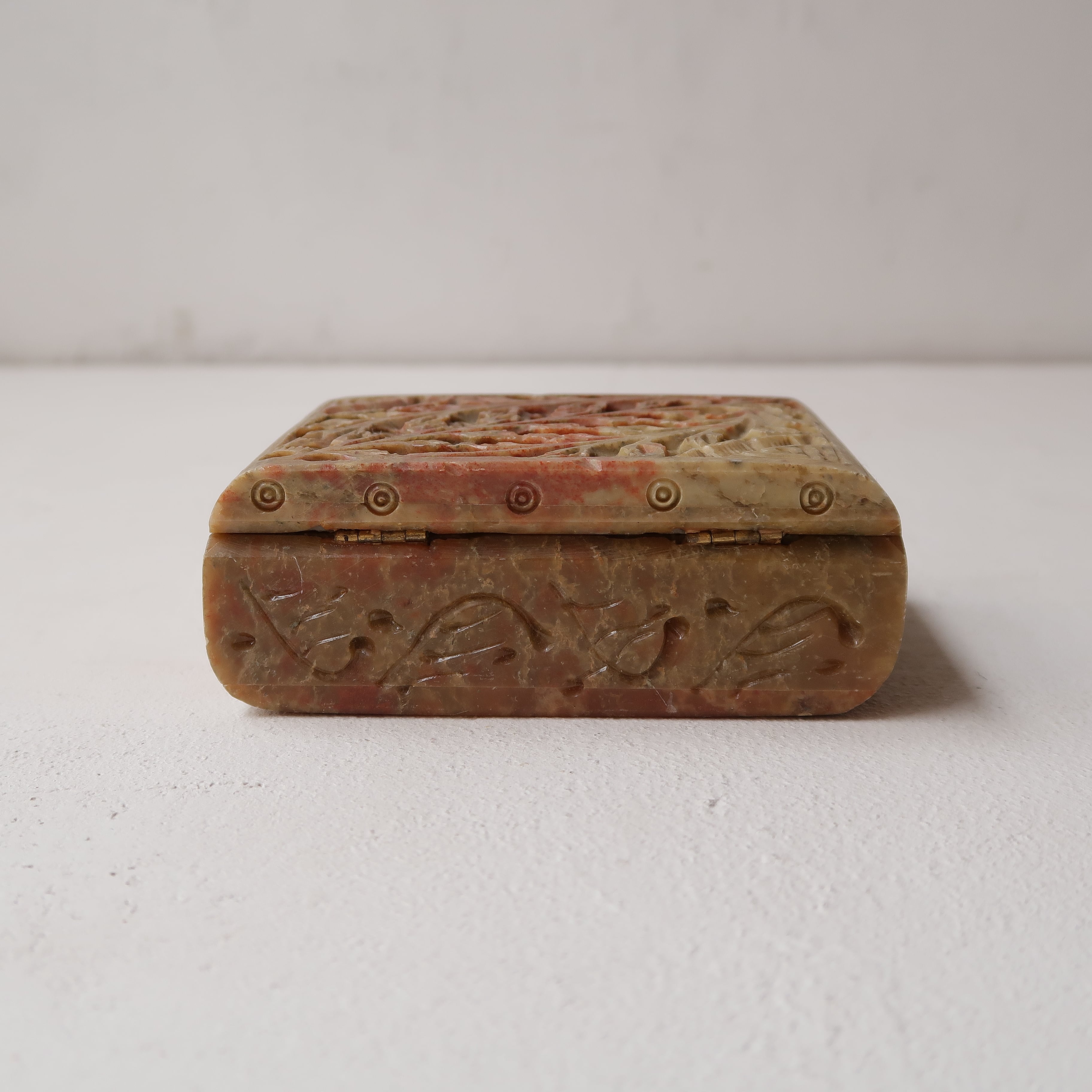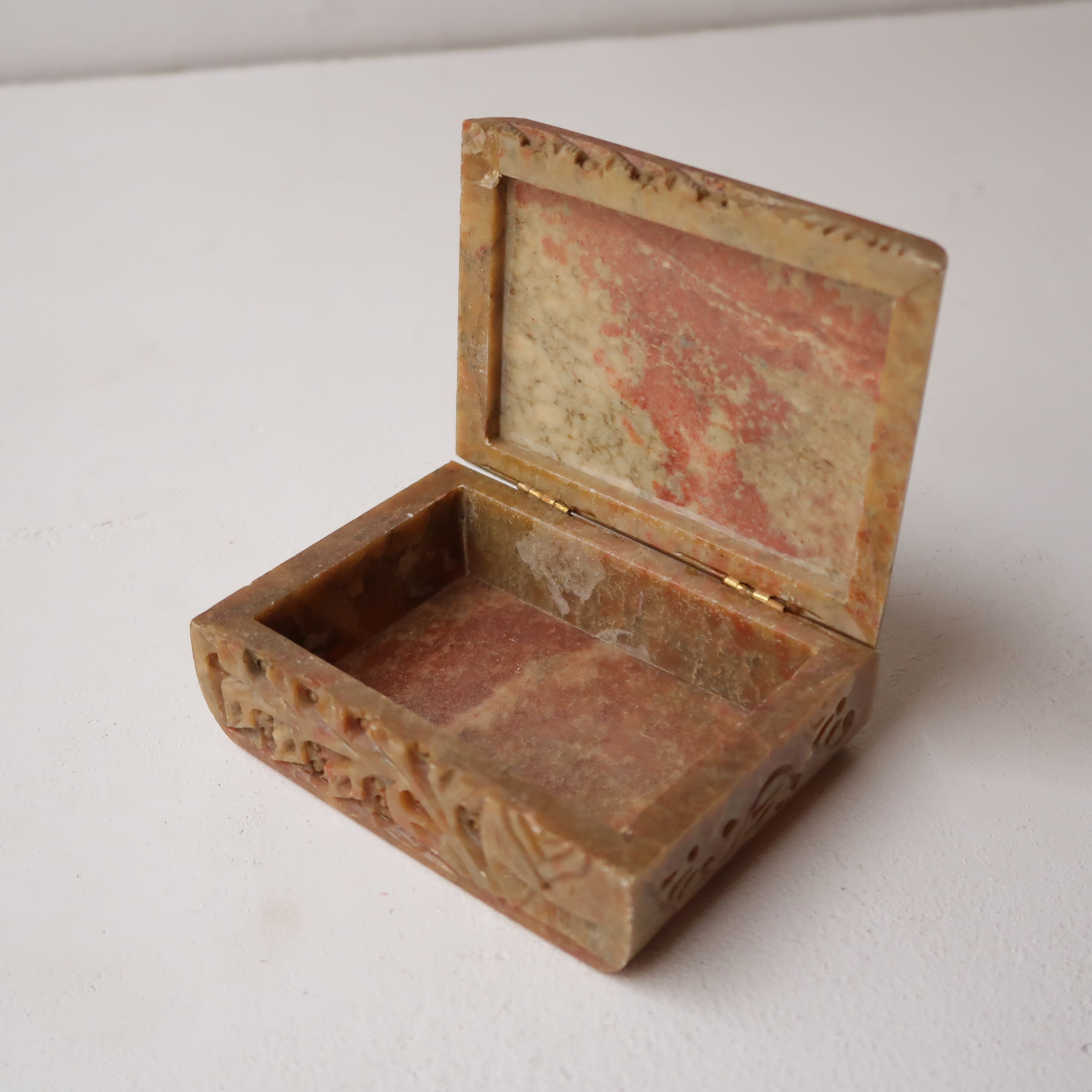 草木の彫りがかわいいジュエリーボックス。石製で、模様が彫られてでこぼこしています。表面は草木だけが彫られていると思いきや、背景に丸々もいて、芸が細かいんです。