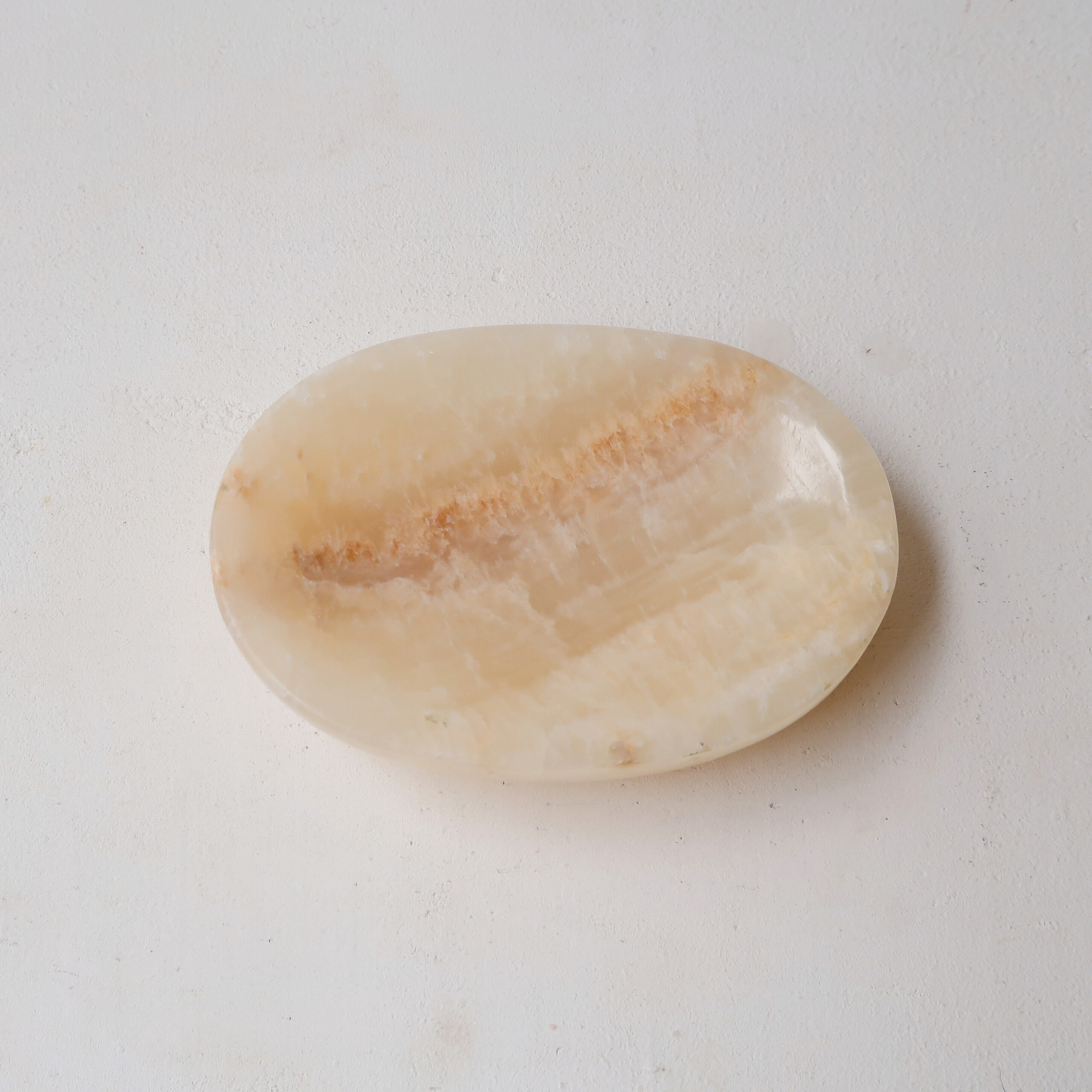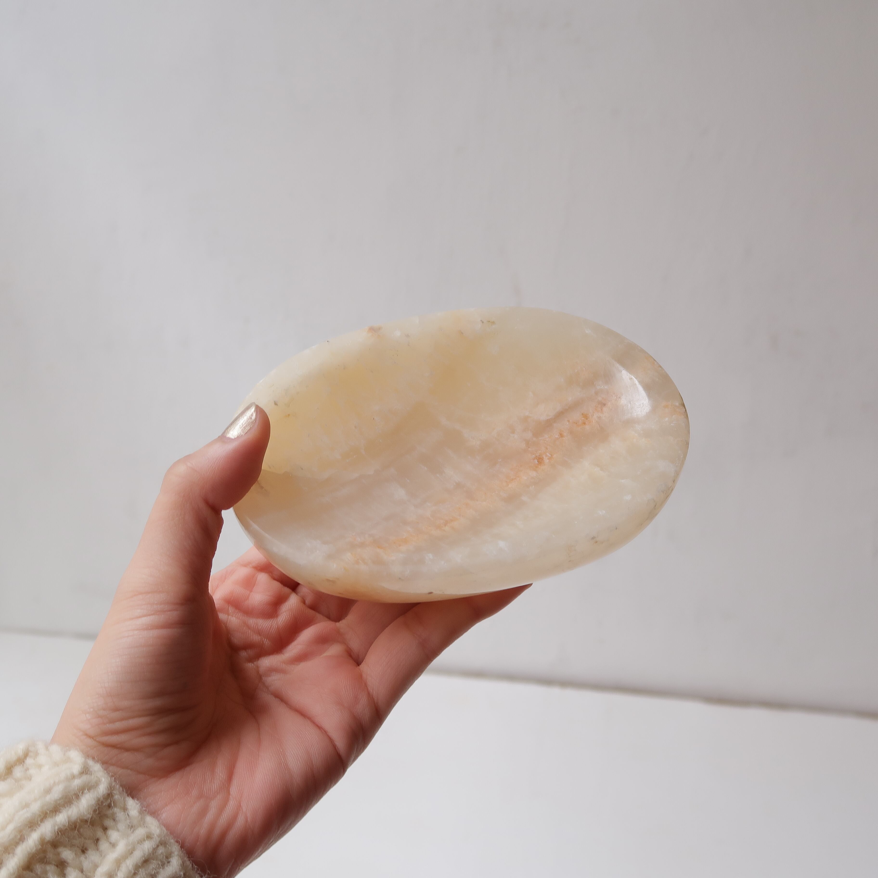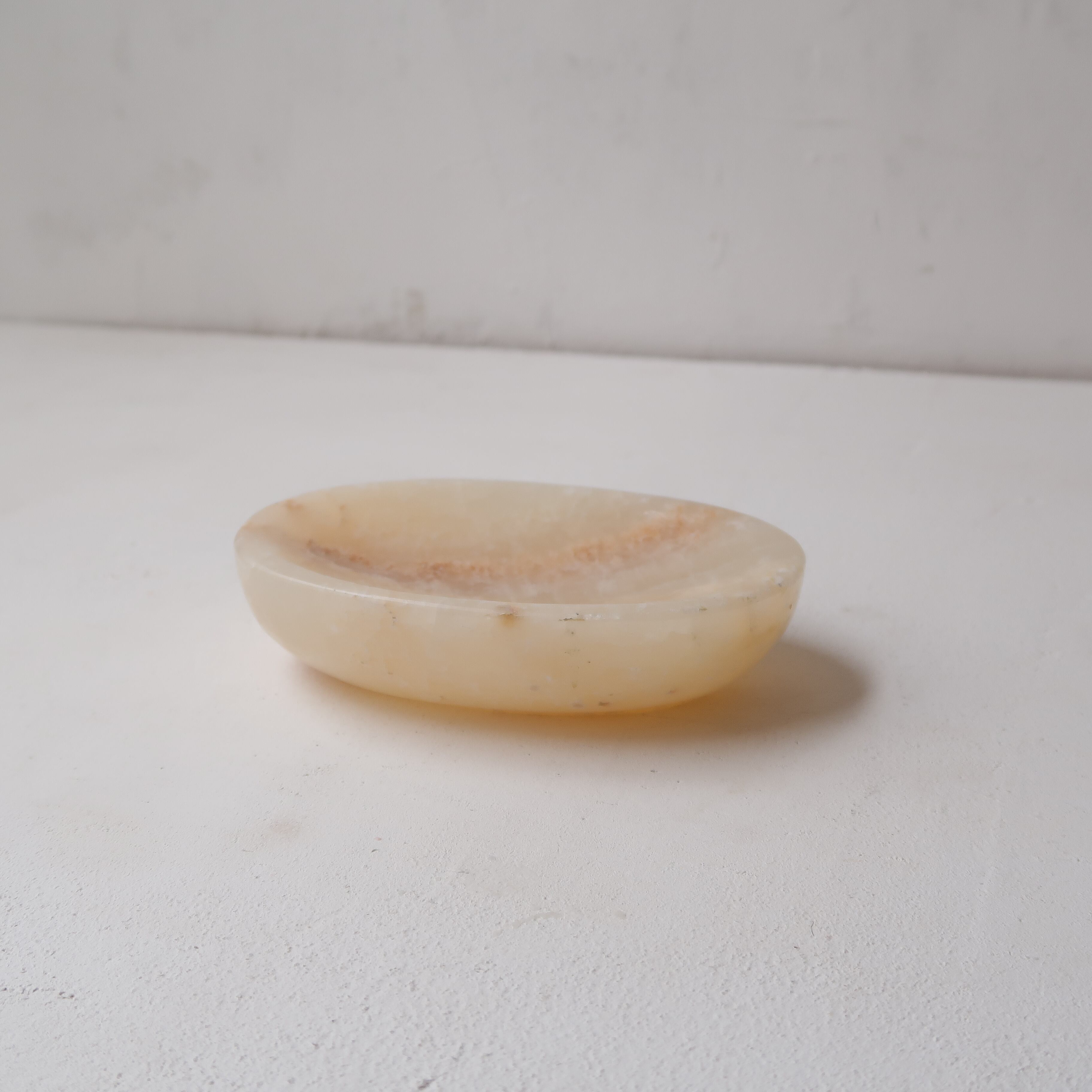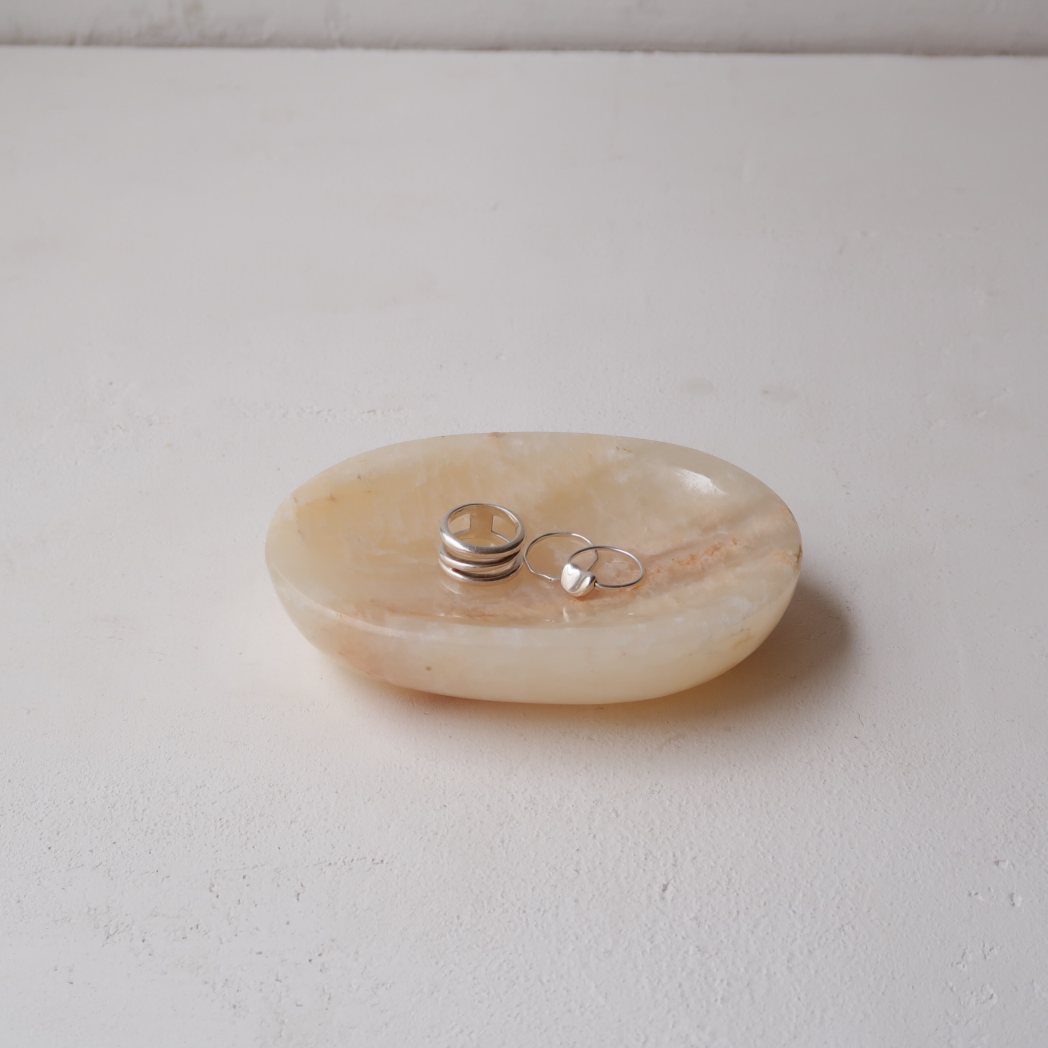石鹸を置きたくなるような、楕円形の石のアイテム。ジュエリーを置いてもかわいく、取りやすい形です。