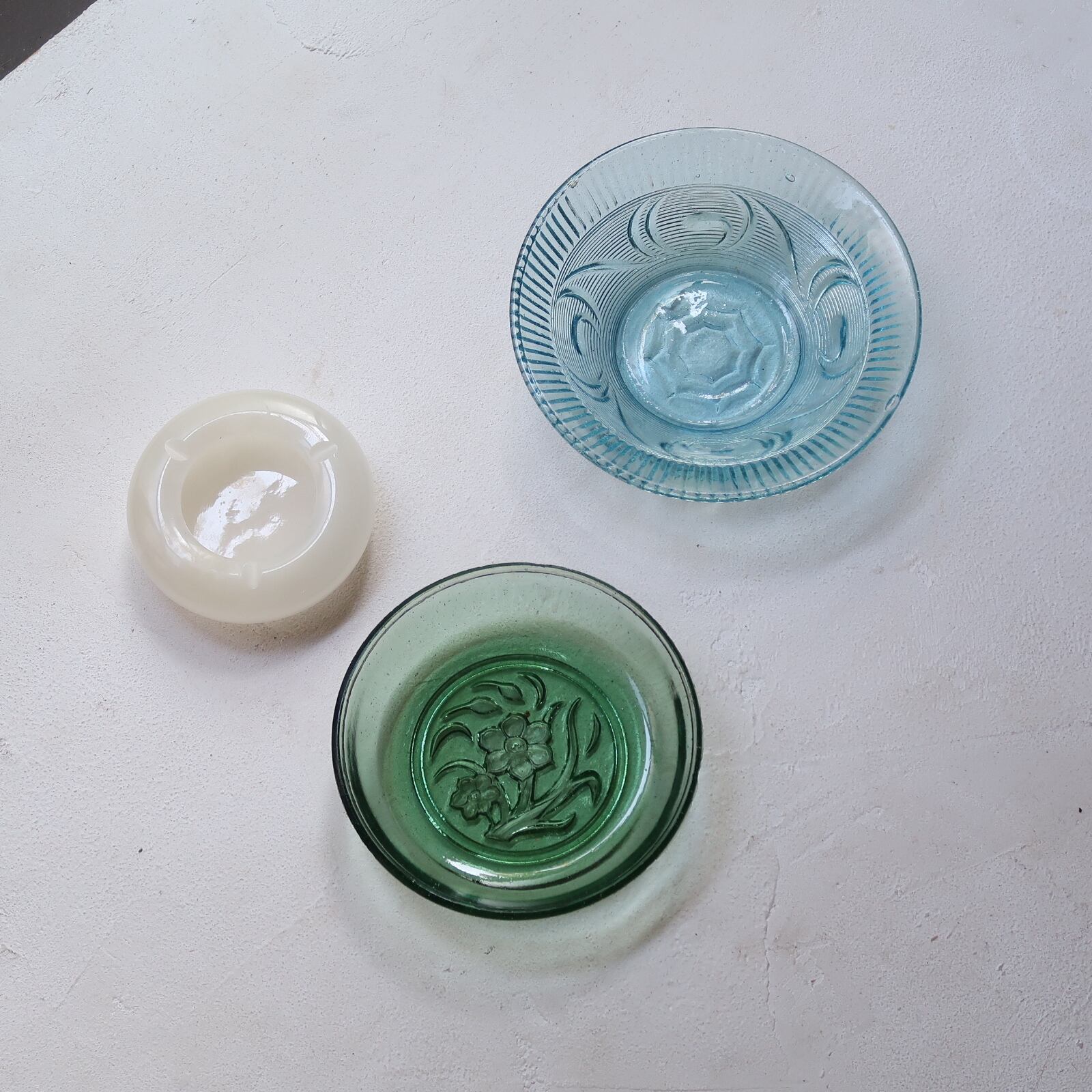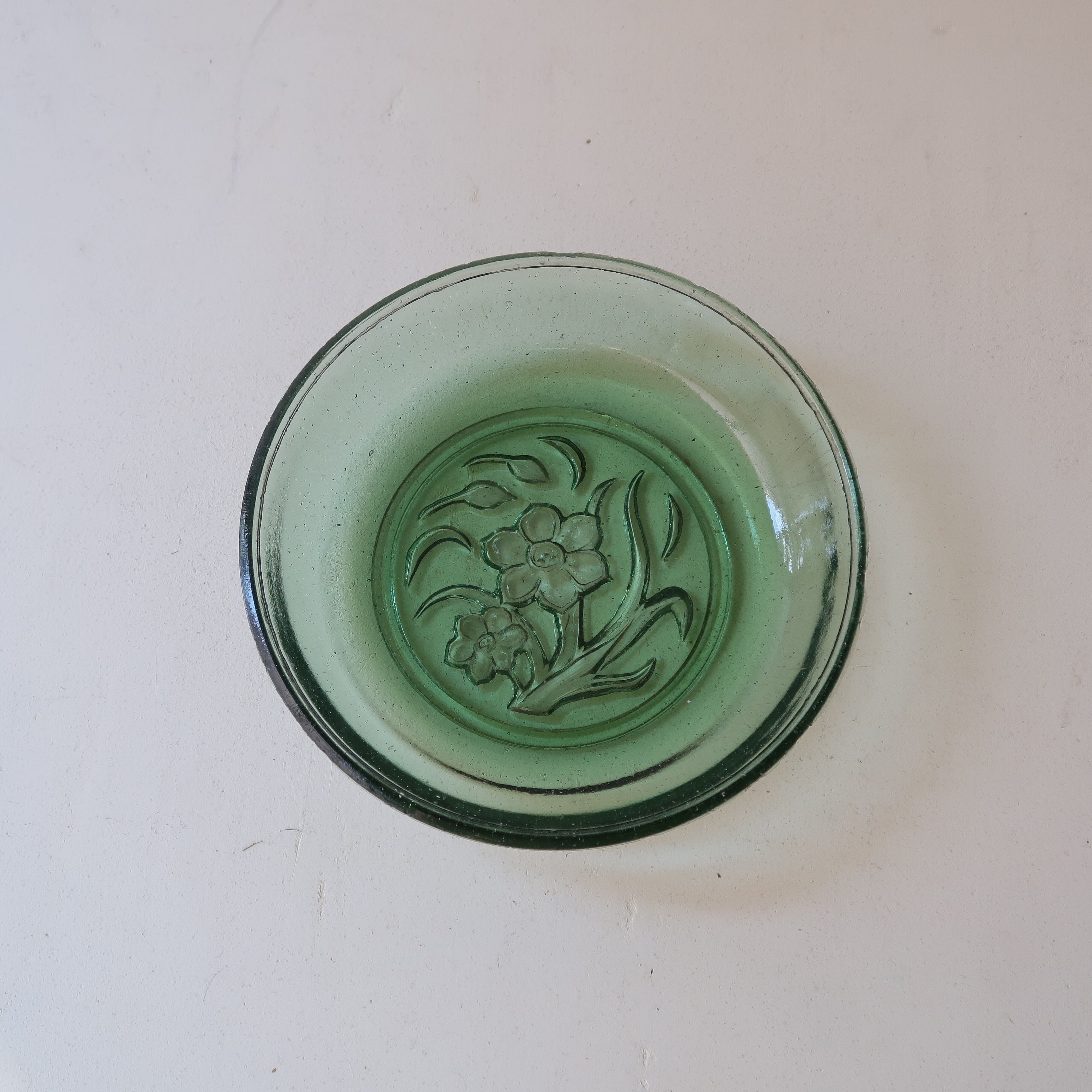 お花を象られたガラスのお皿。深いグリーン、ところどころの気泡、バリの残ったふち。古いガラスならではの味わいの残るアイテムです。すこし深さがあるので、フルーツを入れたり、副菜をのせたり、はたまたアクセサリーをかざったり。などなどお使いいただけます。