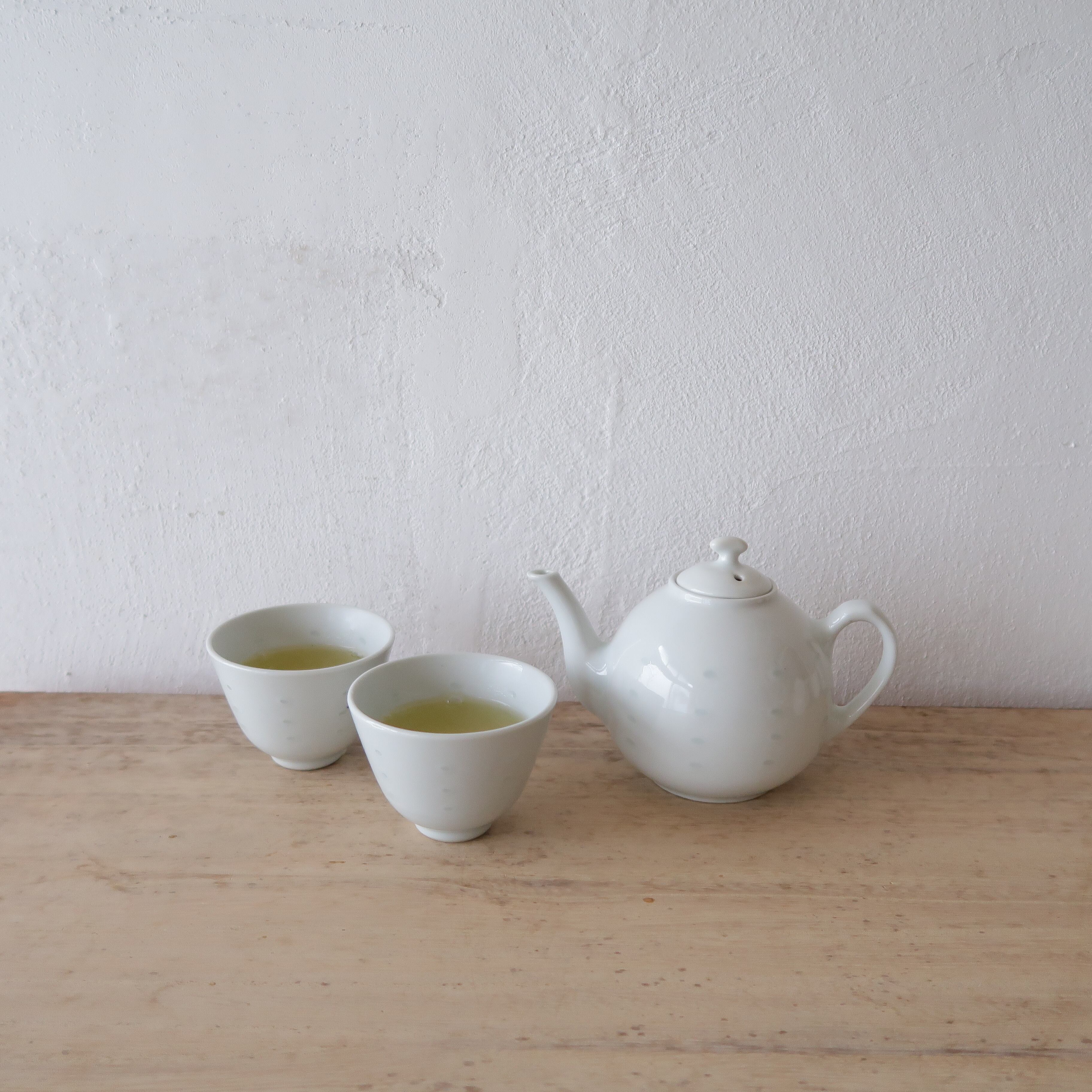 蛍手とは、透かし彫りに透明の釉薬が埋め込まれ、光が透ける技法。ティーポットにも、湯呑みにも、ぽつぽつと控えめな蛍手がかわいい。
