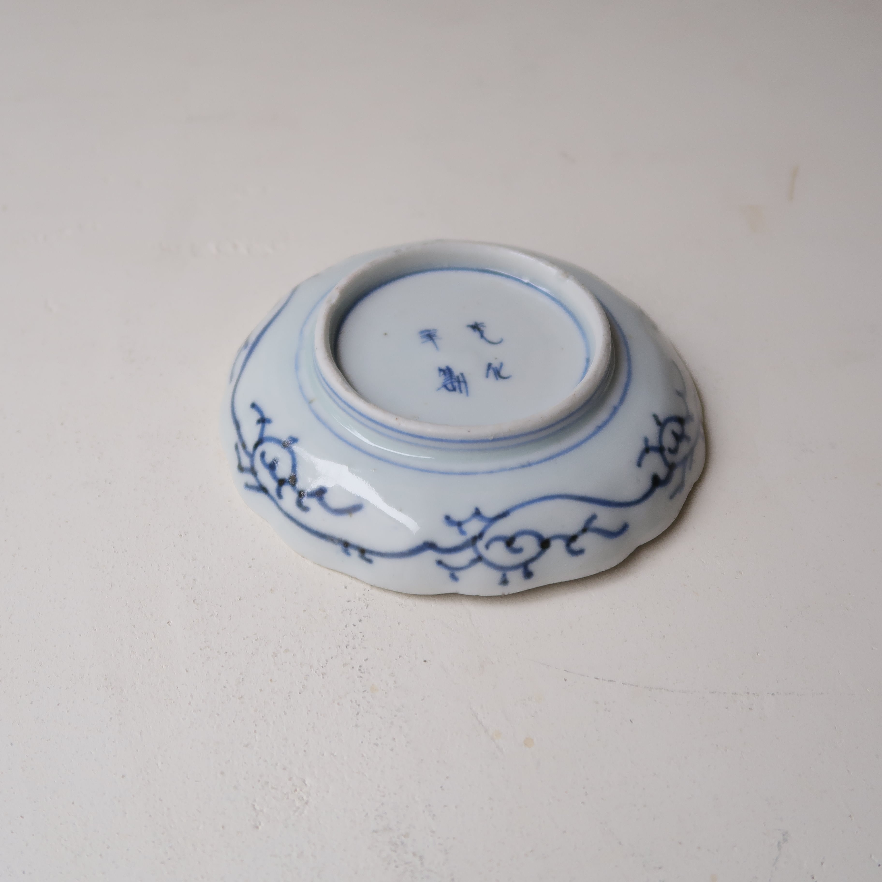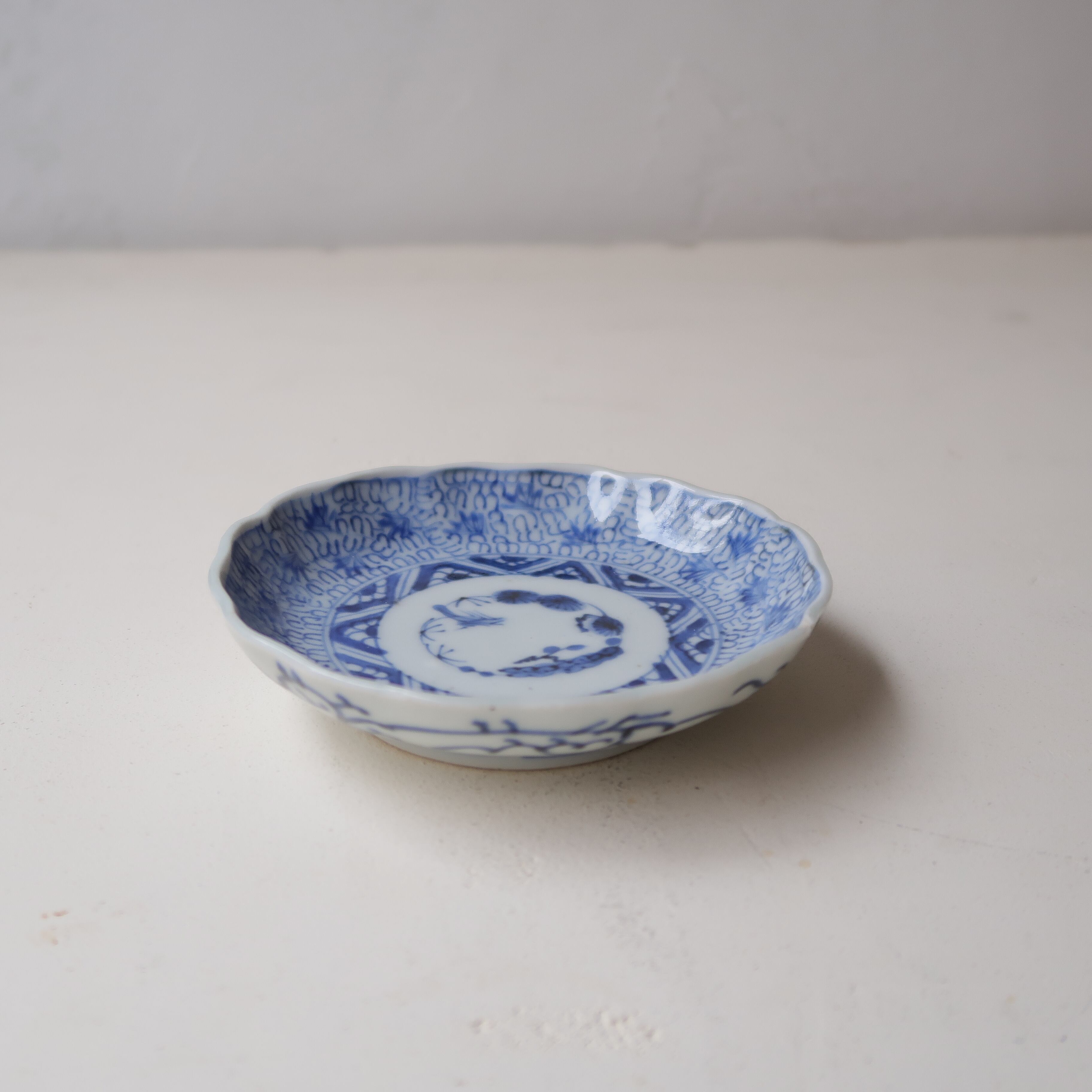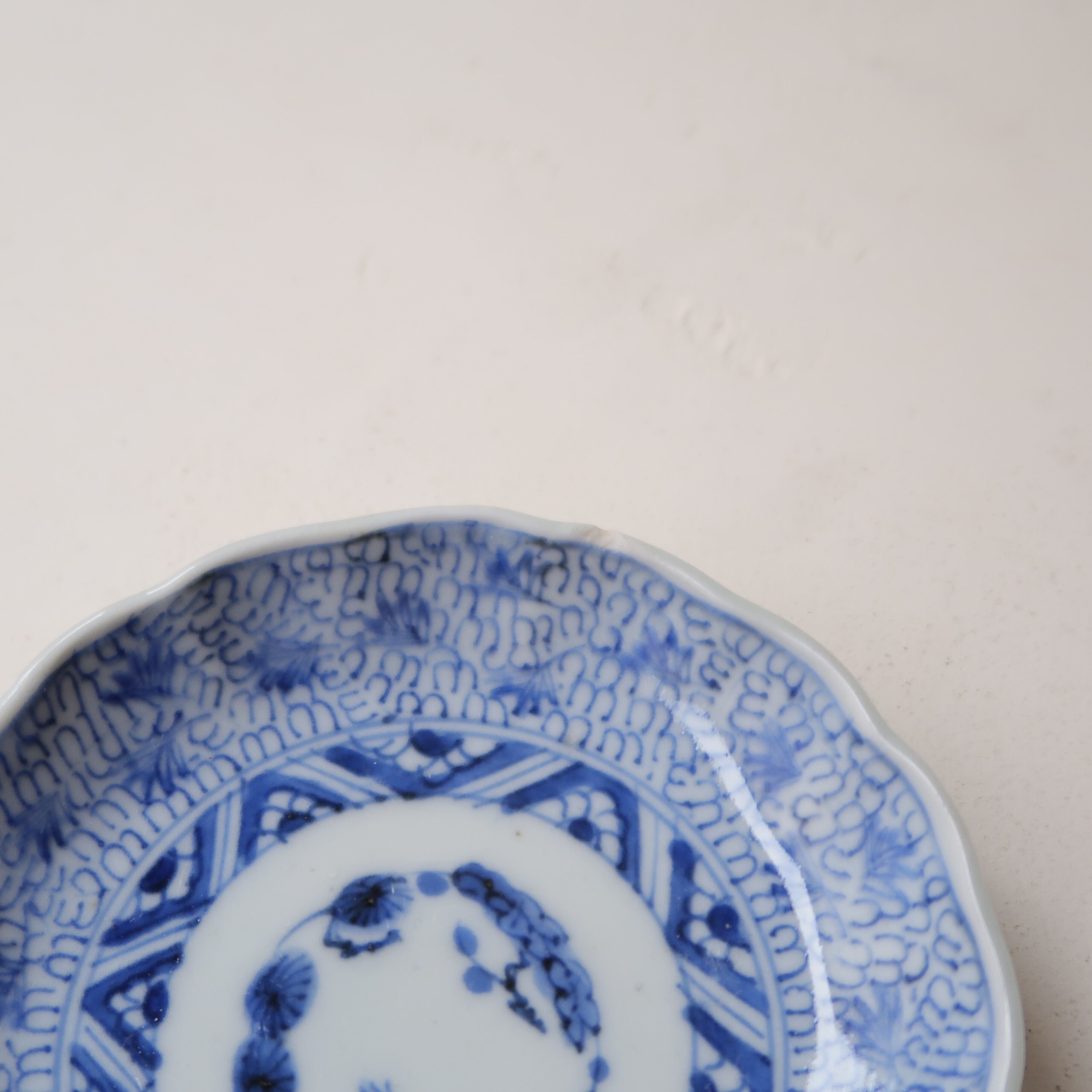 真ん中には円形の松竹梅、そのまわりを花と三角形、縁にはみじん唐草模様が描かれている、江戸幕府の染付。