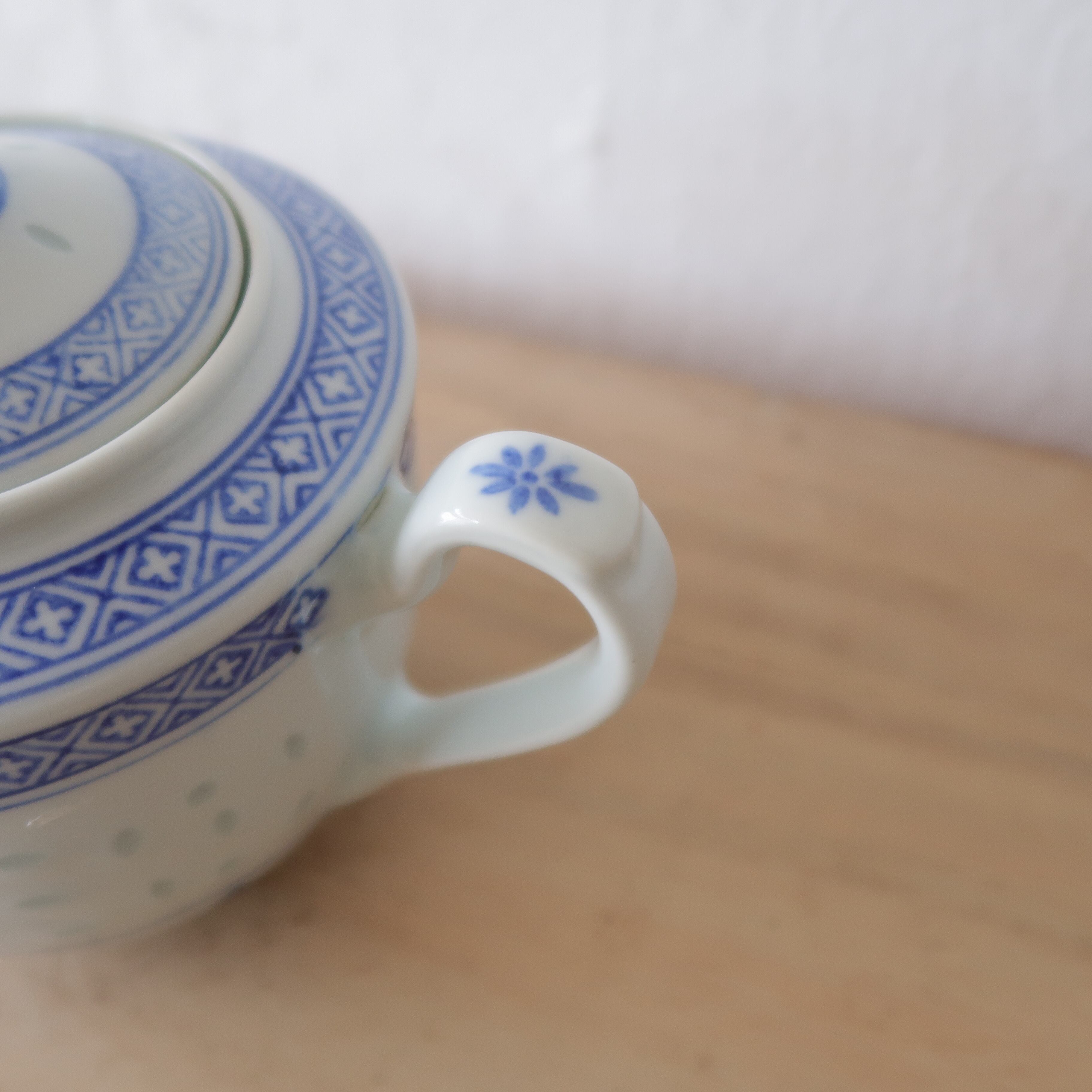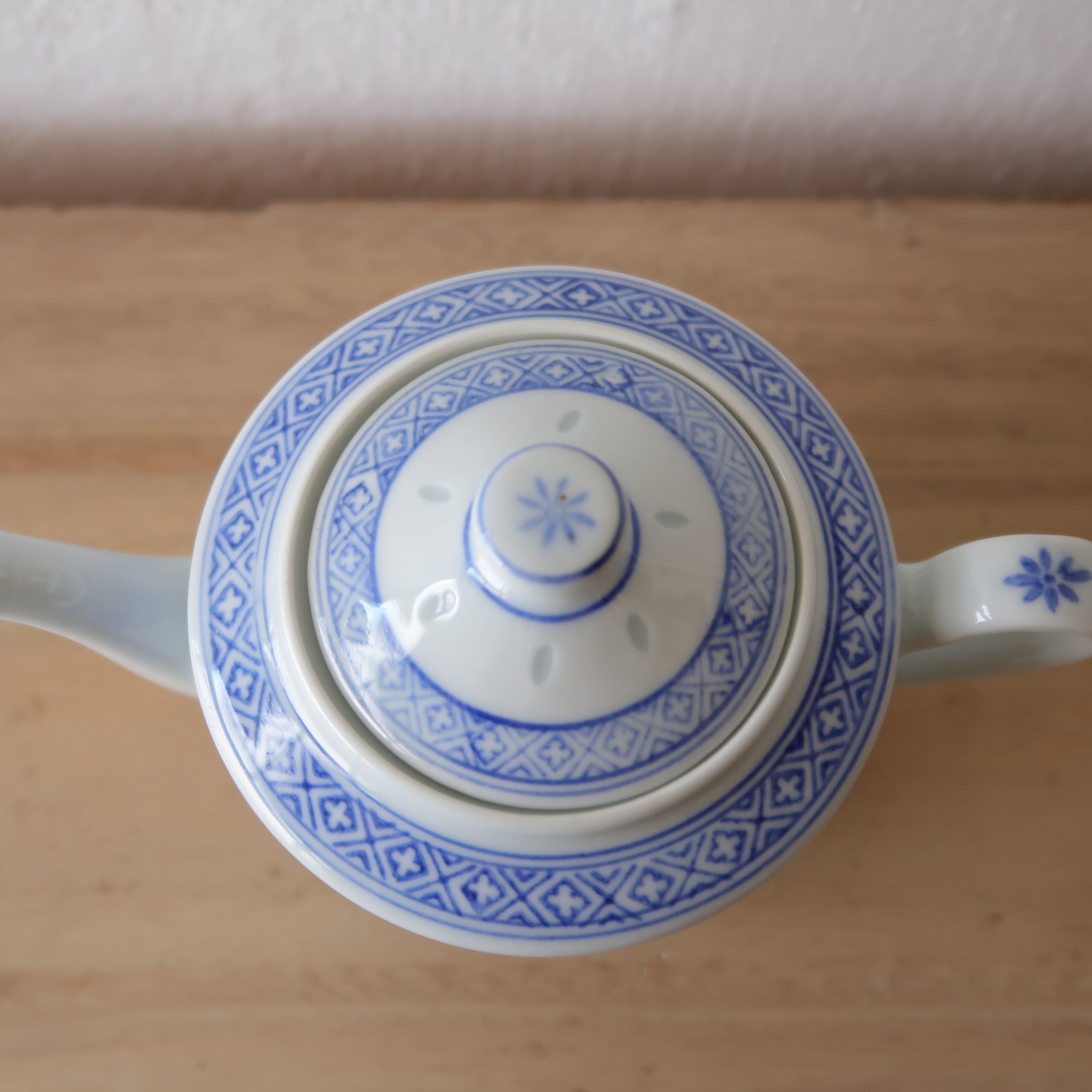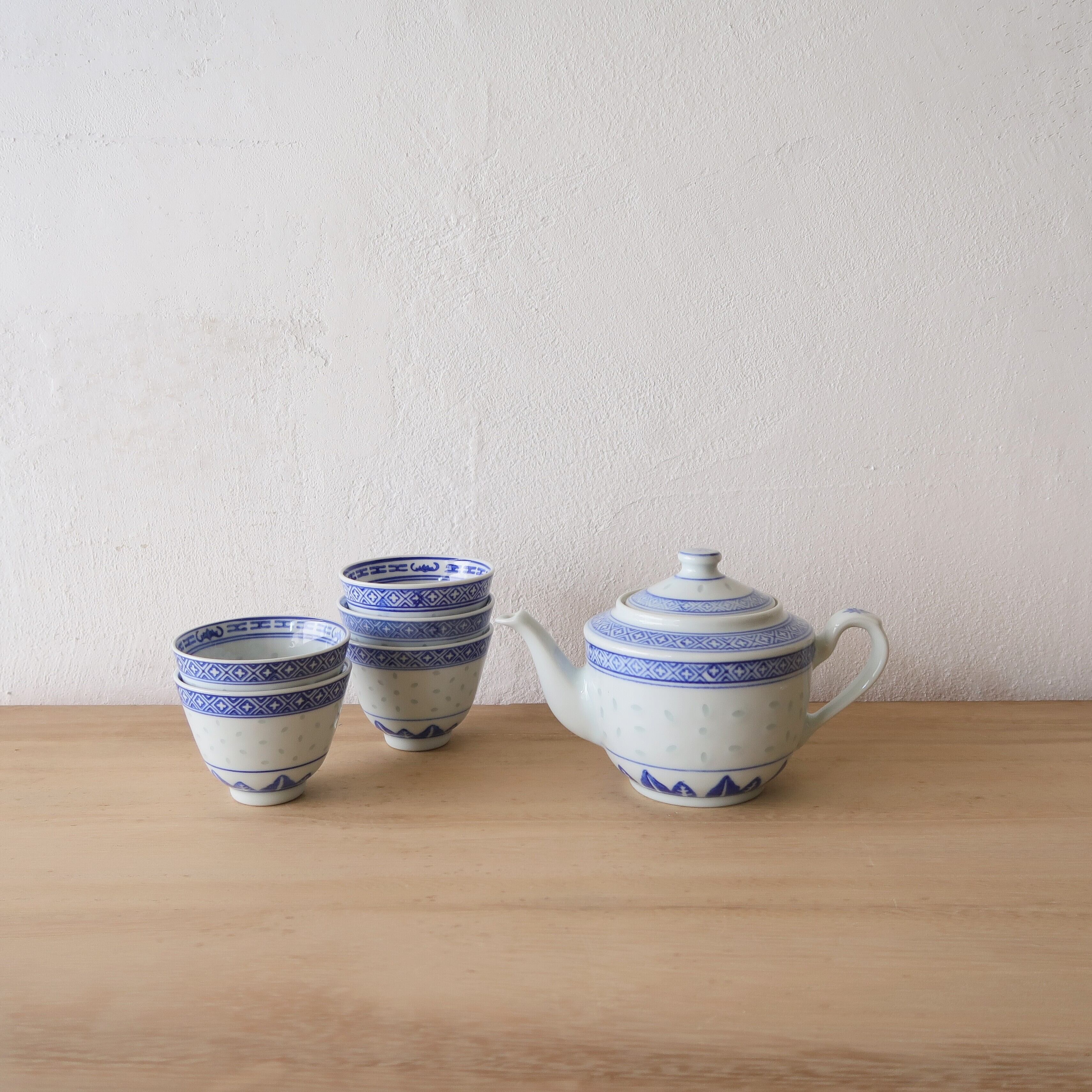 陶器の一部にガラスが使われていて、ホタルのように光が透ける蛍手という手法。ティーポットとカップのセットを再入荷しました。