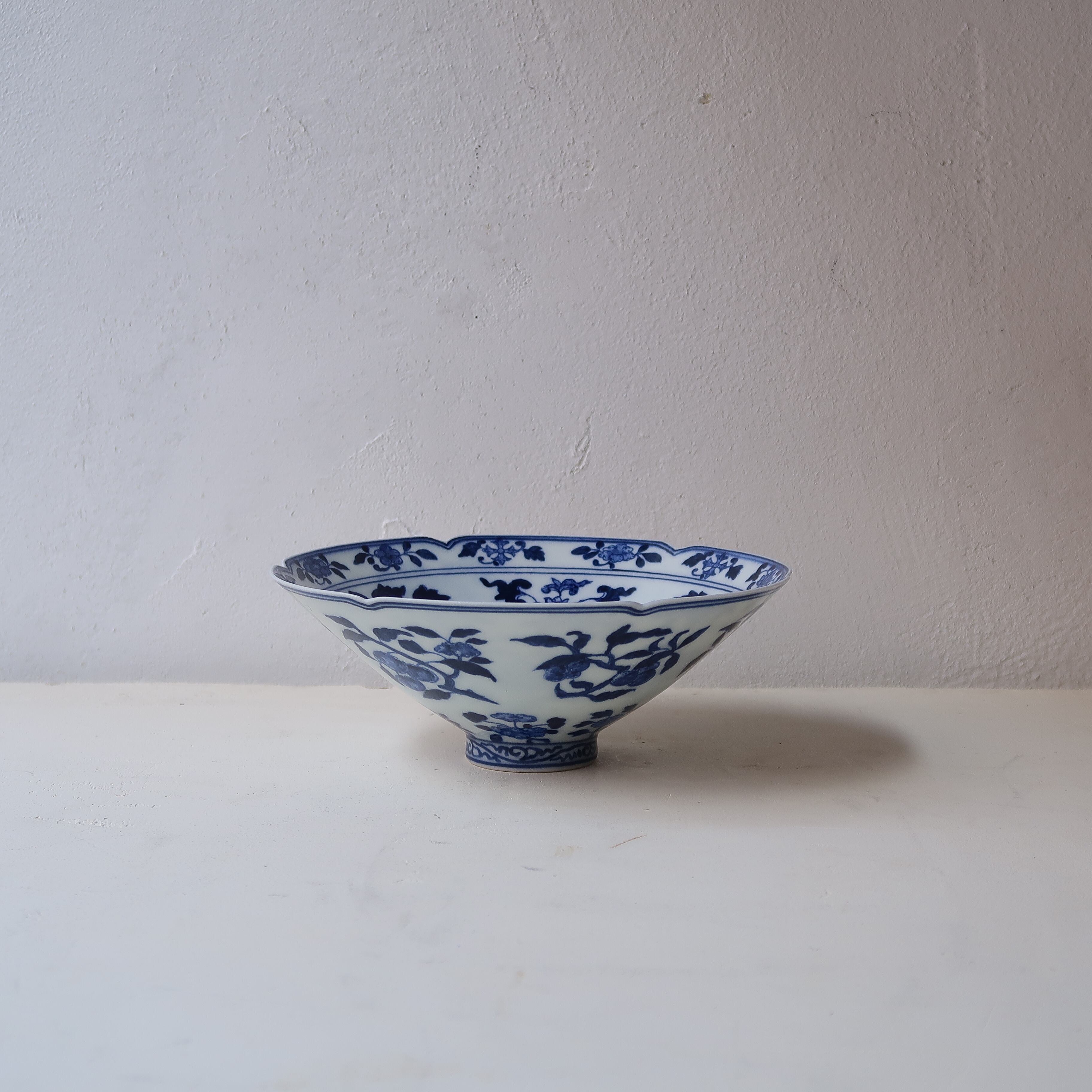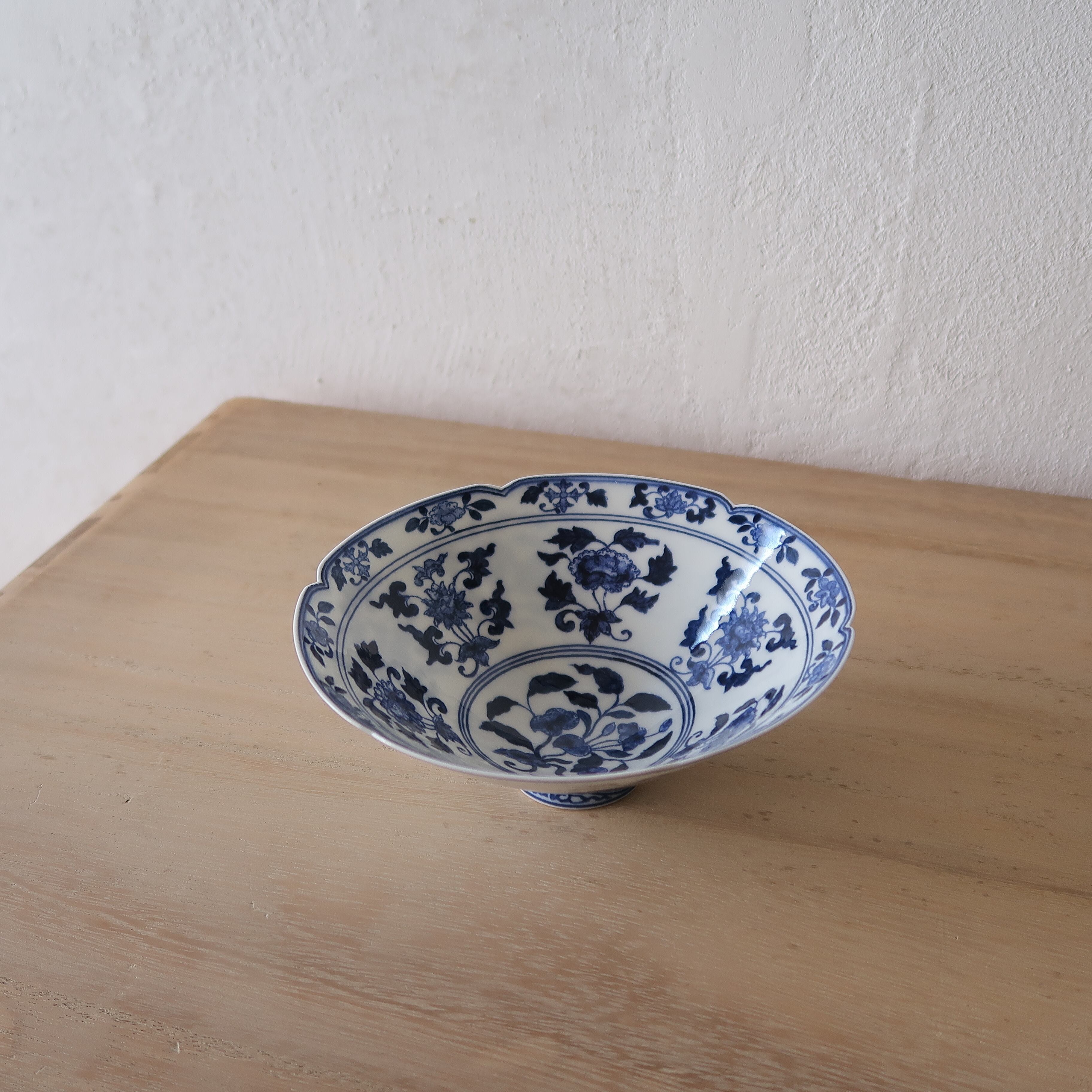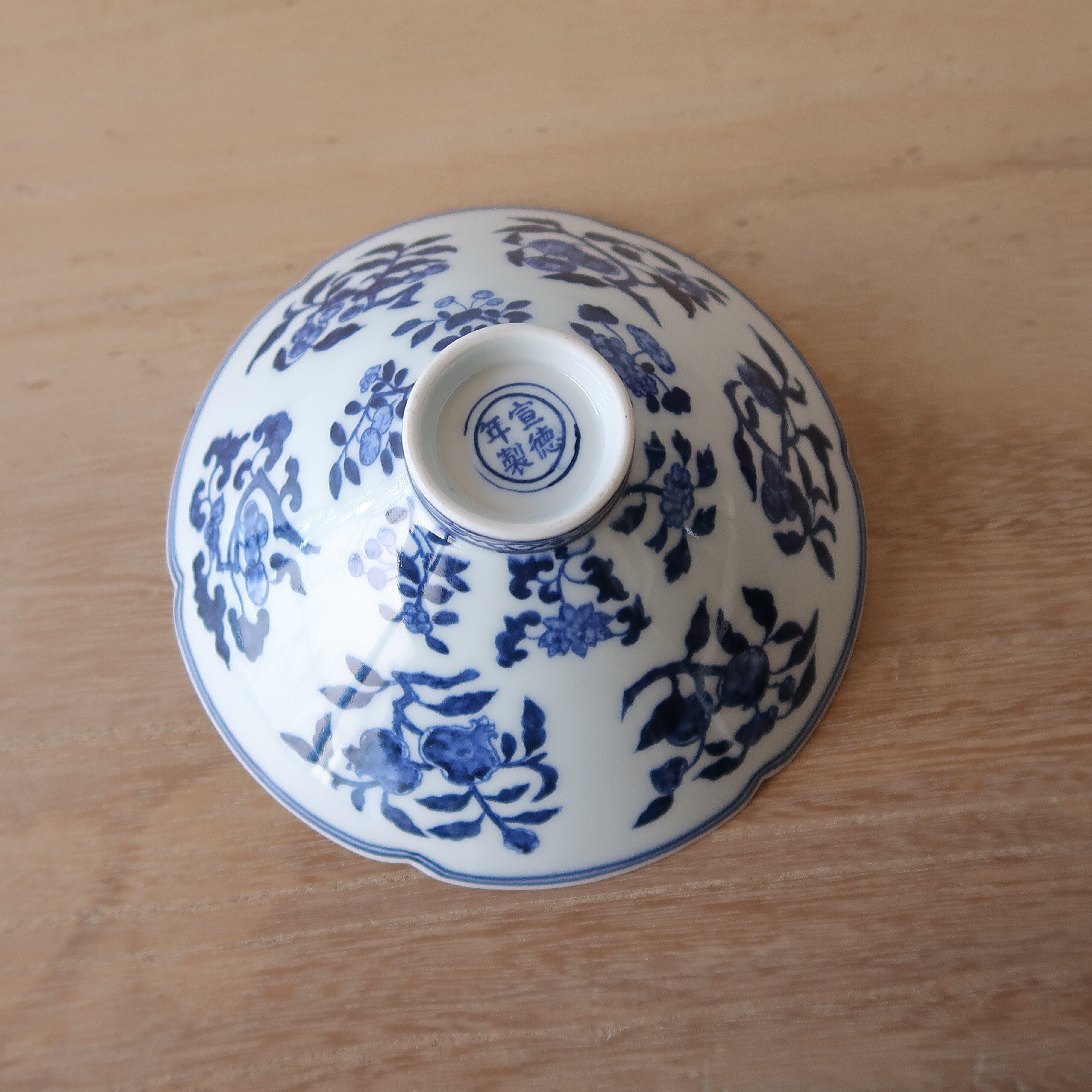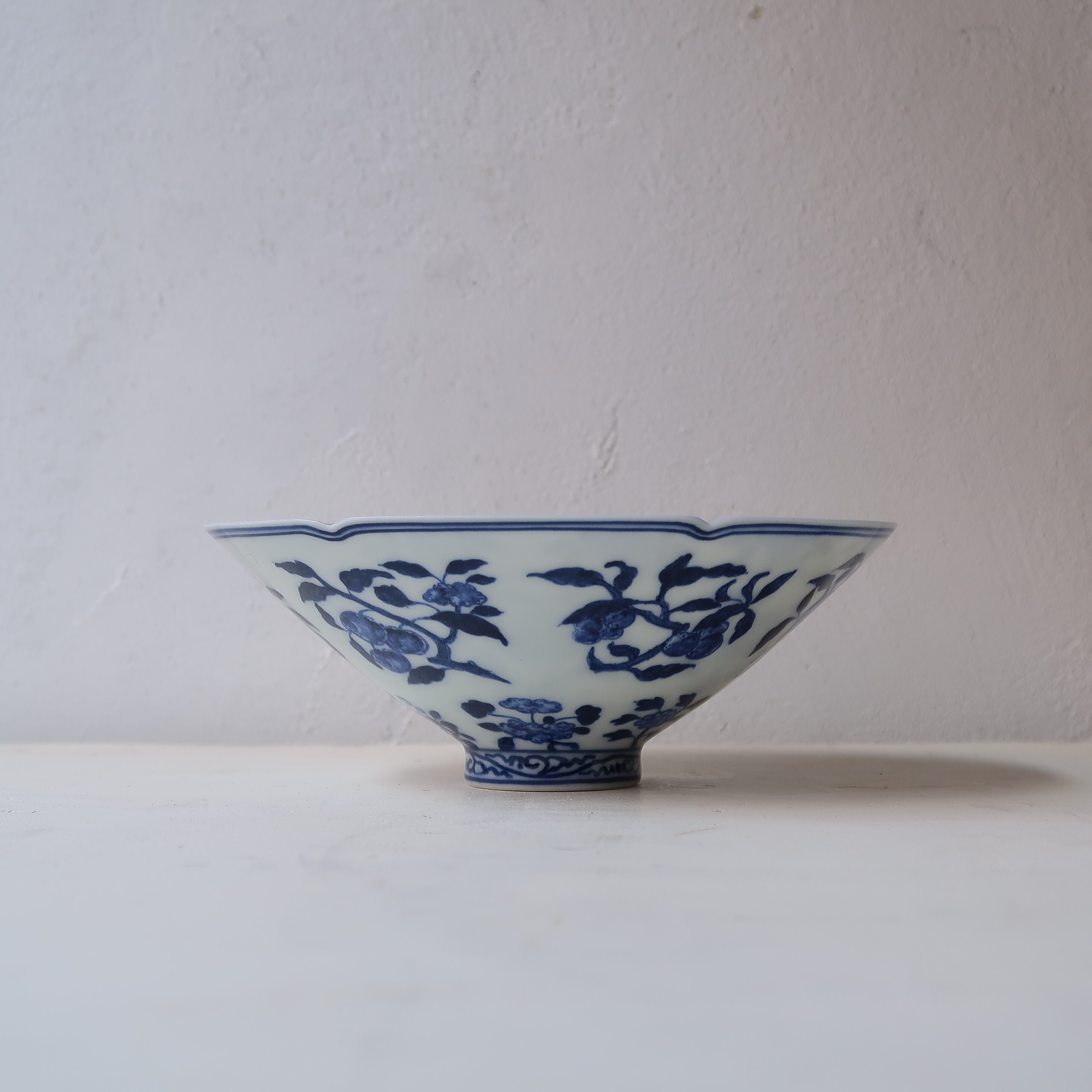 花びらのように、ひらひらとしたふちが特徴の輪花型の茶碗。向こう側の絵柄が透けるほどの薄さで、大事に大事に使いたい。