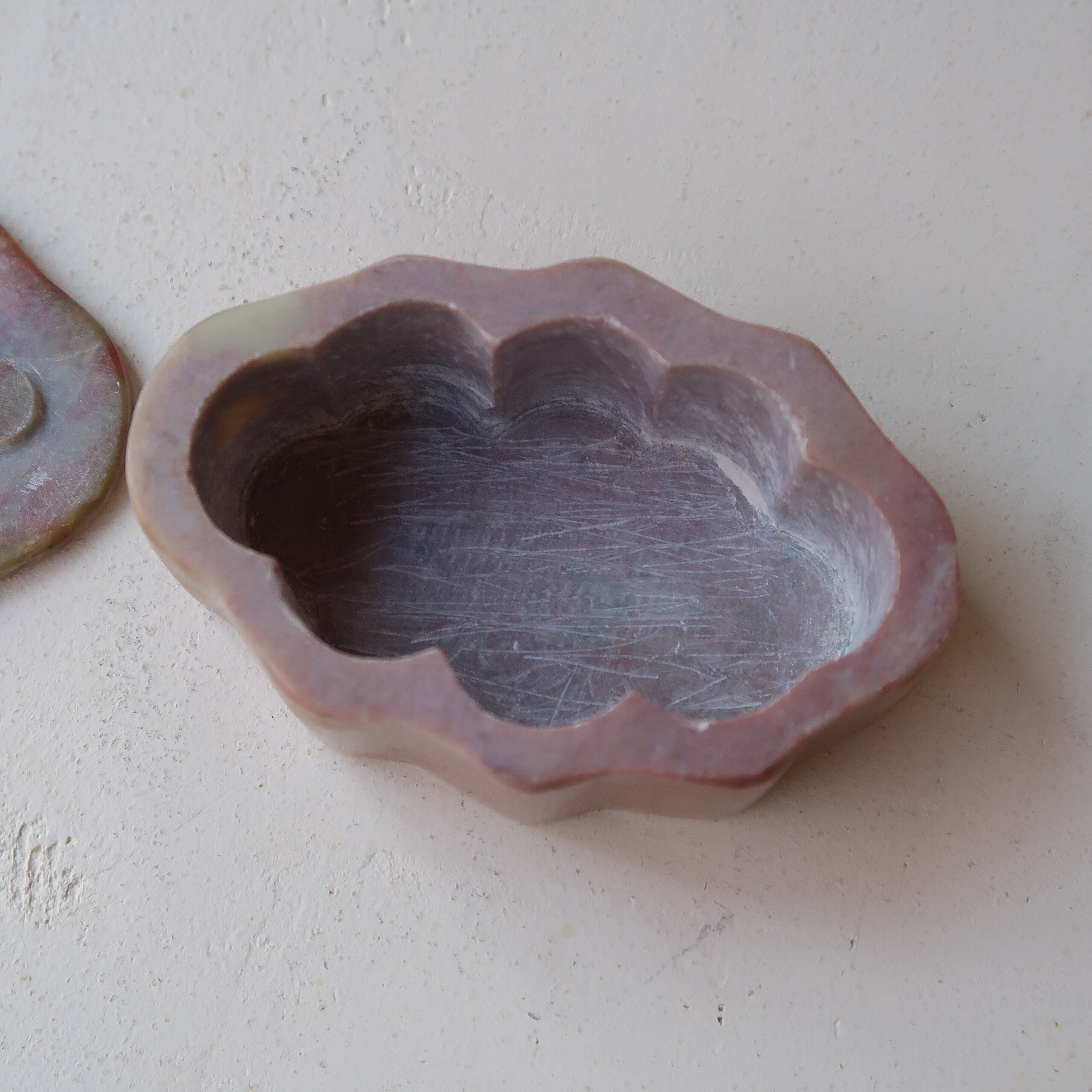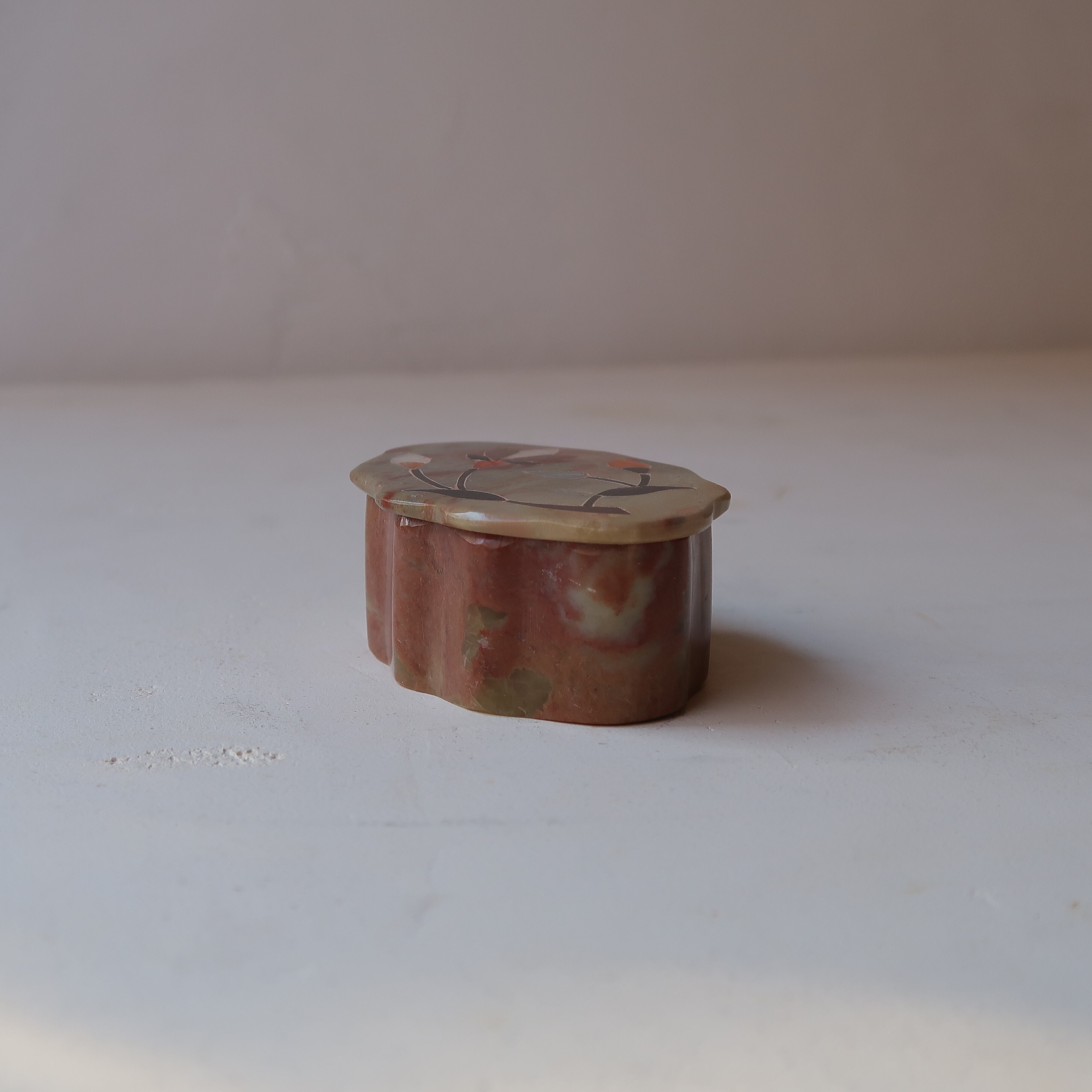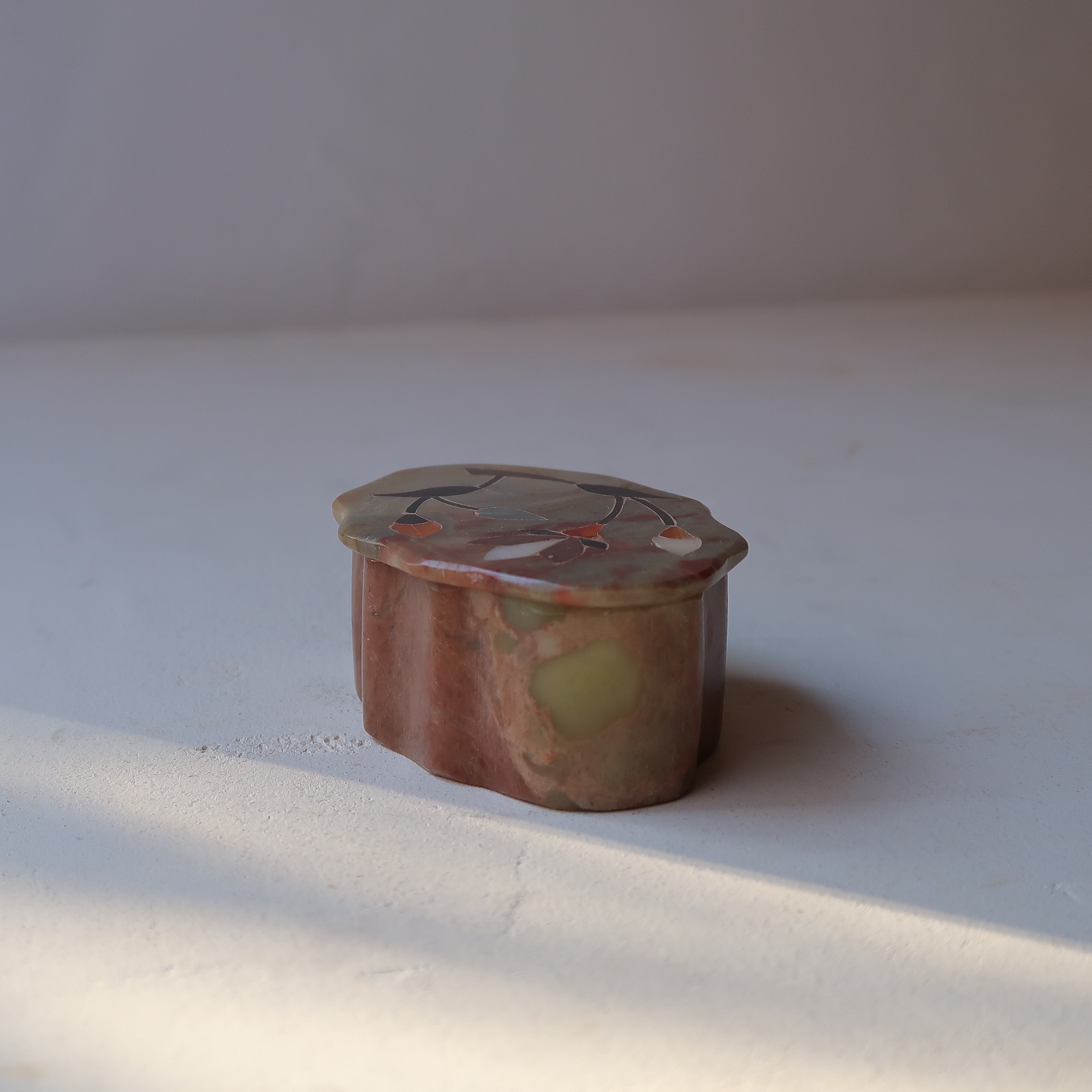 エンブレムのようなフタと、器の側面のまだらな石の模様がなんともかわいい。グリーンとテラコッタ色の石に、オレンジやダークグリーン、ホワイトの象嵌がレトロでモダンな印象。
