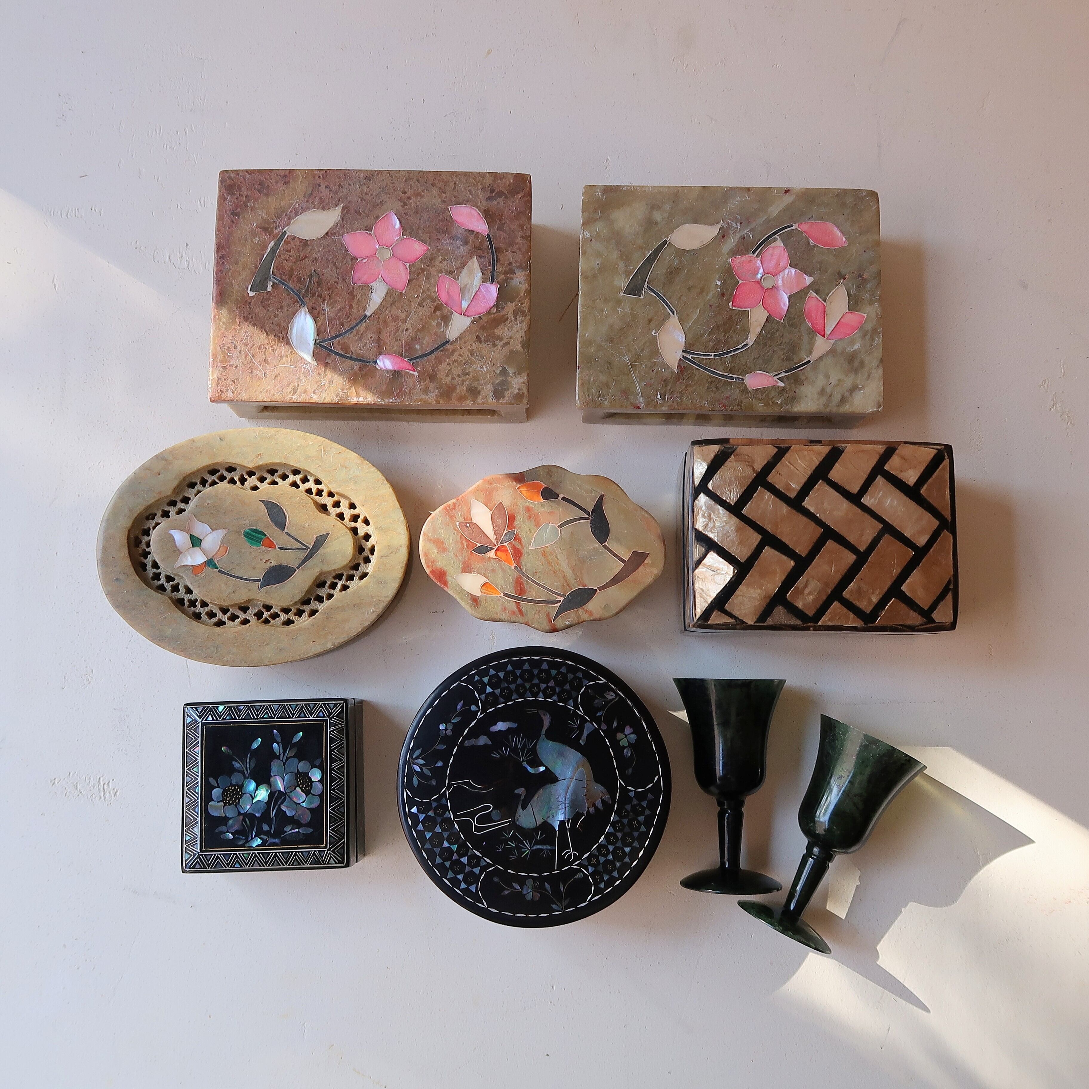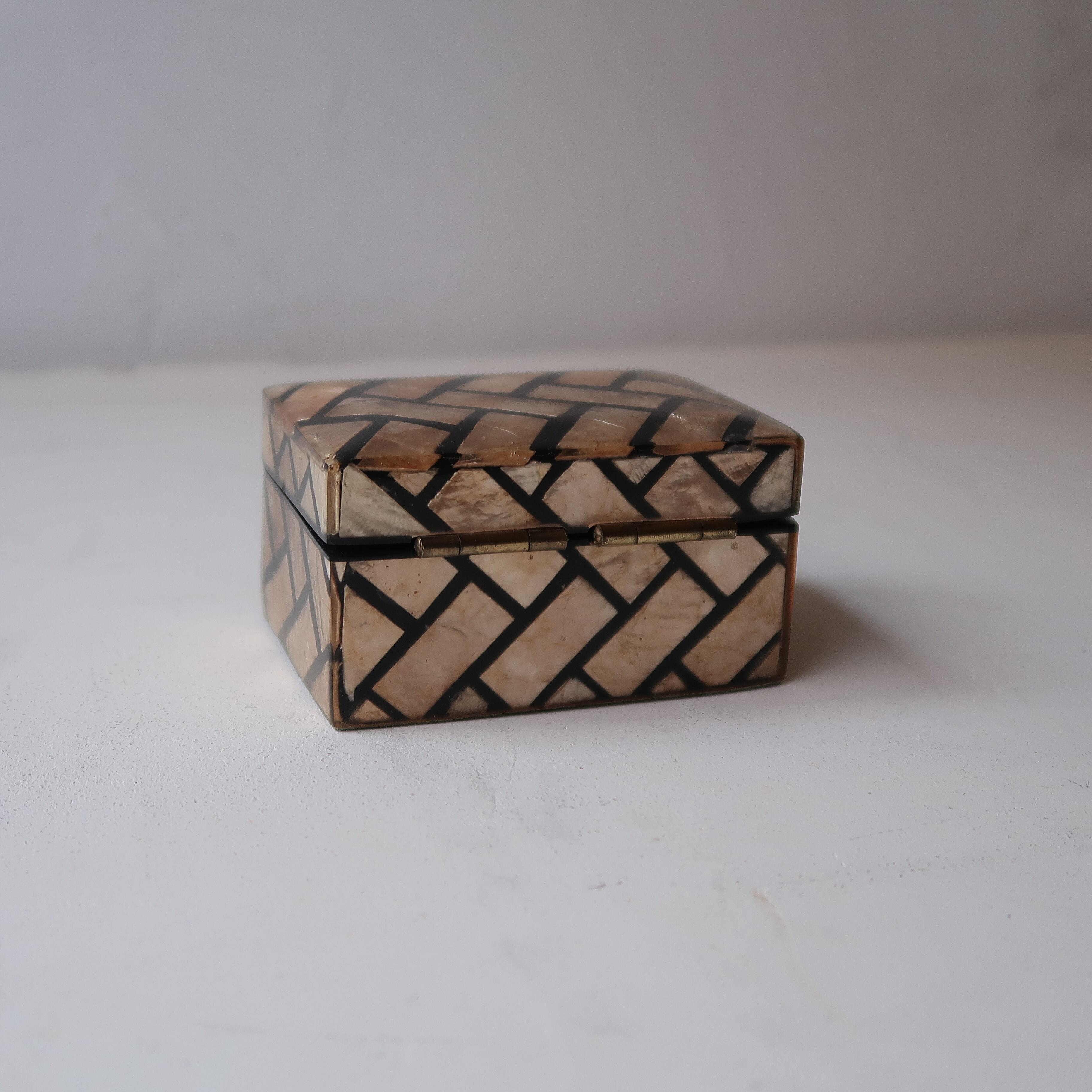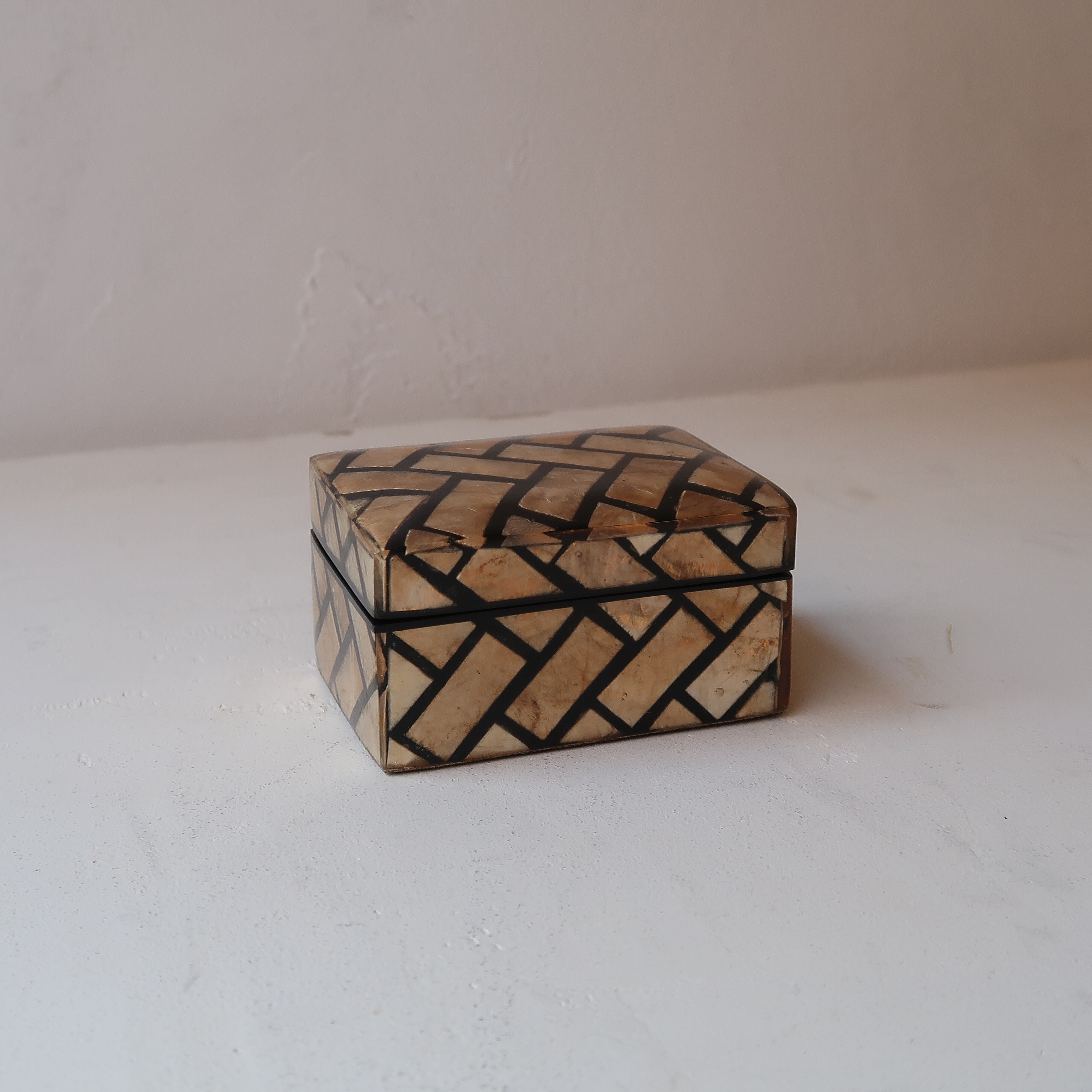 ジグザグと黄金色にかがやくシェルに、分厚いアクリルがコーティングされたちいさなジュエリーボックス。螺鈿のような伝統的なかがやきを、アクリルという現代の技術で閉じこめたような、古くて新しいアイテムです。