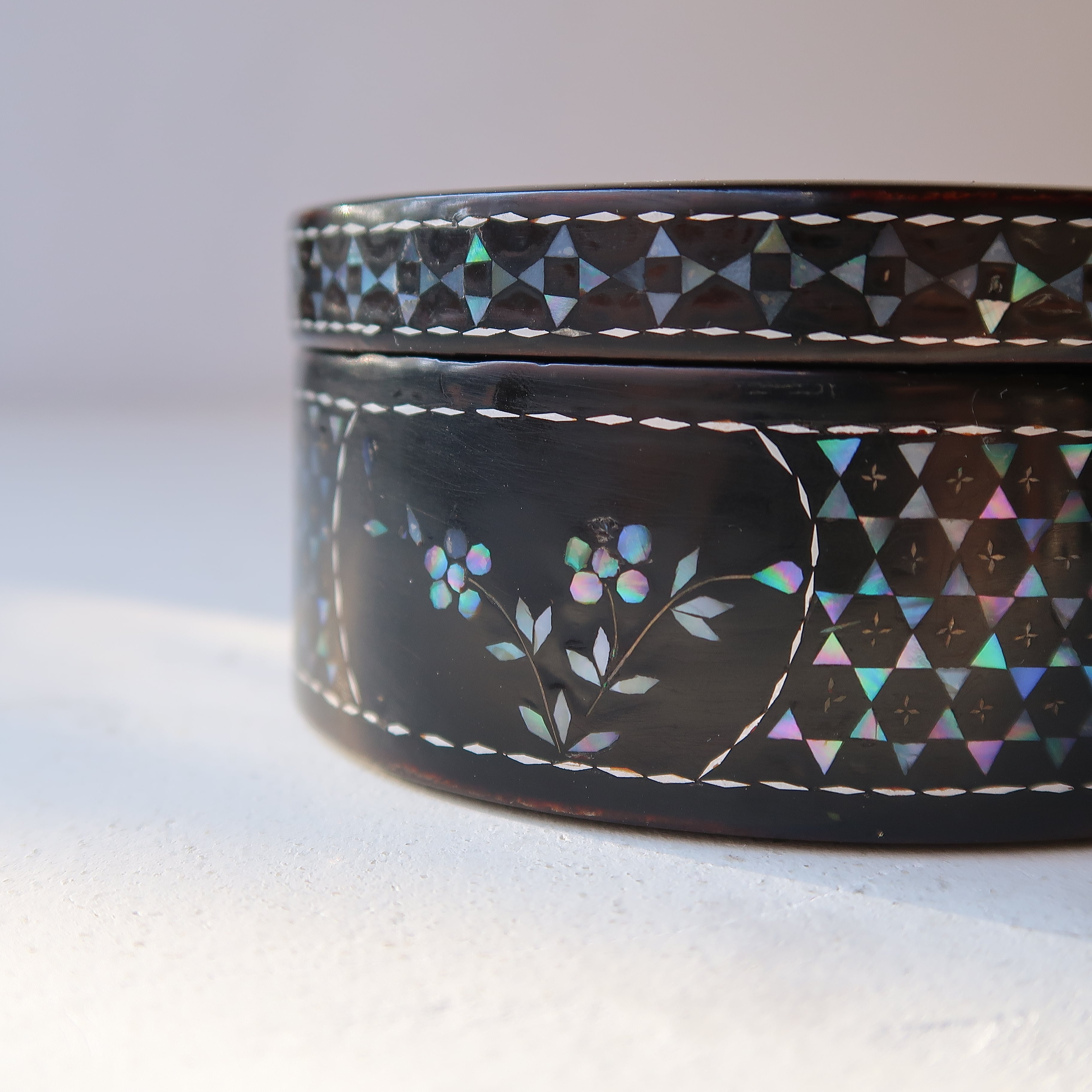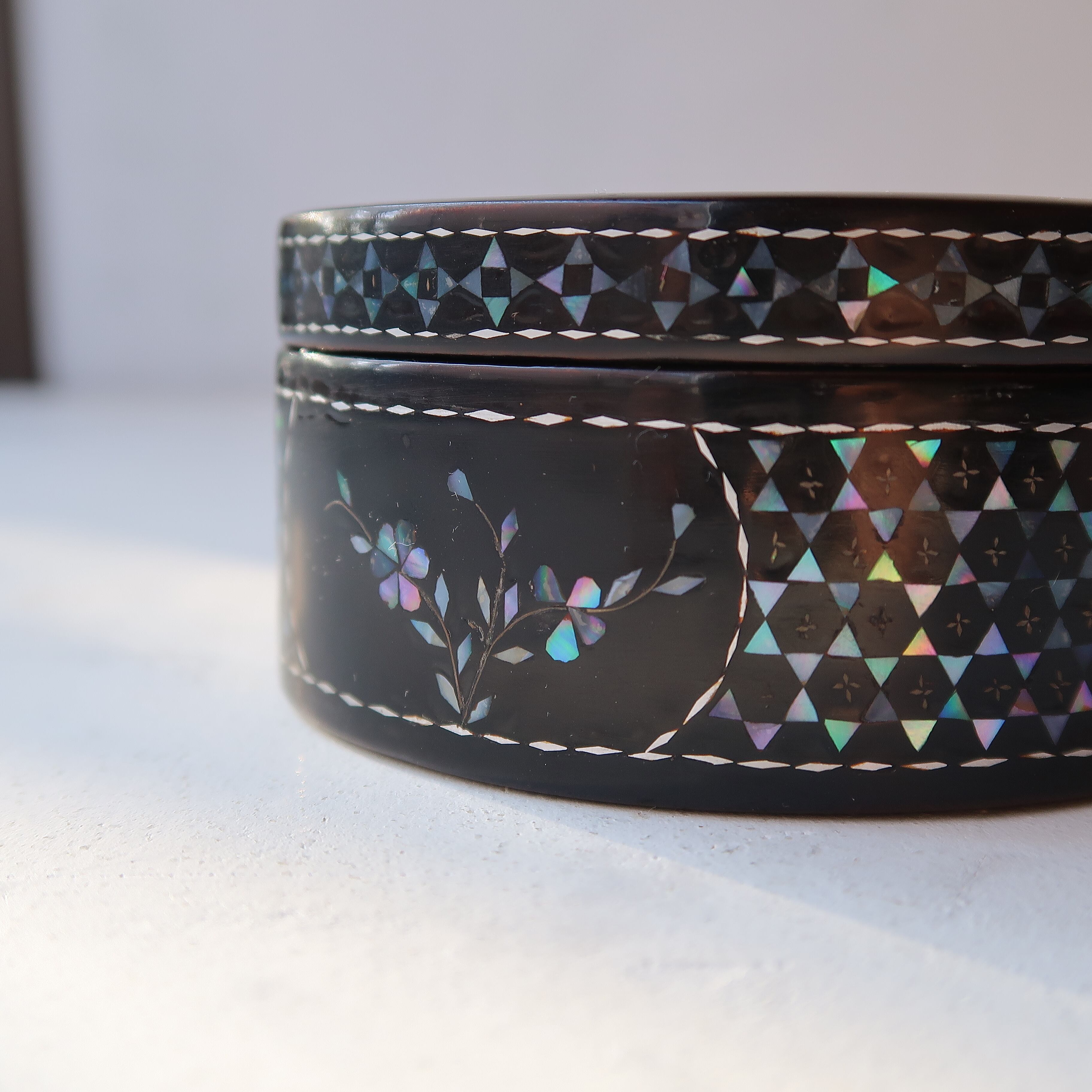 フタには、中央に鶴、縁にはお花と亀甲模様、側面にもちいさなお花と細かすぎるほどの紋様がほどこされています。伝統的な技法でありながら、螺鈿のちいさなきらきらがかわいい。