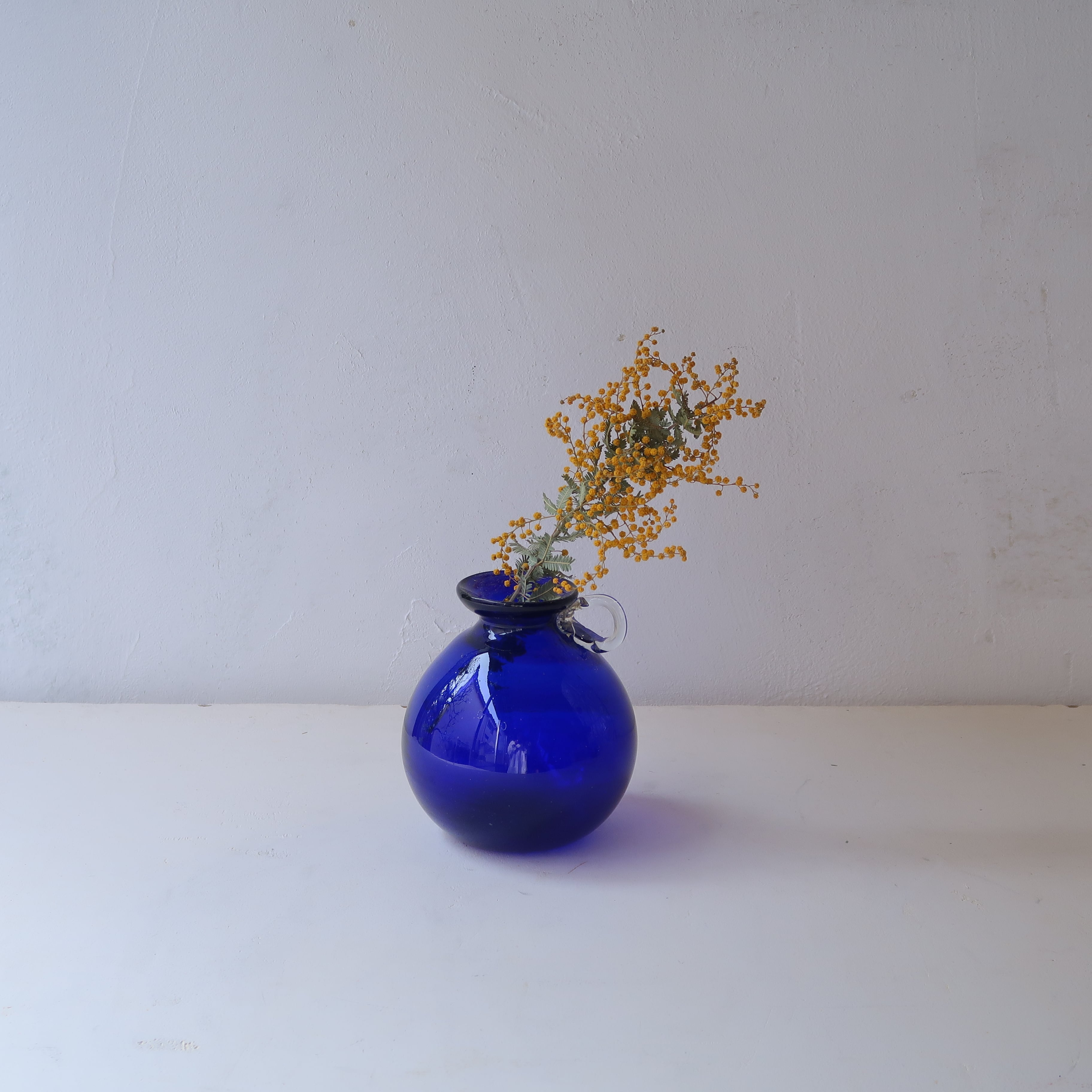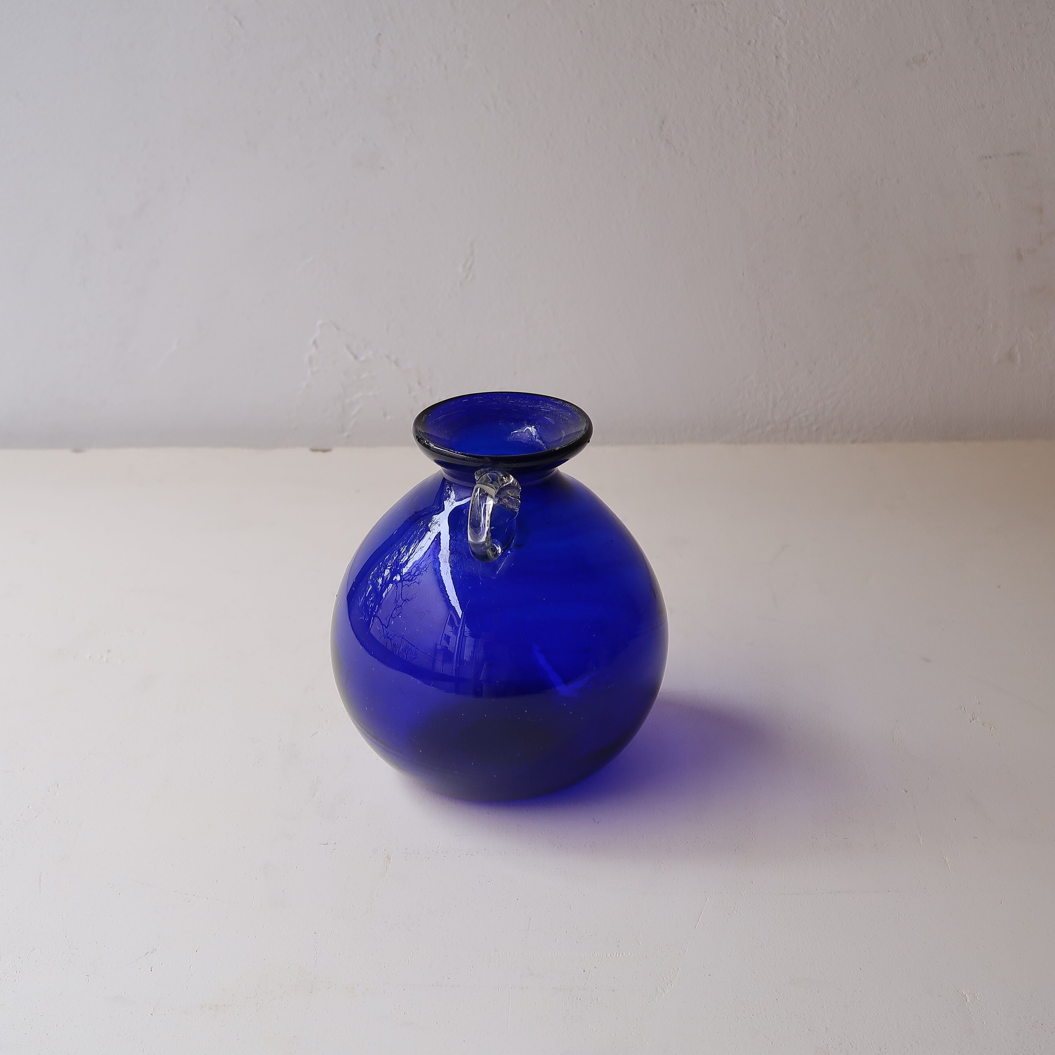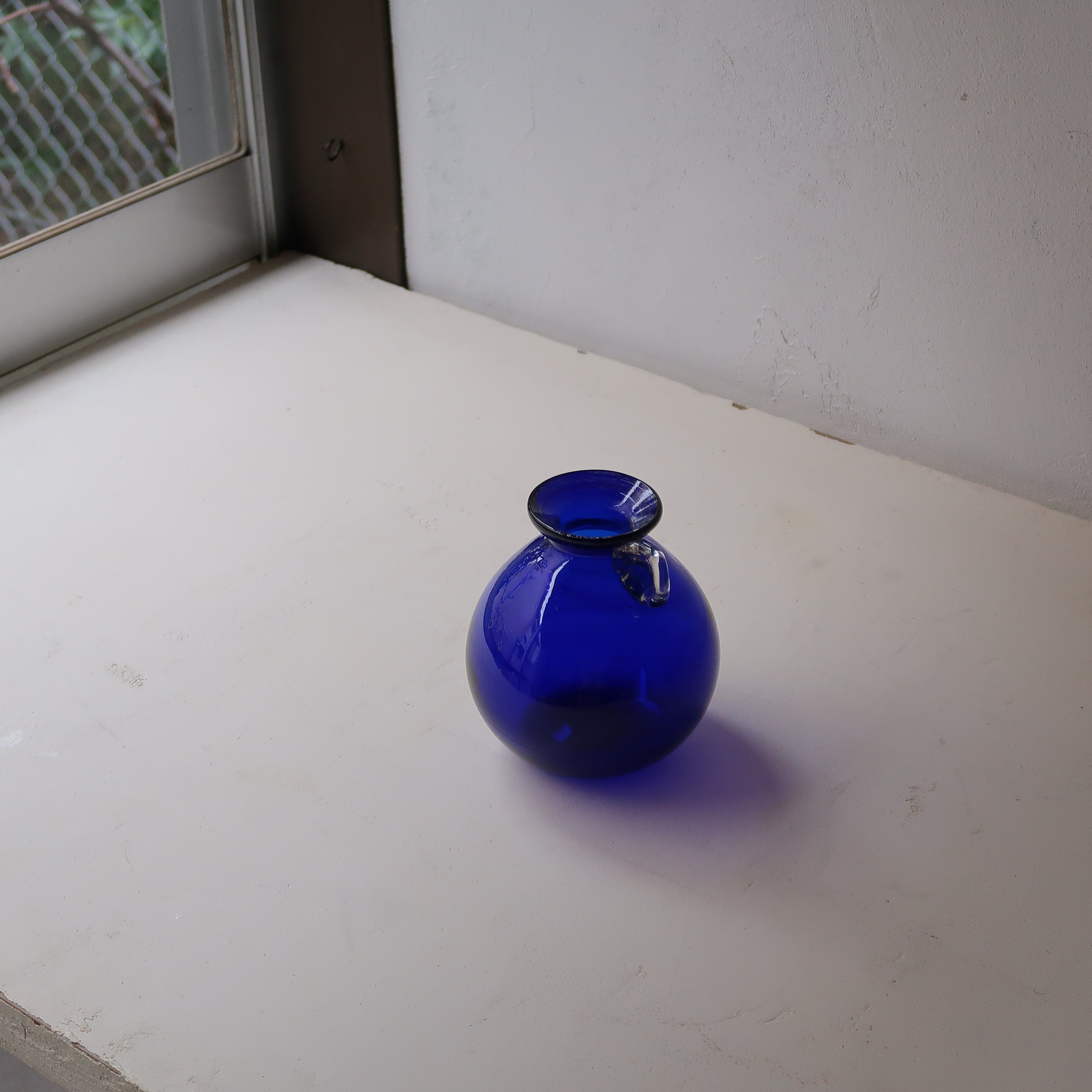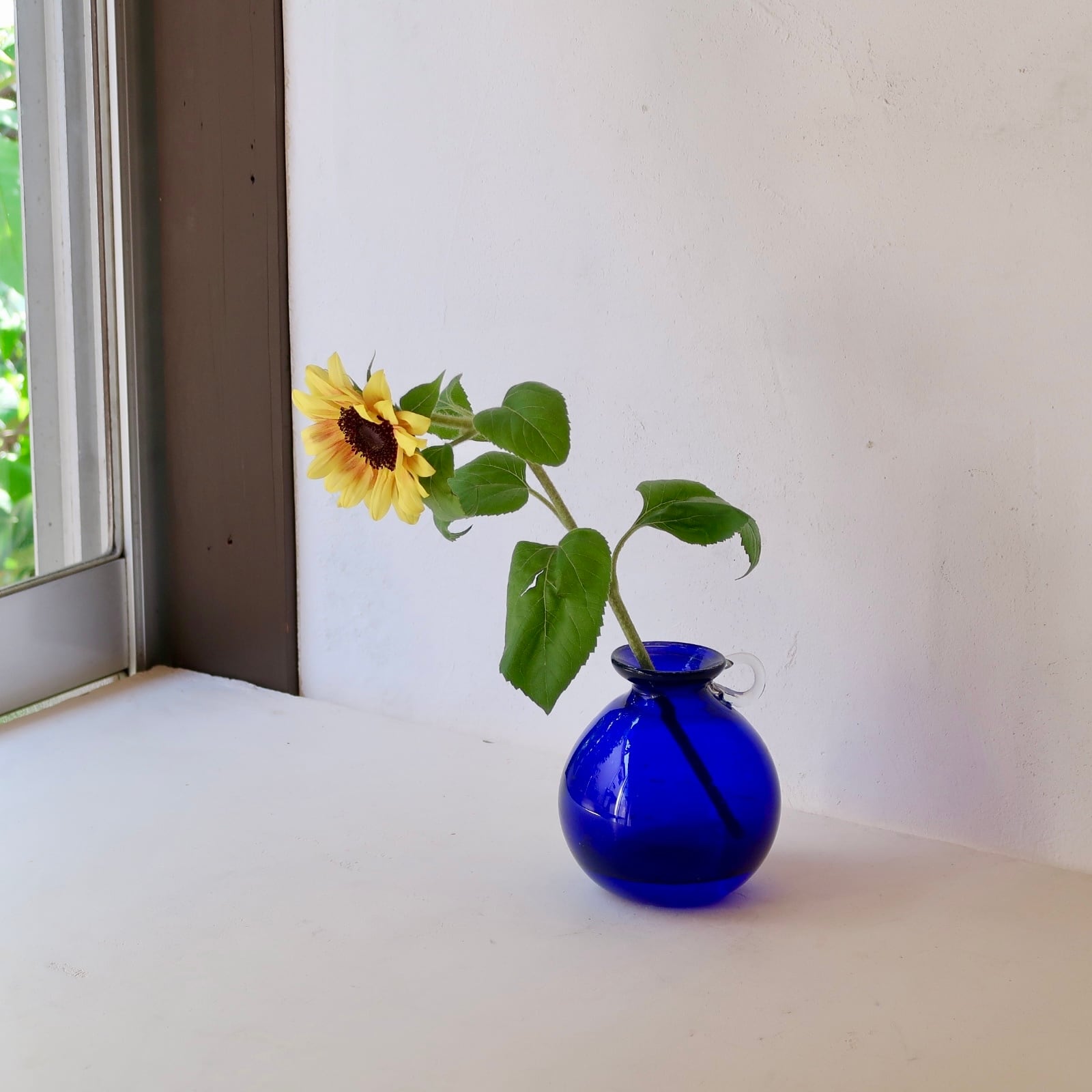 丸いボールのような花瓶。小ぶりなので、一輪挿しとして活躍しそうです。どこまでも青いような、コバルトブルーのガラスが美しい。よく見るとところどころに気泡があり、吹きガラスならではのゆらぎのある質感も魅力的です。