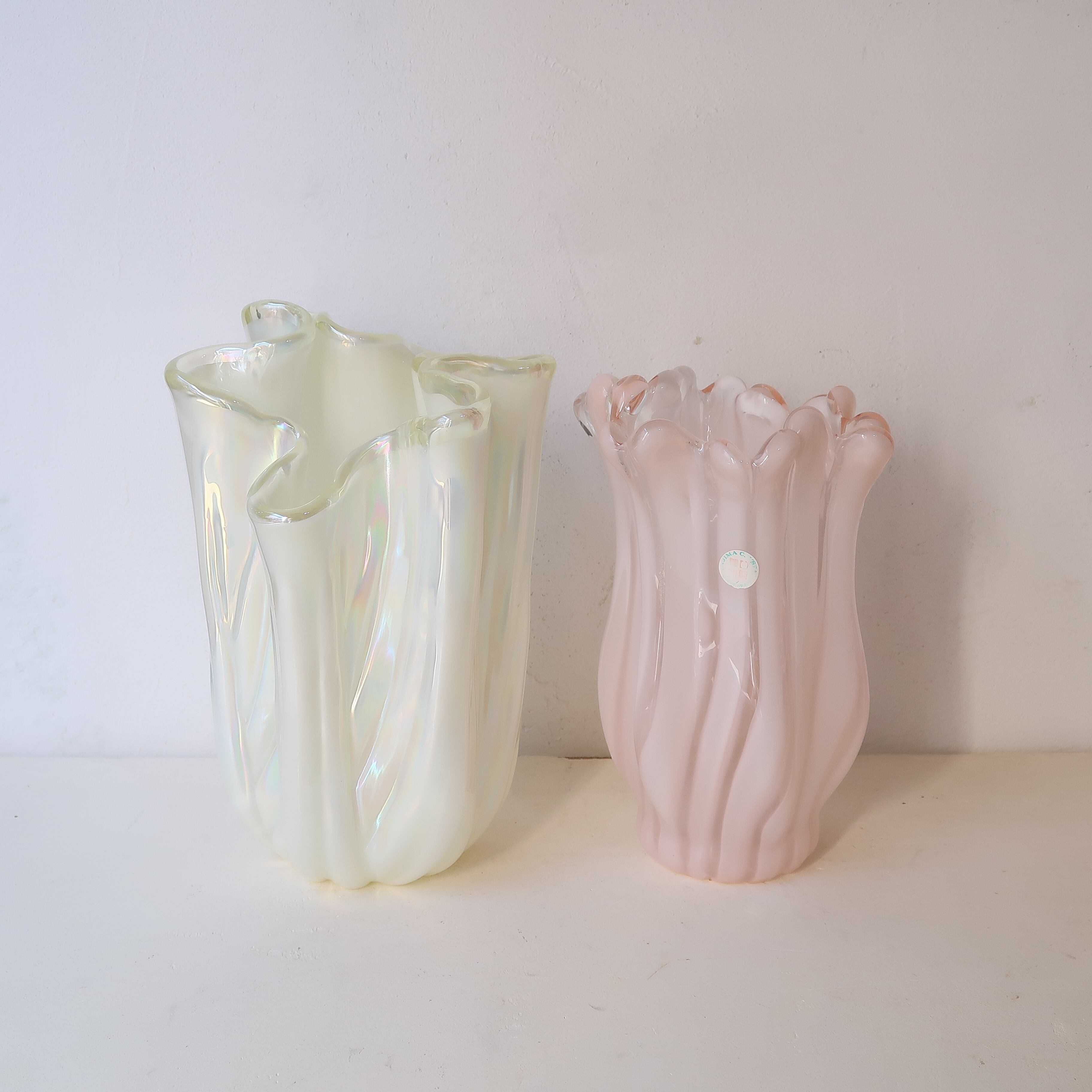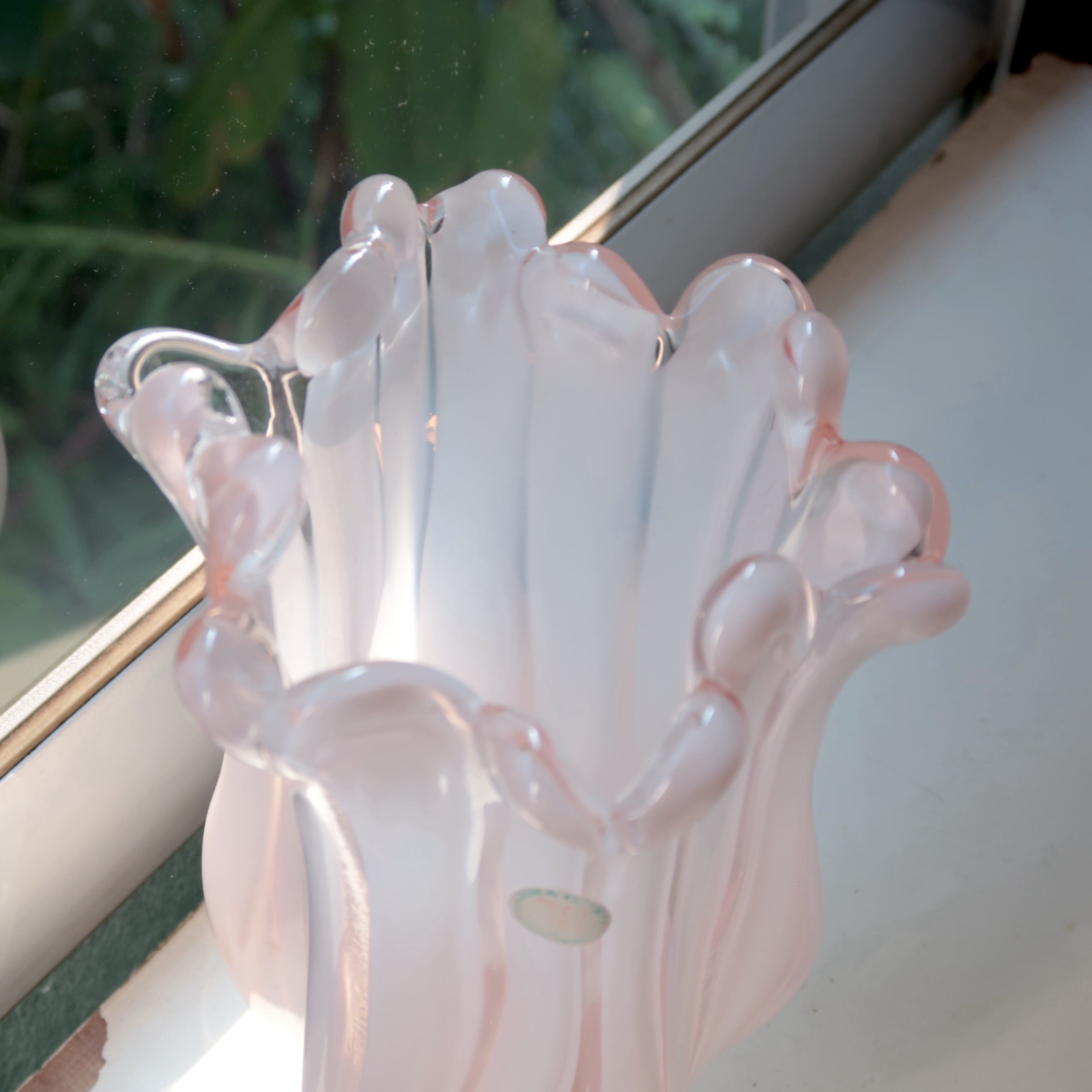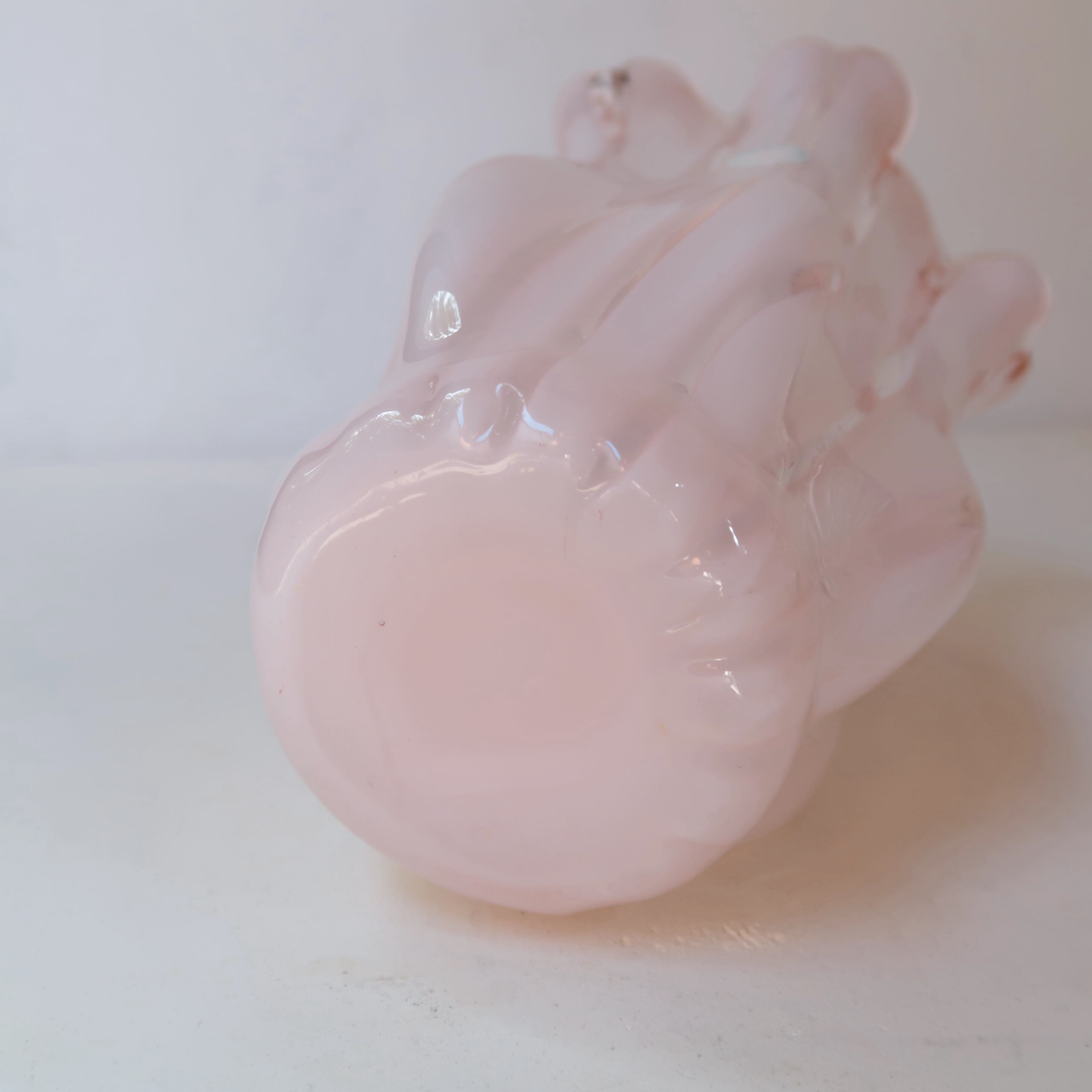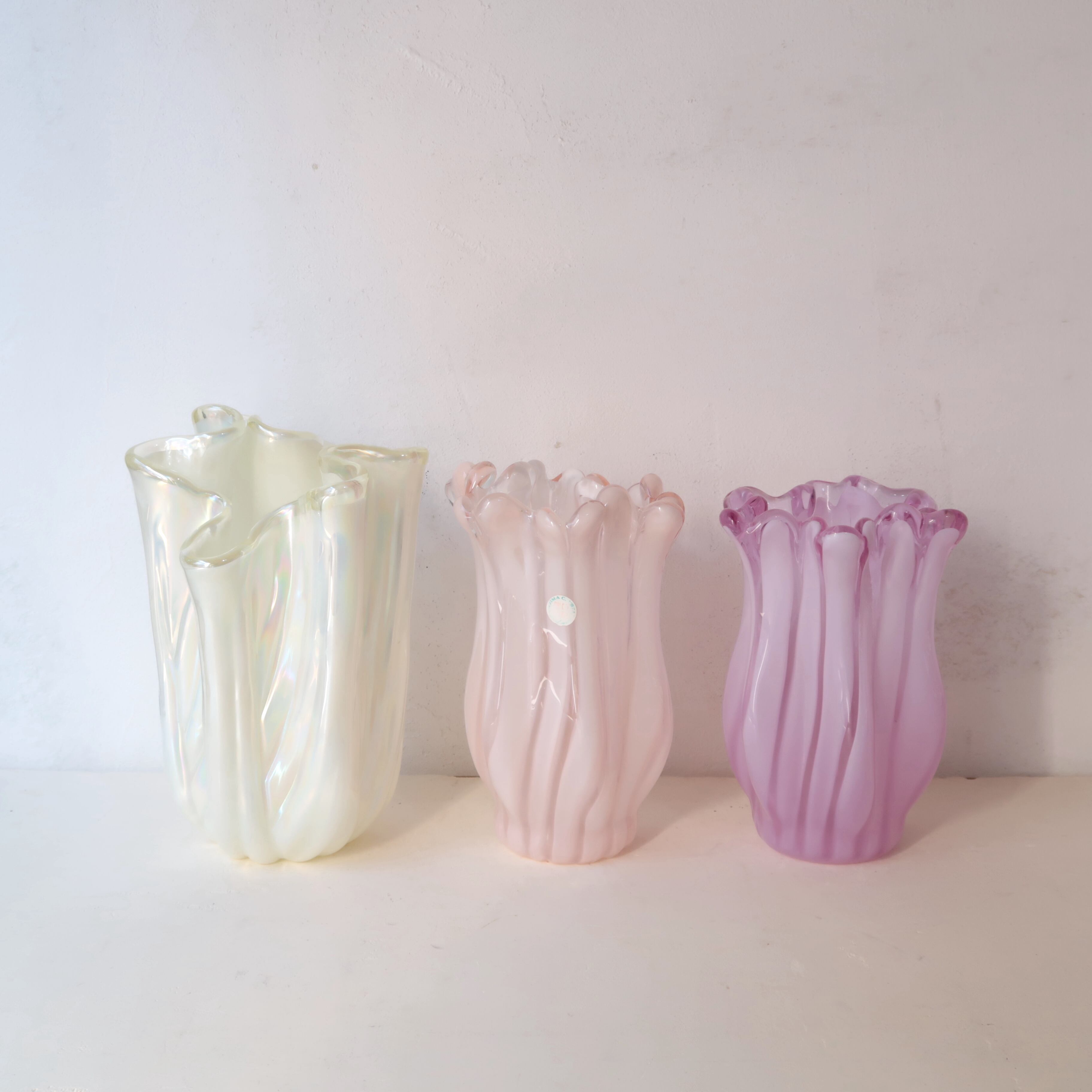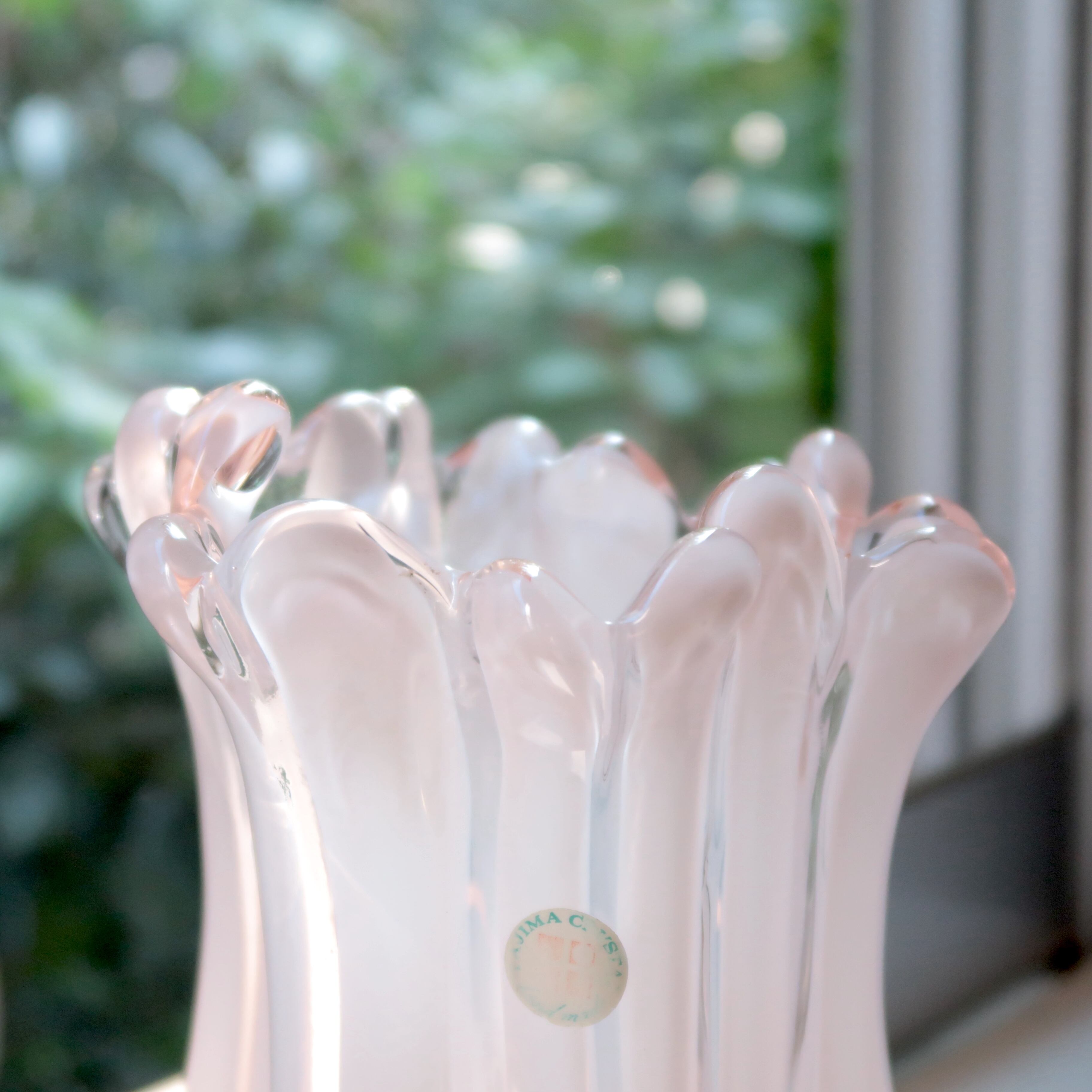 つやんとした春色のベビーピンクに、白のストライプの入ったガラスの花瓶。口はひらひらとしていて、愛らしいフォルム。