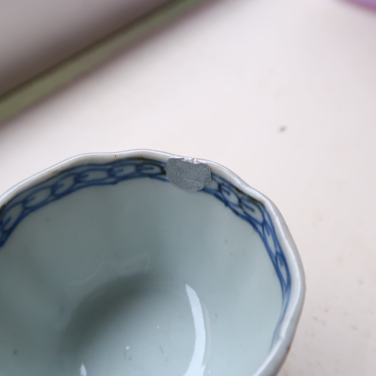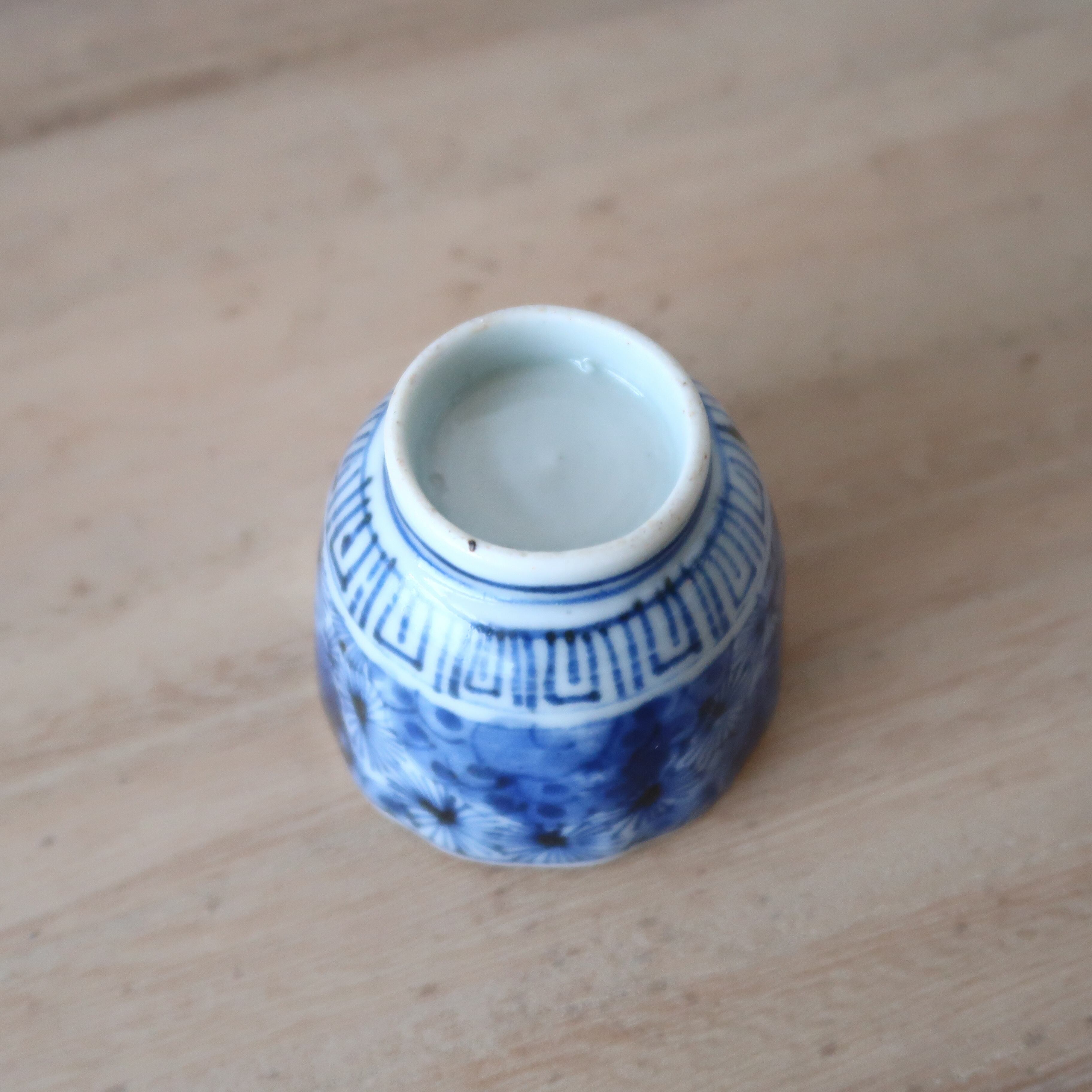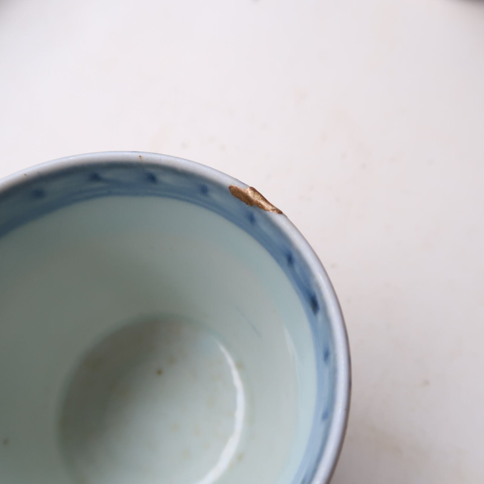 ぐい呑みのようなちいさなサイズ。ふちには数珠のような文様、側面にはお花。ちょっと大きめな銀継ぎ。江戸後期のものです。