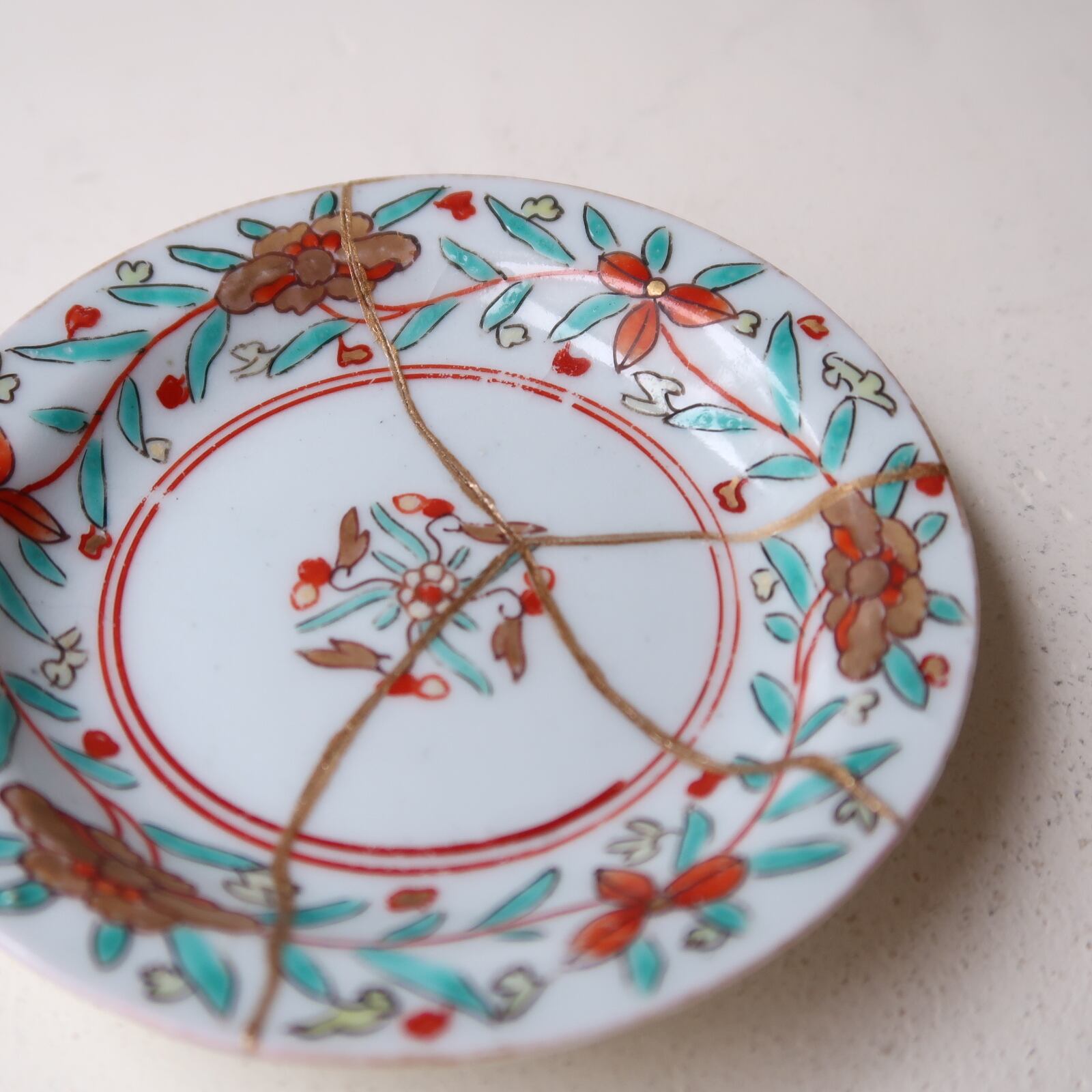輪をつくるように踊るような草花。エメラルドグリーンの葉、赤と金の花びら。に合わせて、割れた部分には金継ぎしました。