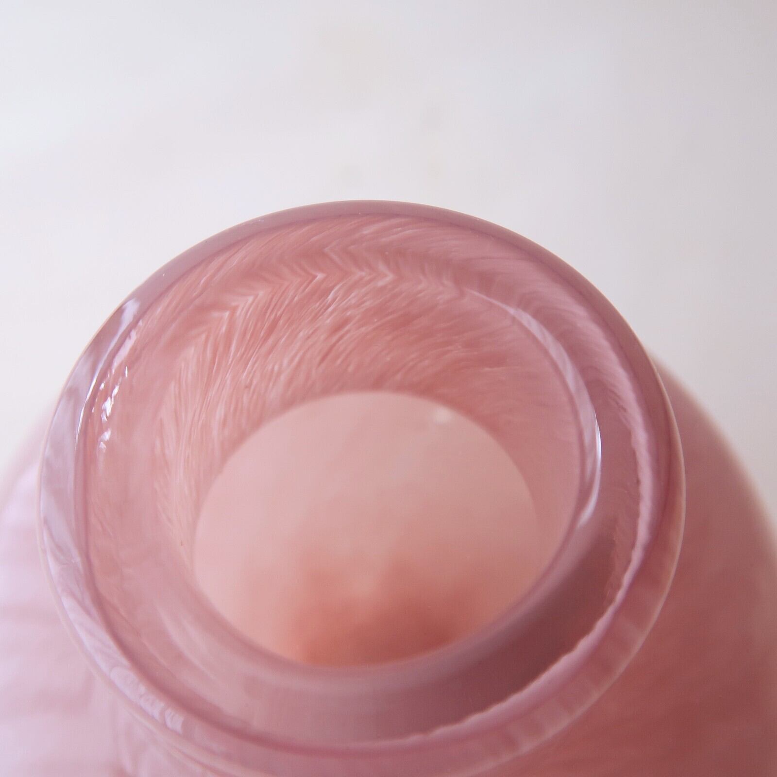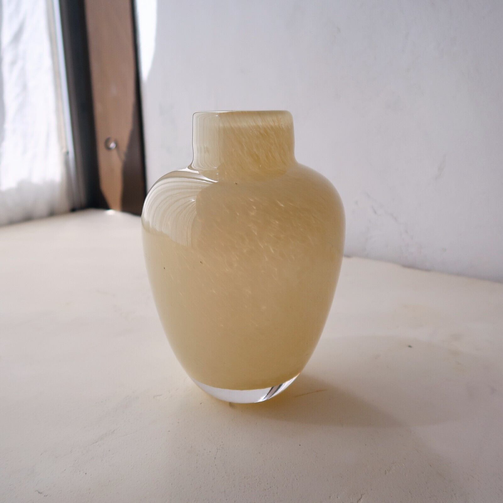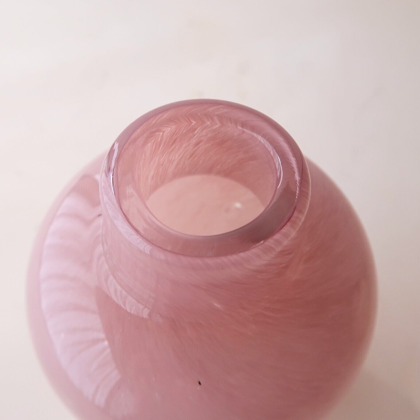 毛並みのように、ちいさな線が流れるような模様のガラスの花瓶。コロンとした壺型のフォルムが可愛い。短く切ったお花を2、3輪生けるのにぴったりです。