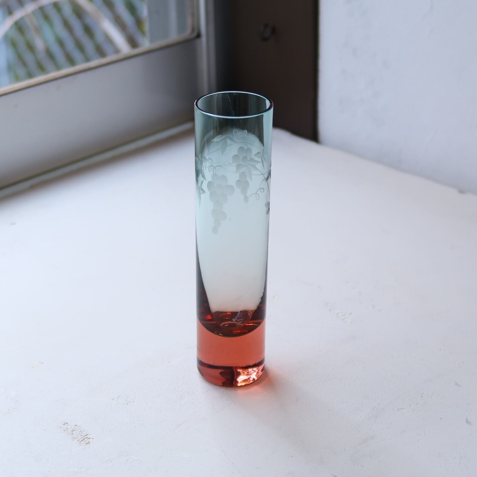 日が暮れて夜になっていくような、やさしい色合いの花瓶。表面はつるつるとした質感で、透き通るグラデーションが映ります。青い部分には、葡萄の切子。