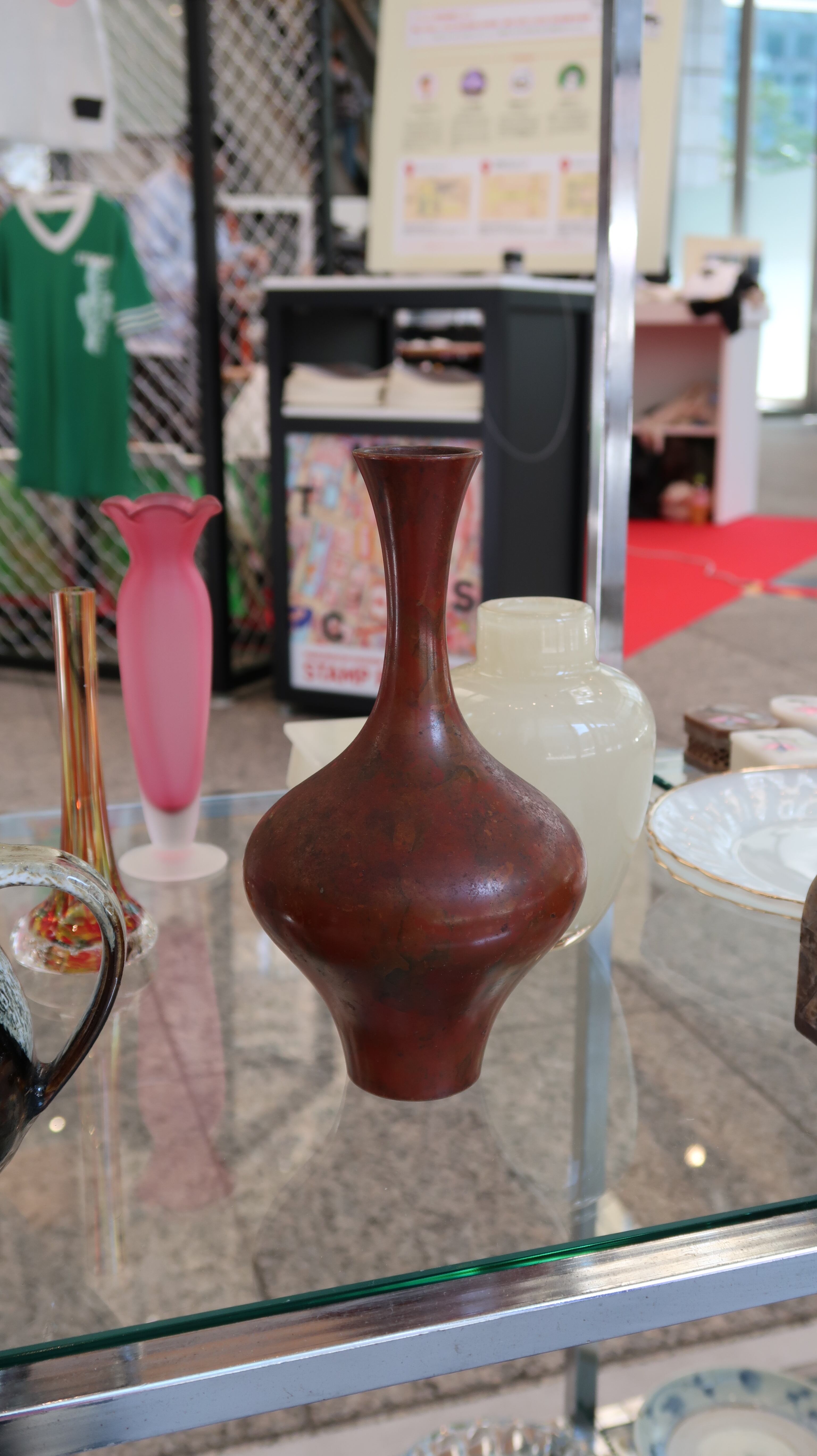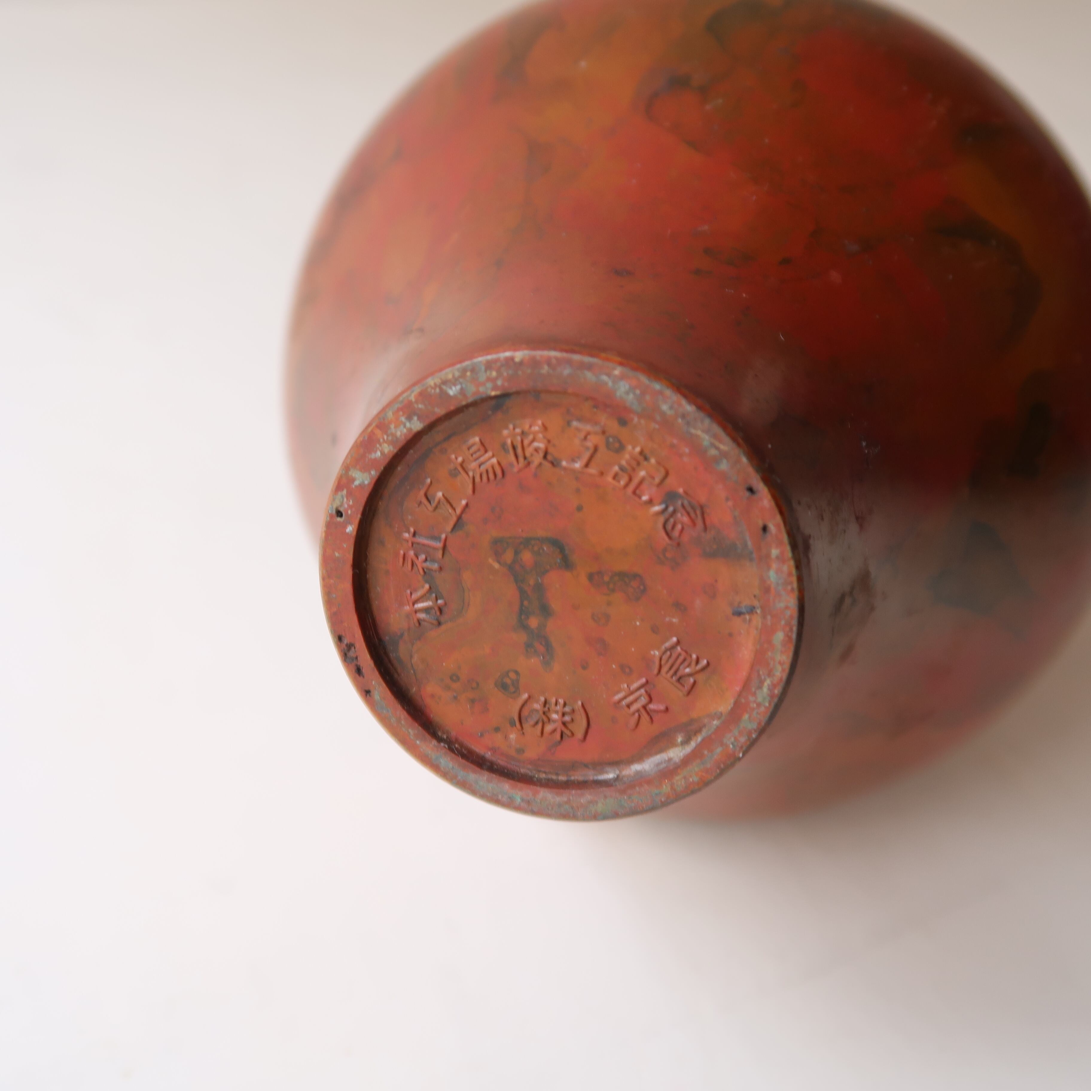 地はマットなテラコッタ色の金属製。ところどころに朱色や茶色の模様が入り、渋い質感。底には「本社工場竣工記念」の文字。記念品として作られた物のようです。