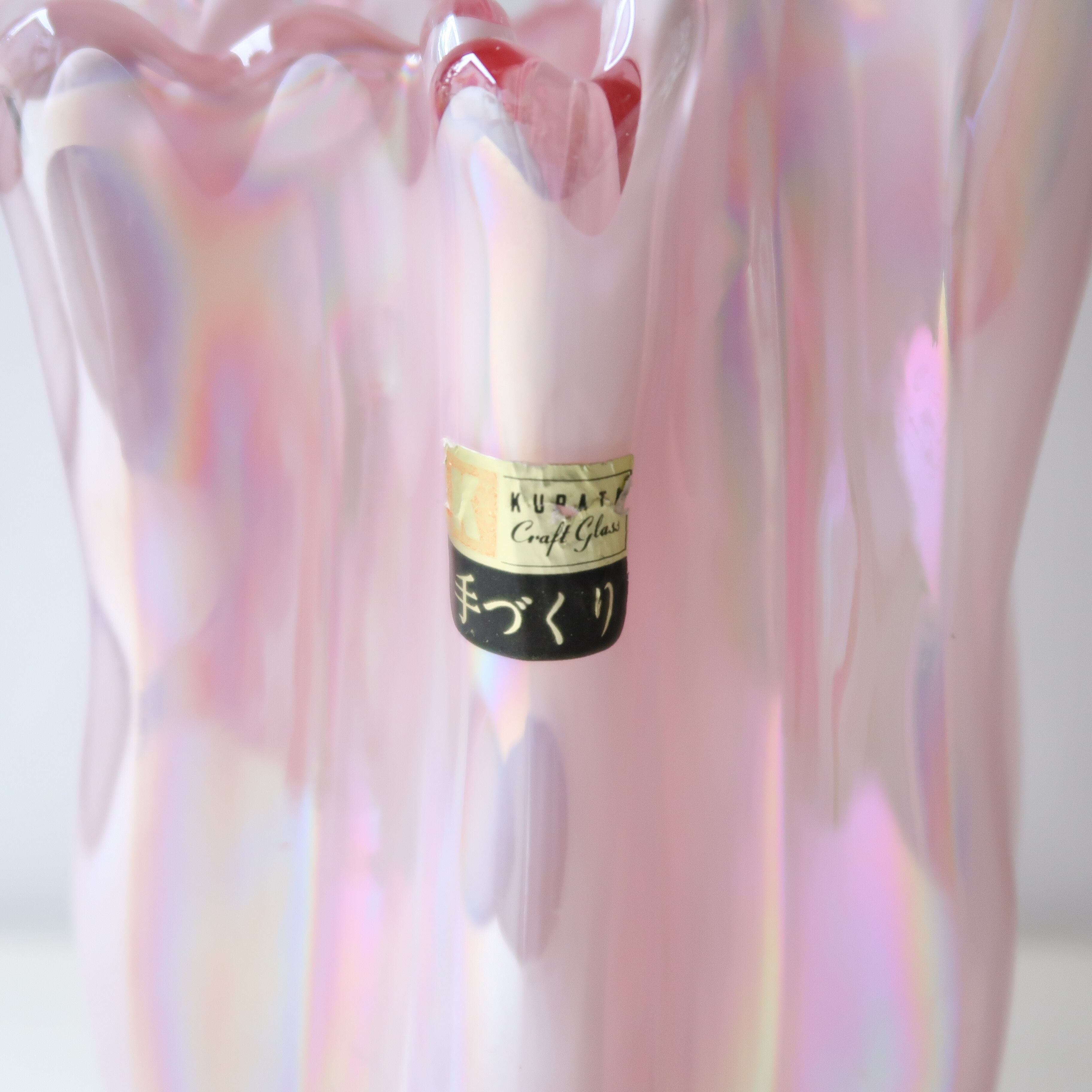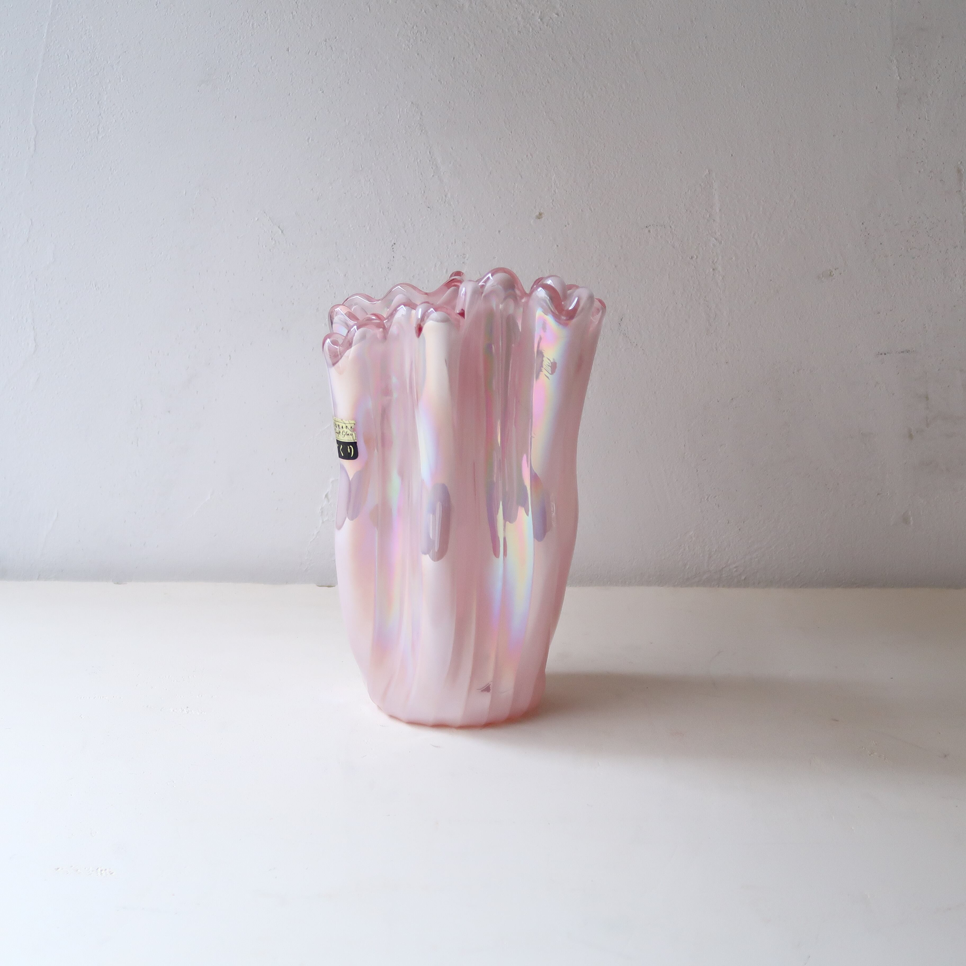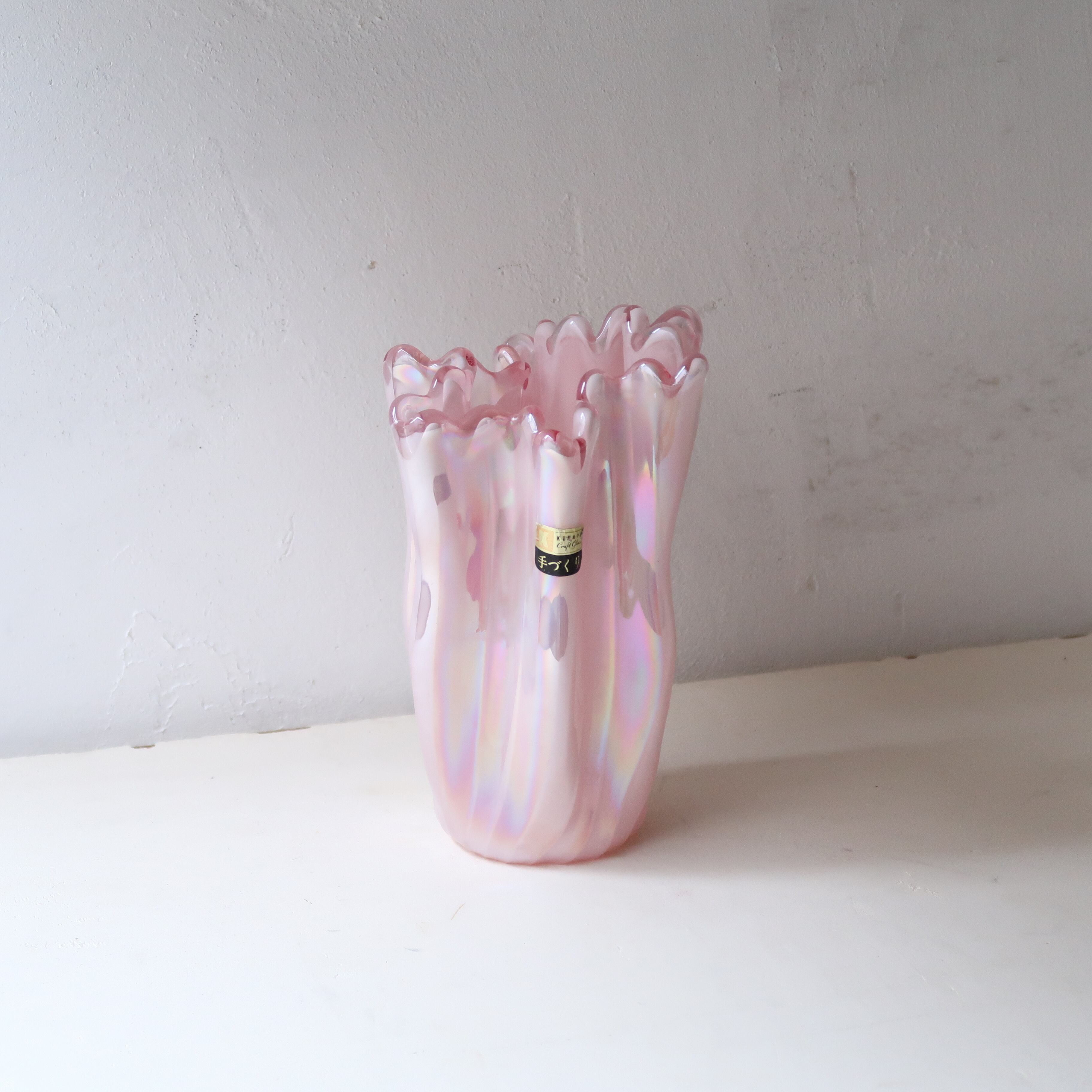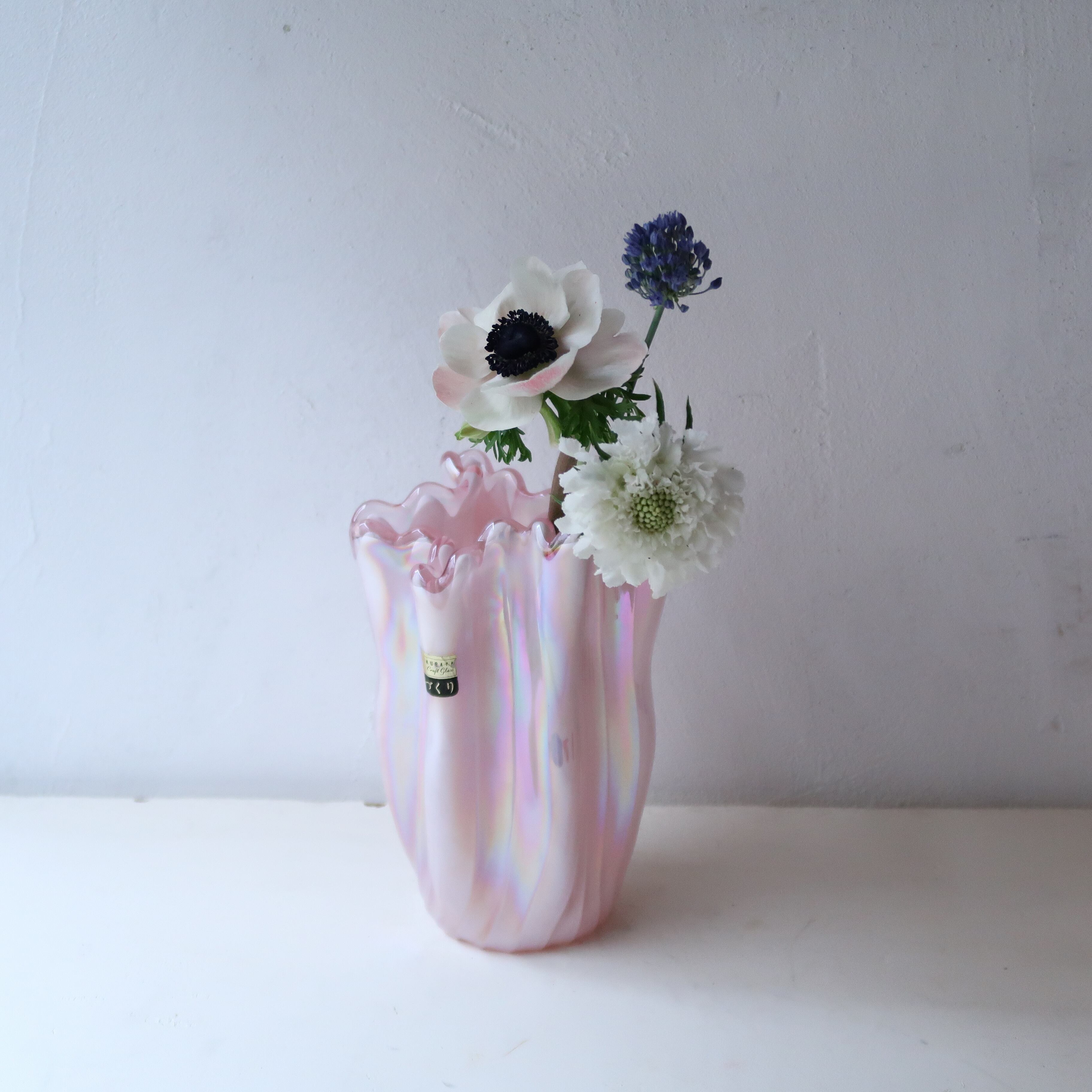 ふちは、ぷっくりピンクとうめいのひらひら。スラッとしていて、かわいいながらもすっきりした印象の花瓶。はがれ等もなく、状態もきれいです。春らしくてうきうきしちゃいますね。