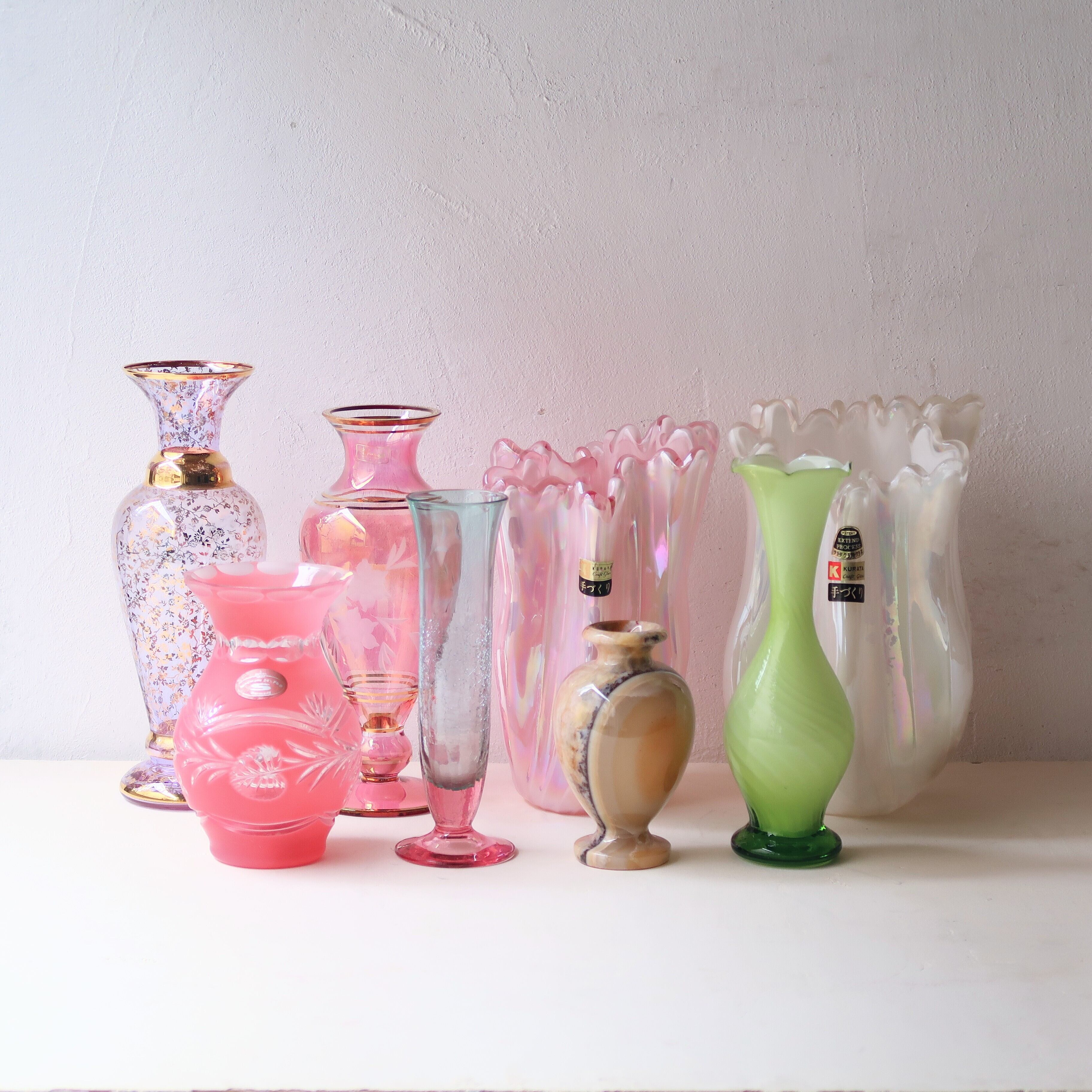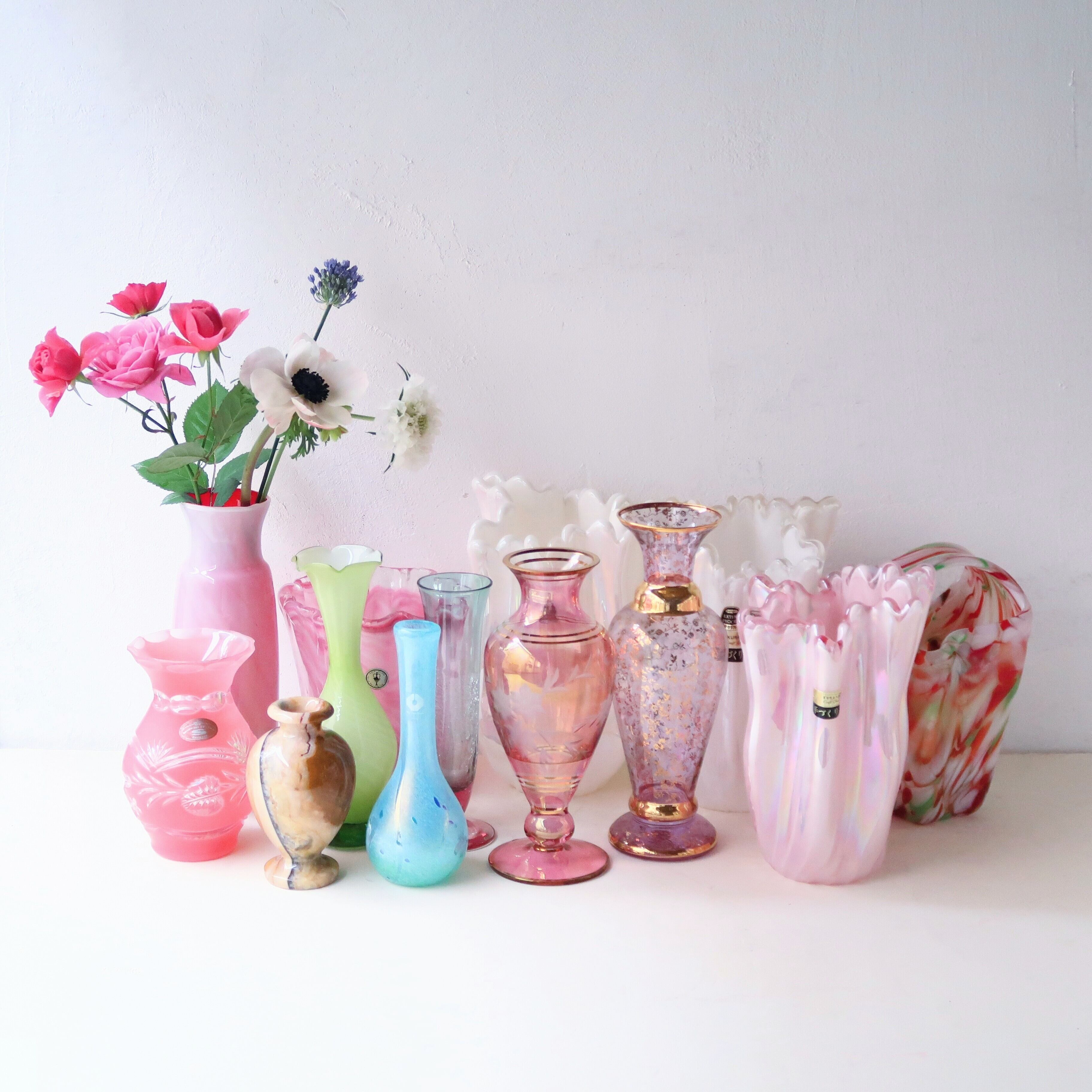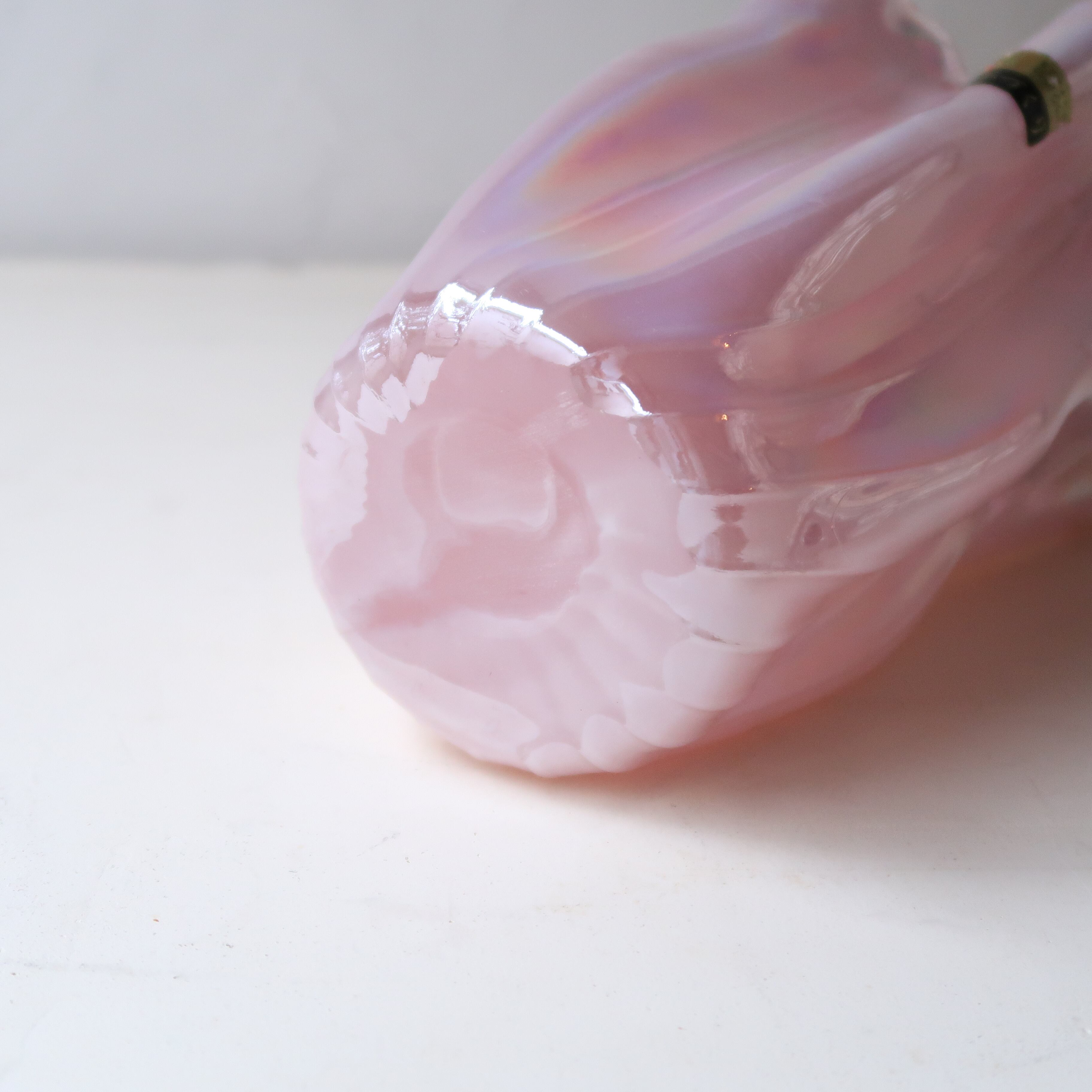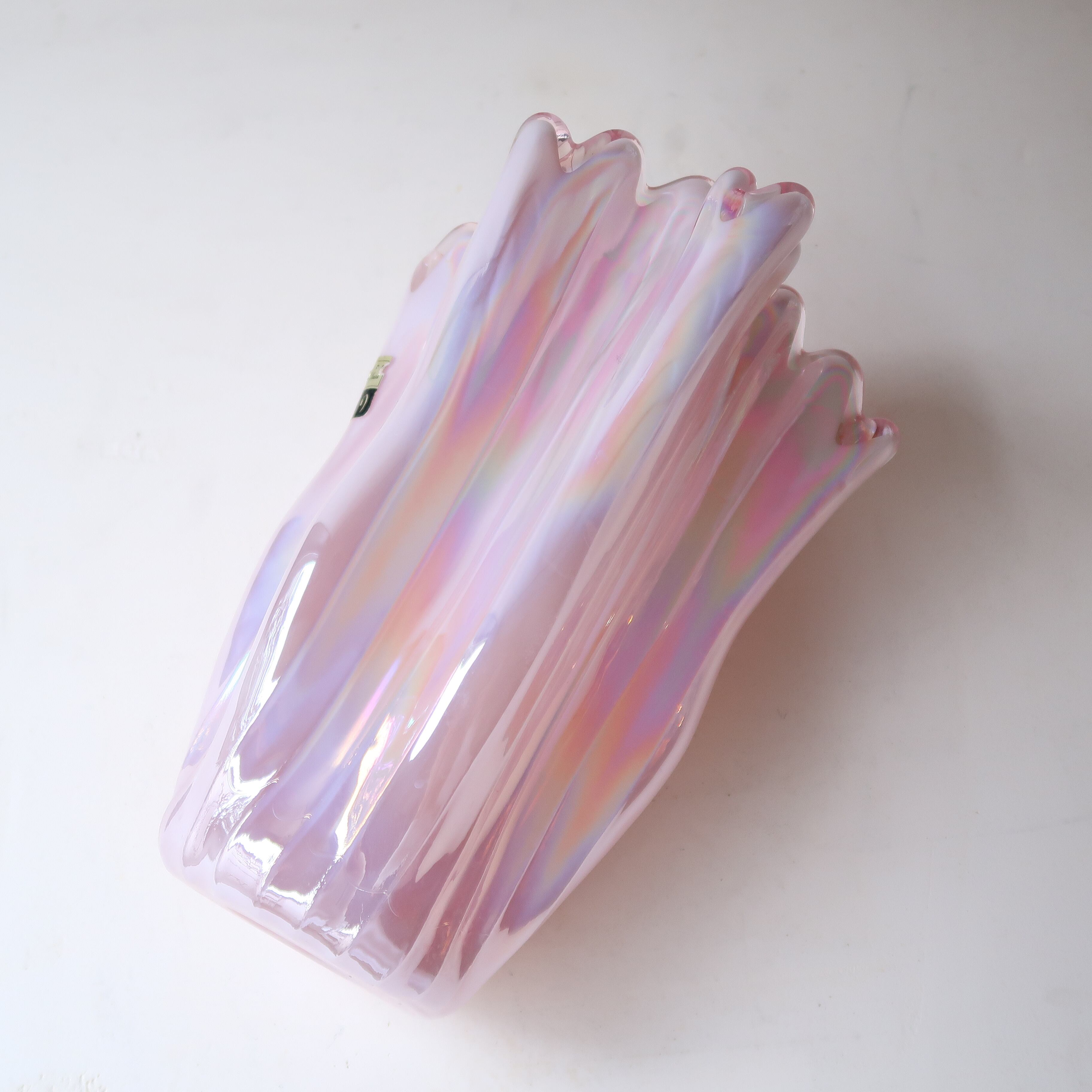 ふちは、ぷっくりピンクとうめいのひらひら。スラッとしていて、かわいいながらもすっきりした印象の花瓶。はがれ等もなく、状態もきれいです。春らしくてうきうきしちゃいますね。