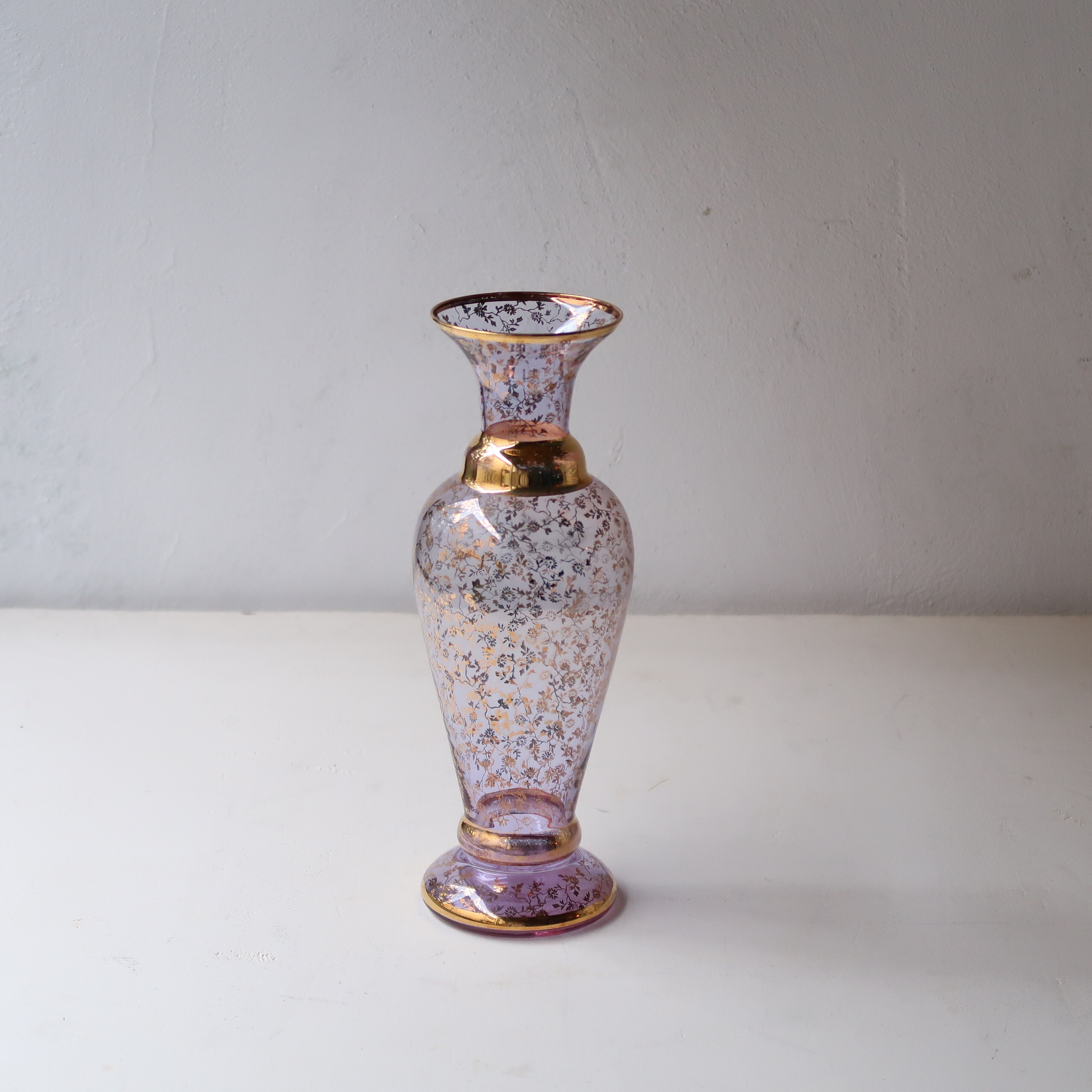 ちいさな花柄の金彩が入ったガラスの花瓶。よーく見ると全体に散りばめられていて、経年変化によるかすれ具合も、なんとも愛らしい。そして縁や胴、脚にも帯状の金彩がほどこされています。