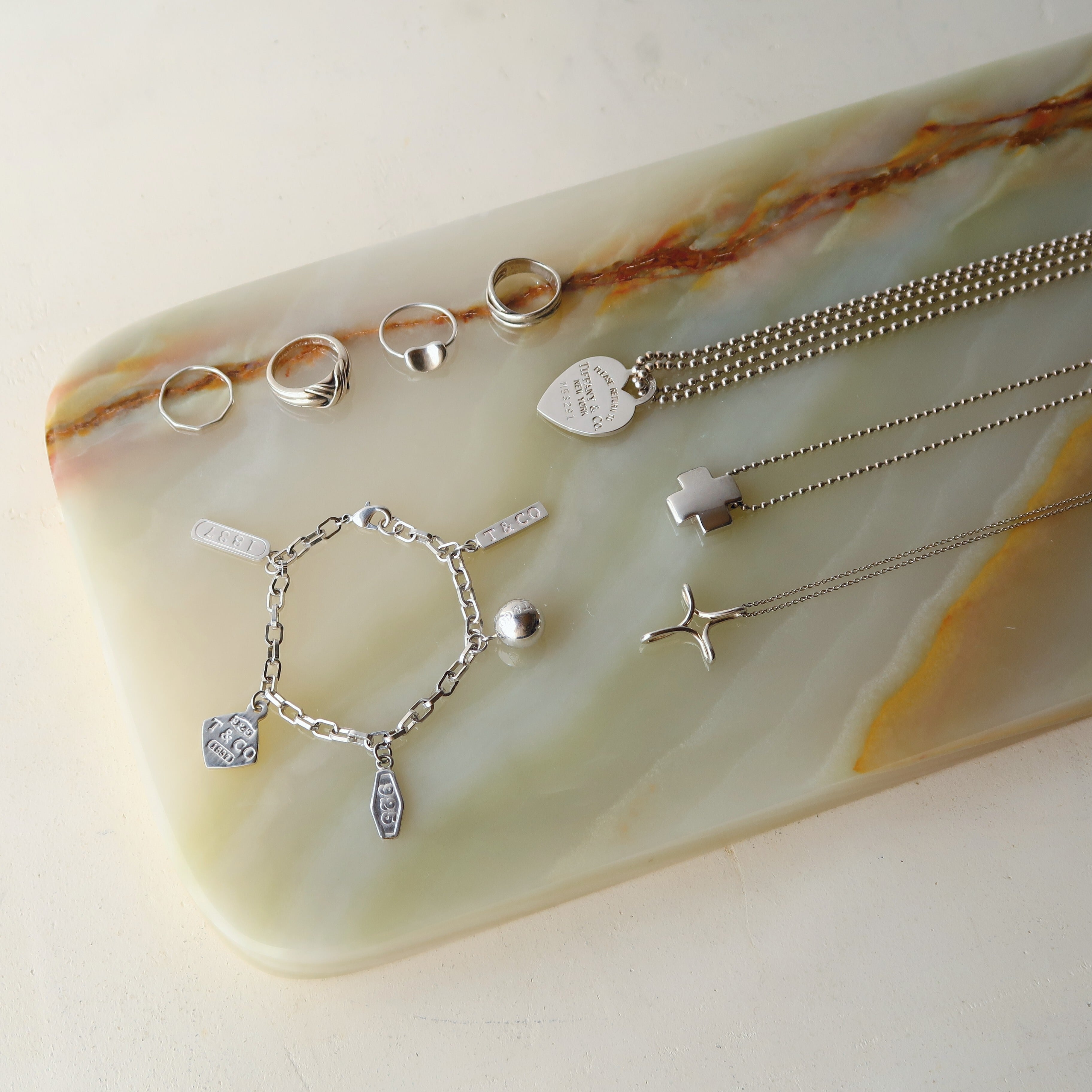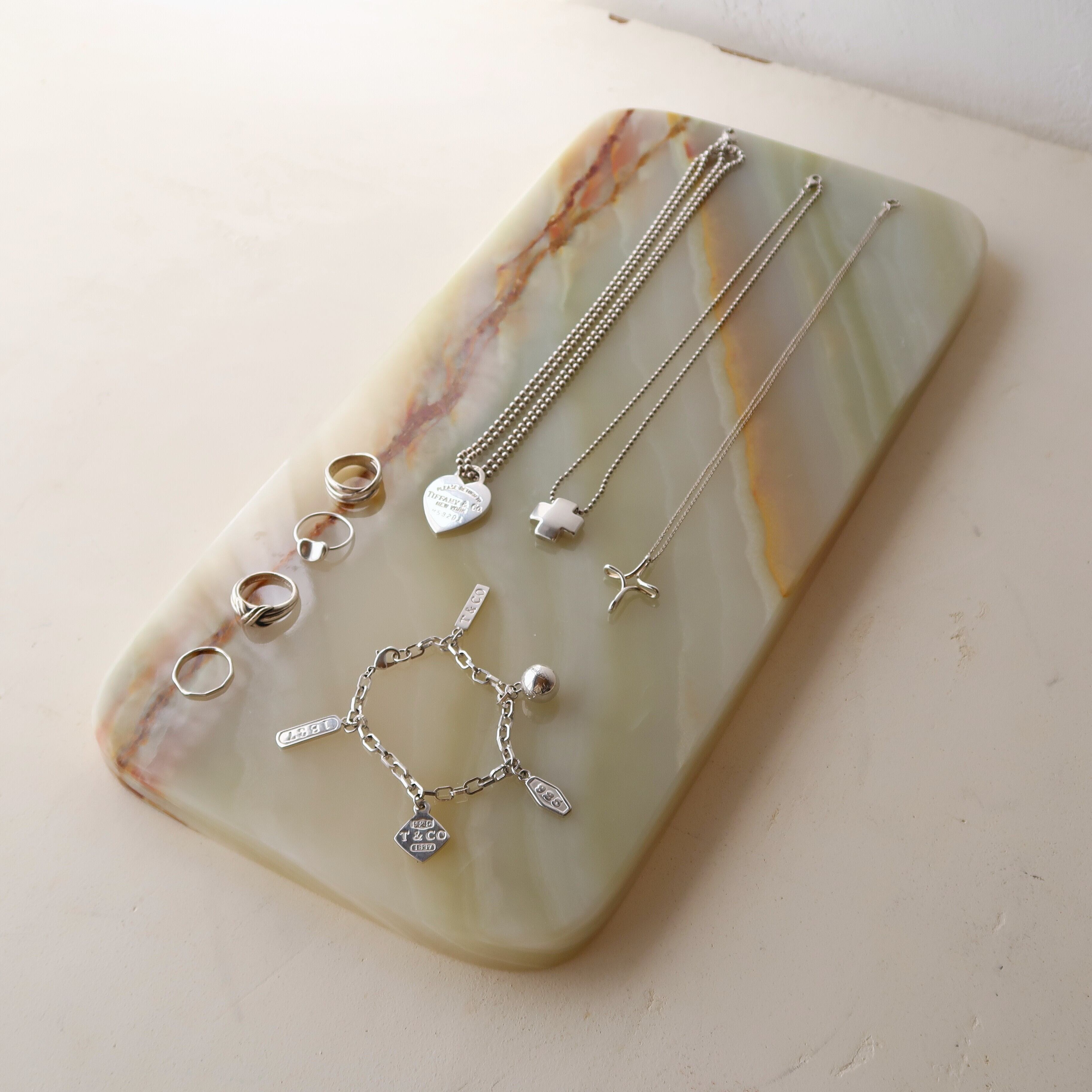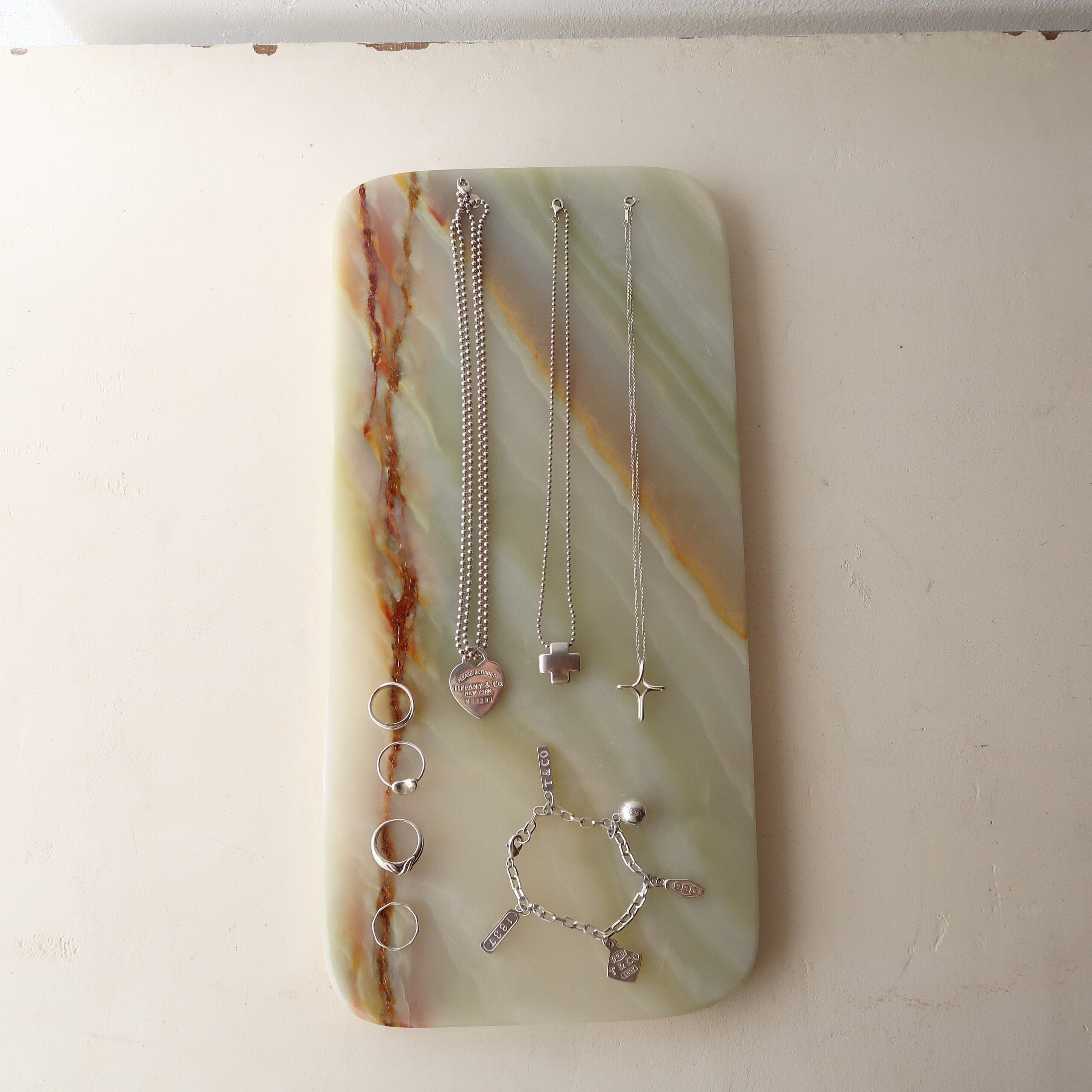 もともとは、灰皿や卓上ライター、タバコケースを置いておくプレートとしてつくられた物。サイズとしては、ペンダントを伸ばして置けるくらいの大きさです。