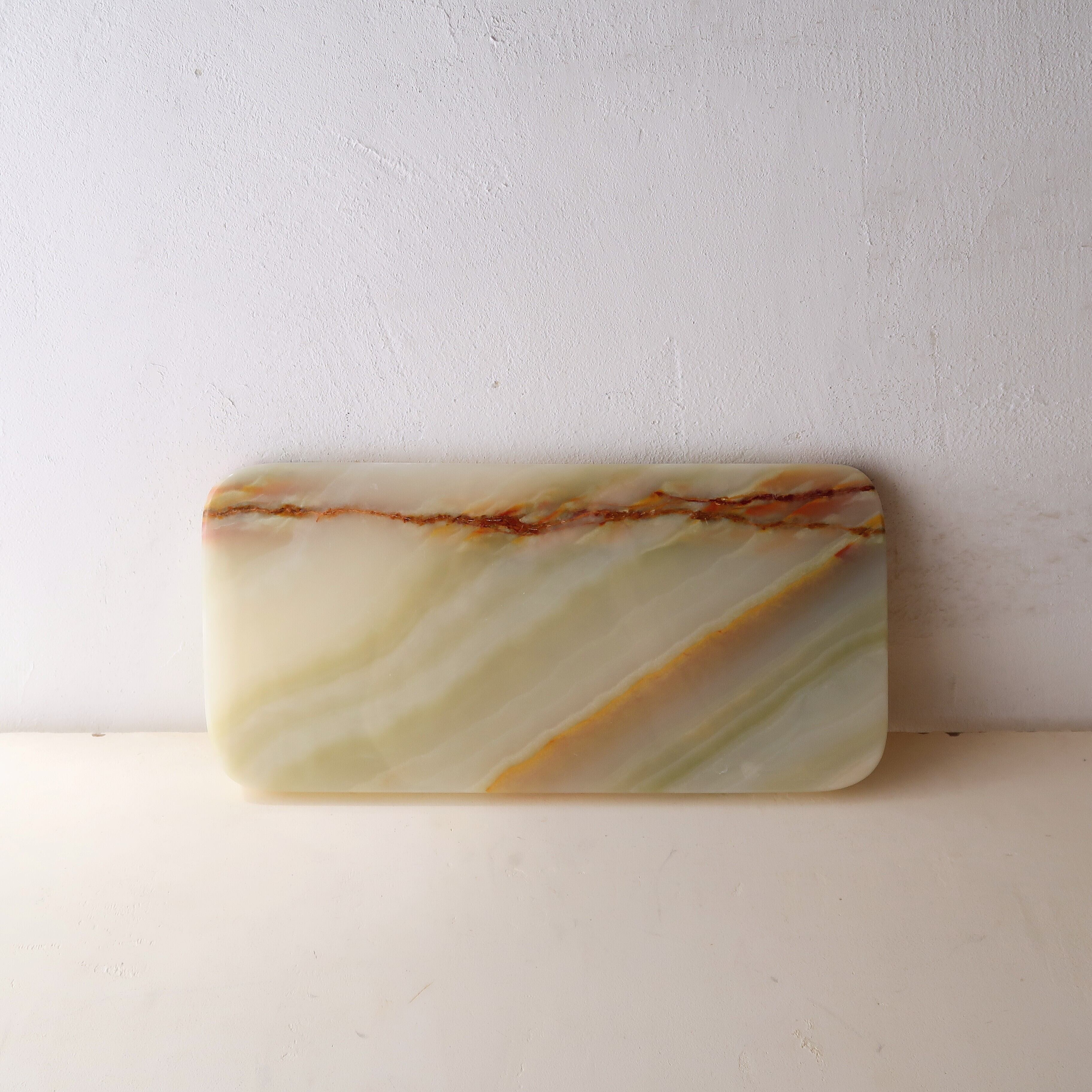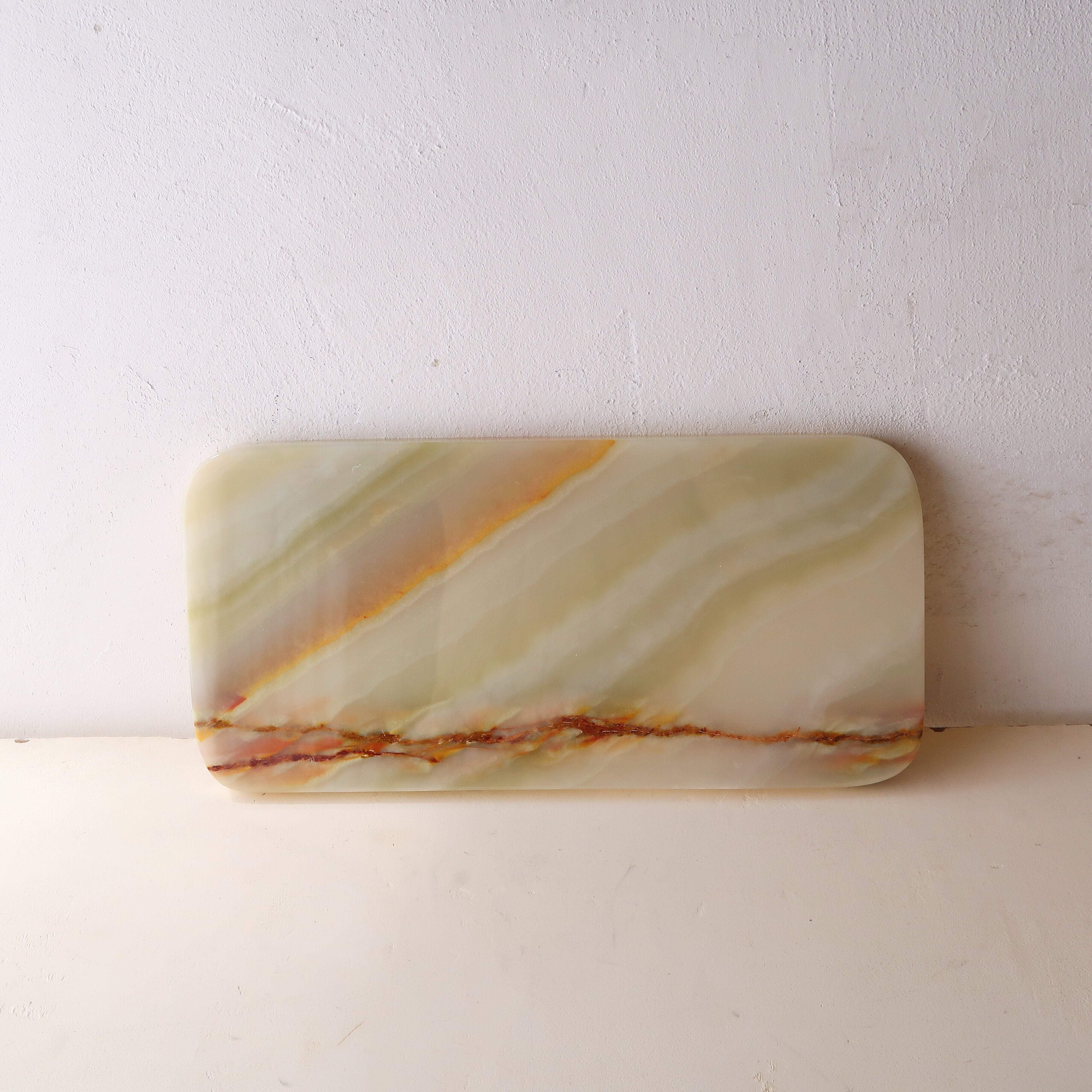 大きなサイズのオニキスのプレート。グリーンベースに、まっすぐブラウンのライン、ななめにホワイトとイエローの縞模様。表面はツヤがあります。