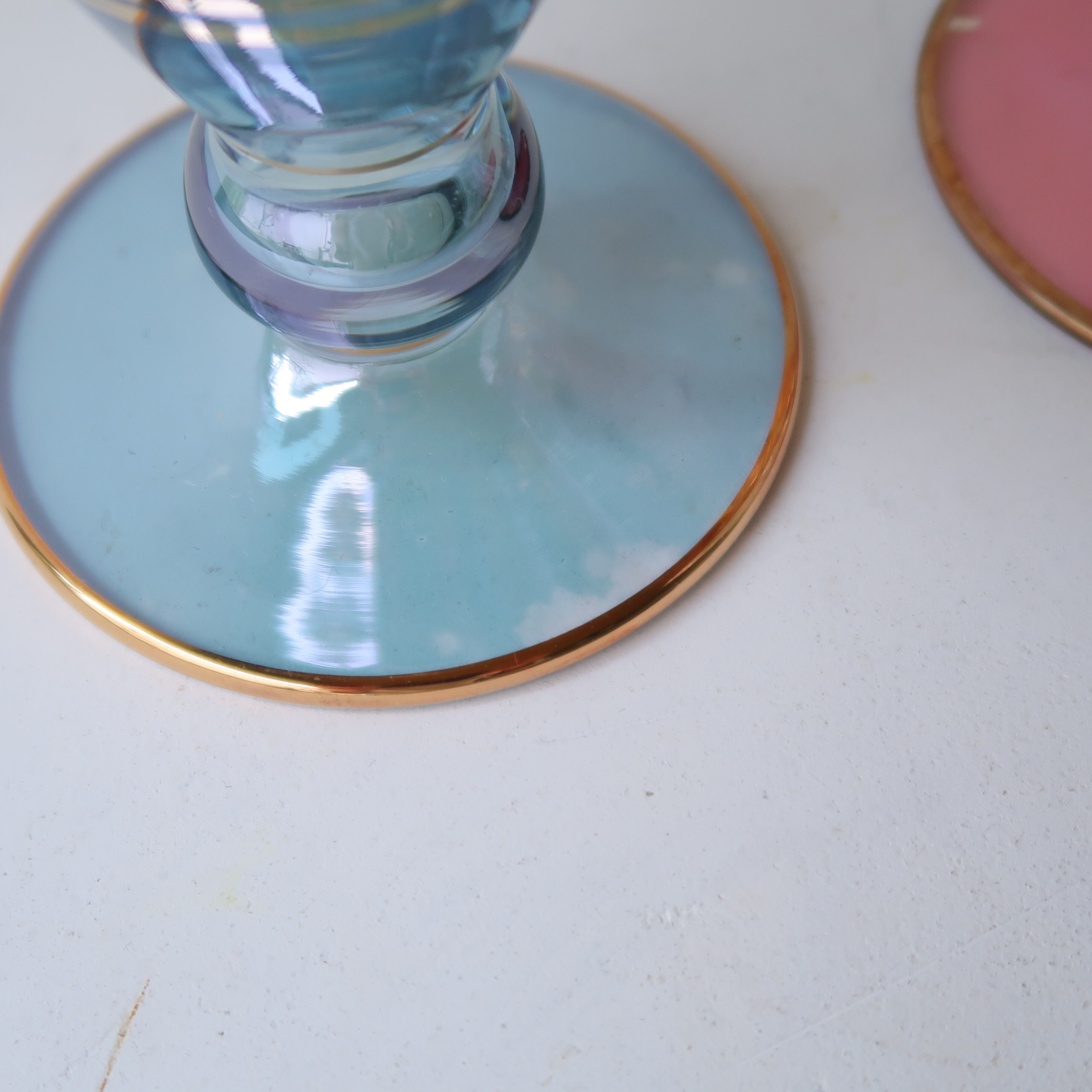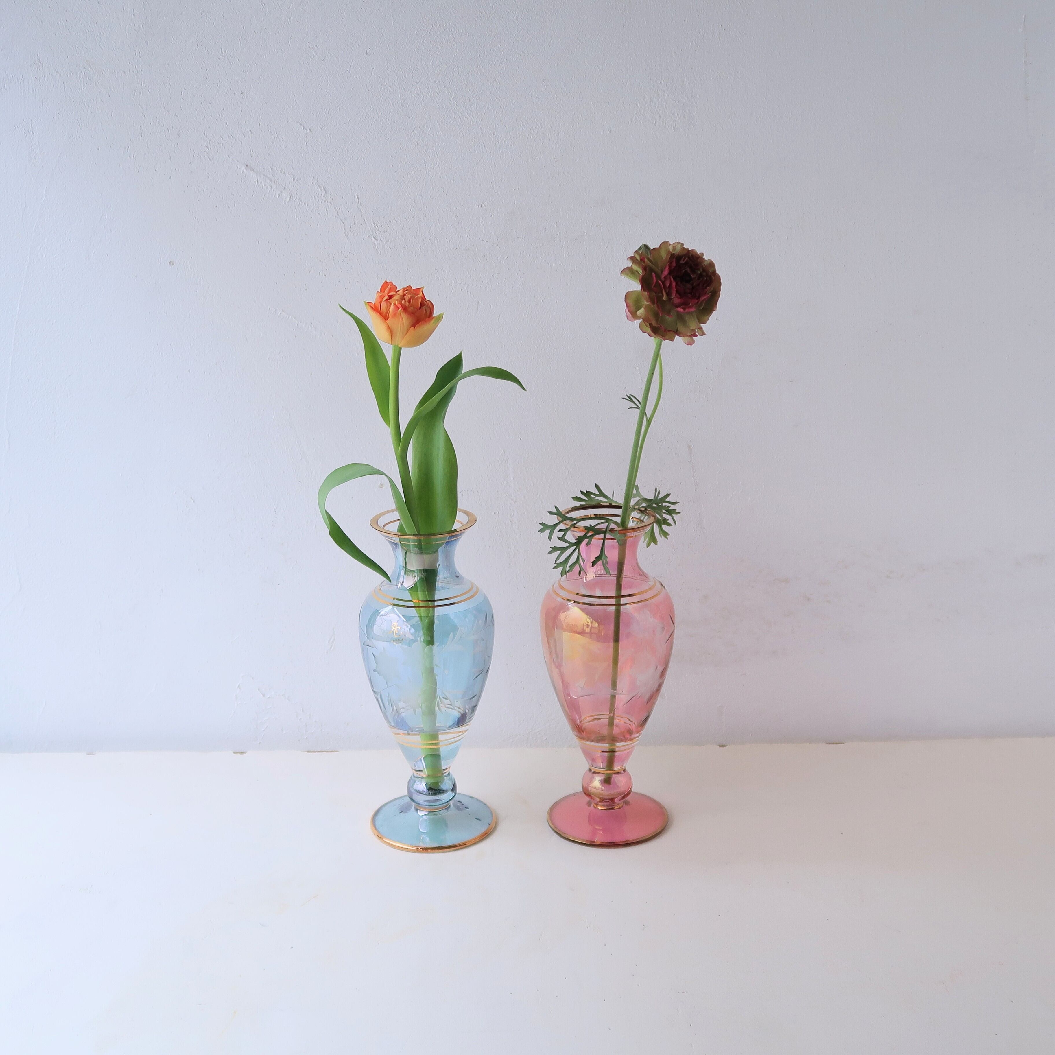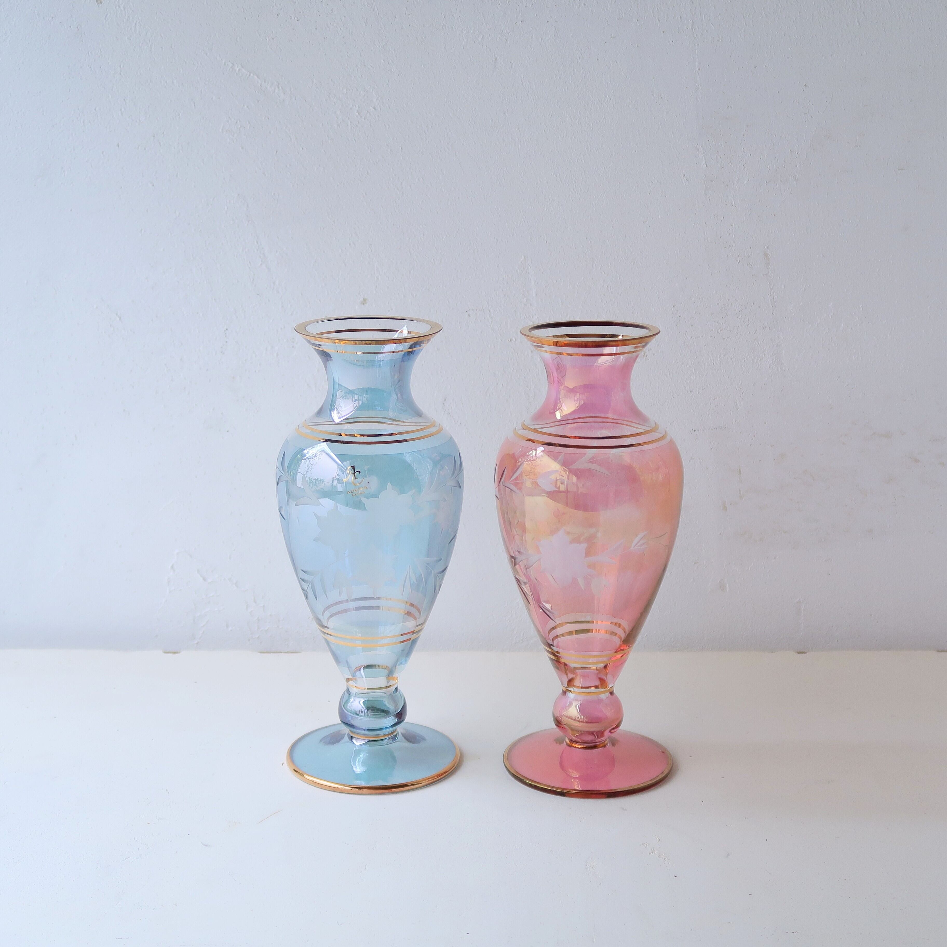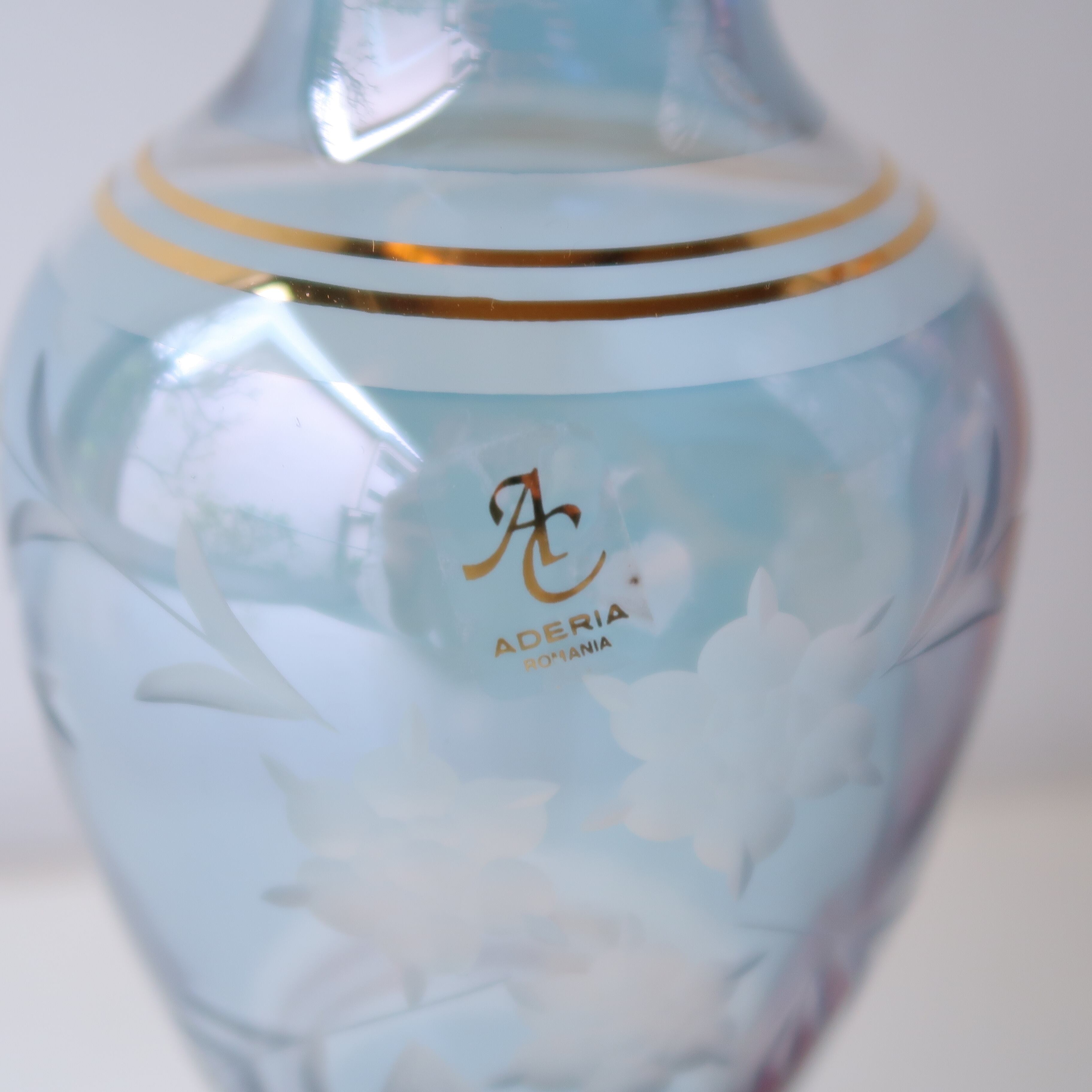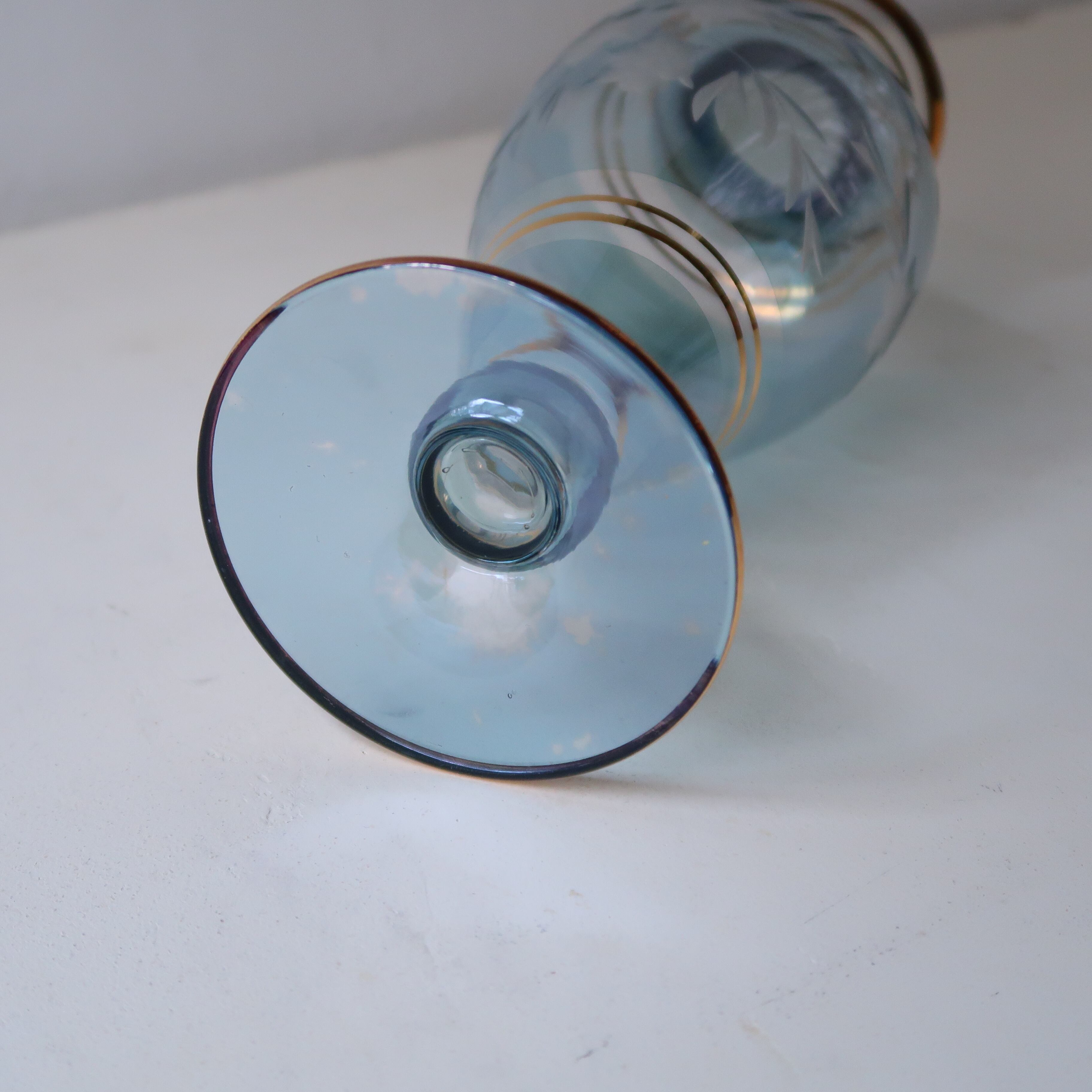 全体的にはスカイブルー。透明感があるので、向こう側の切子も重なる薄いガラスも魅力的です。切子の模様は六弁花と枝葉でアイコニック。きれいな水色に金が映える、上品な花瓶です。