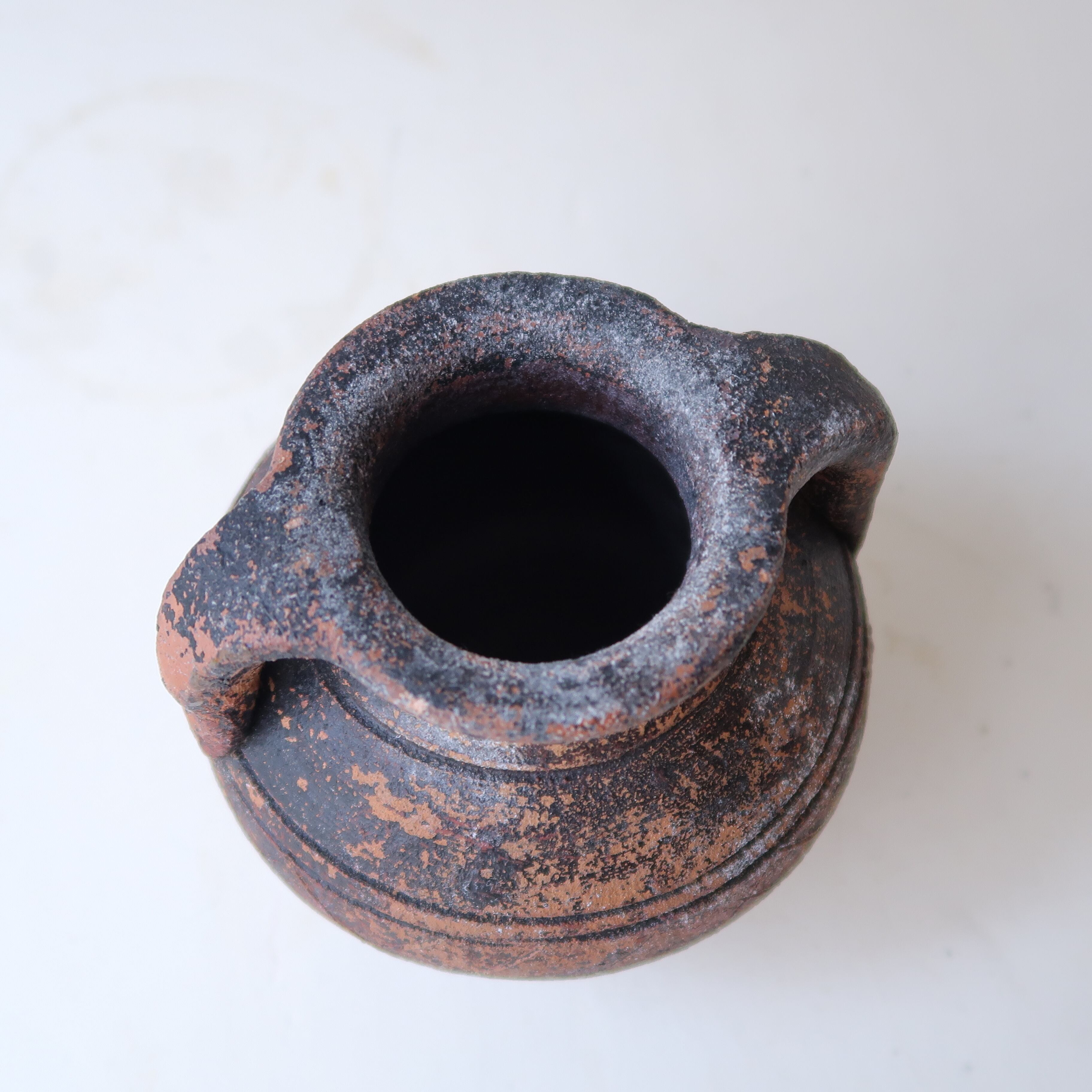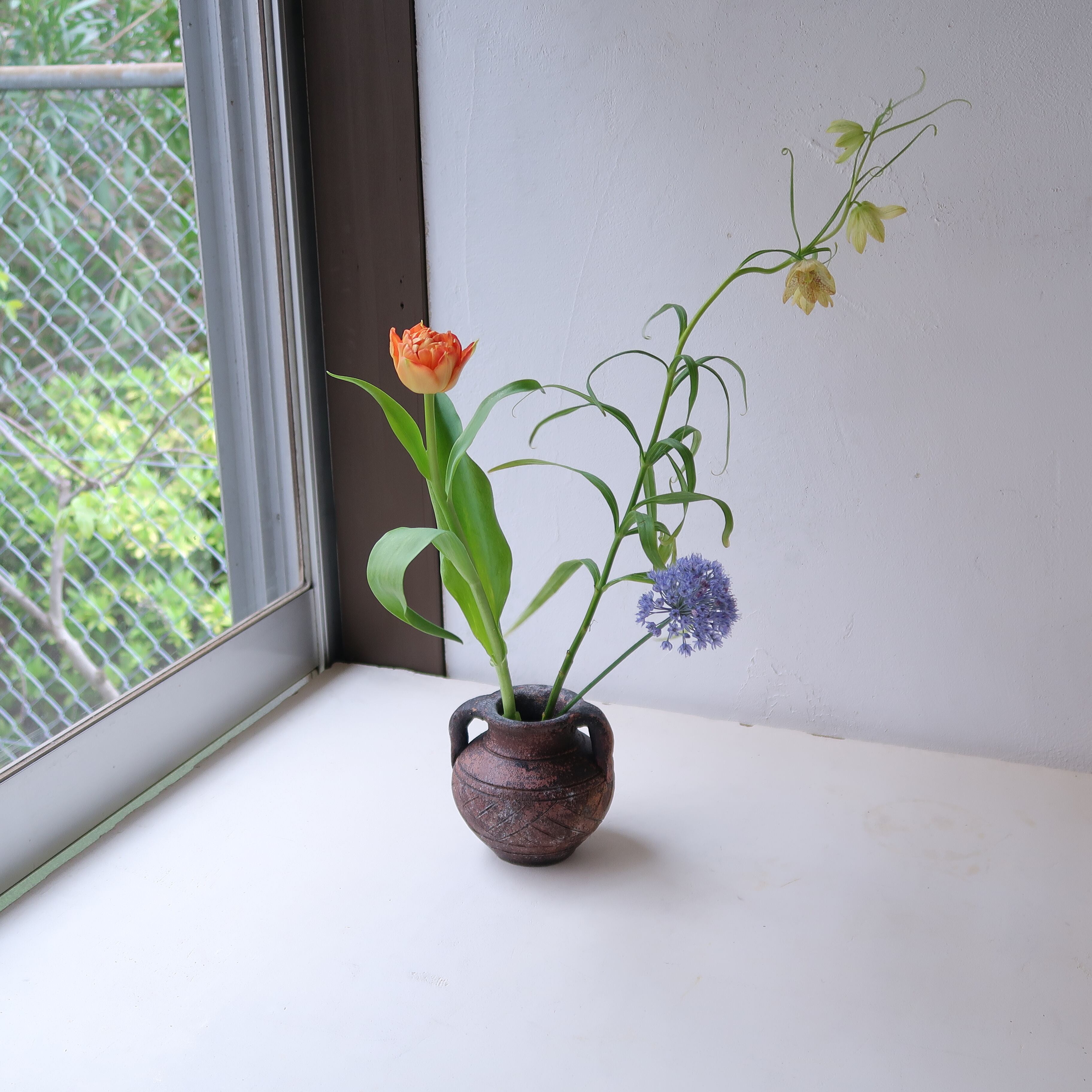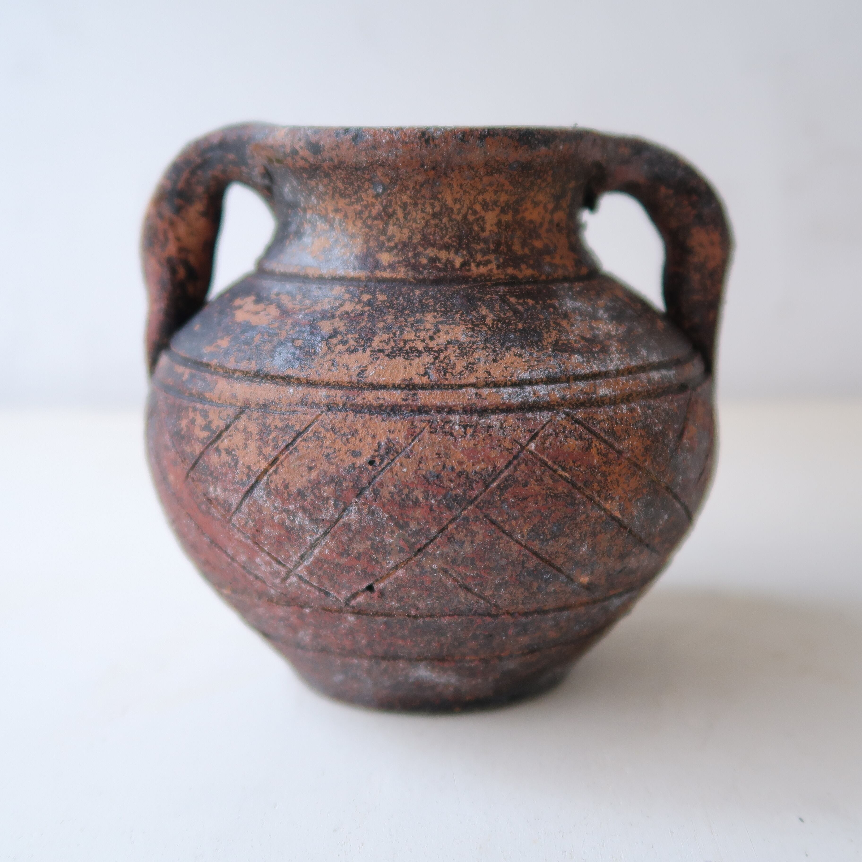 両耳の付いた、ちいさな壺のような花瓶。まるっこく、しかしくびれもありよいかたち。格子状の模様もモダンな印象です。