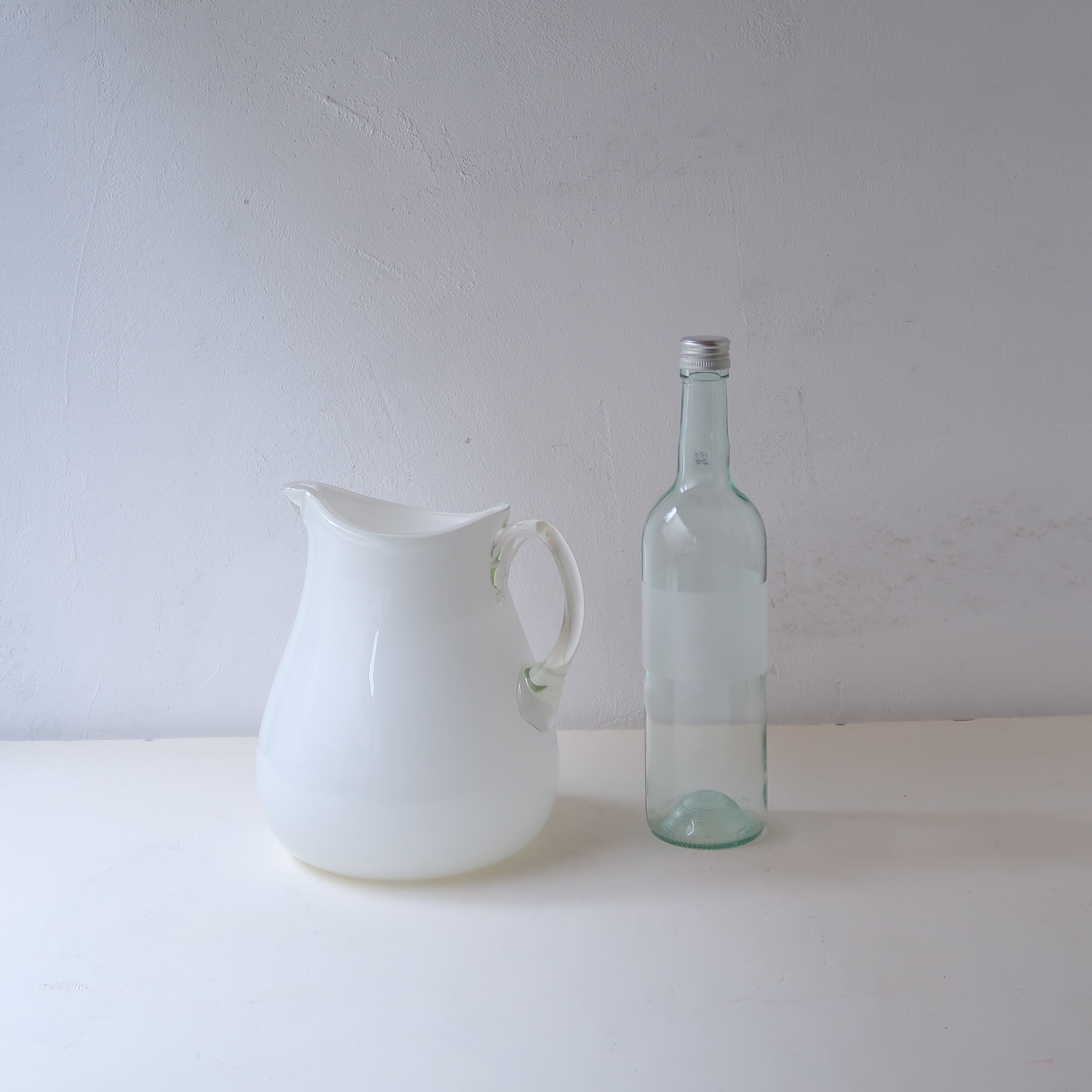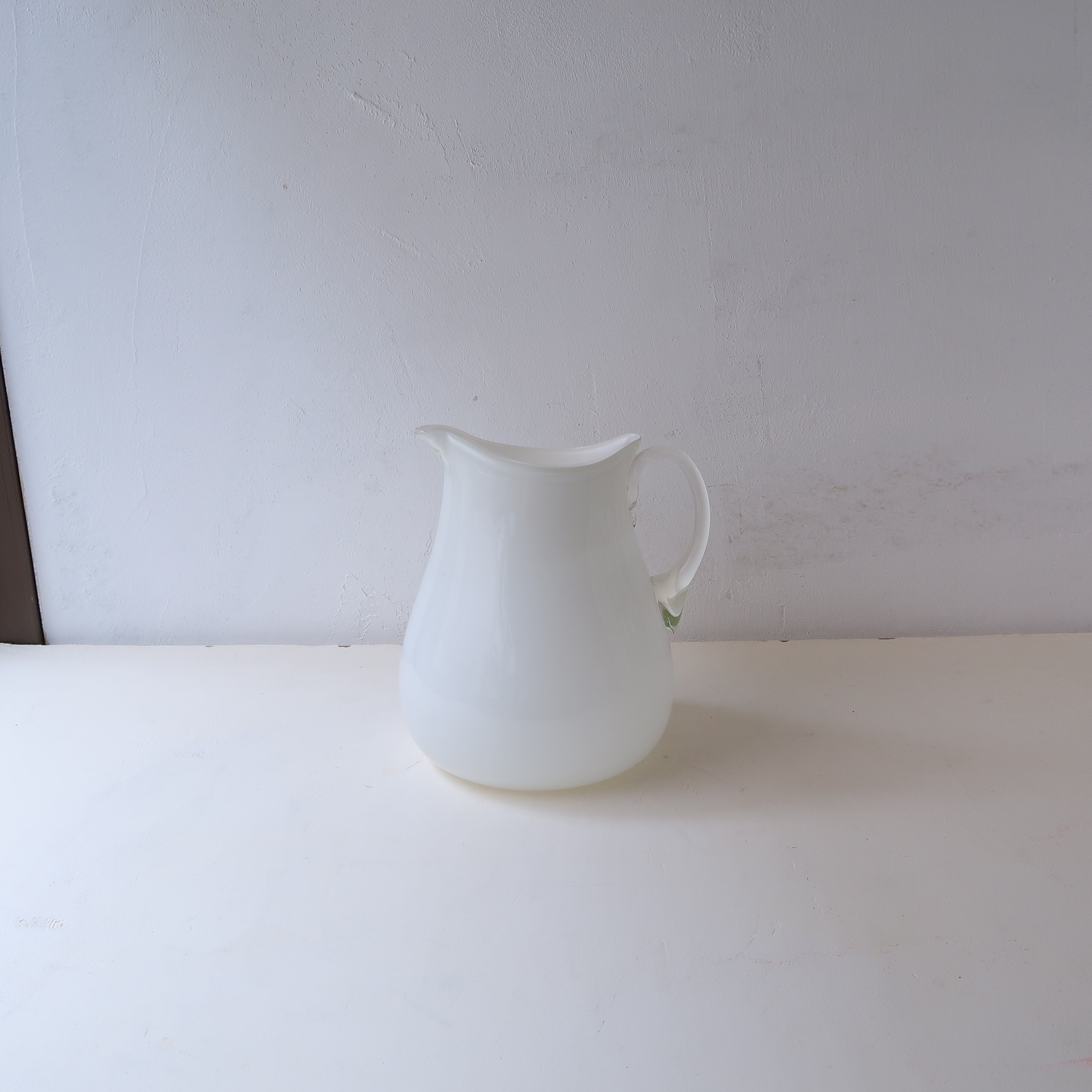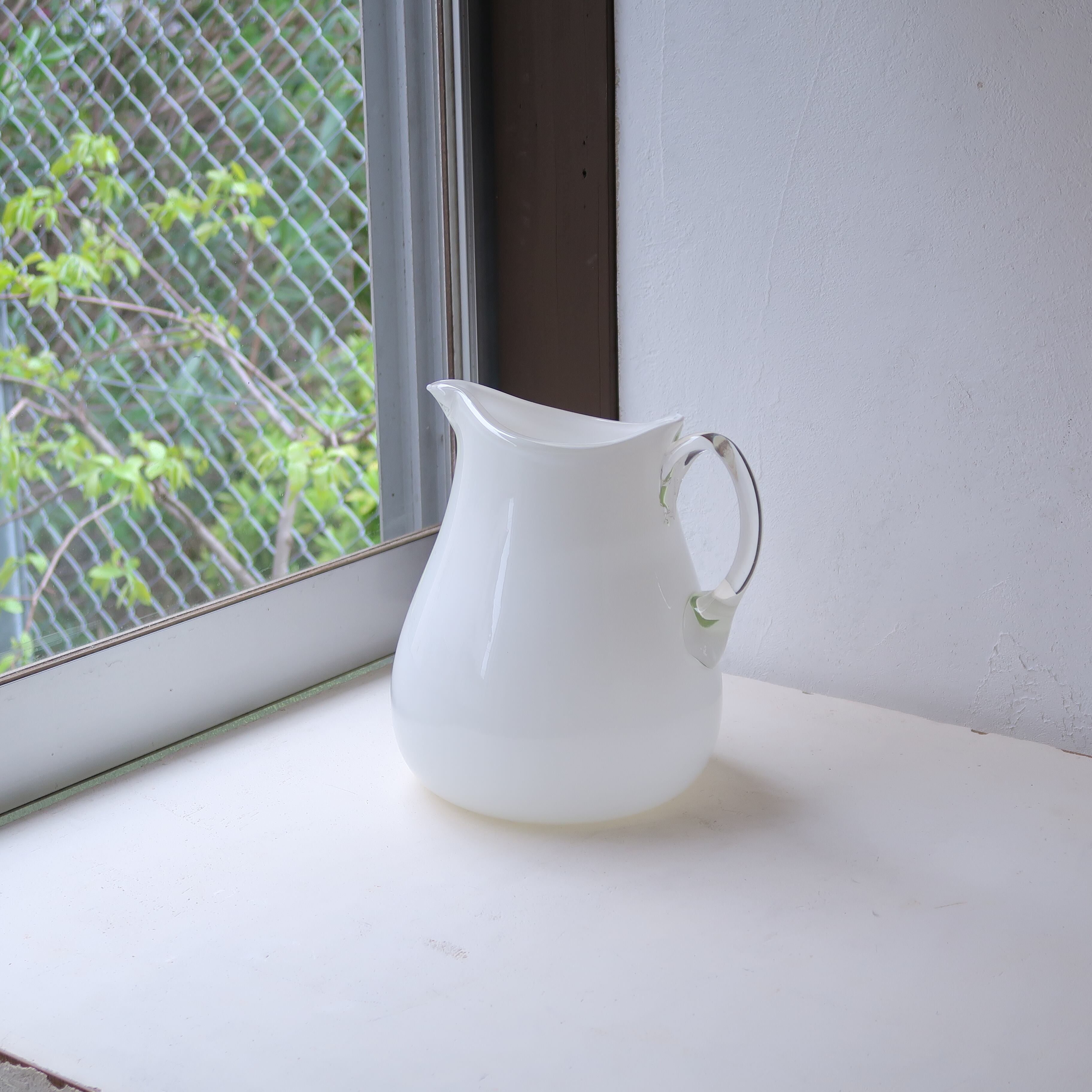 ぽってりとしたフォルムの水差し。内側はホワイト、外側はとうめいなガラスがまとい、取っ手も黄色がかったとうめい。絵柄はなく色だけのシンプル。つるっとぽてっとしたガラス。