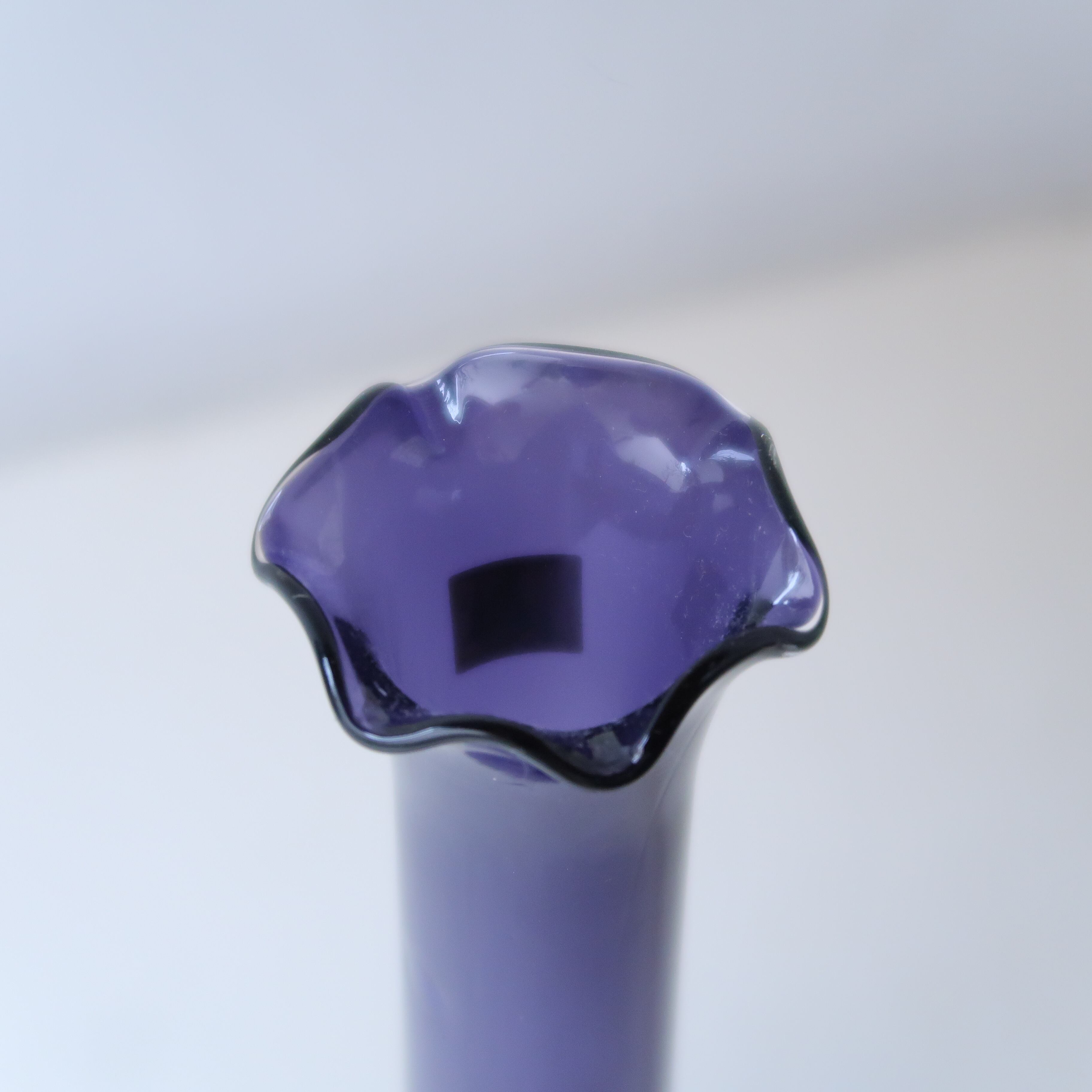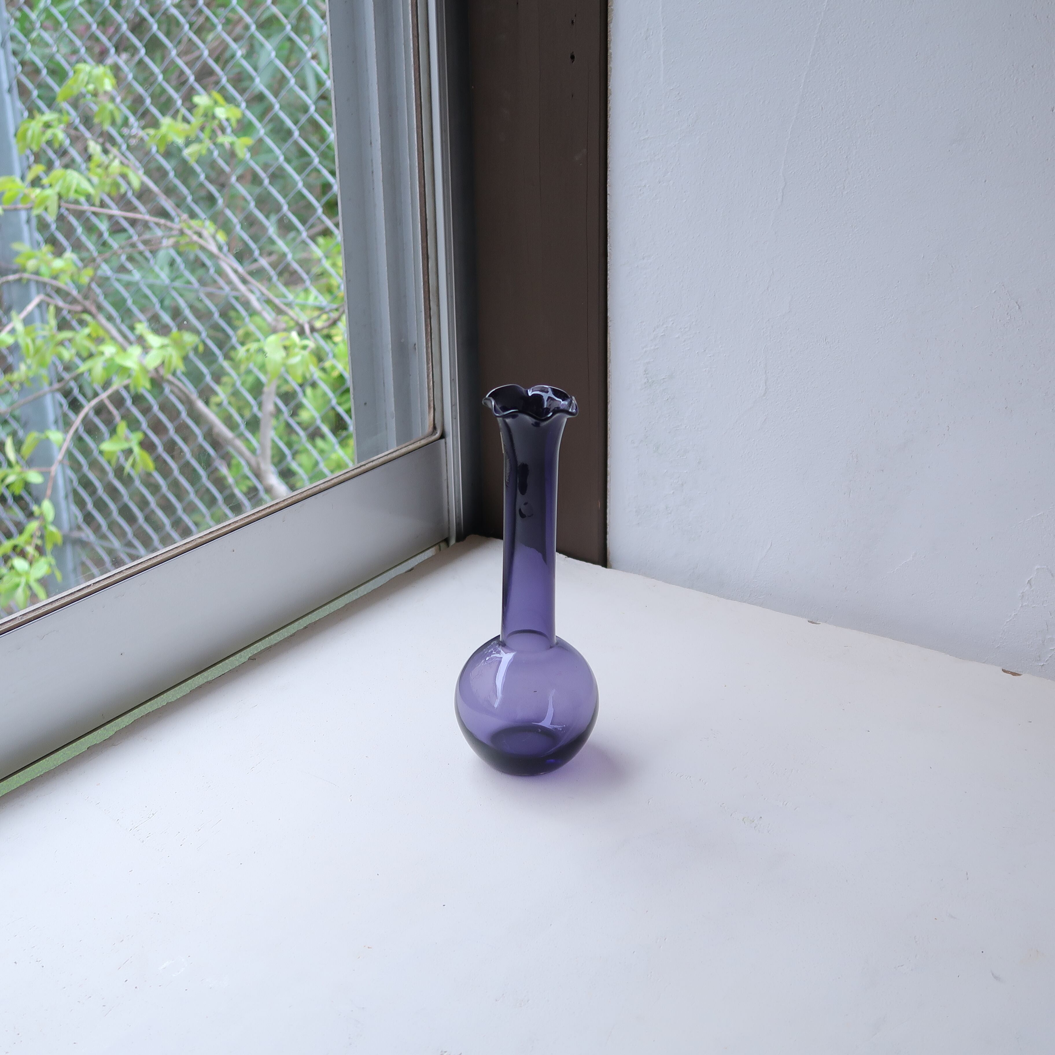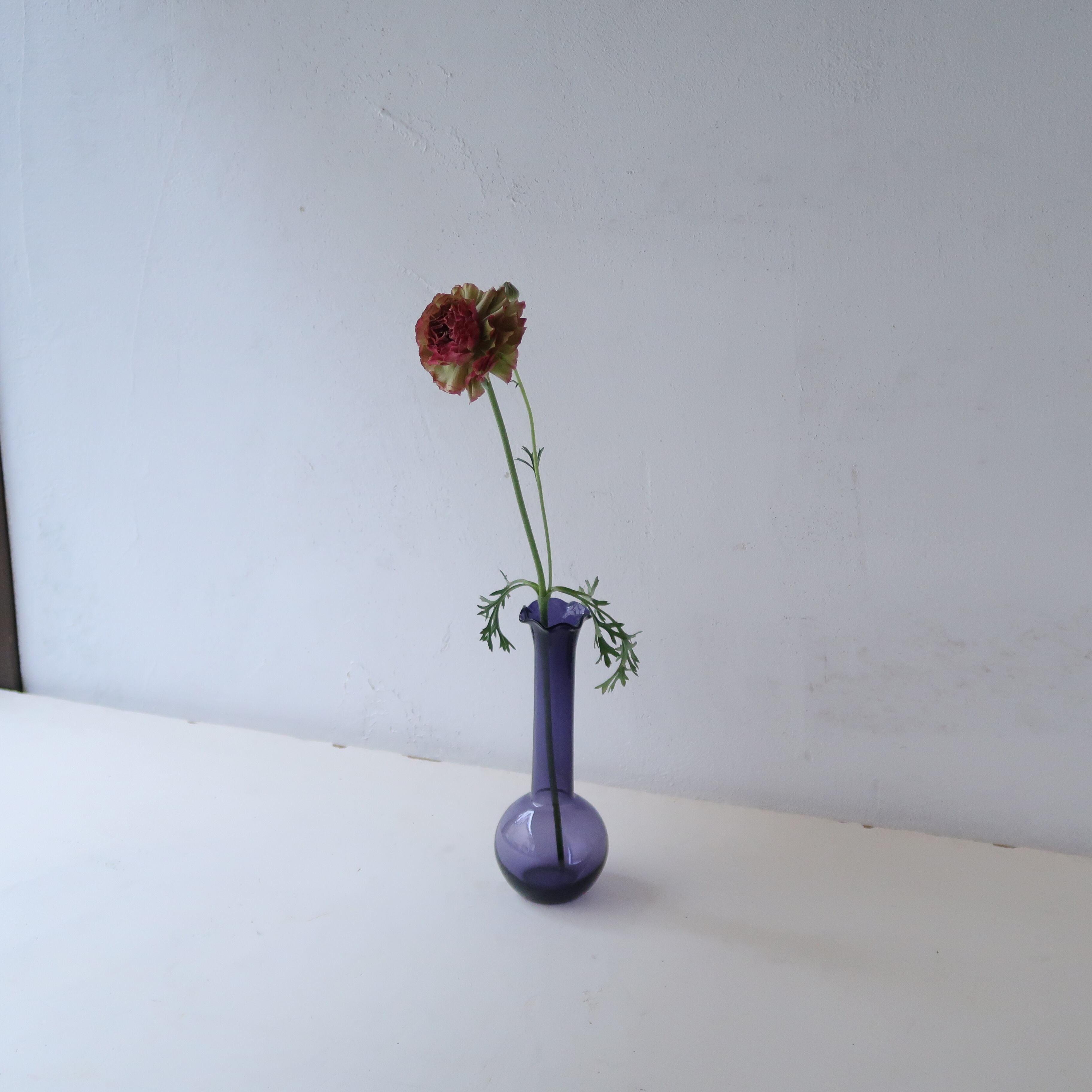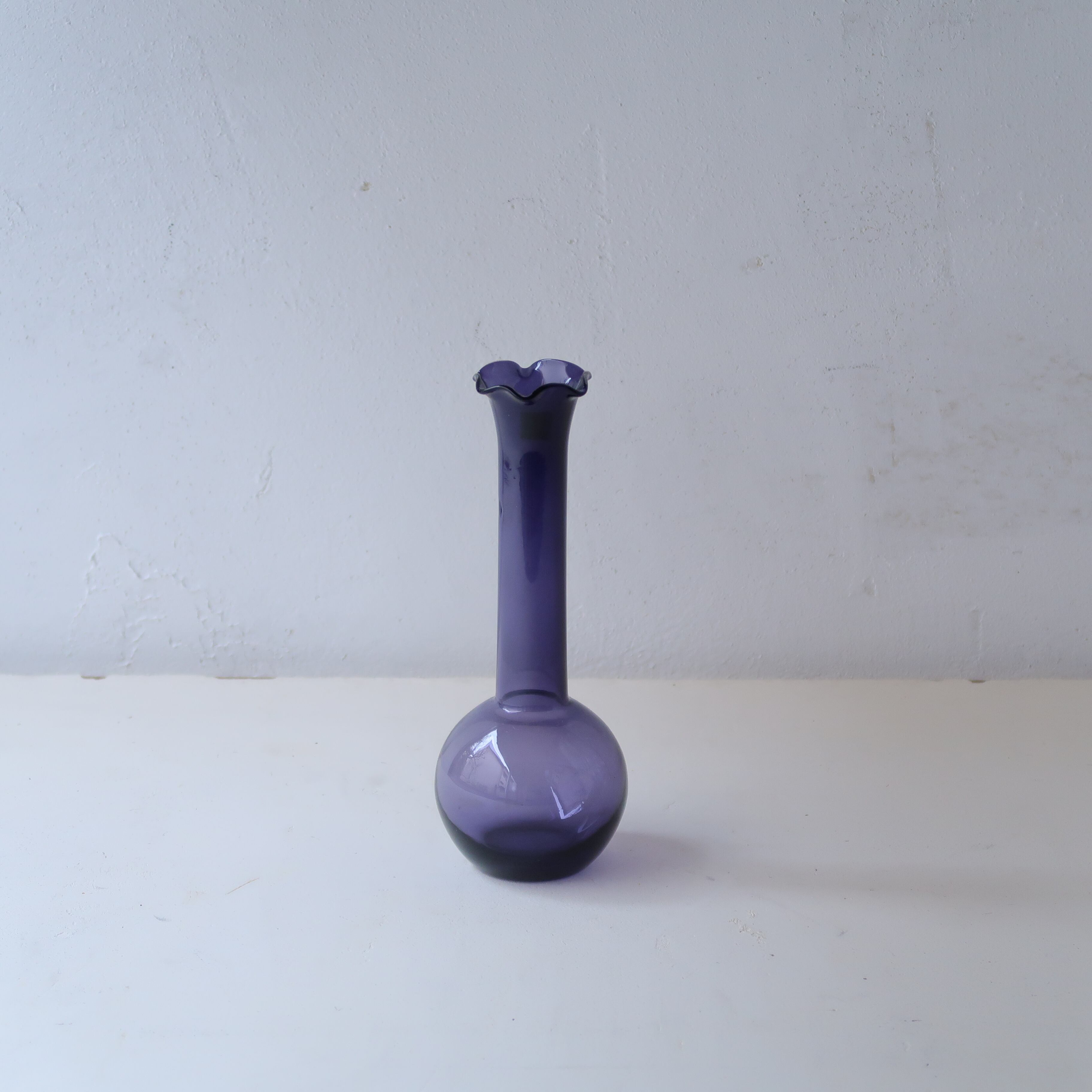 フラスコのようなフォルムに、ひらひらしたふちの一輪挿し。色合いは、深いすみれ色。