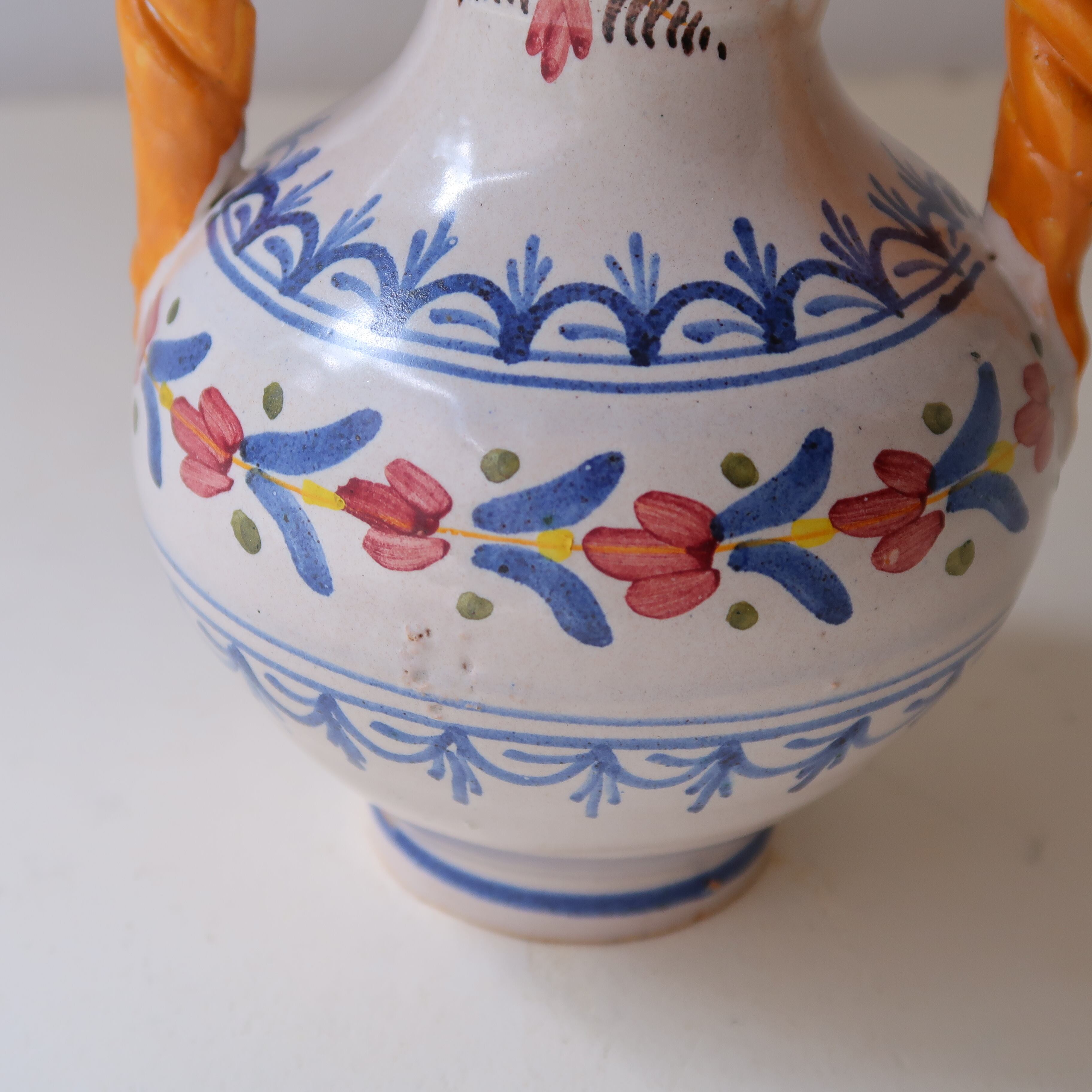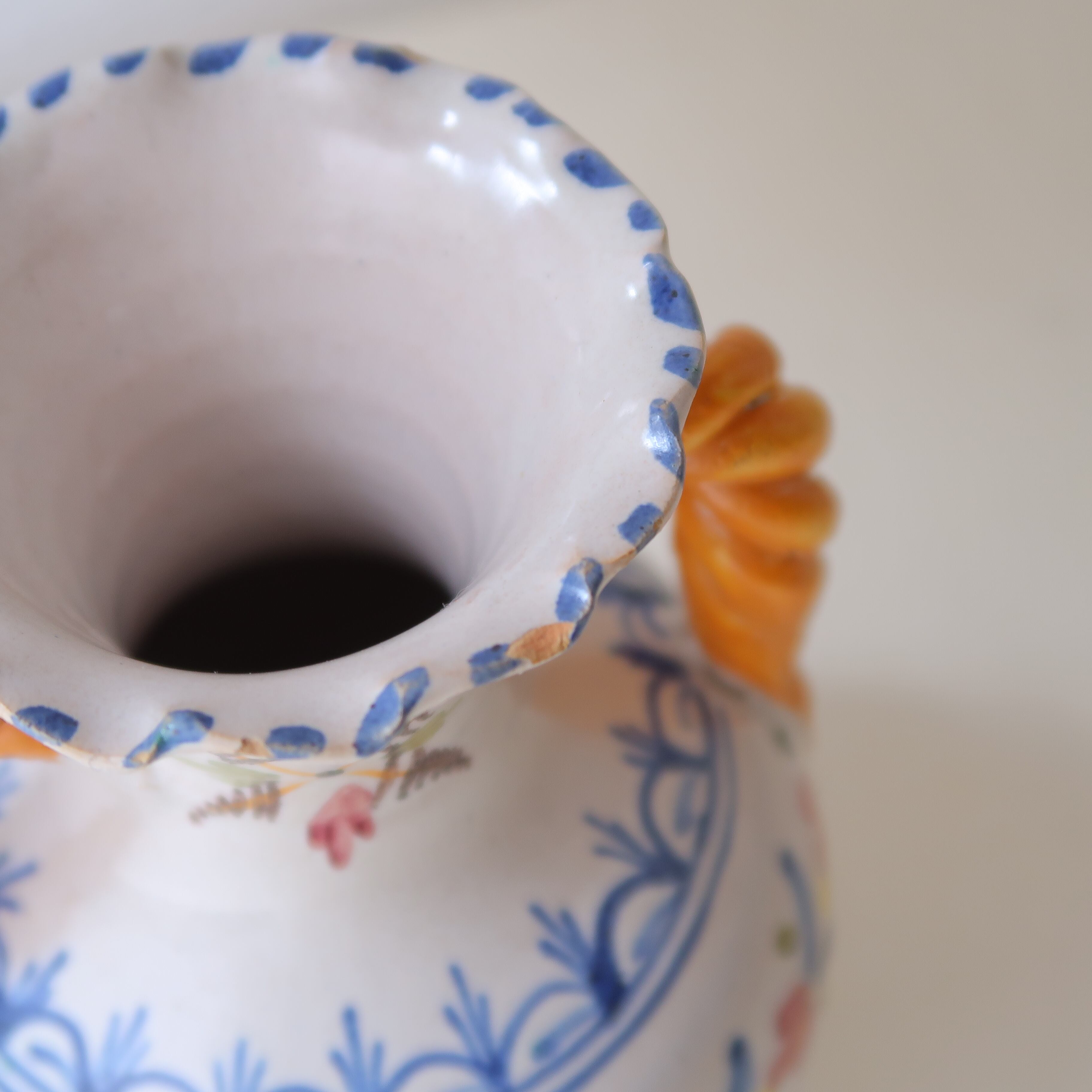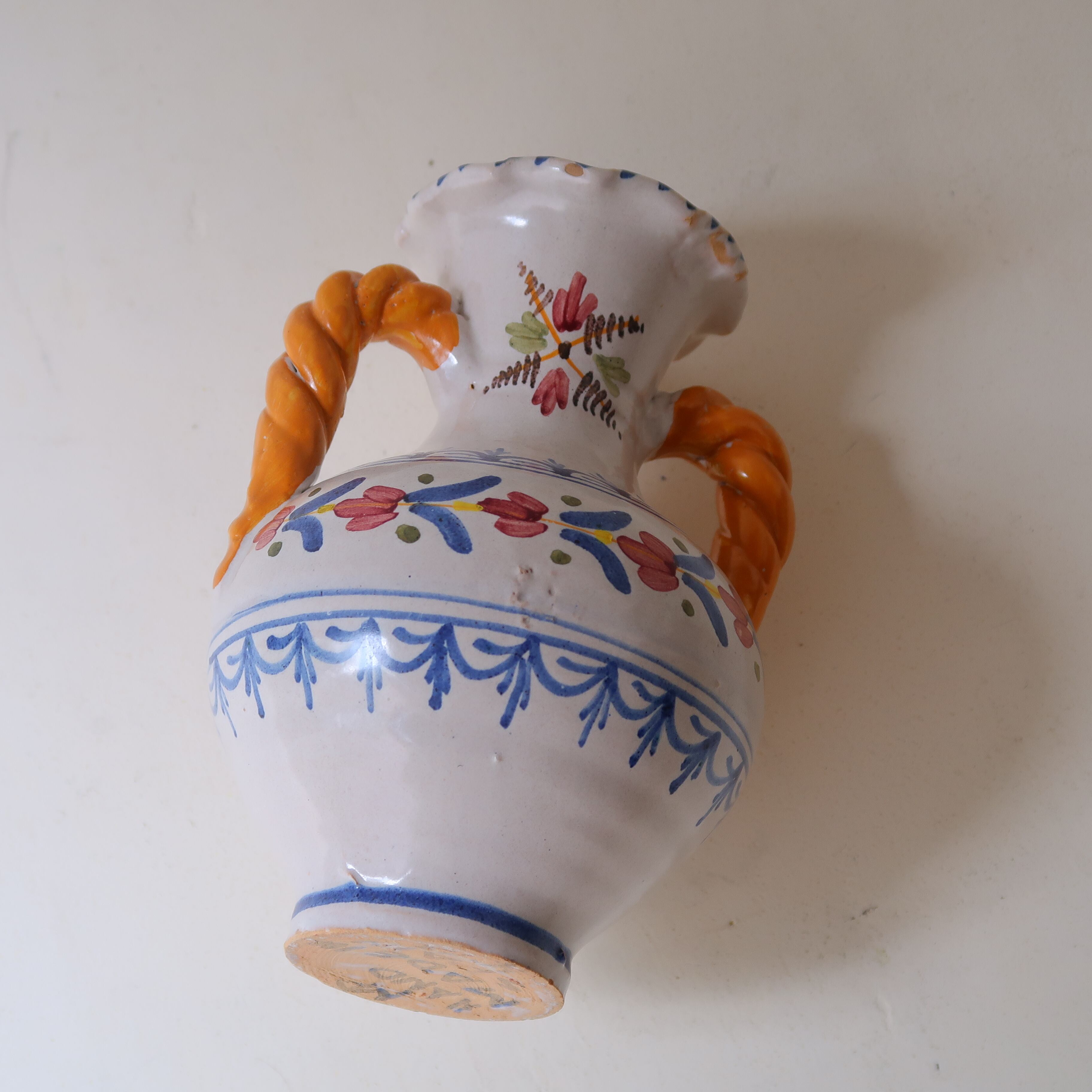 底を見ると、「HAND MADE IN SPAIN」の文字。スペインで作られた陶器の花瓶のようです。ふちには少しカケがあり、茶色い素地がところどころ見え隠れしています。古さを感じつつも、愛らしい印象のある花瓶です。